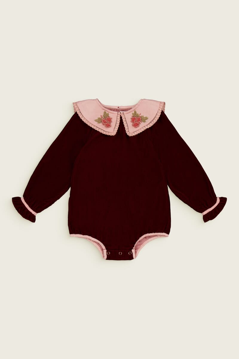 A burgundy velvet romper with a hand embroidered and lace trimmed collar on the front and a long back collar adorned with ladder lace.