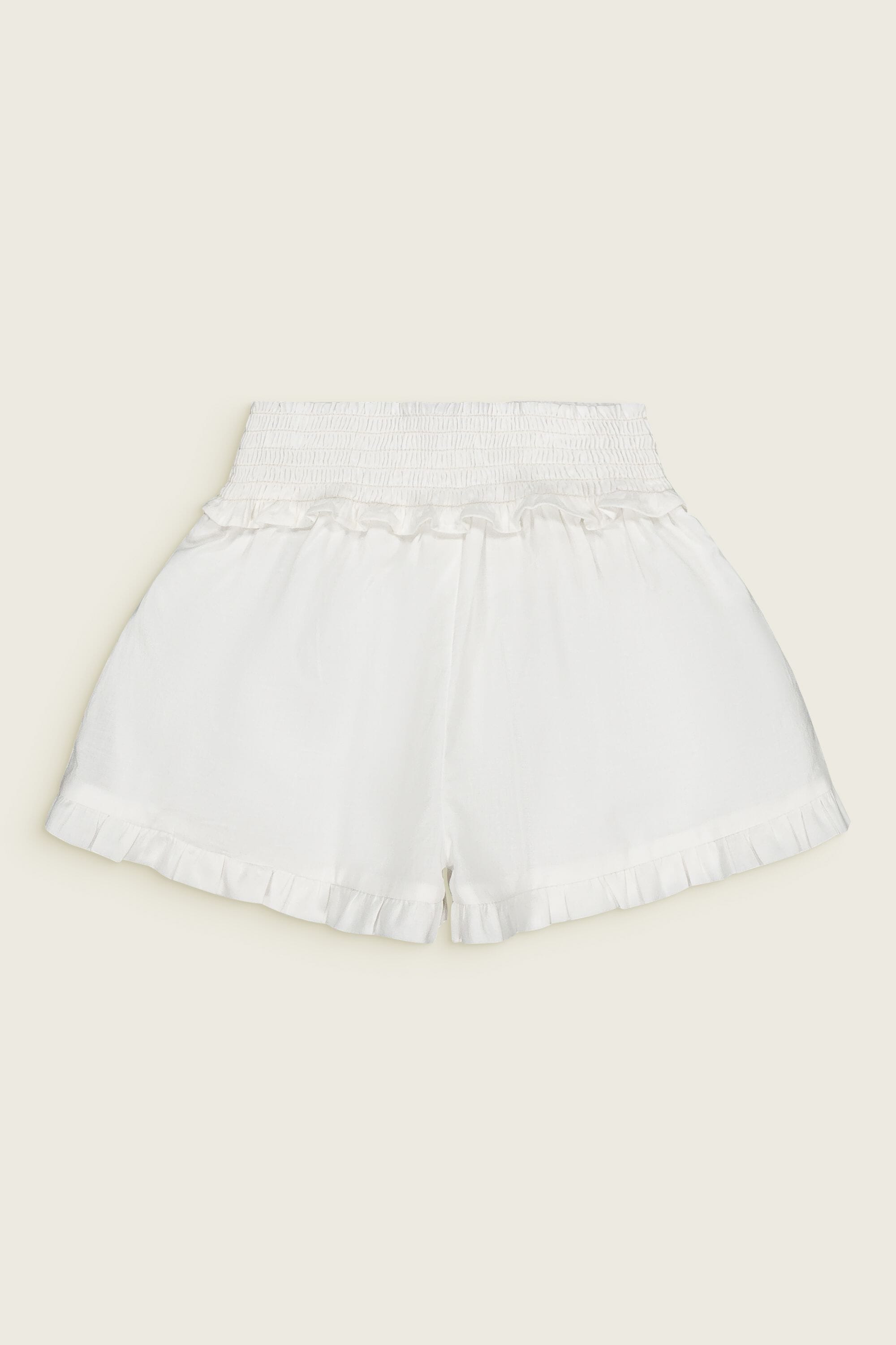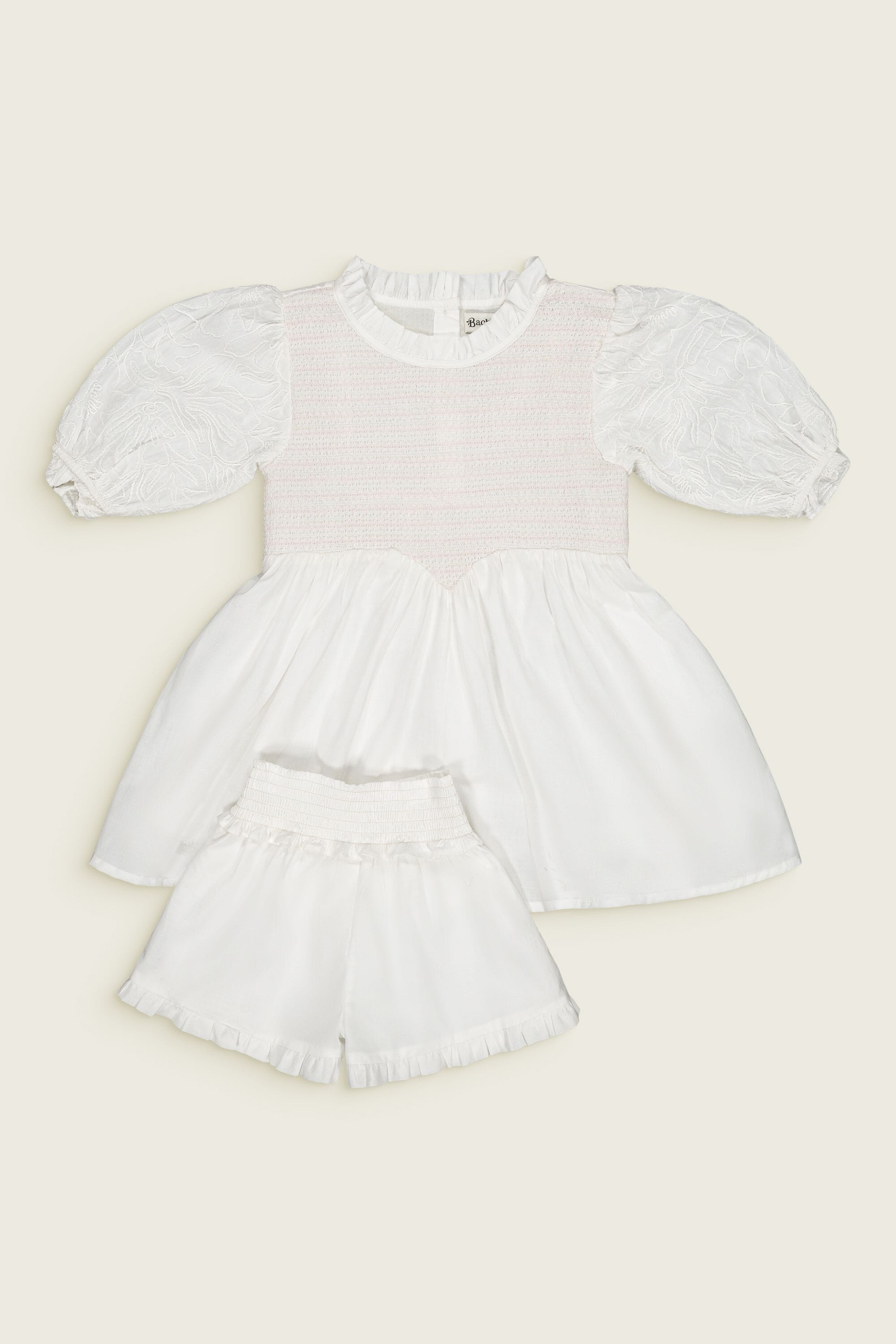 - Blouse & Shorts set, 100% organic cotton, Plain organic cotton lining, White color, Three-quarter embroidered sleeves, Ruffled Collar, Smocking on front and waist, Ruffles on leg openings and collar, Tone-on-tone buttons and belt at the back.