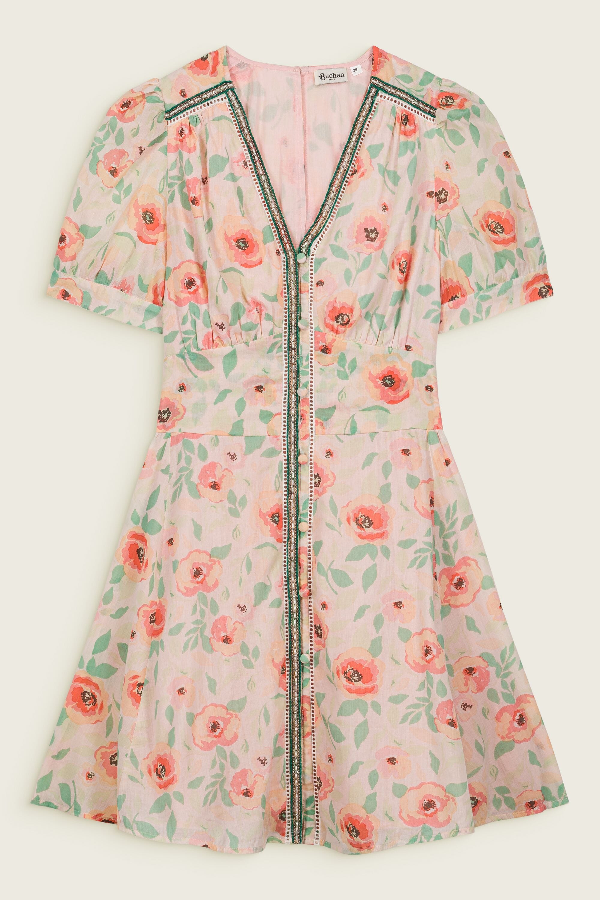- Belted shirt dress cinched at the waist, 100% organic cotton, Plain organic cotton lining, Block print, Hand embroidered beads and rhinestones, Ladder lace, Short sleeves, Tone-on-tone buttons on the front and at the back, Buttoned teardrop opening at the