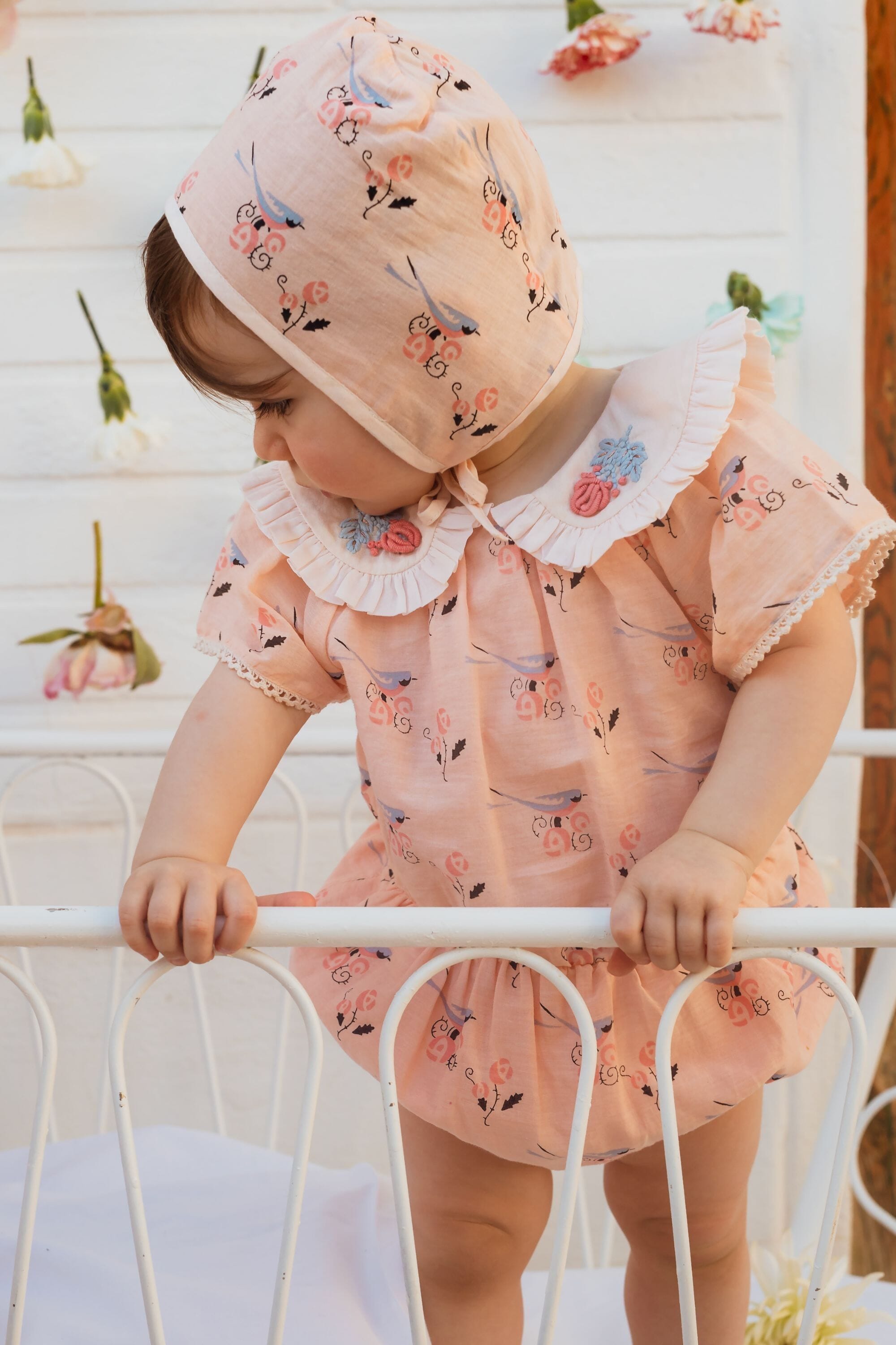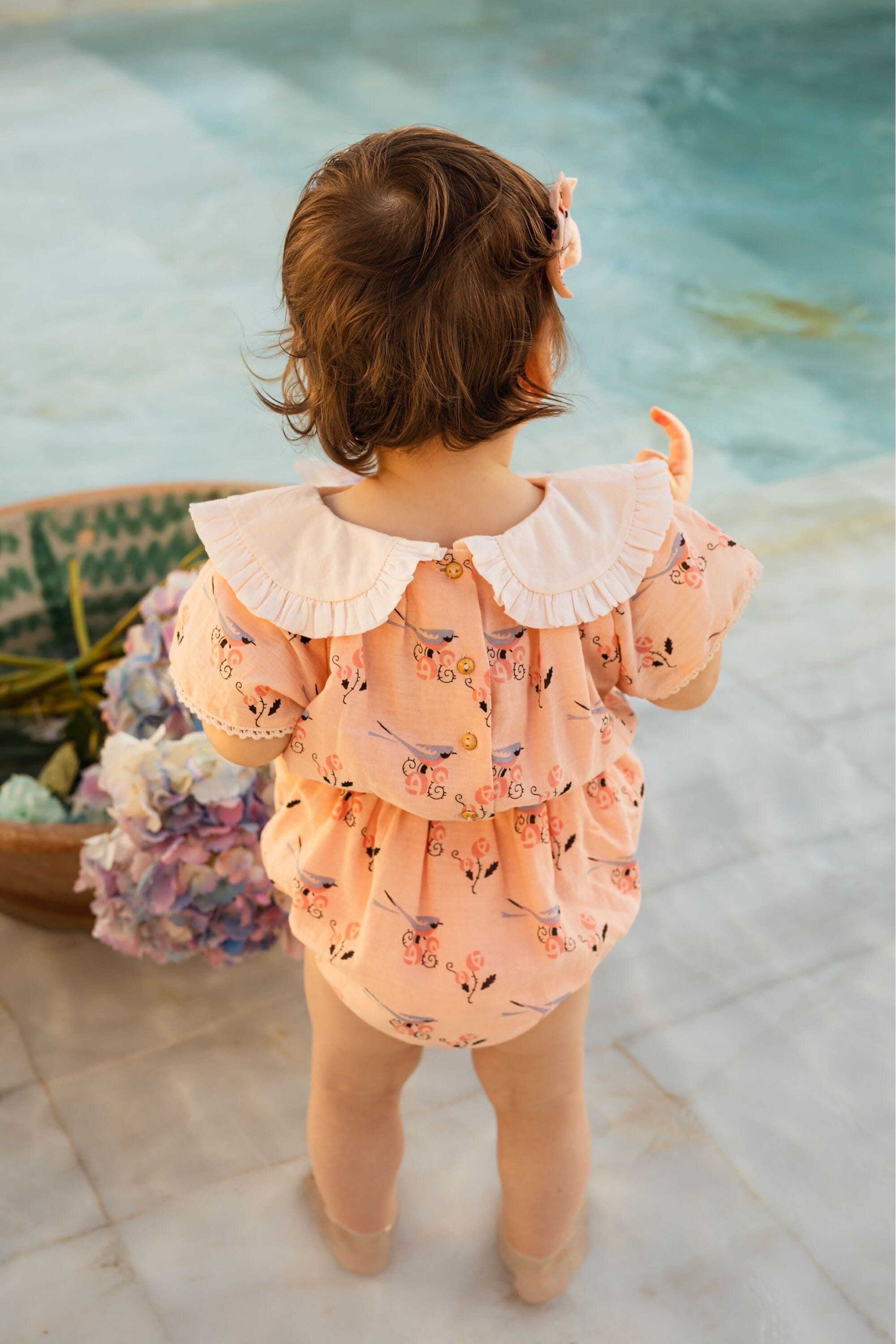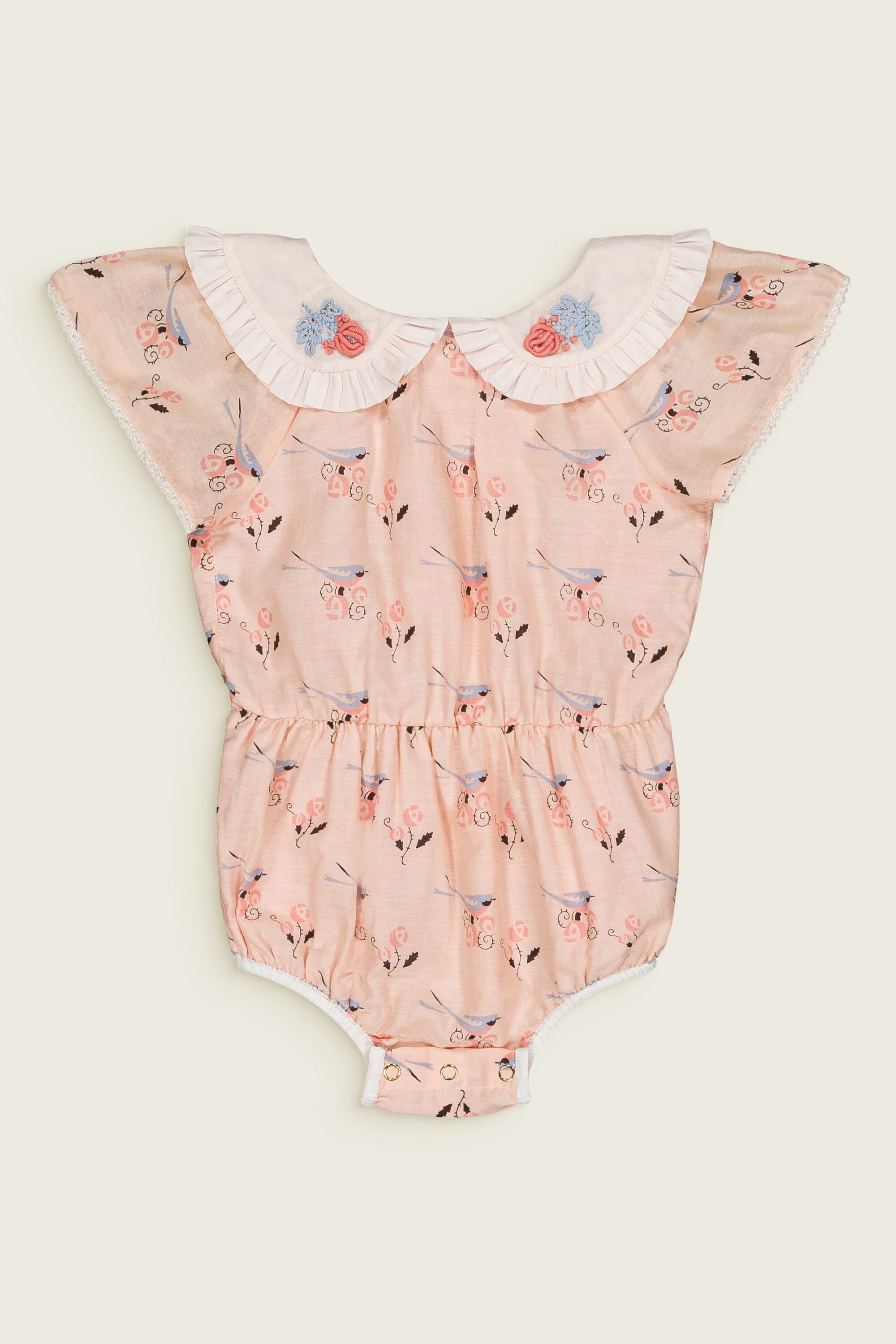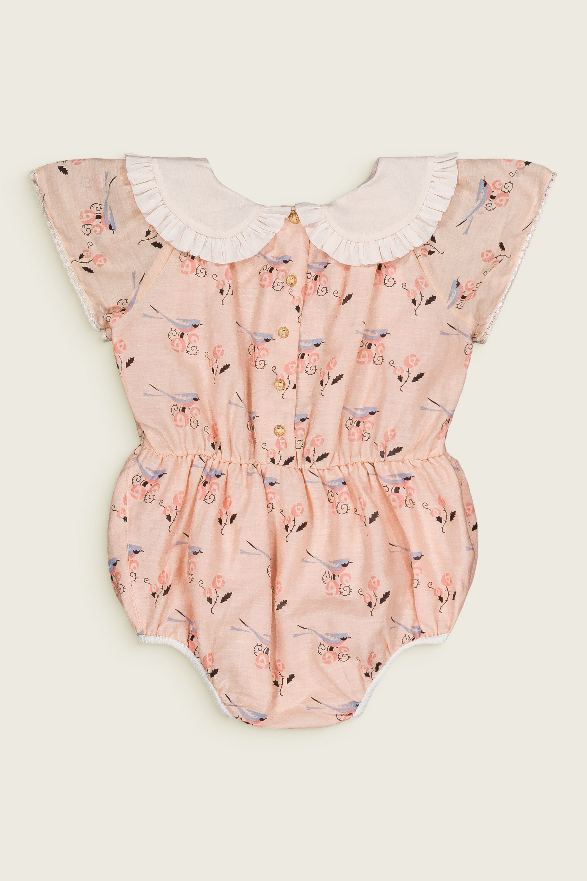 Romper, 100% organic cotton, Plain lining in organic cotton voile, Block print, Hand embroidered collar, Short sleeves with lace finishing, Elasticated at the waist, Golden snap buttons at the crotch, Golden buttons on the back.