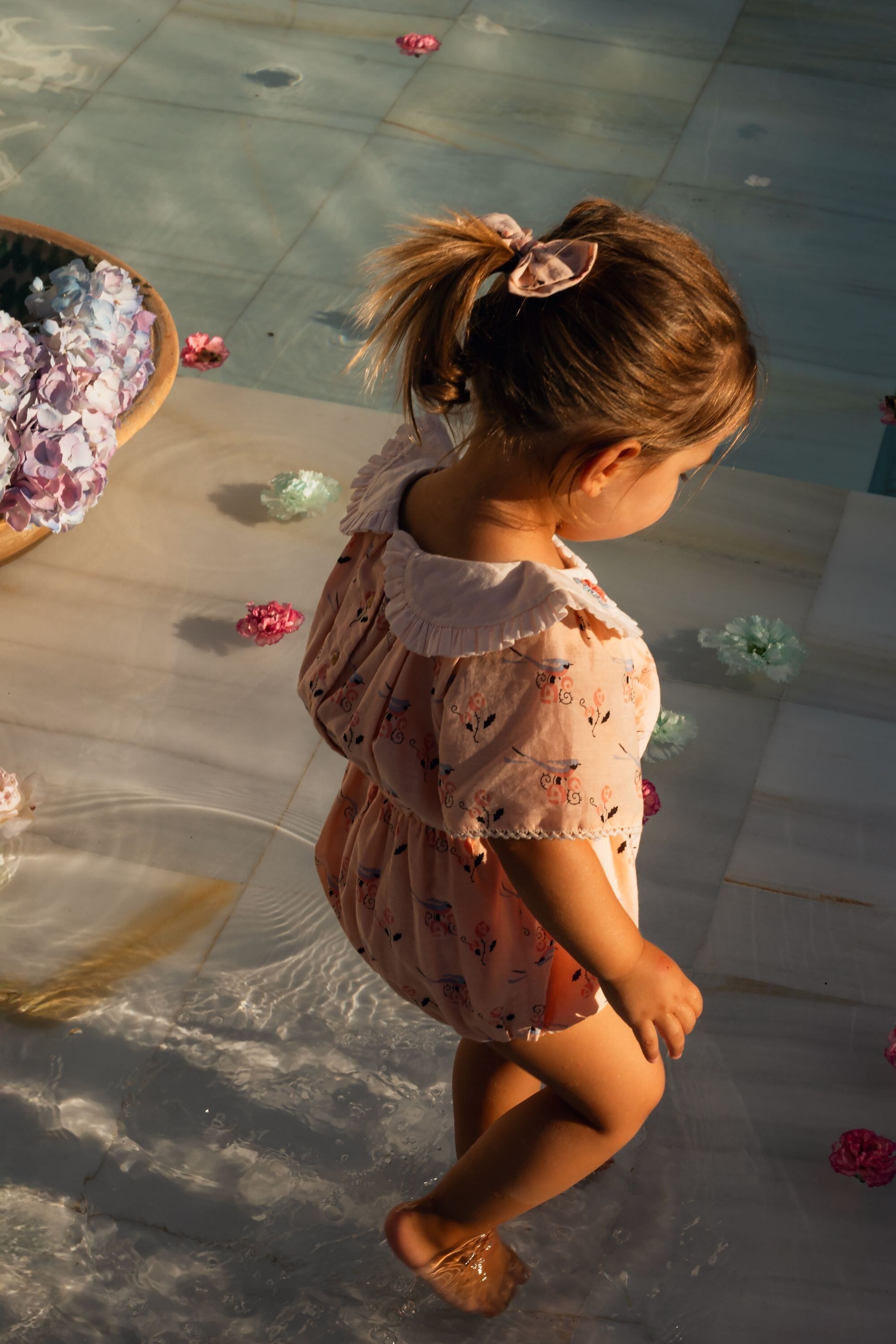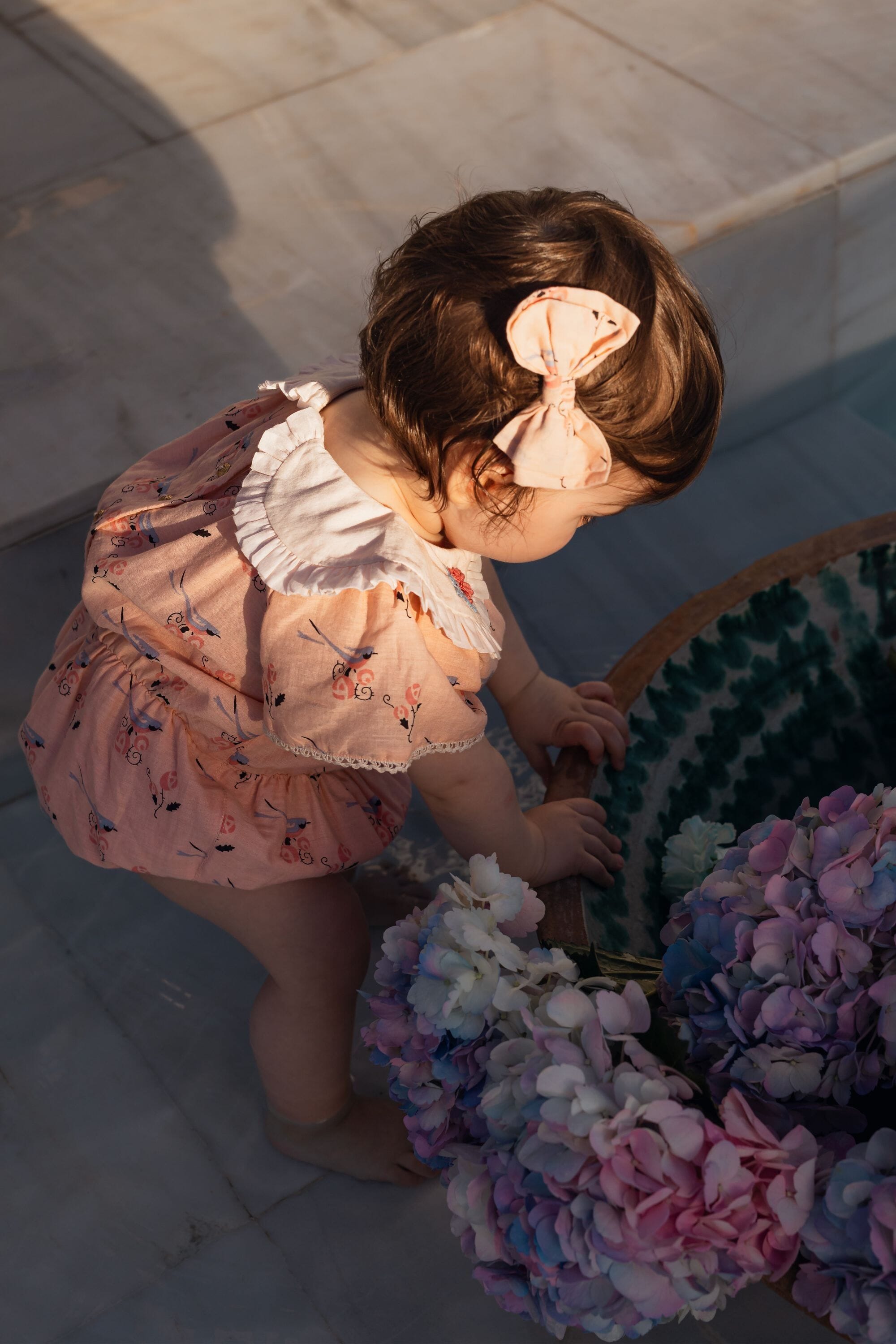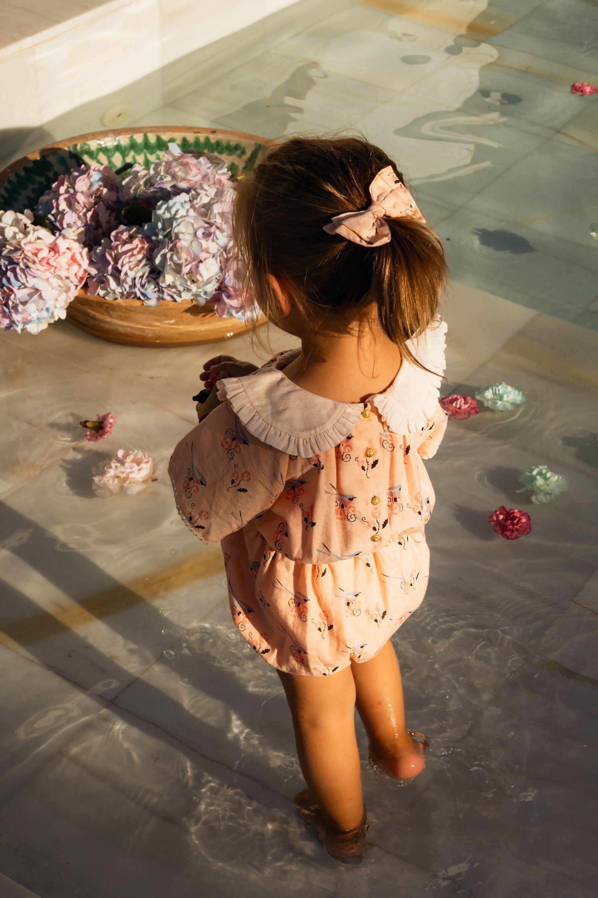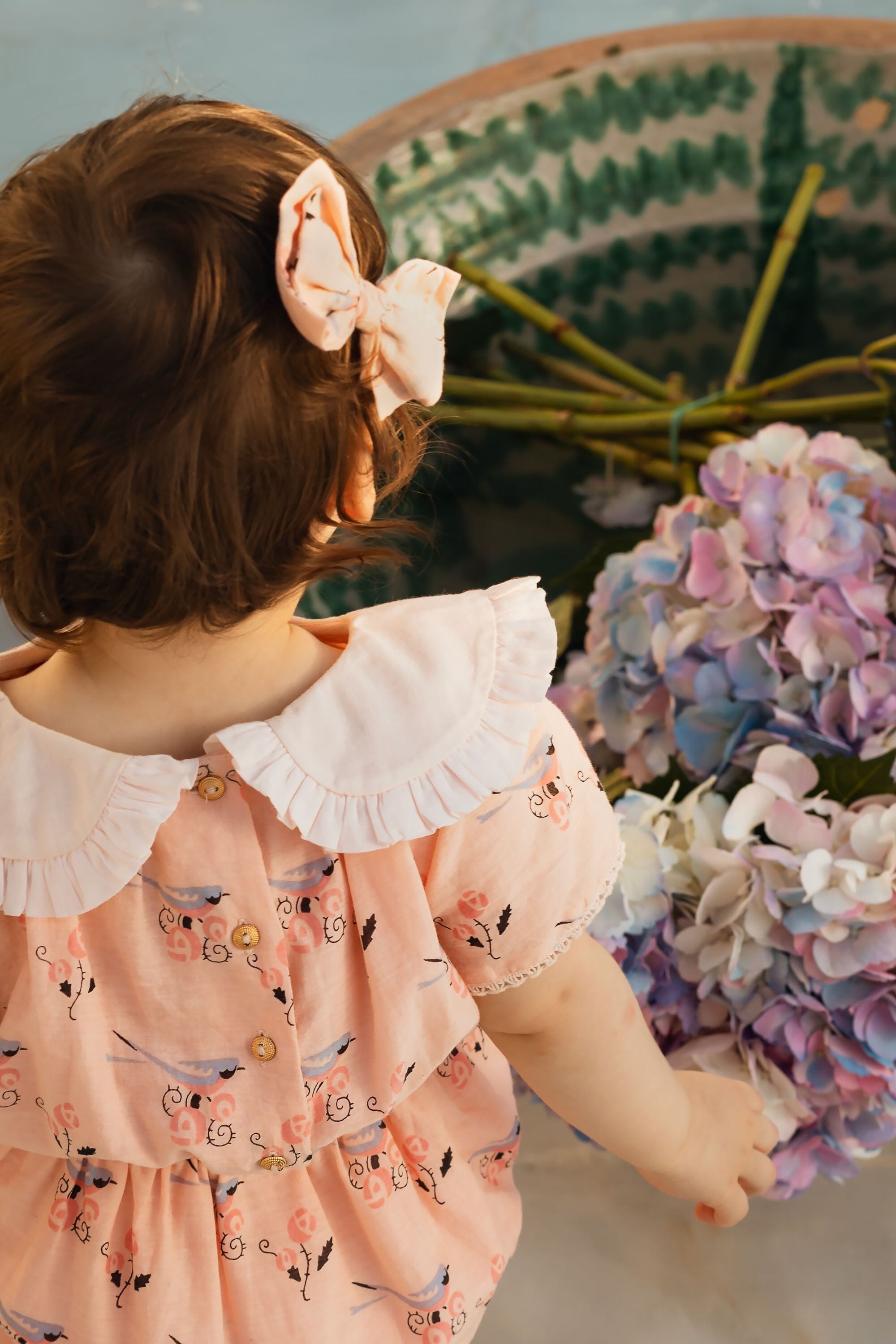 Romper, 100% organic cotton, Plain lining in organic cotton voile, Block print, Hand embroidered collar, Short sleeves with lace finishing, Elasticated at the waist, Golden snap buttons at the crotch, Golden buttons on the back.