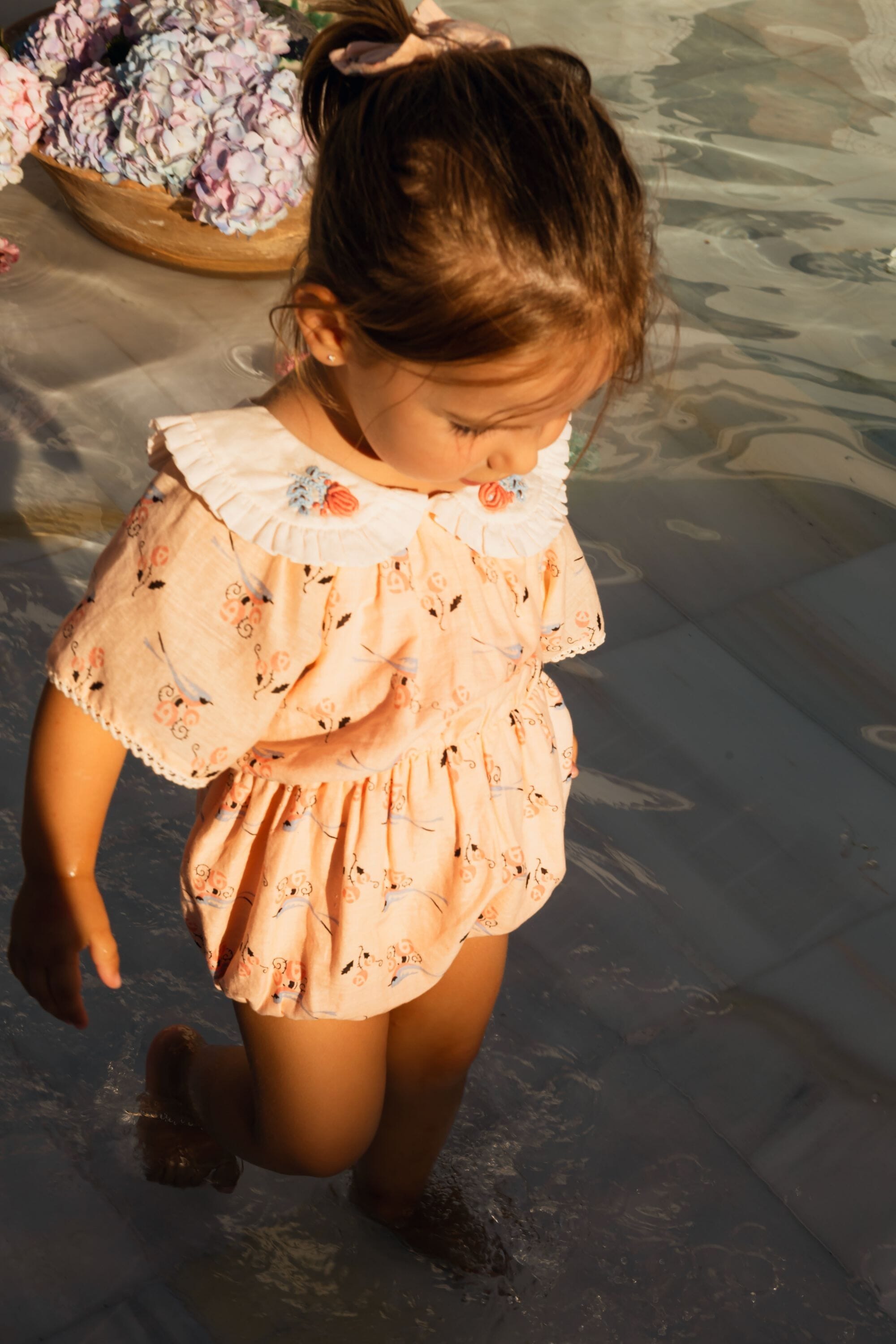 A romper in organic cotton, elasticated at the waist, featuring a hand-embroidered ruffled collar and short sleeves finished with lace.
