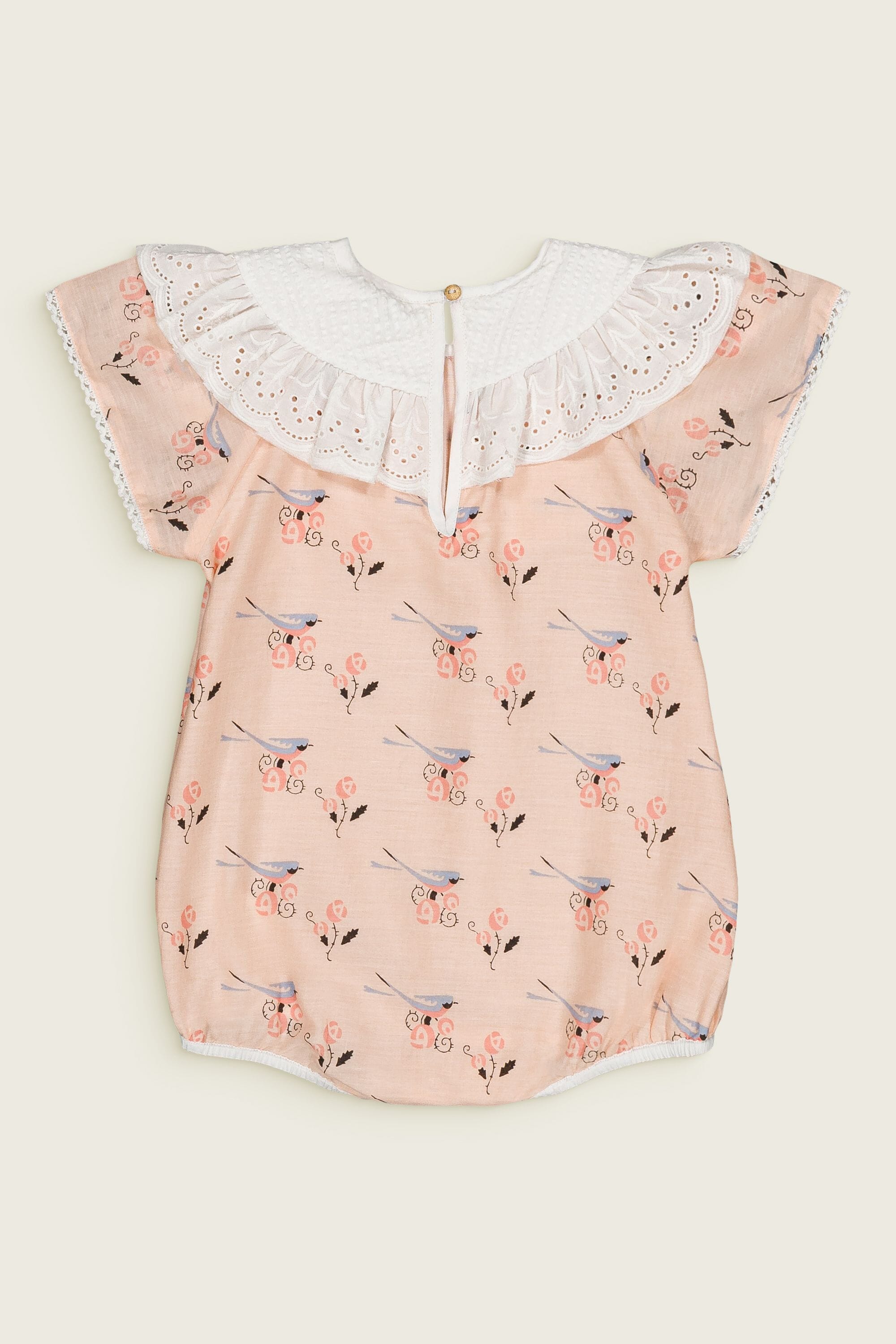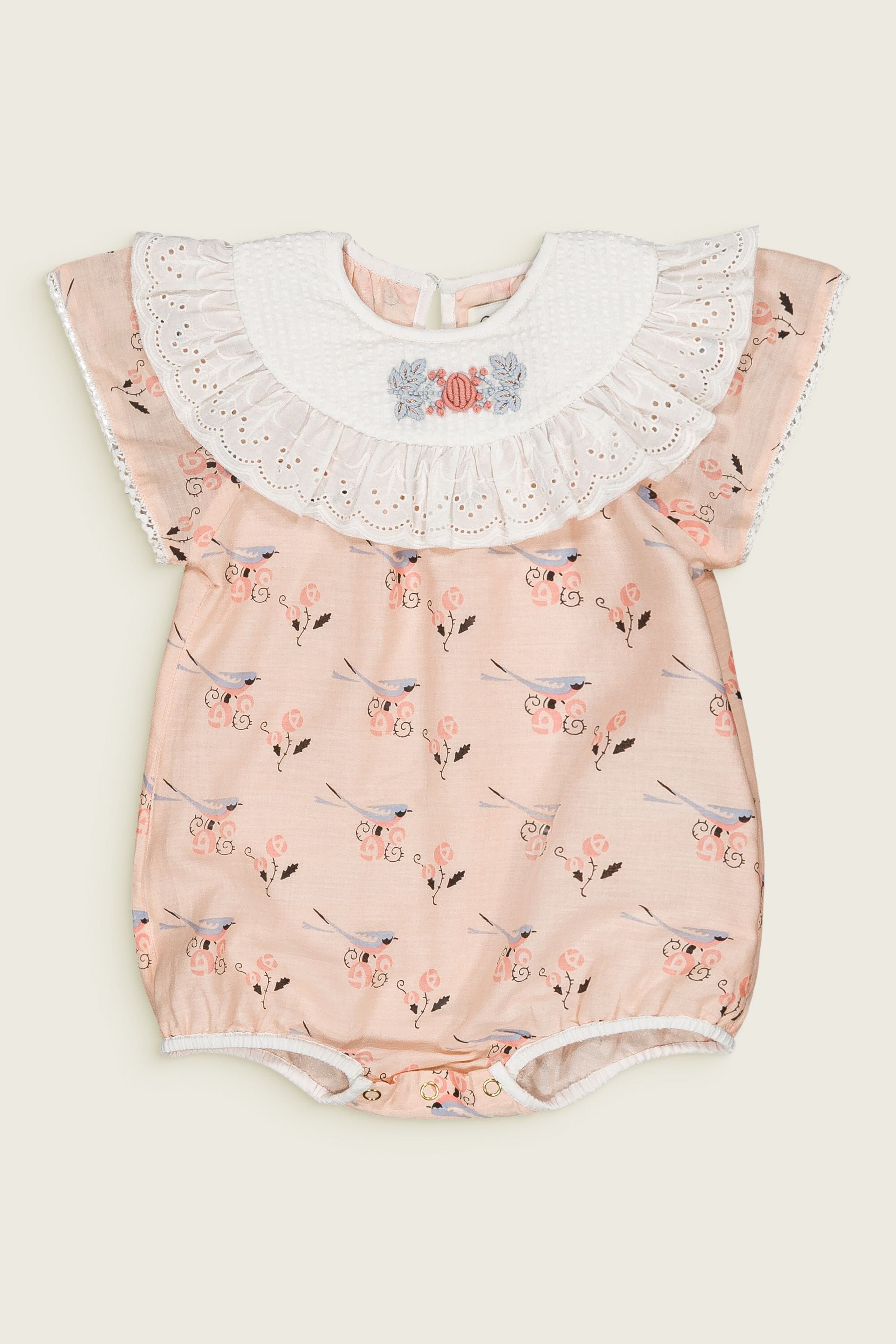 A short sleeves romper in 100% organic cotton featuring hand embroidery and broderie anglaise on the collar.