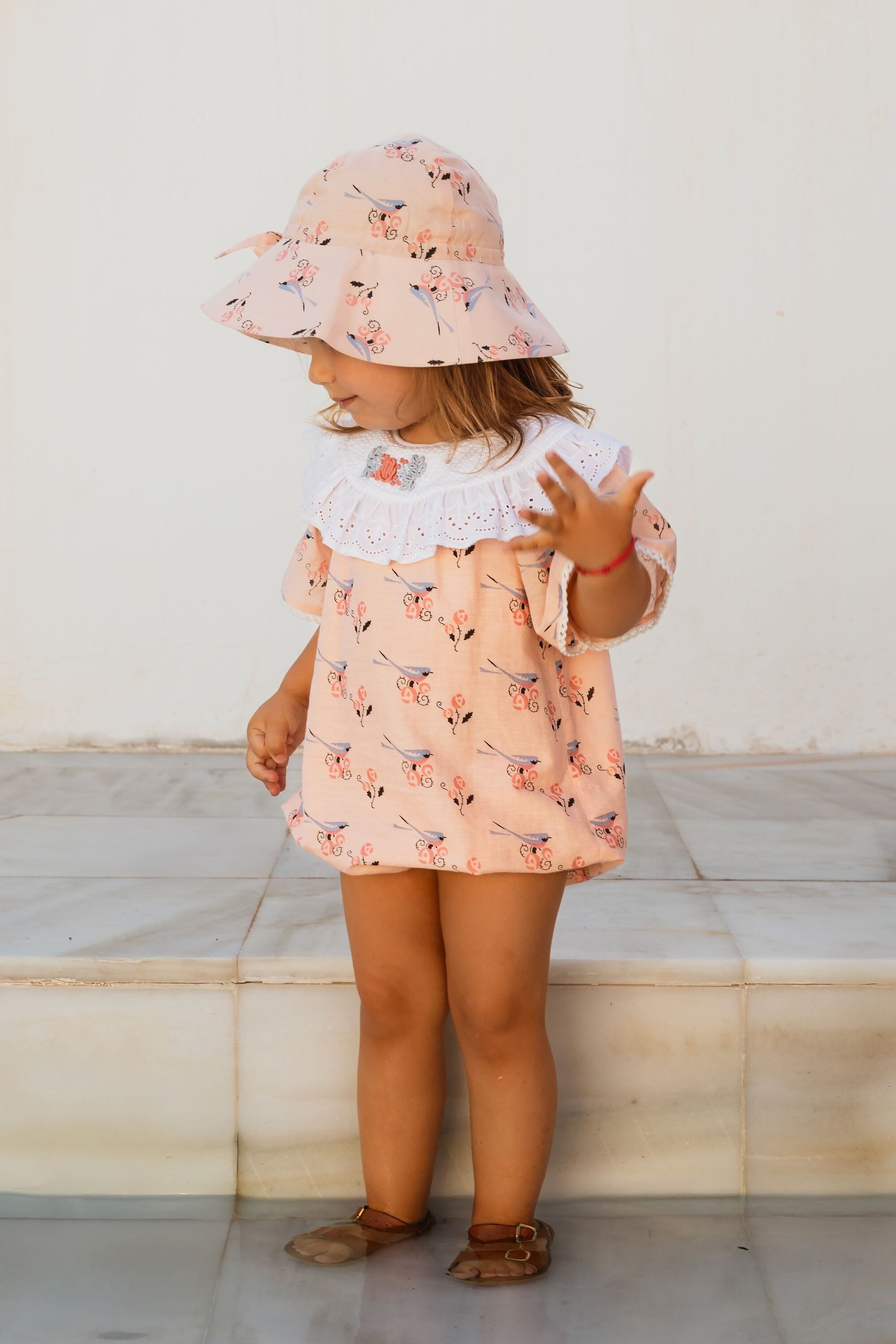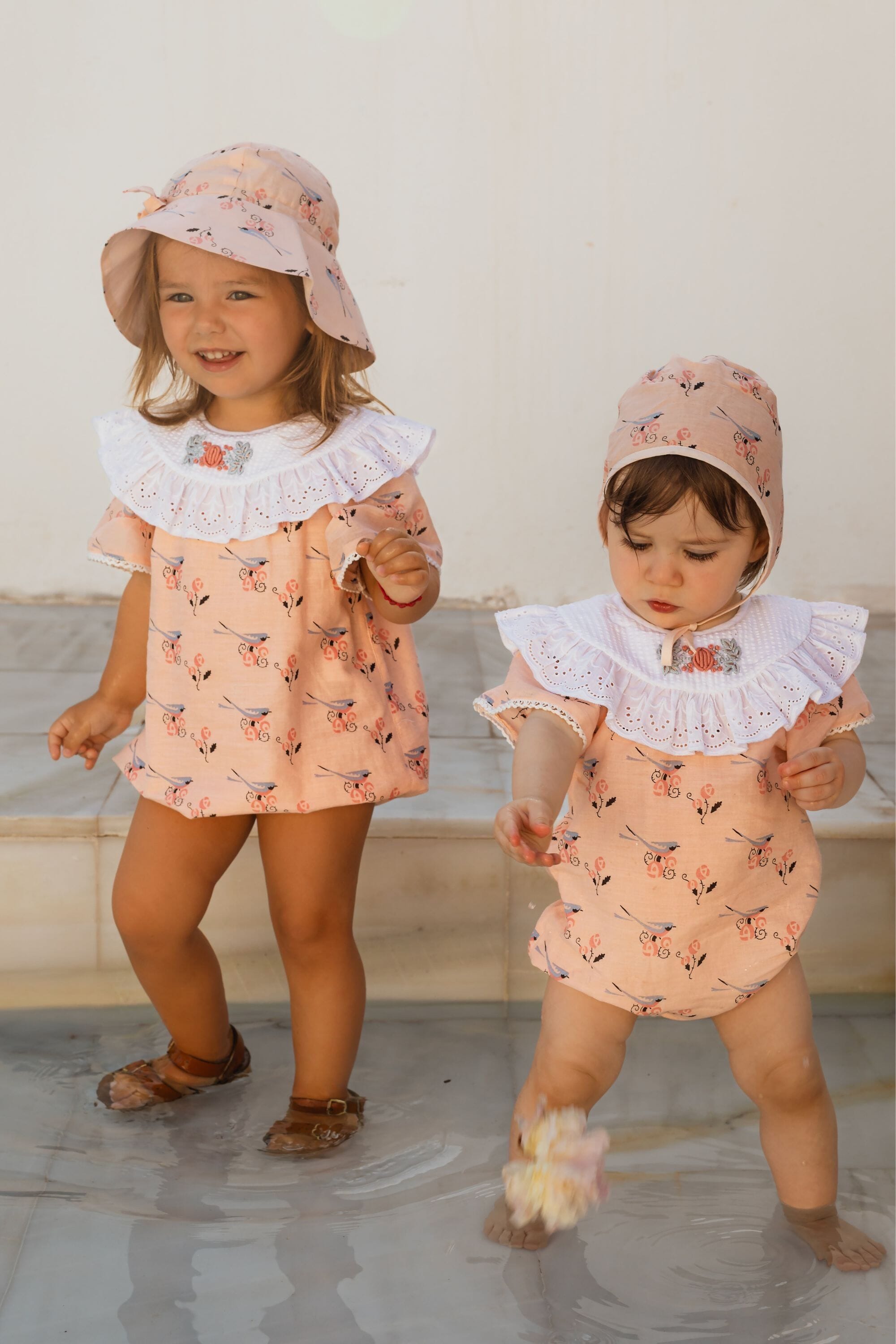 Romper, 100% organic cotton, Plain lining in organic cotton voile, Block print, Hand embroidery and broderie anglaise on the collar, Short sleeves with lace finishing, Golden snap buttons at the crotch, Golden buttons on the back.