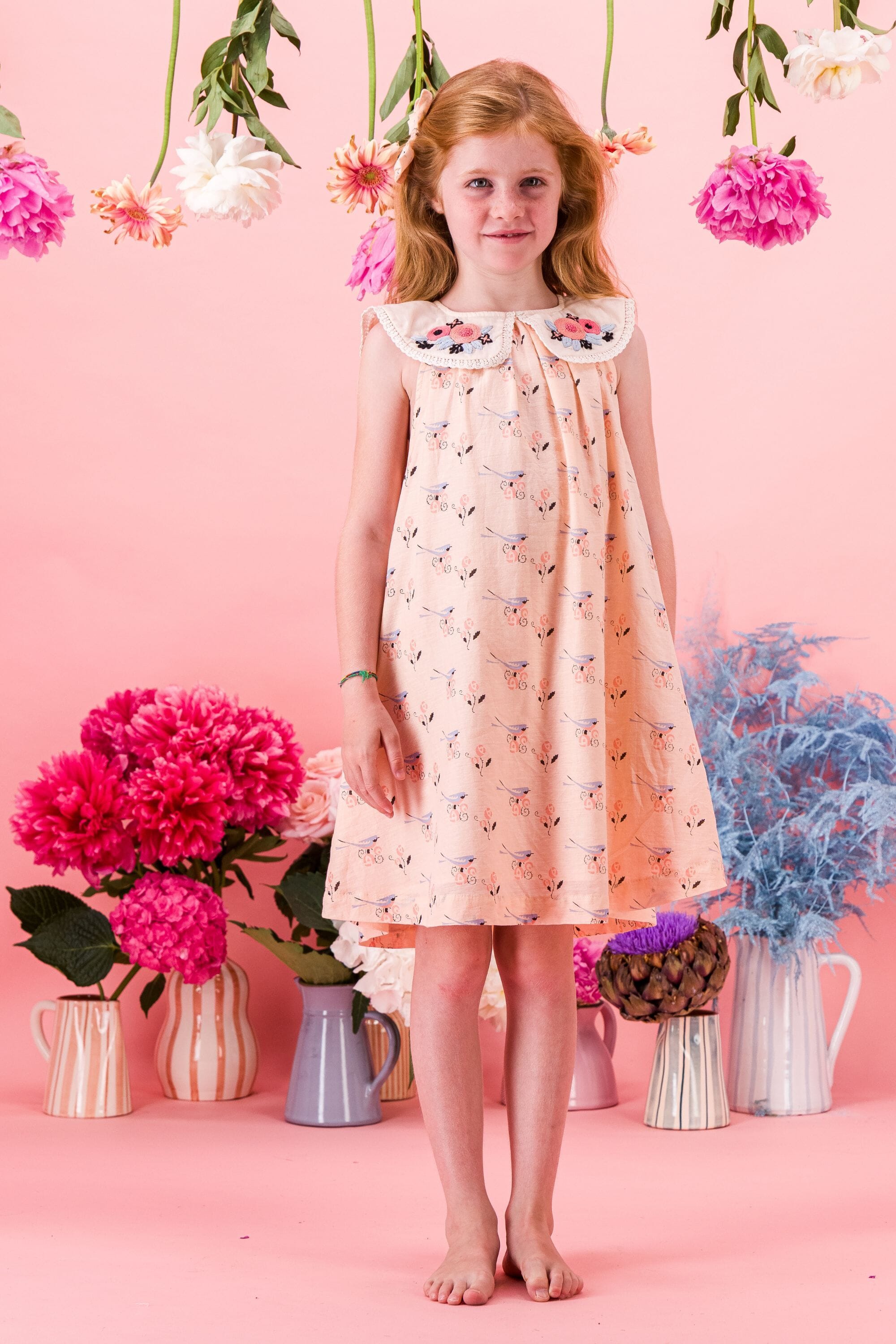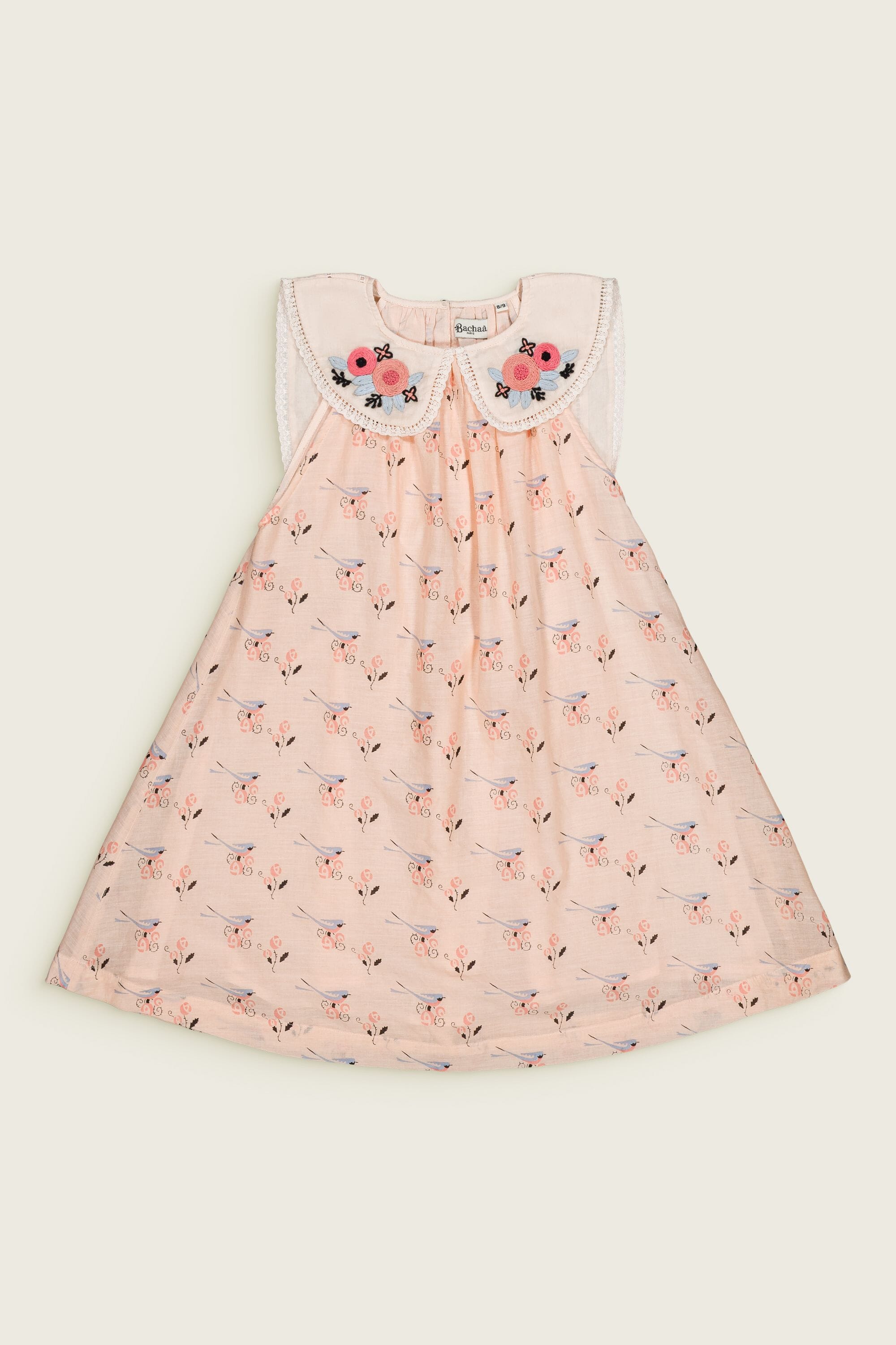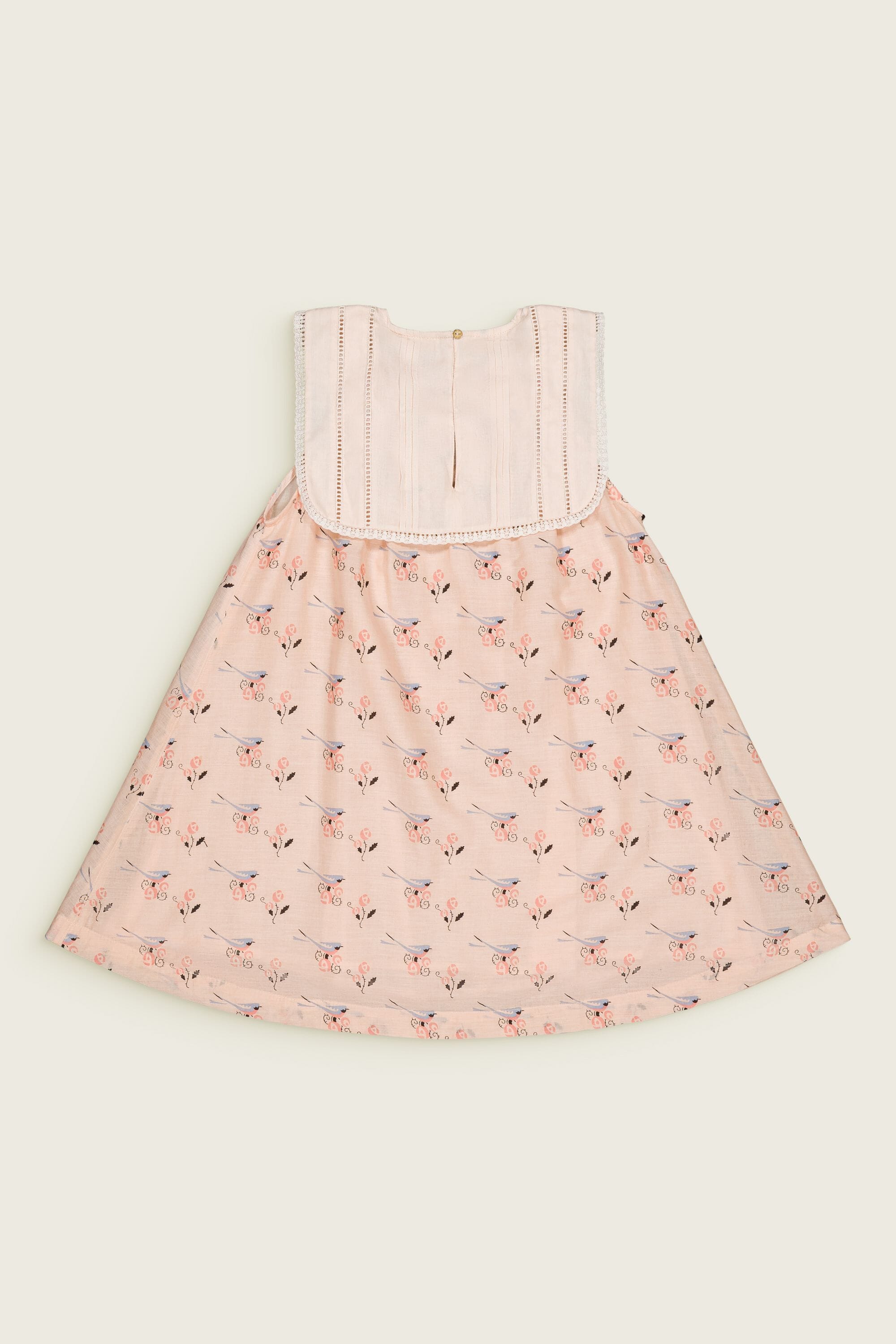 Sleeveless dress, 100% organic cotton, Block print, Plain lining in organic cotton voile, Hand embroidery, pintucks and ladder lace on the collar, Gathers at the front and back, One buttoned drop at the back, Golden button.