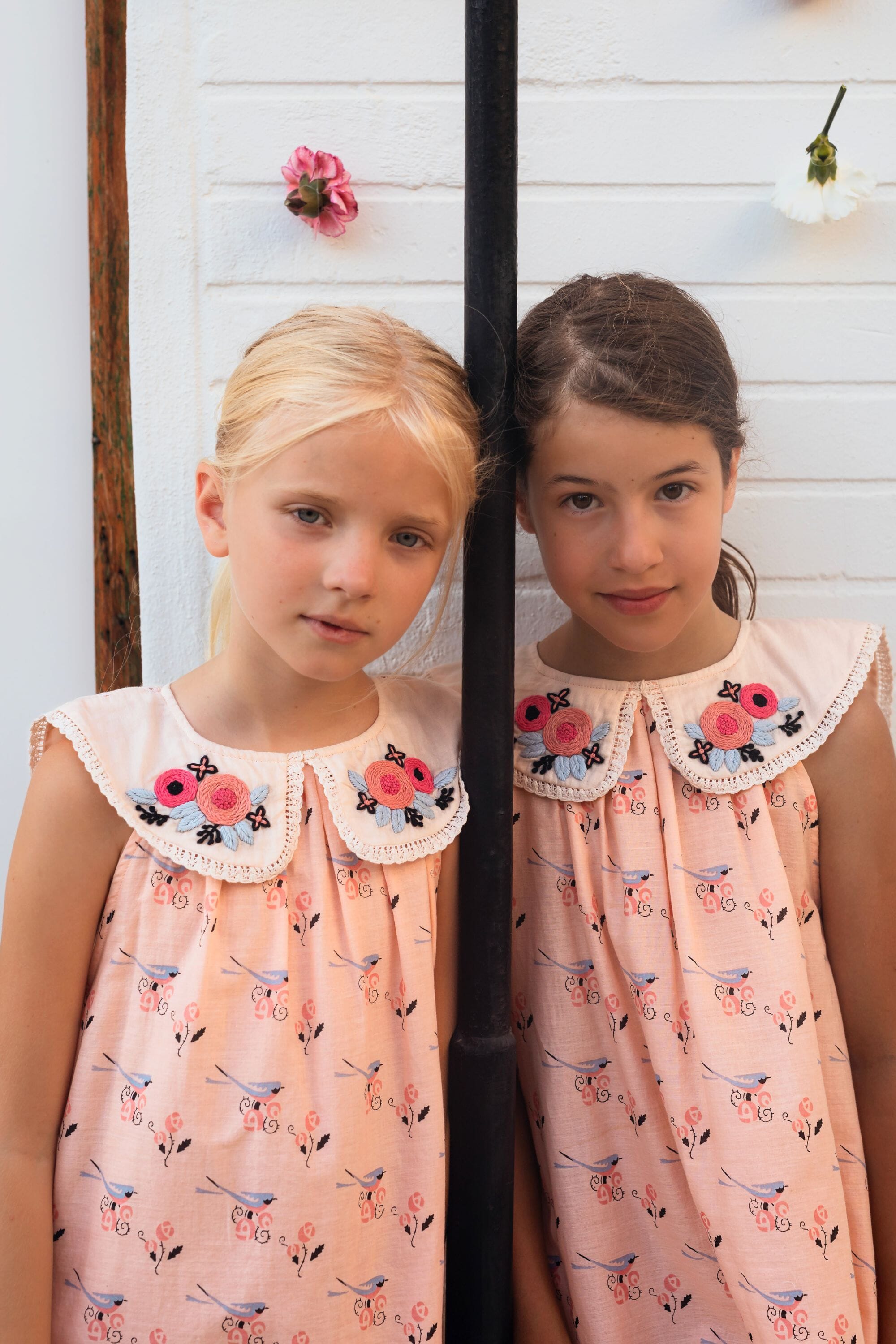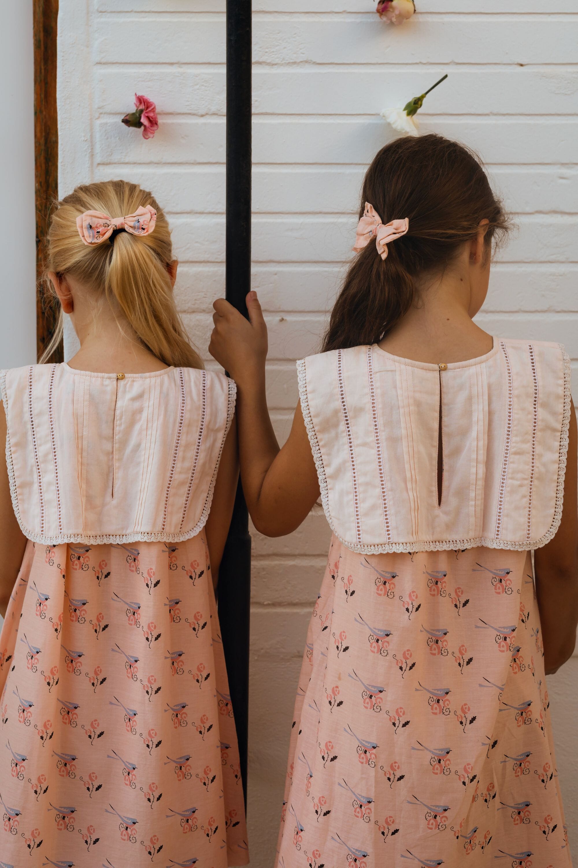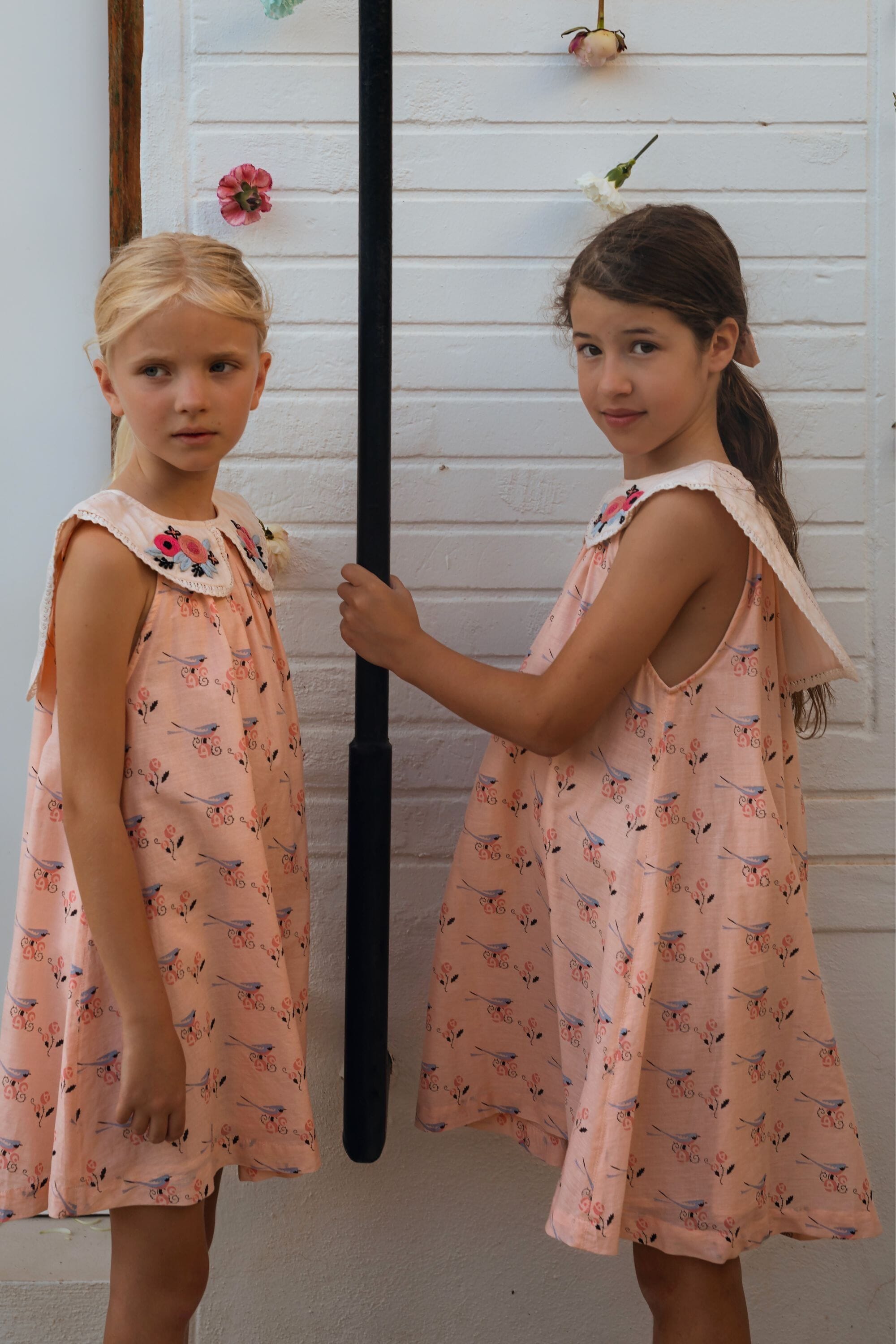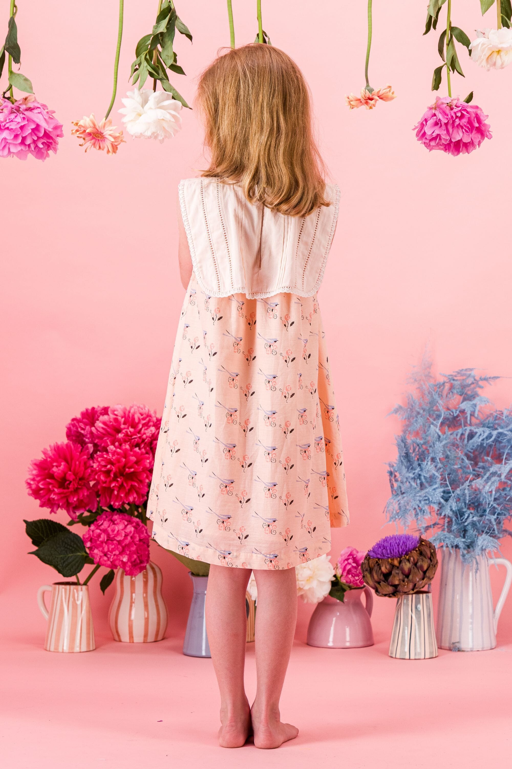 A sleeveless dress in organic cotton featuring a beautiful hand-embroidered lace-trimmed collar at the front and a long back collar adorned with ladder lace and pintucks.