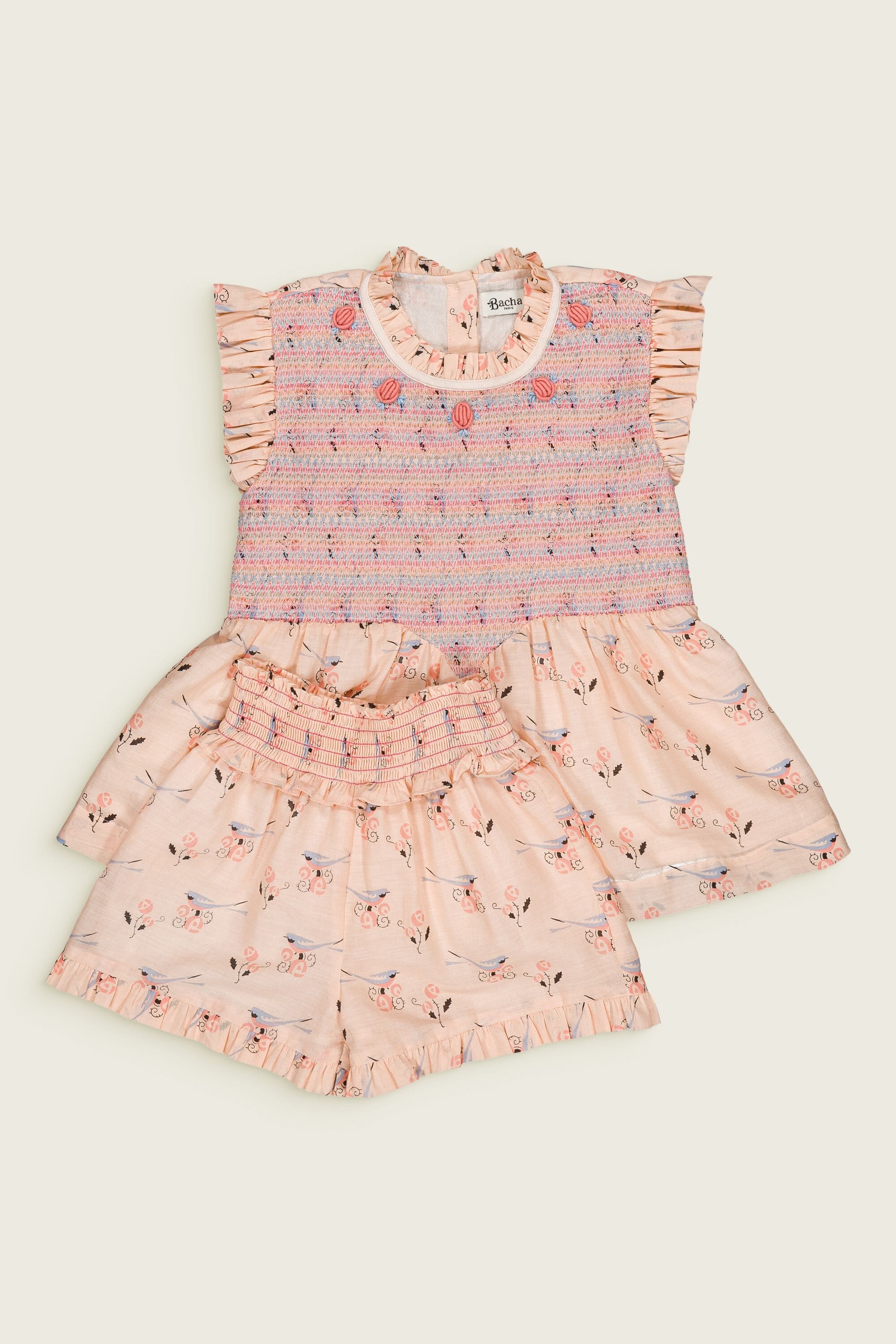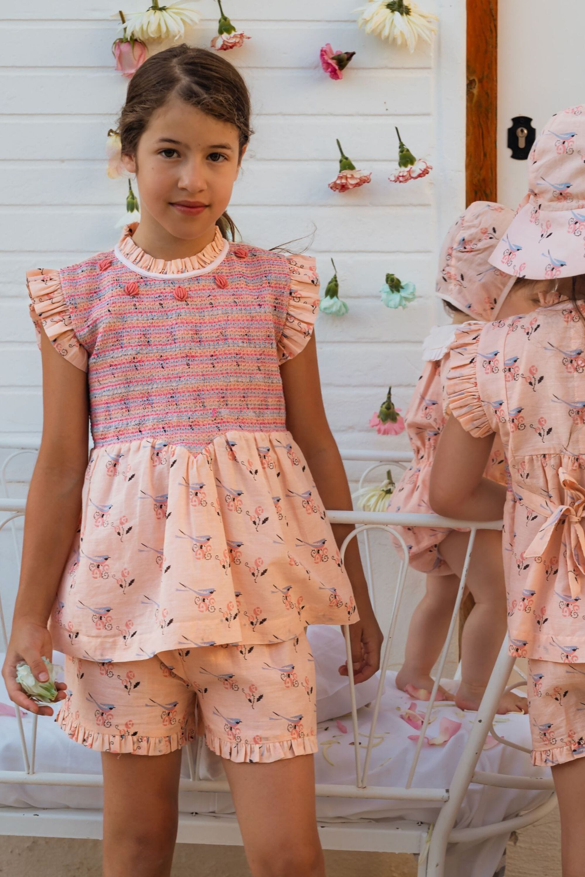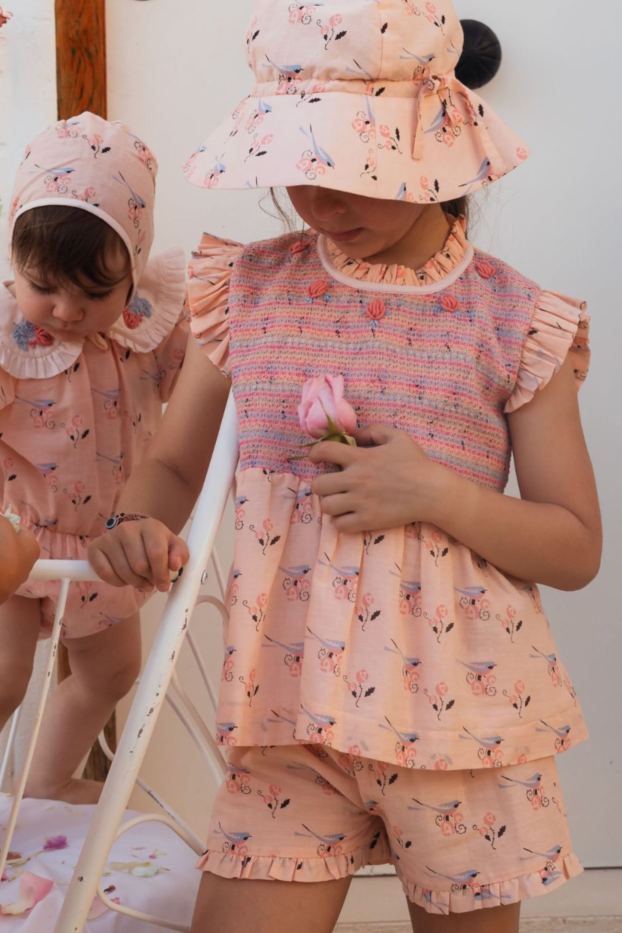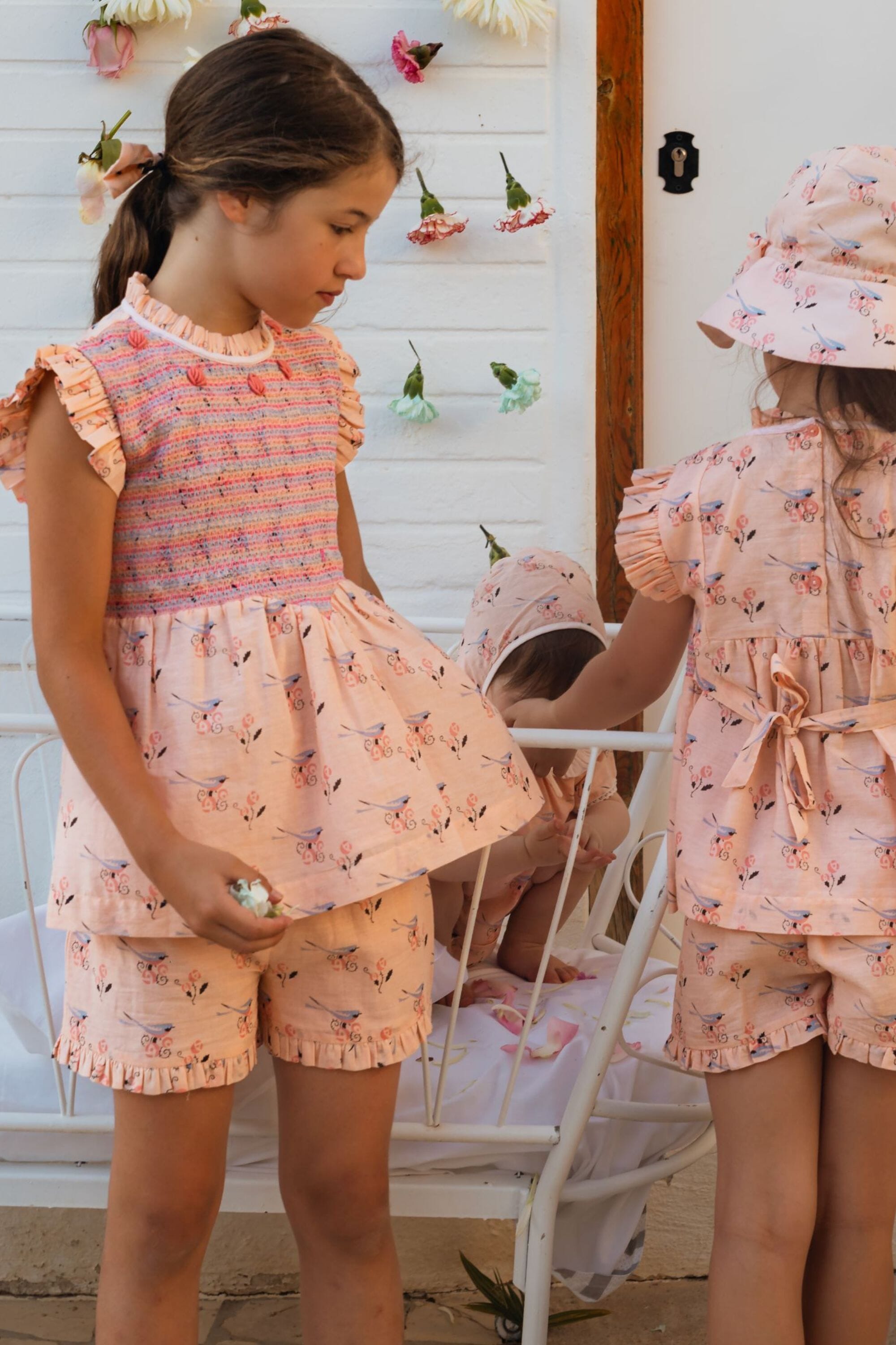 A set in organic cotton consisting of smocked shorts at the waist and a sleeveless blouse adorned with smocking and hand embroidery on the front.