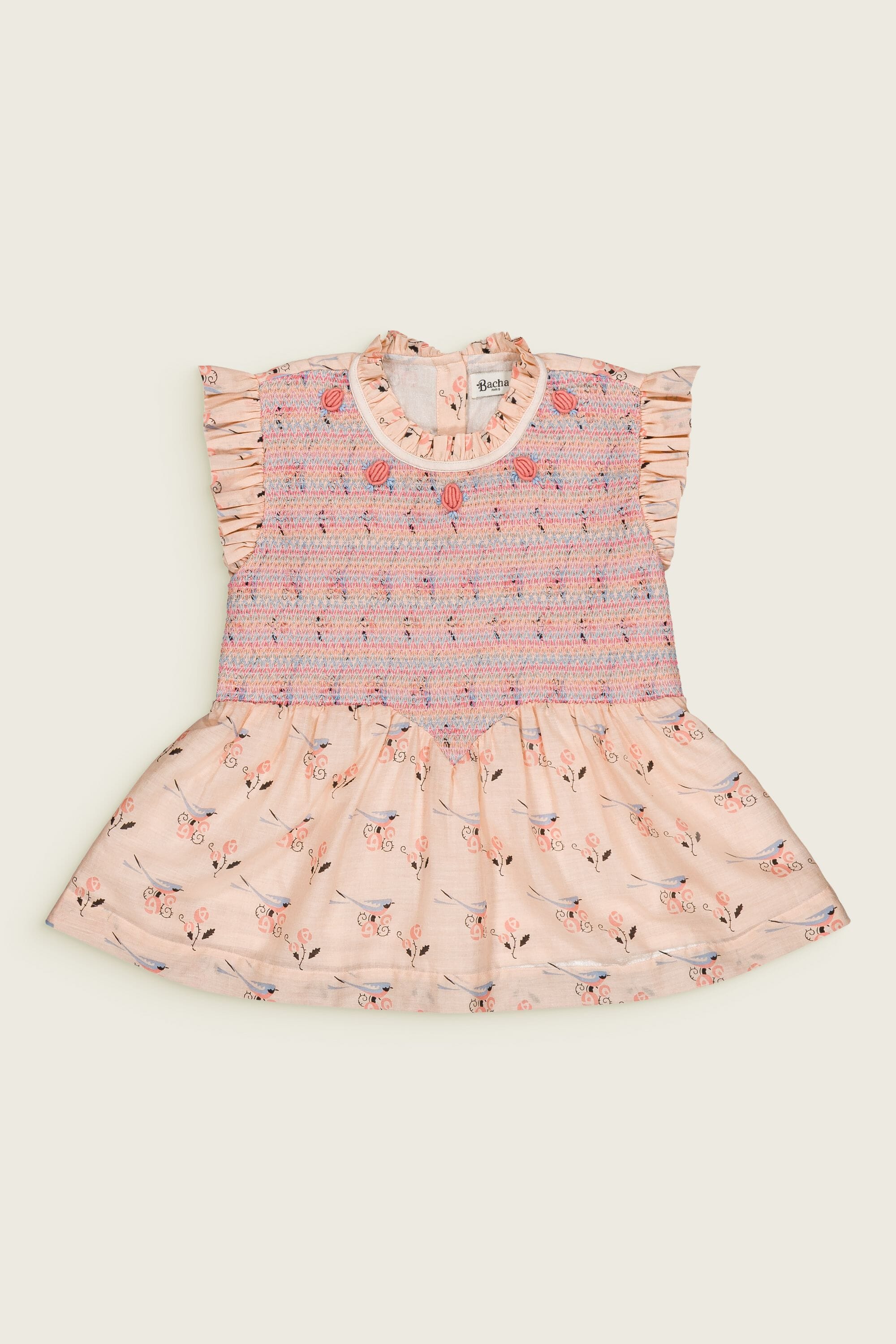 Blouse & Shorts Set, 100% organic cotton, Plain organic cotton lining, Block print, Hand embroidery and smocks on the front, Smocked waistband, Ruffled collar and armholes, Tone on tone belt & buttons at the back.