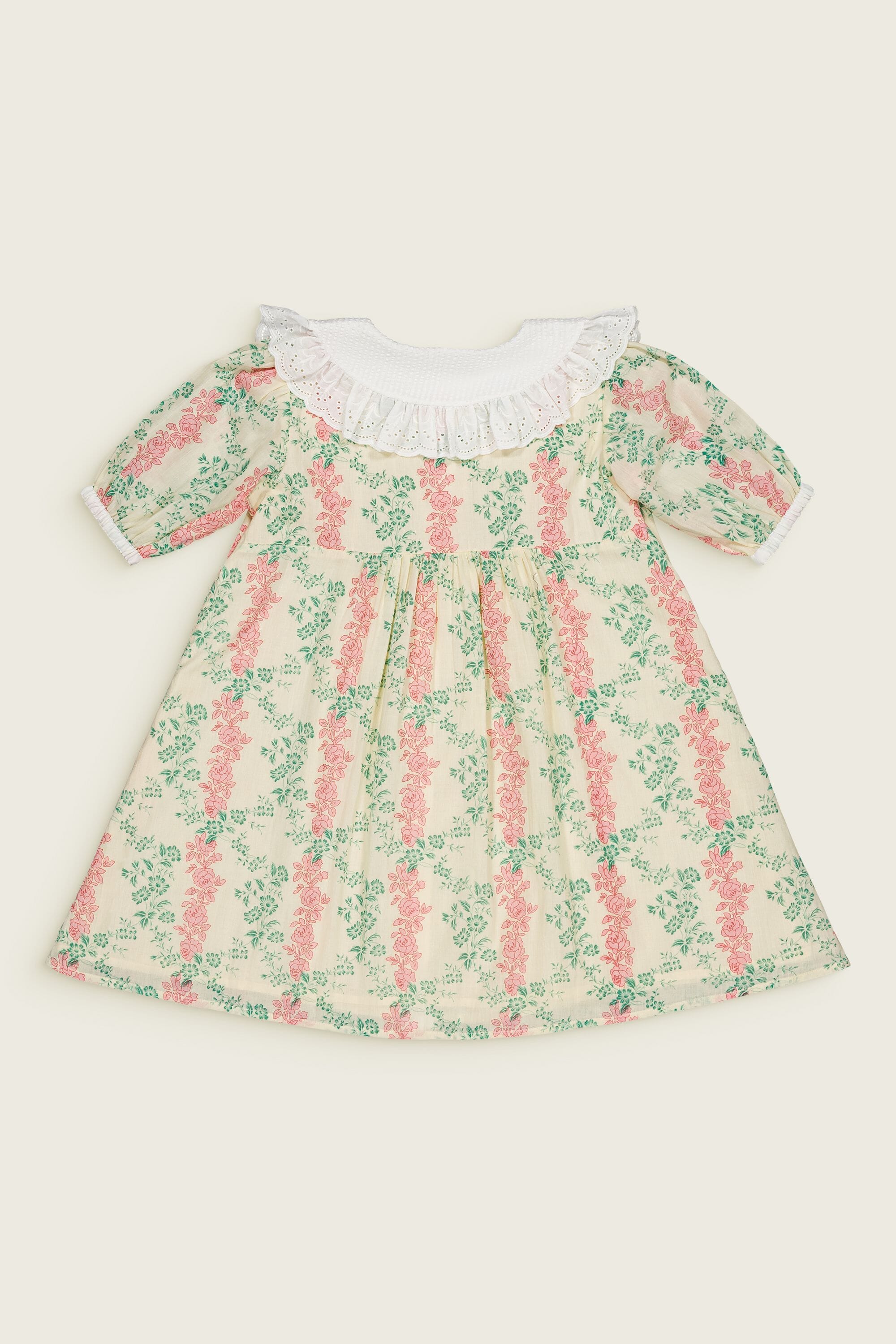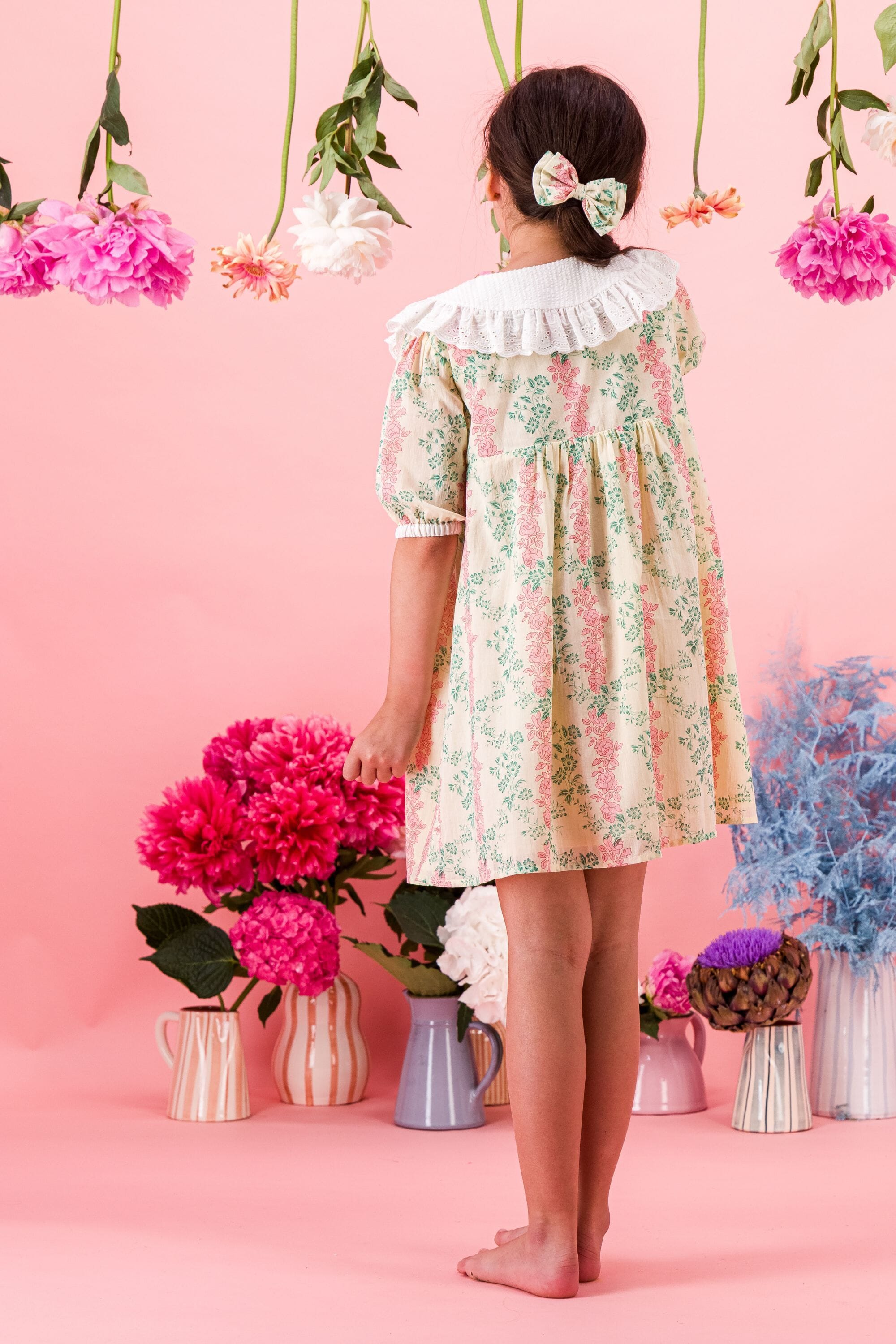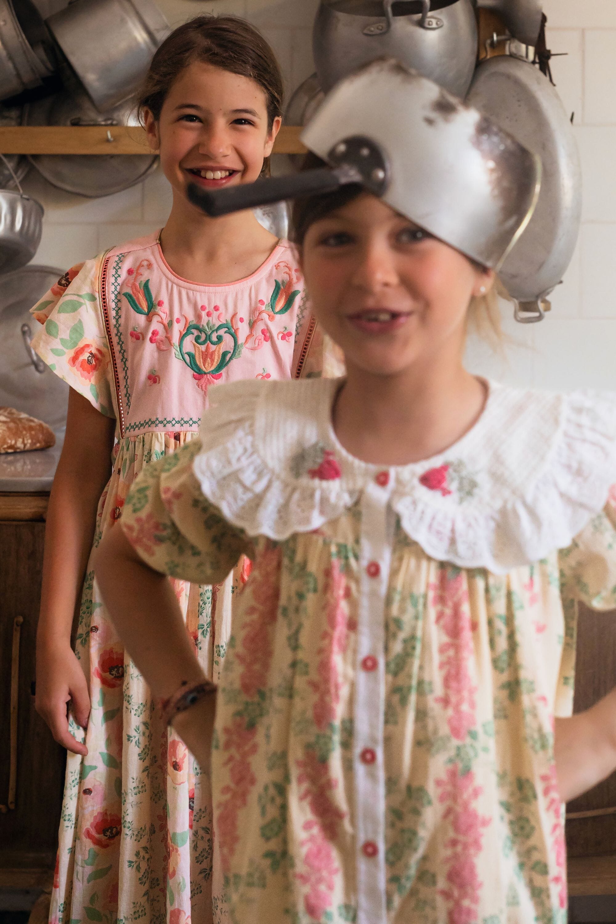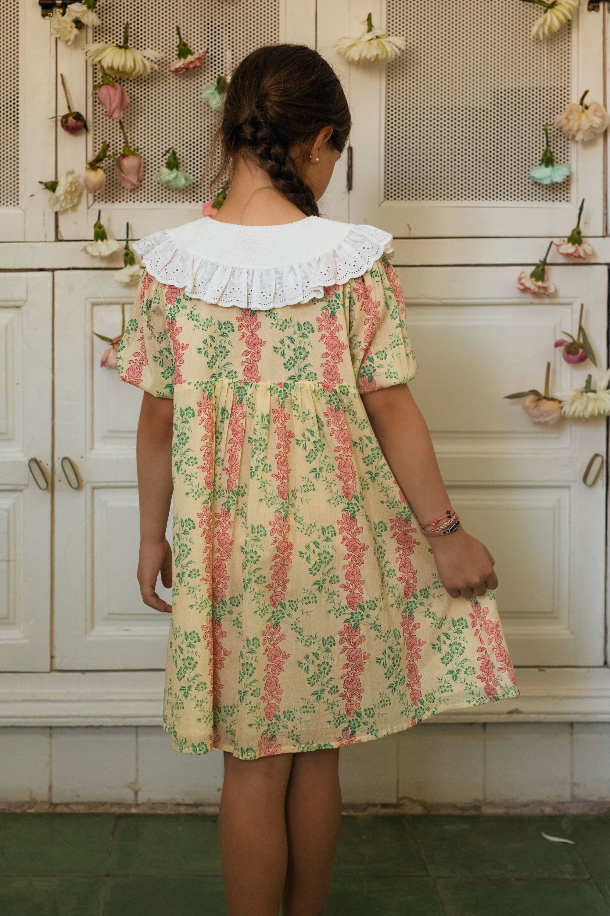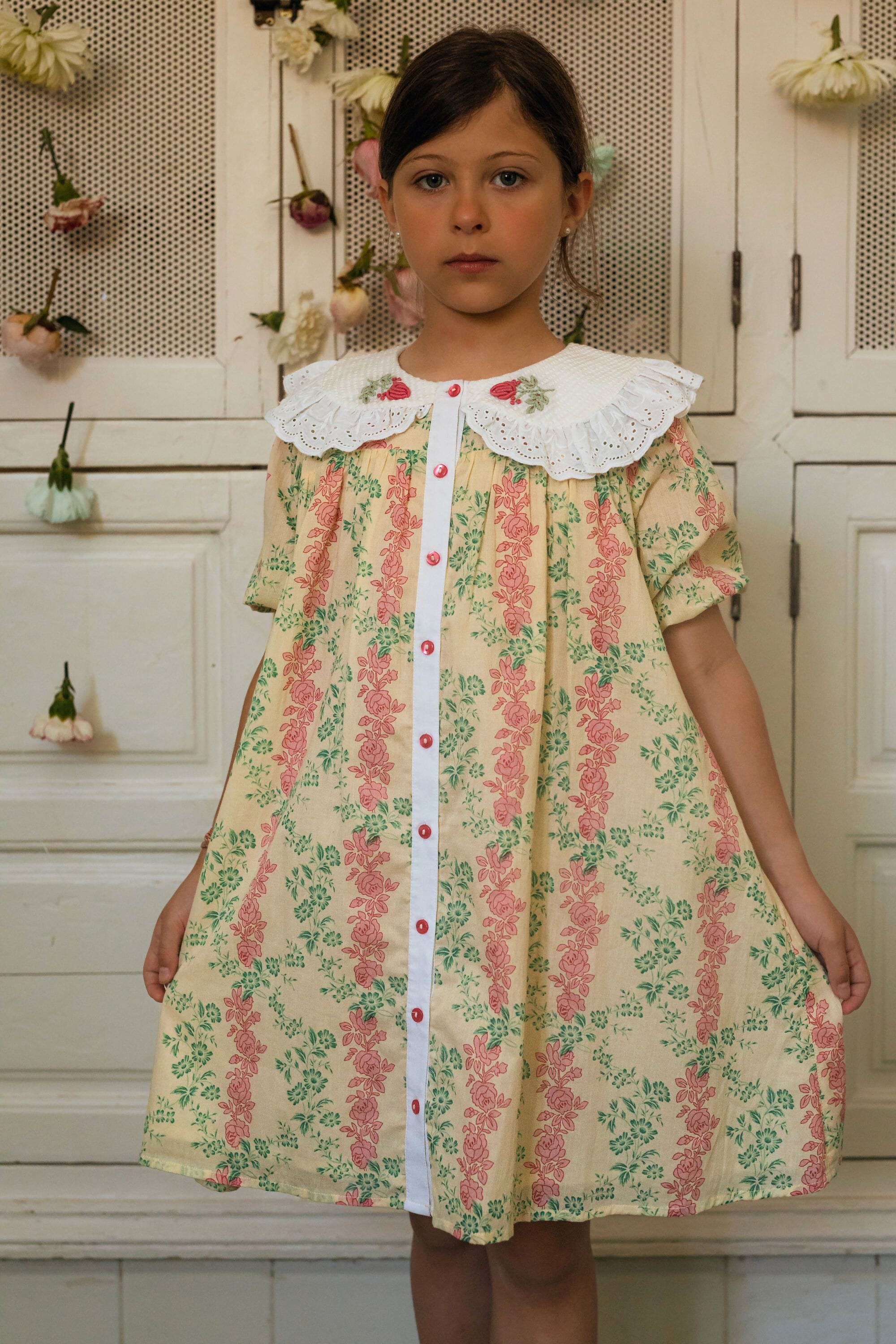 - Short sleeves shirt dress, 100% organic cotton, Block print, Plain lining in organic cotton voile, Hand embroidery and Broderie anglaise on the collar, Contrasted button placket and buttons on the front, Gathers at the front and back.