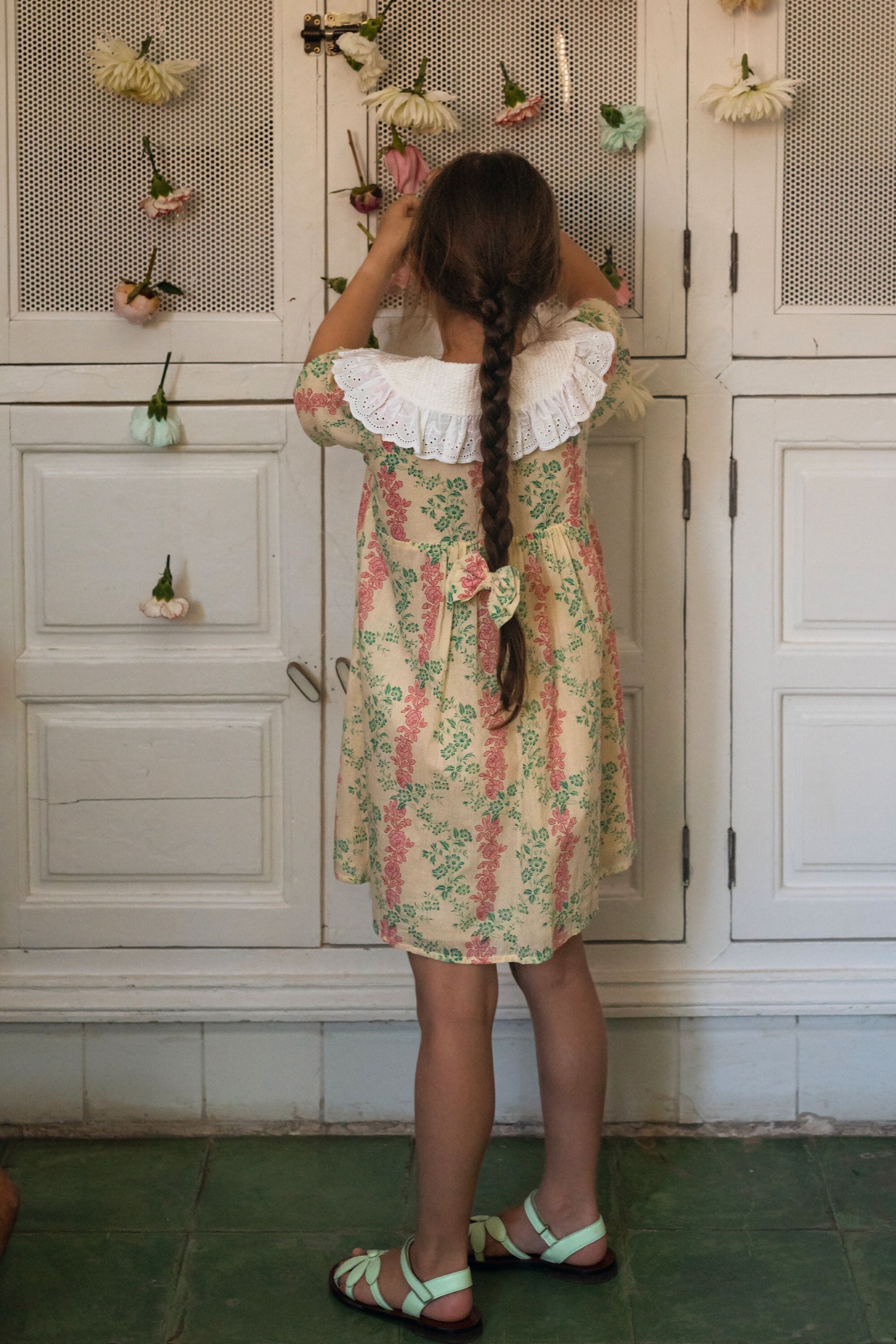 A short sleeves shirt dress in organic cotton with a magnificent collar decorated with hand embroidery and Broderie anglaise.