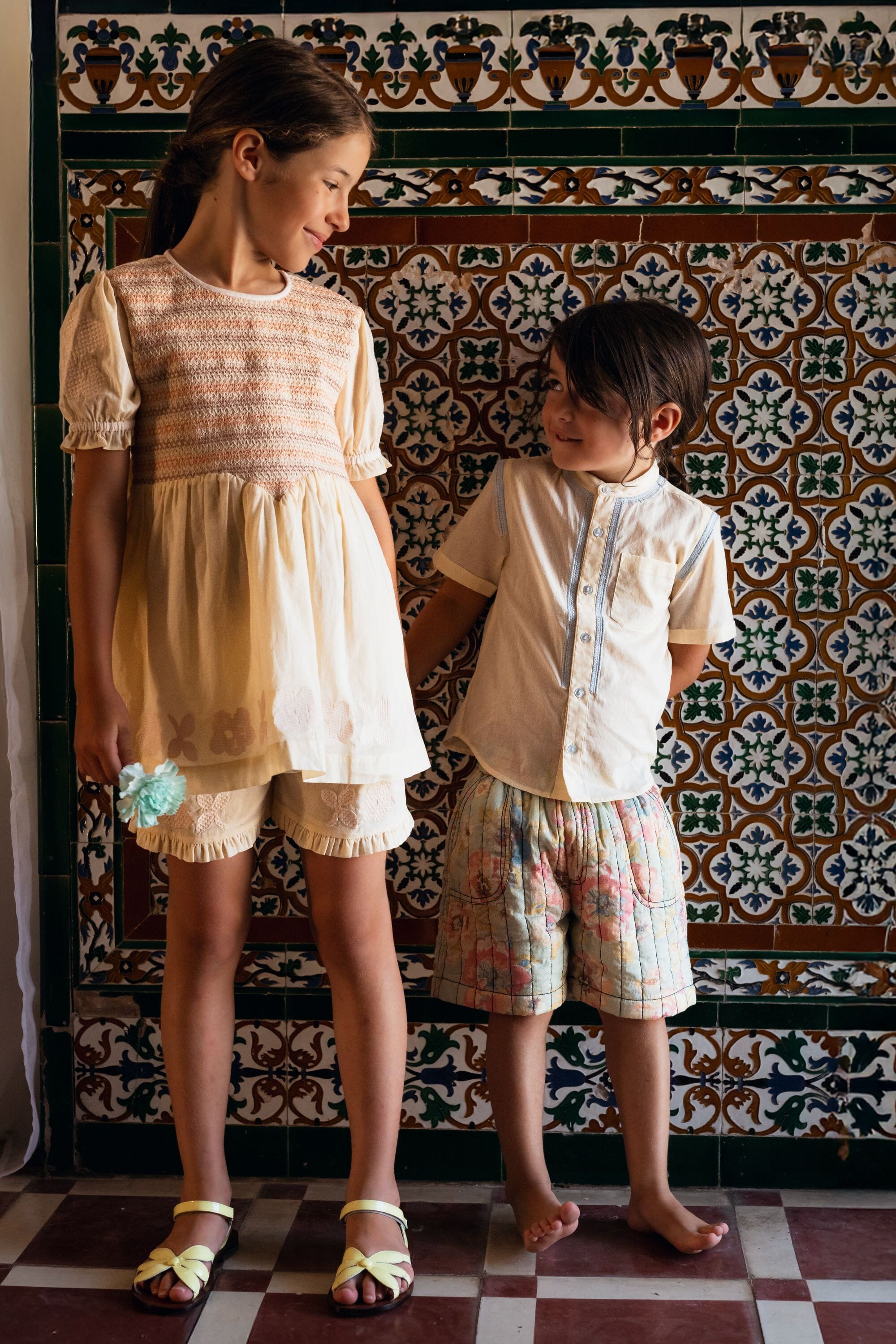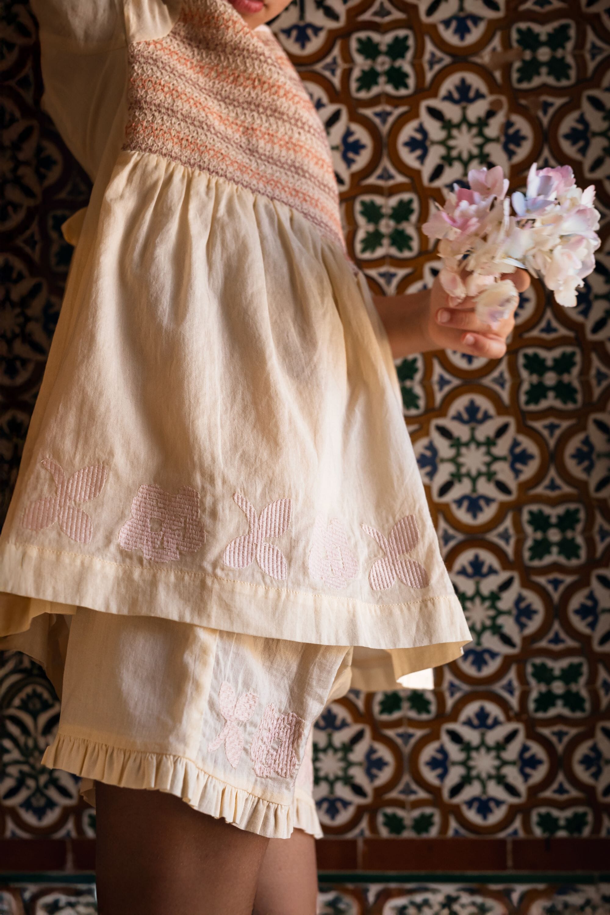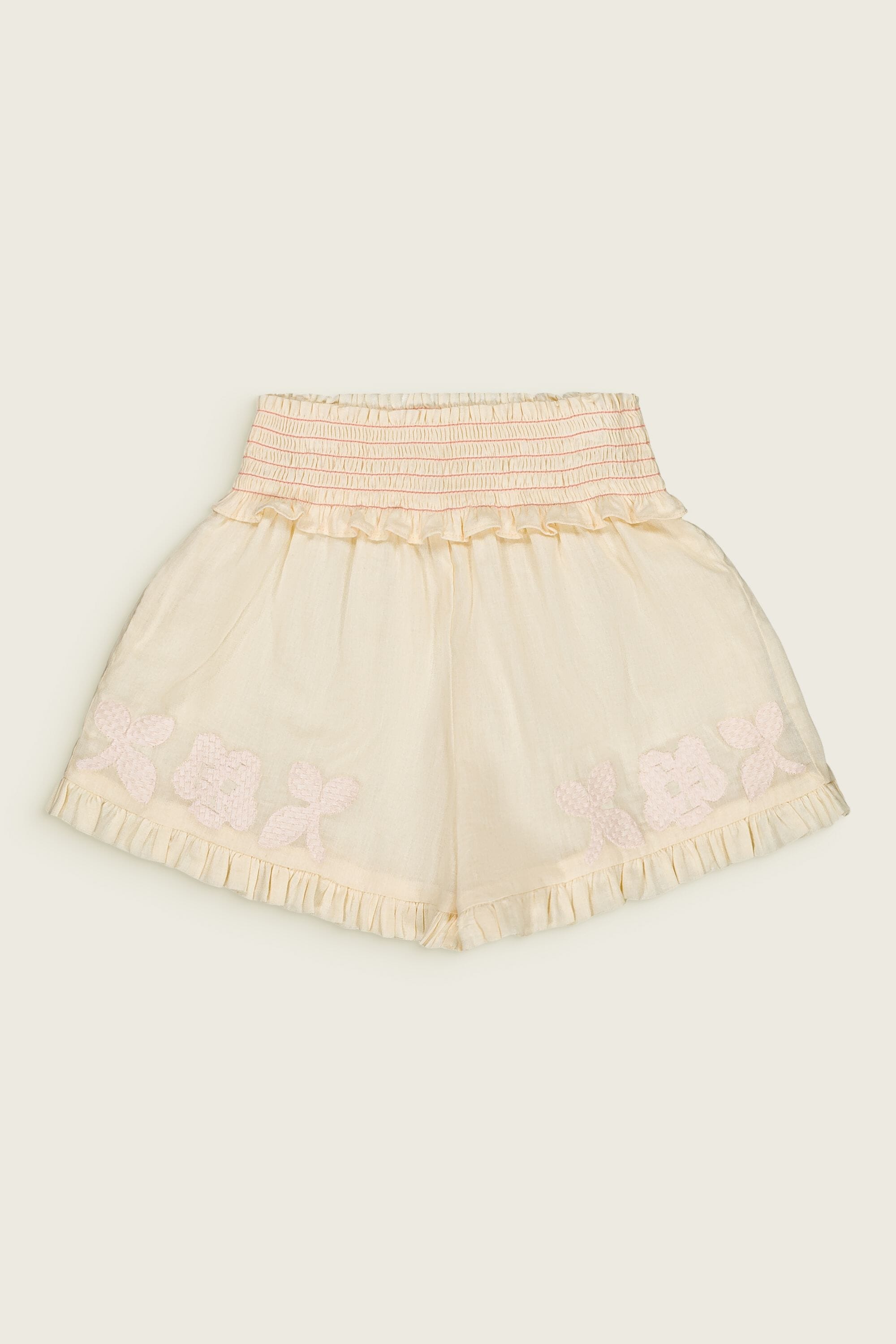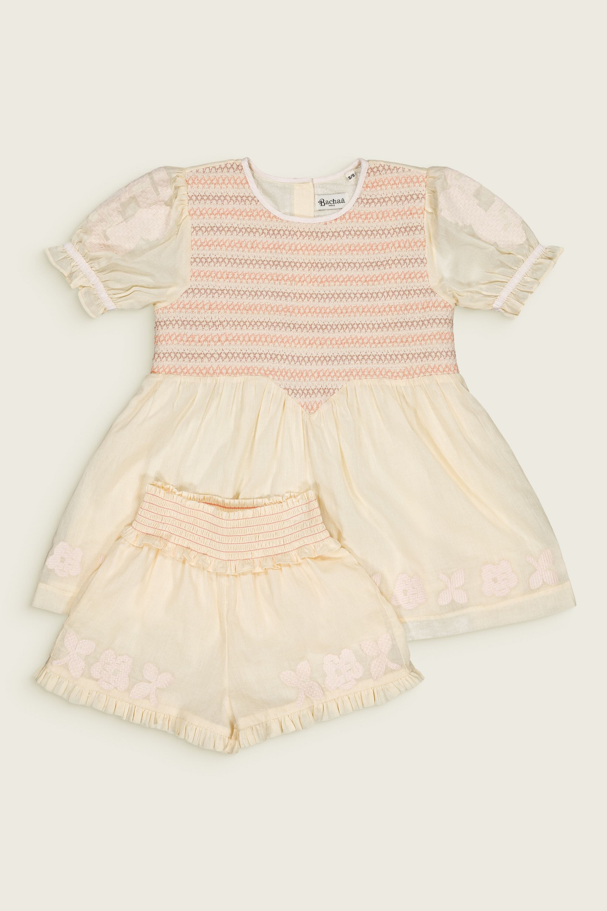 A set in organic cotton composed of a pair of shorts and a blouse adorned with smocks and floral embroideries.