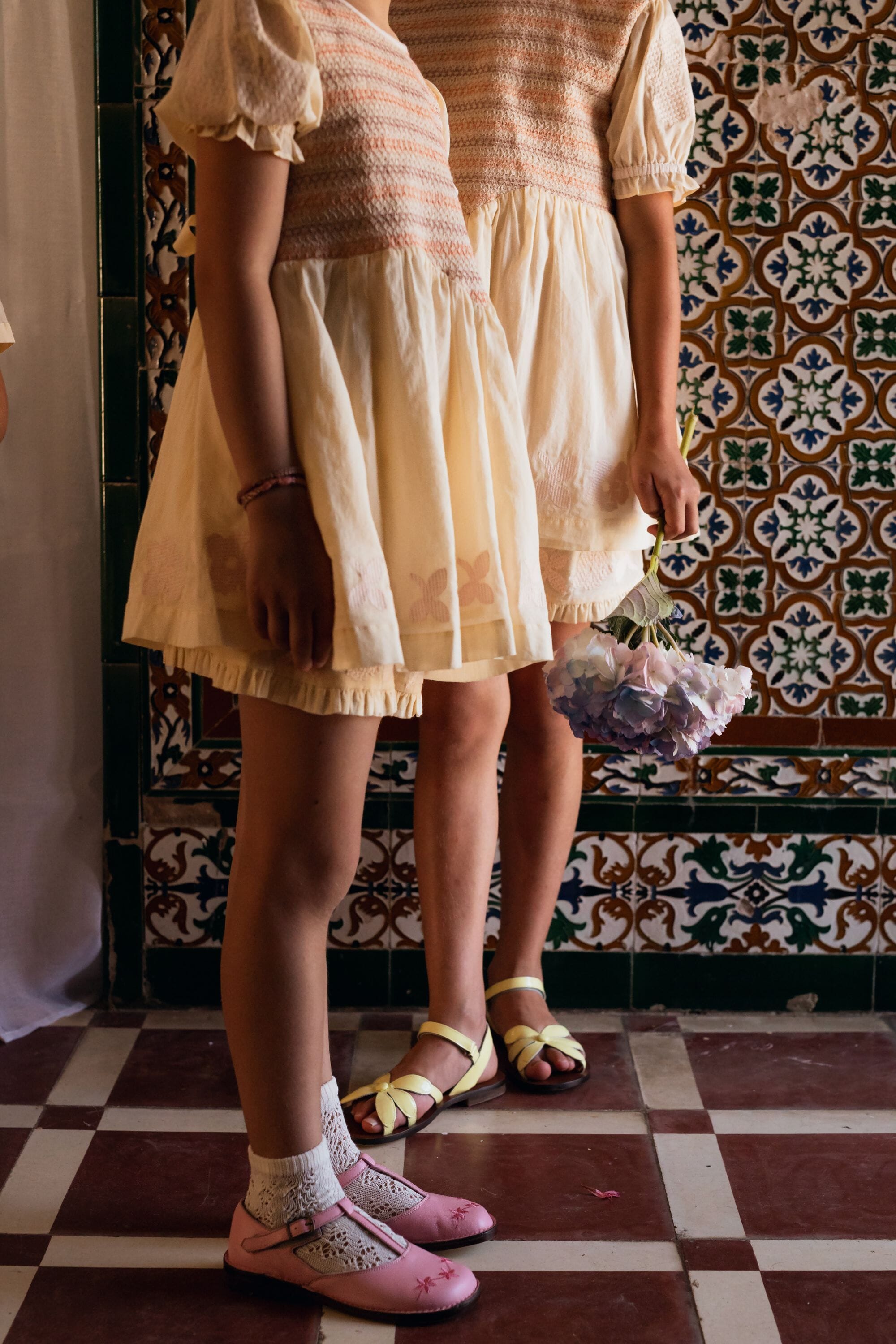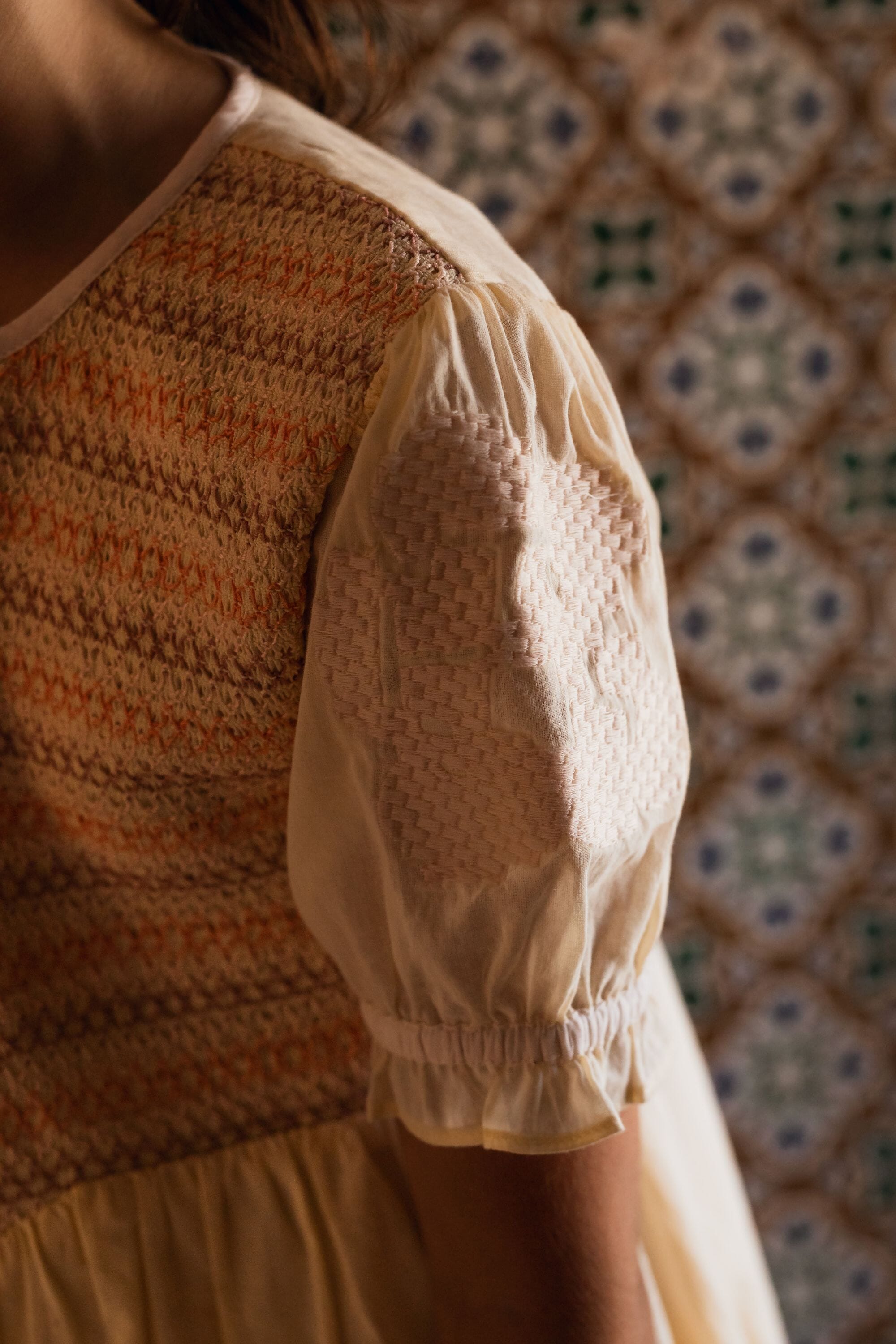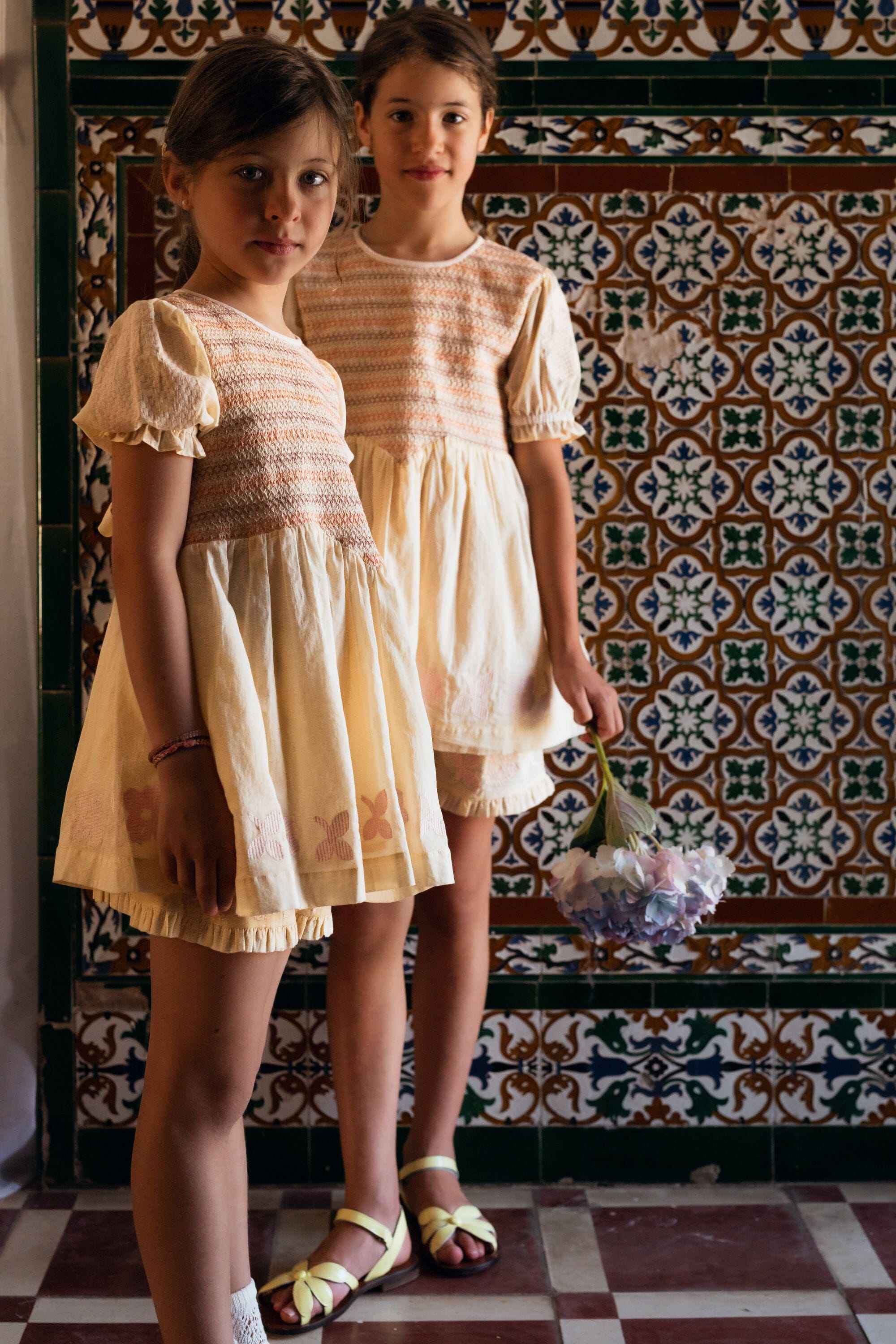Blouse & Shorts set, 100% organic cotton, Plain organic cotton lining, Pastel yellow color, Short embroidered sleeves, Smocks on the front and at the waistband, Embroideries on the blouse and the shorts, Tone-on-tone buttons and belt at the back.