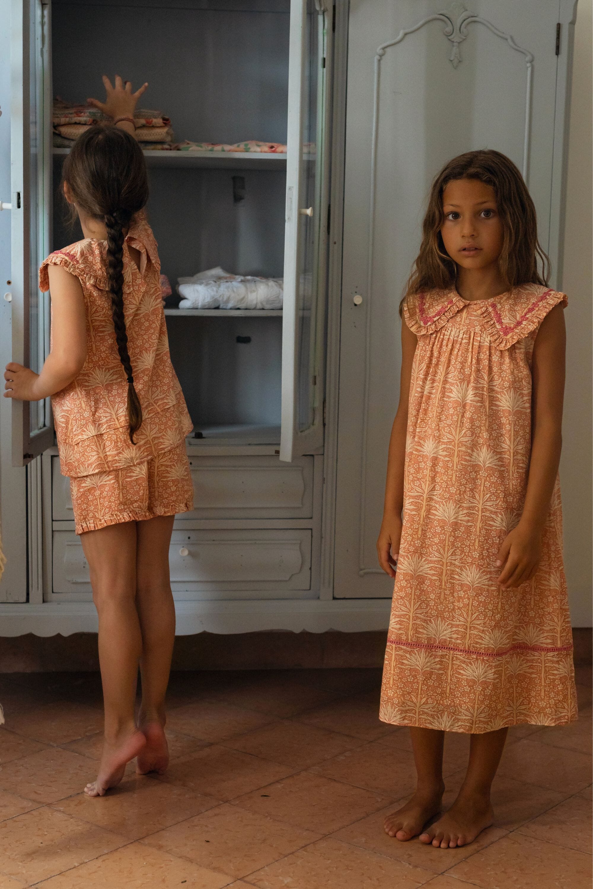 - Sleeveless nightdress, 100% organic cotton, Plain lining in organic cotton voile, Block print, Hand embroidery on the collar, Ladder lace at the bottom of the sleeves and on the front, Gathers at the front and back, Contrasting buttons.