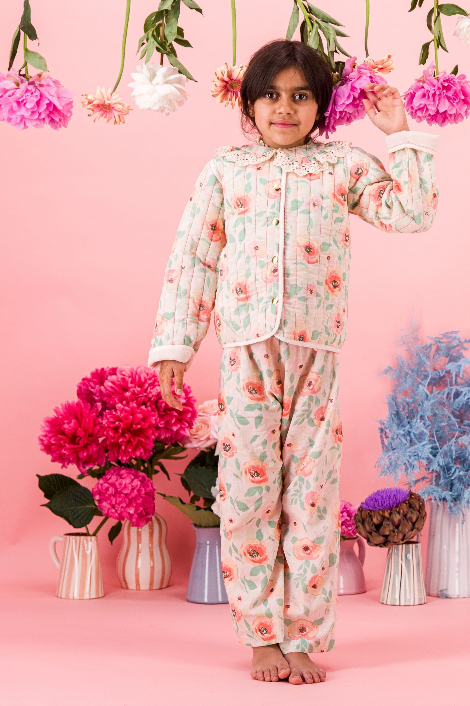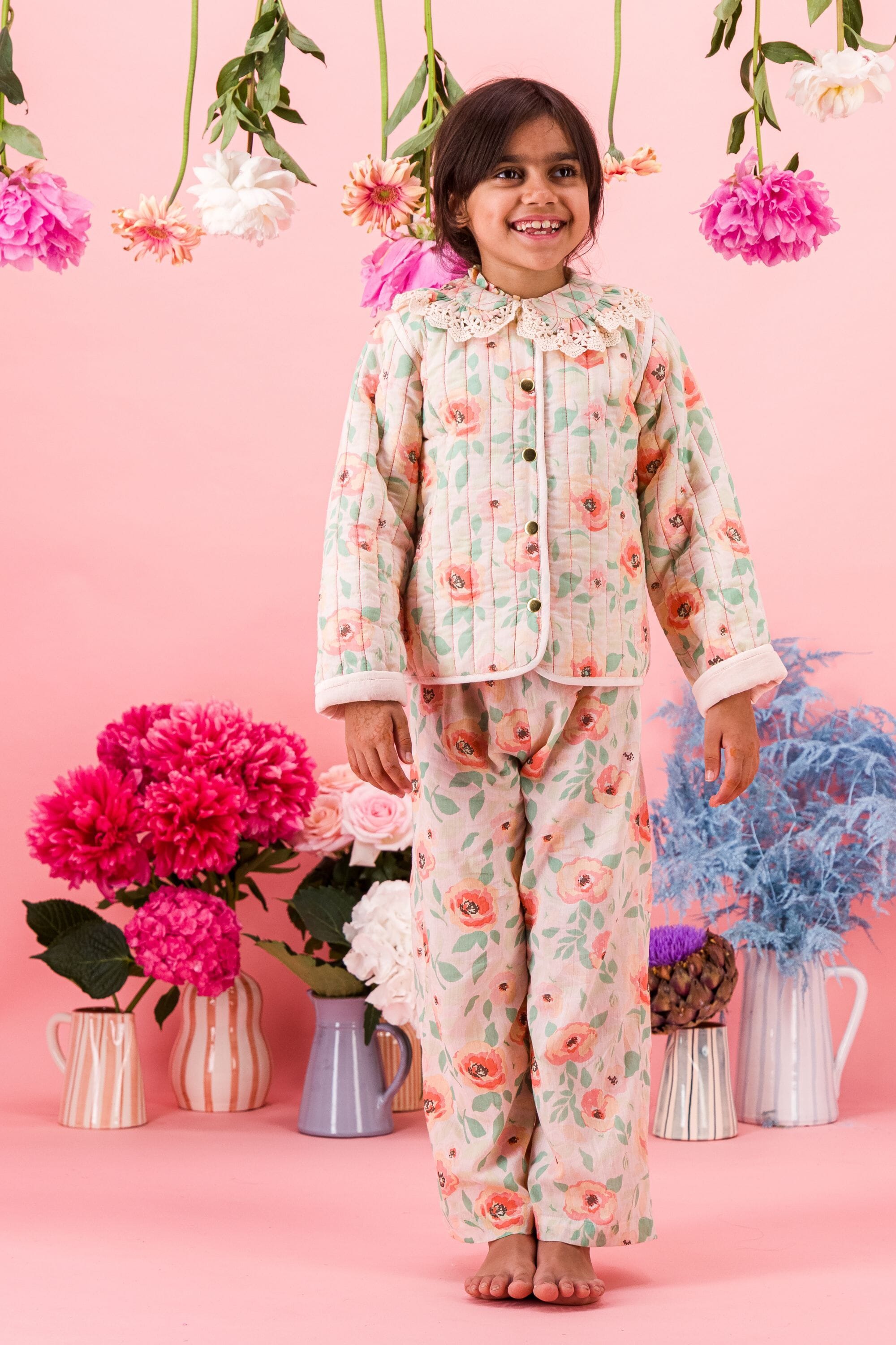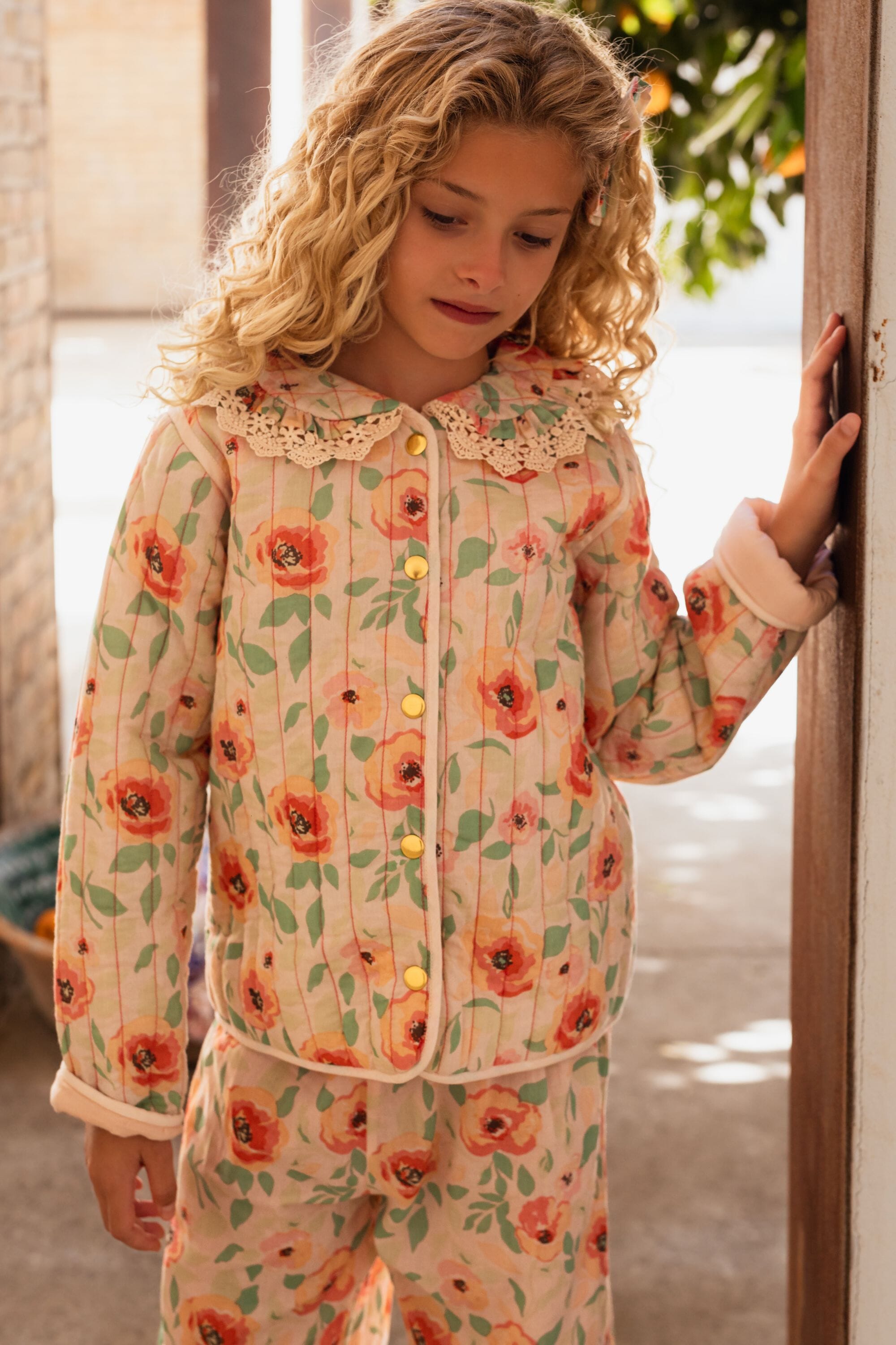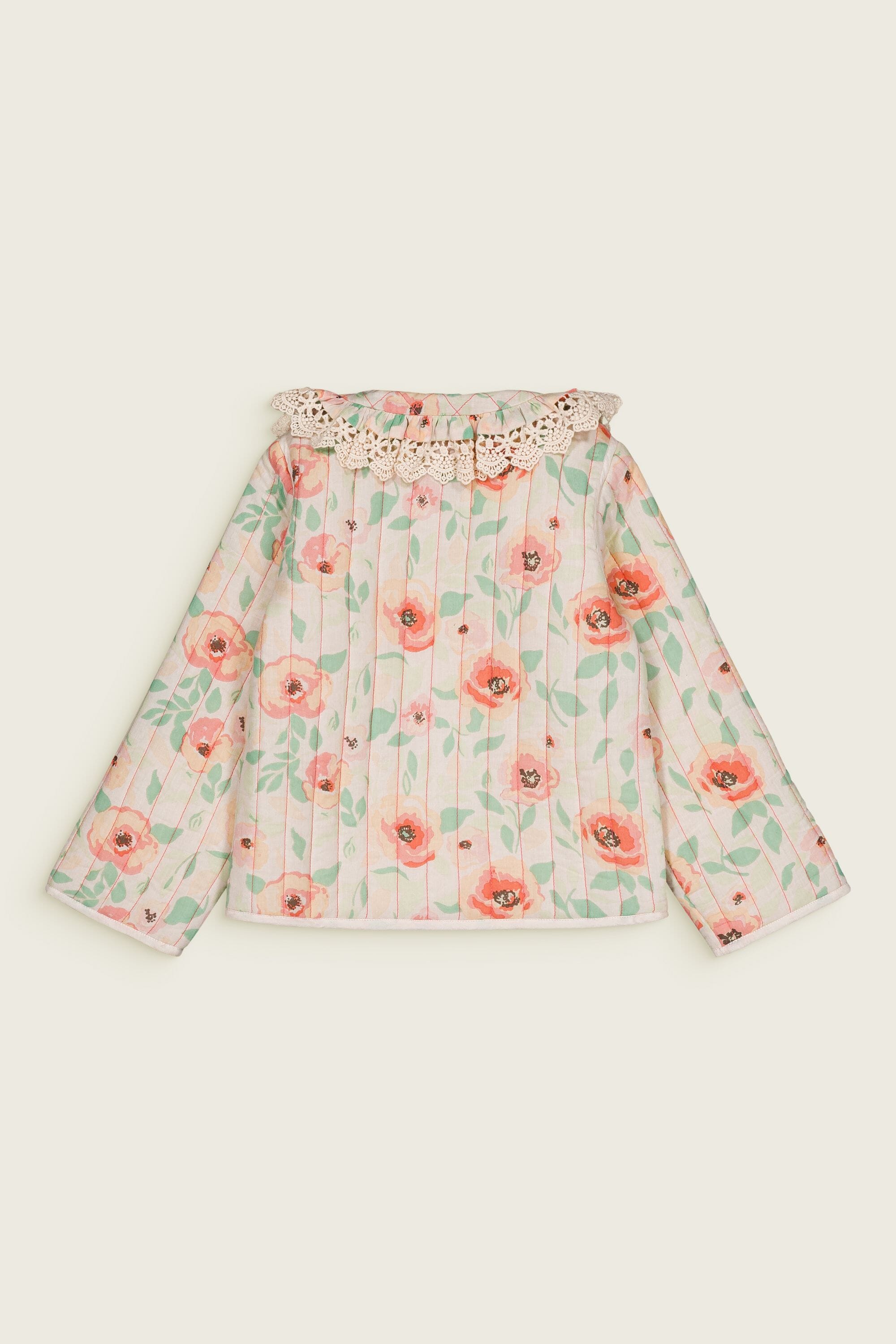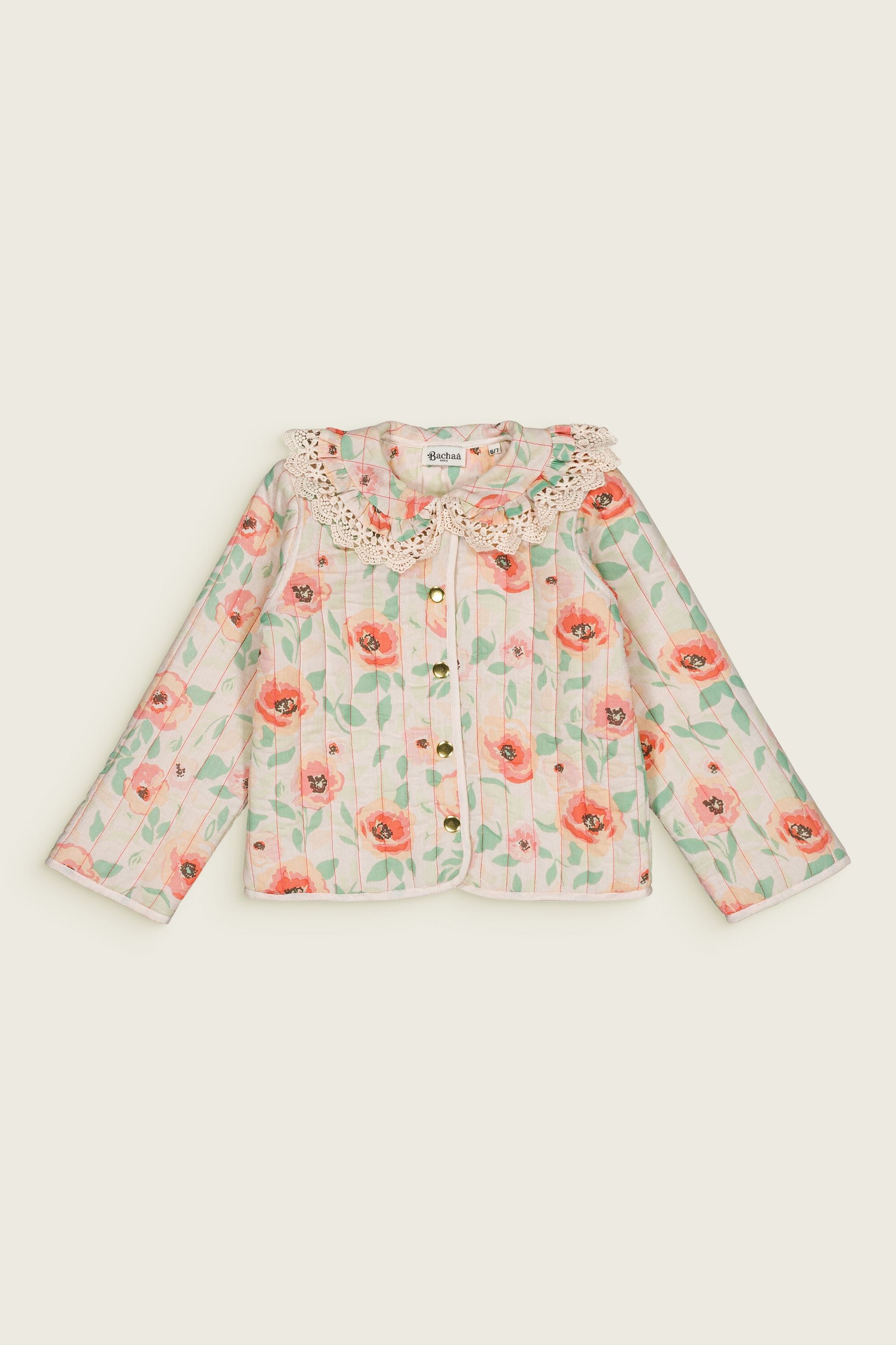 Jacket, 100% organic cotton, Block print, Lace finished collar, Padded lining, Topstitching, Contrast sleeve turn-ups, Gold buttons.