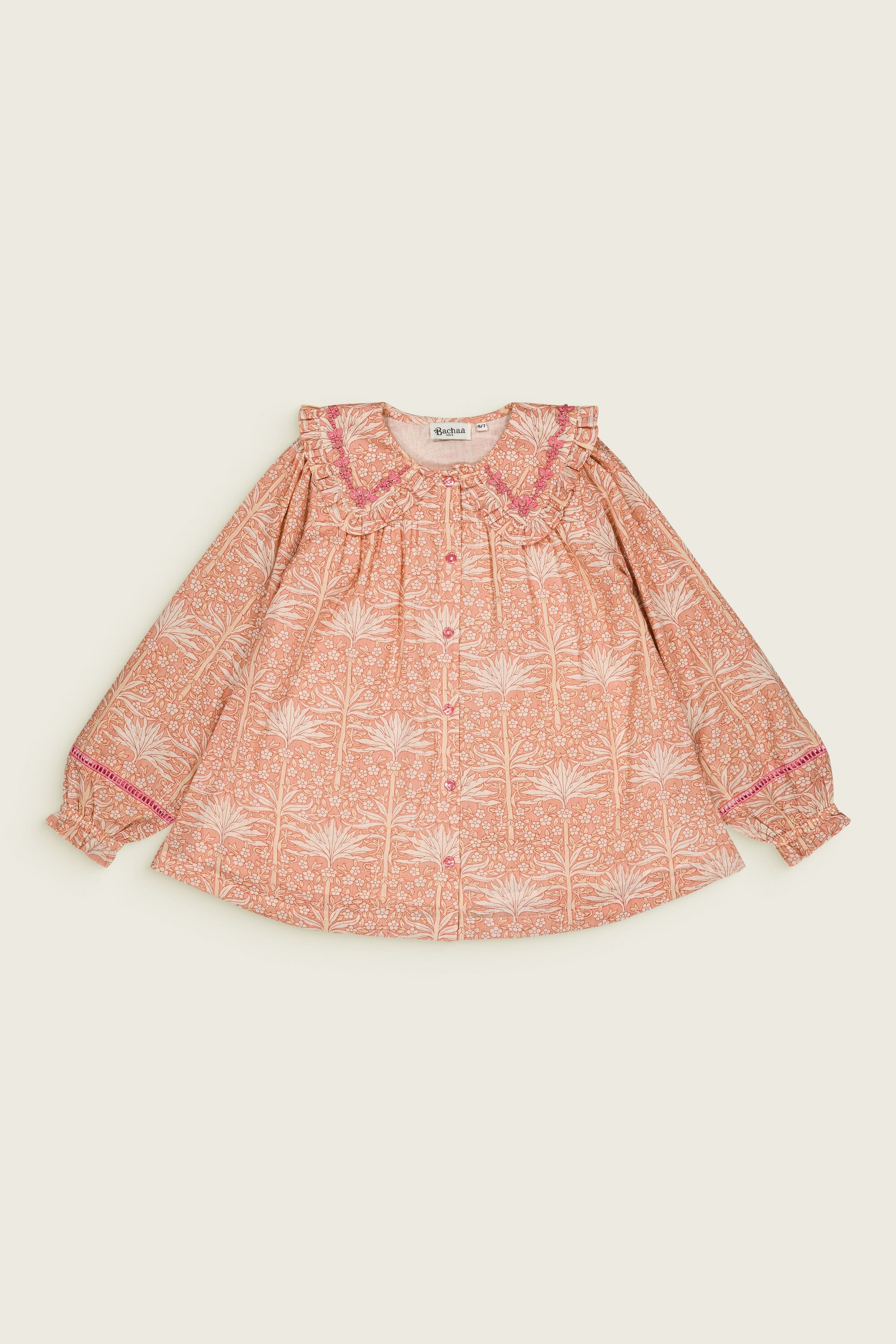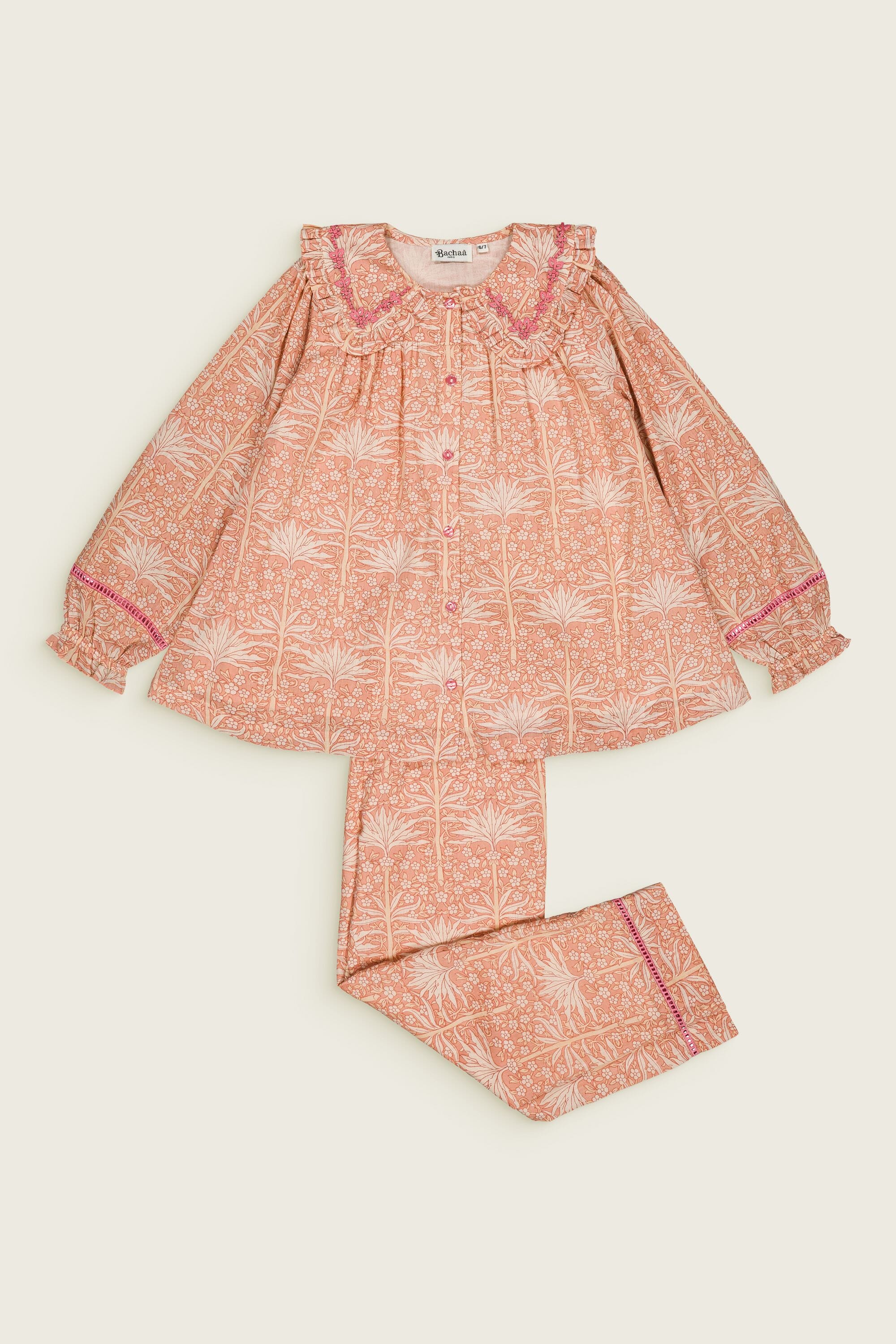 A Pajamas in 100% organic cotton that combines a pant and a blouse with hand embroidery on the collar.