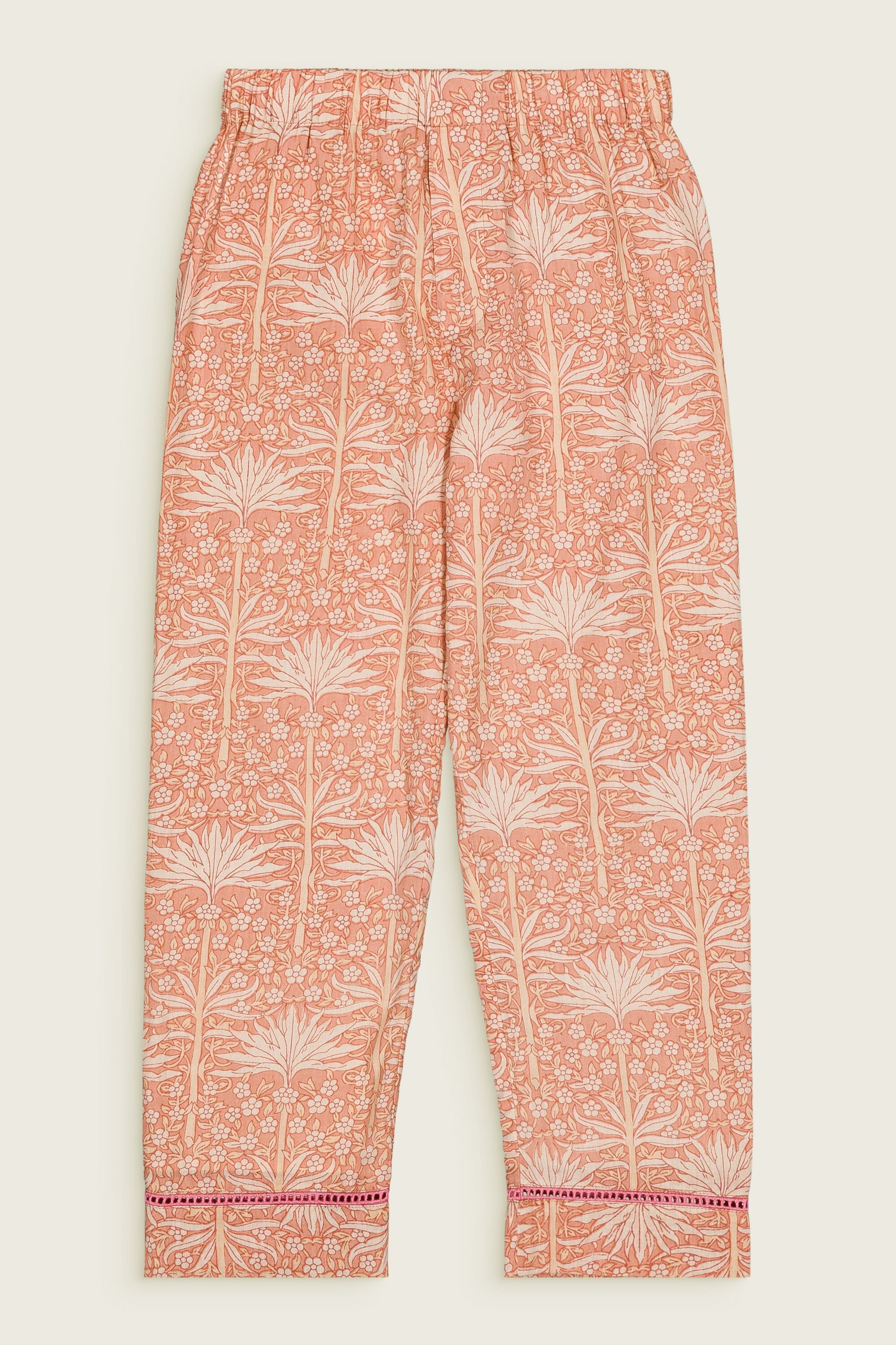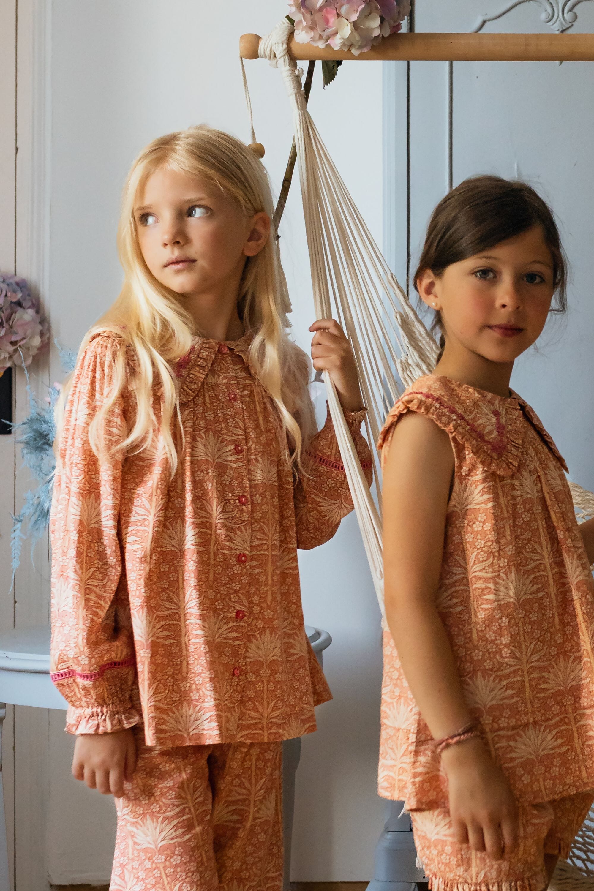 - Pajamas (Pant & blouse), 100% organic cotton, Plain lining in organic cotton voile, Block print, Hand embroidery on the collar, Ladder lace at the bottom of the sleeves and legs, Gathers on the front, Contrasting buttons.