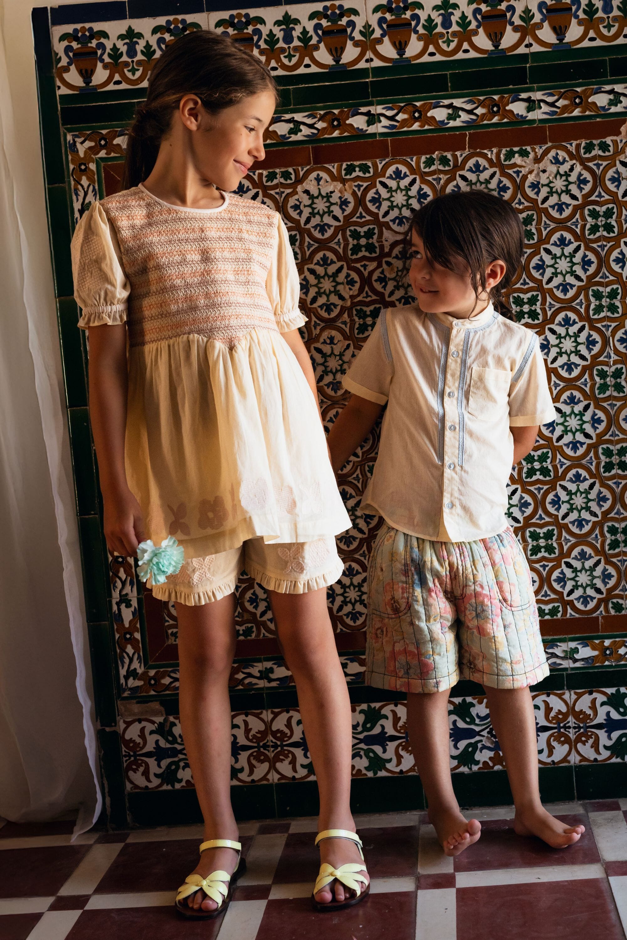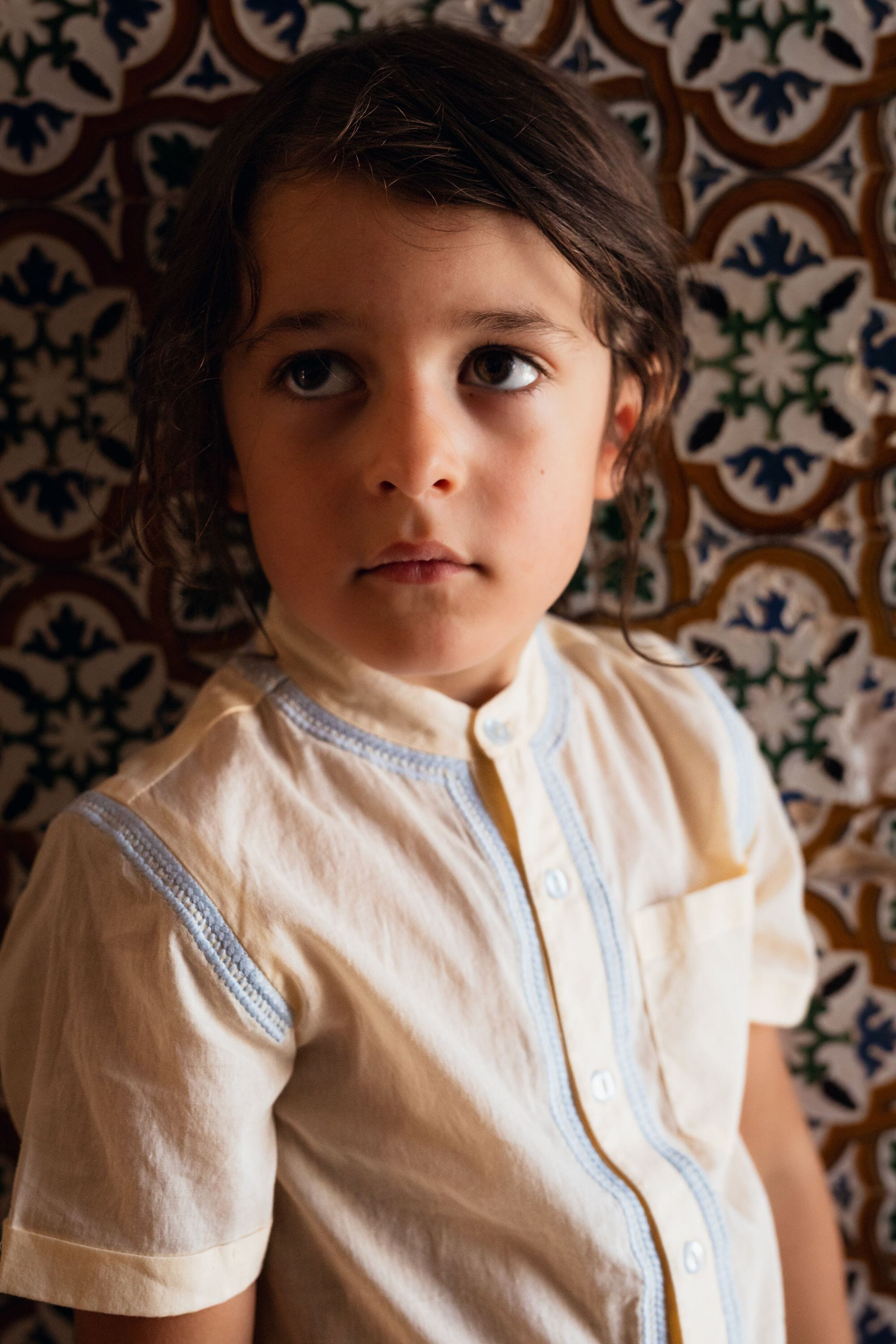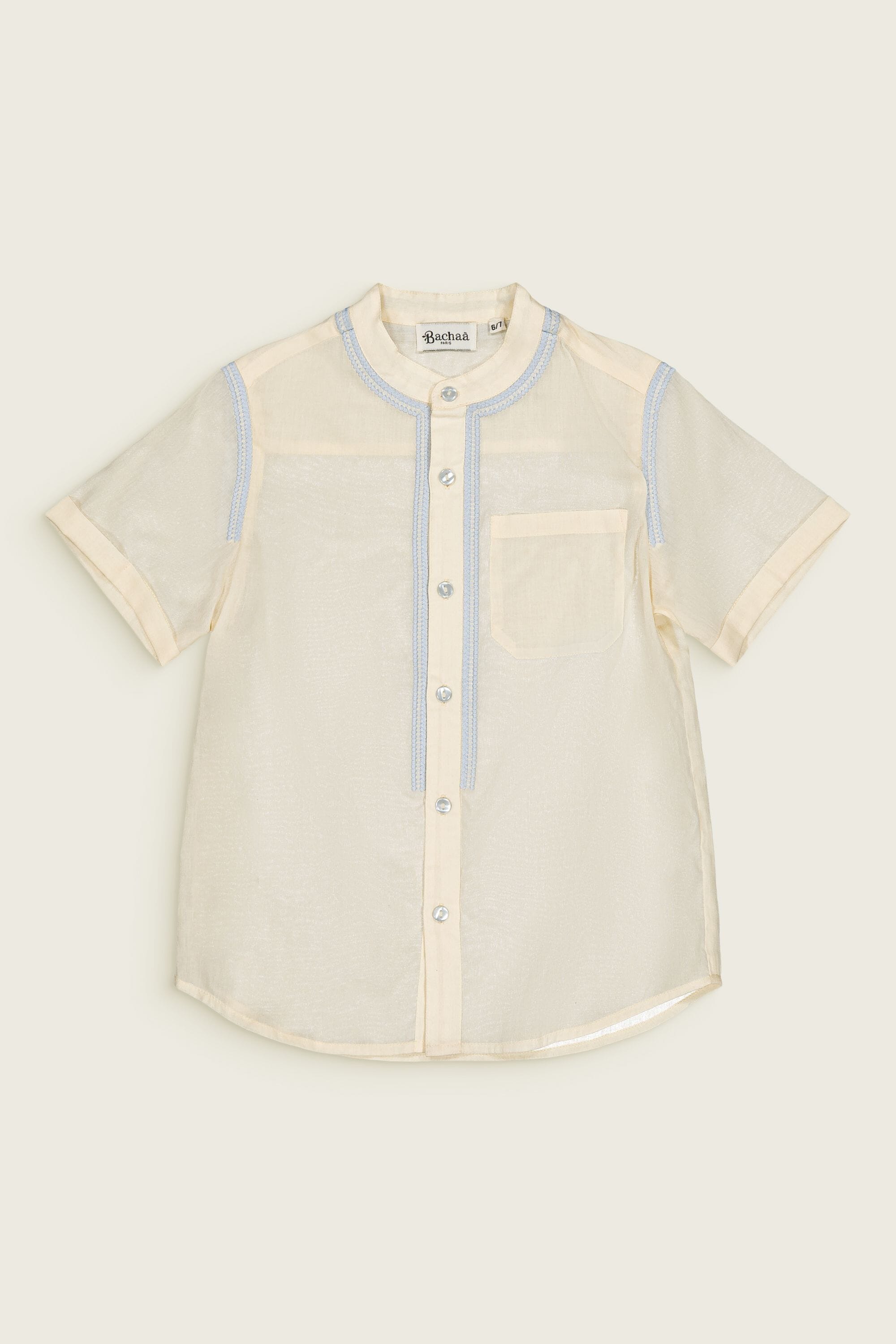 - Shirt, 100% organic cotton, Pastel Yellow color, Officer collar, Embroidery along the collar, button placket and armholes, Chest pocket, Short sleeves, Contrasting buttons.