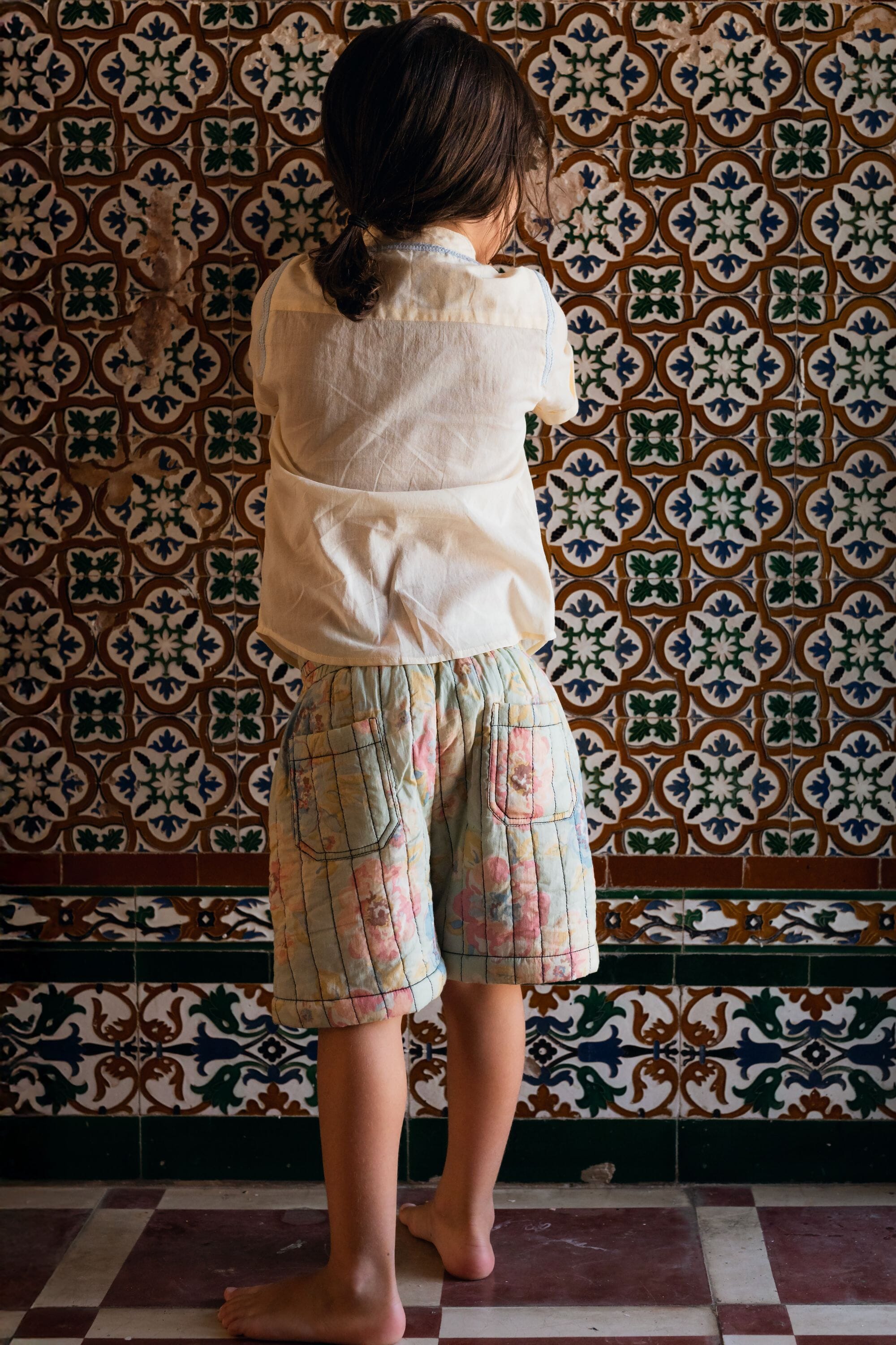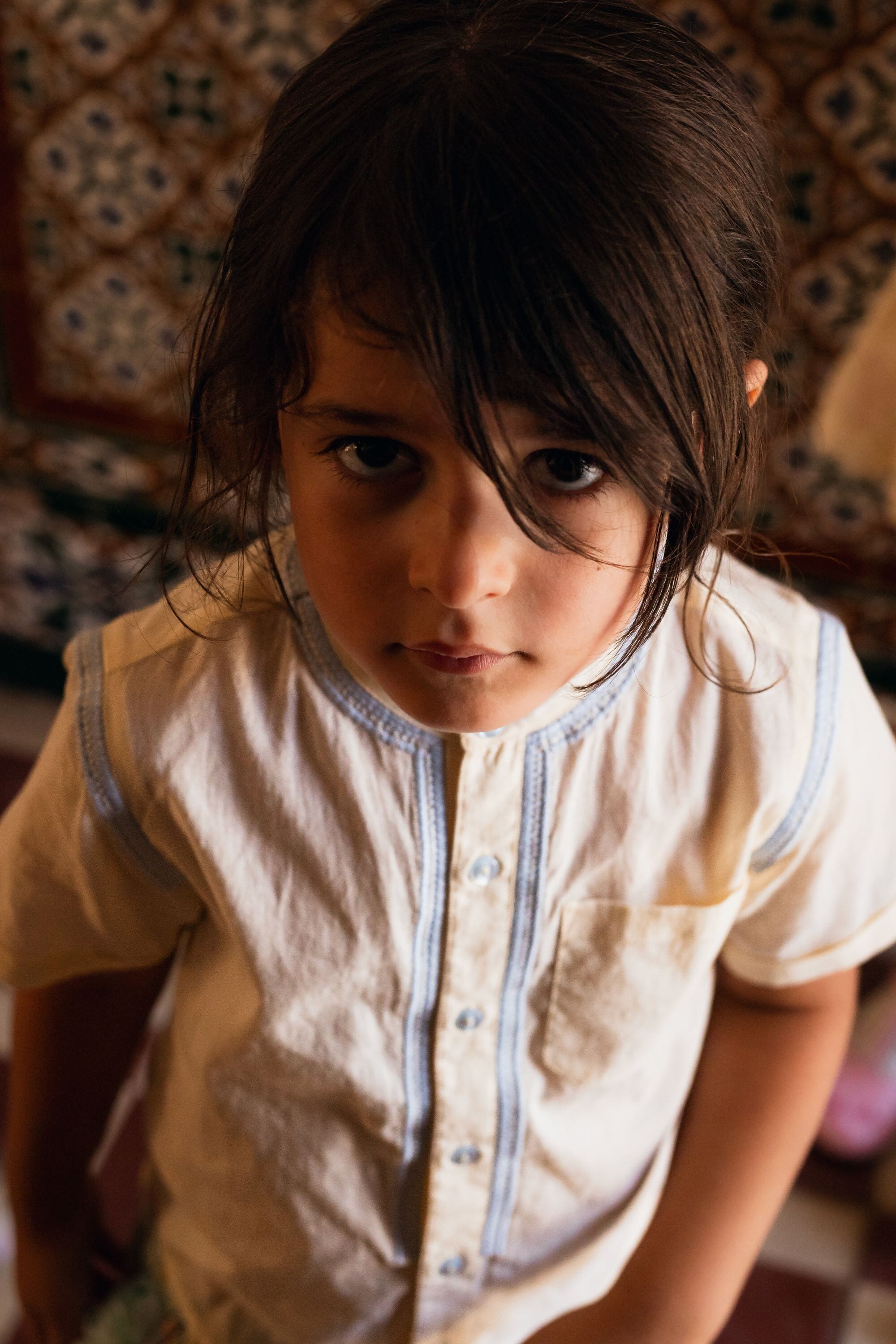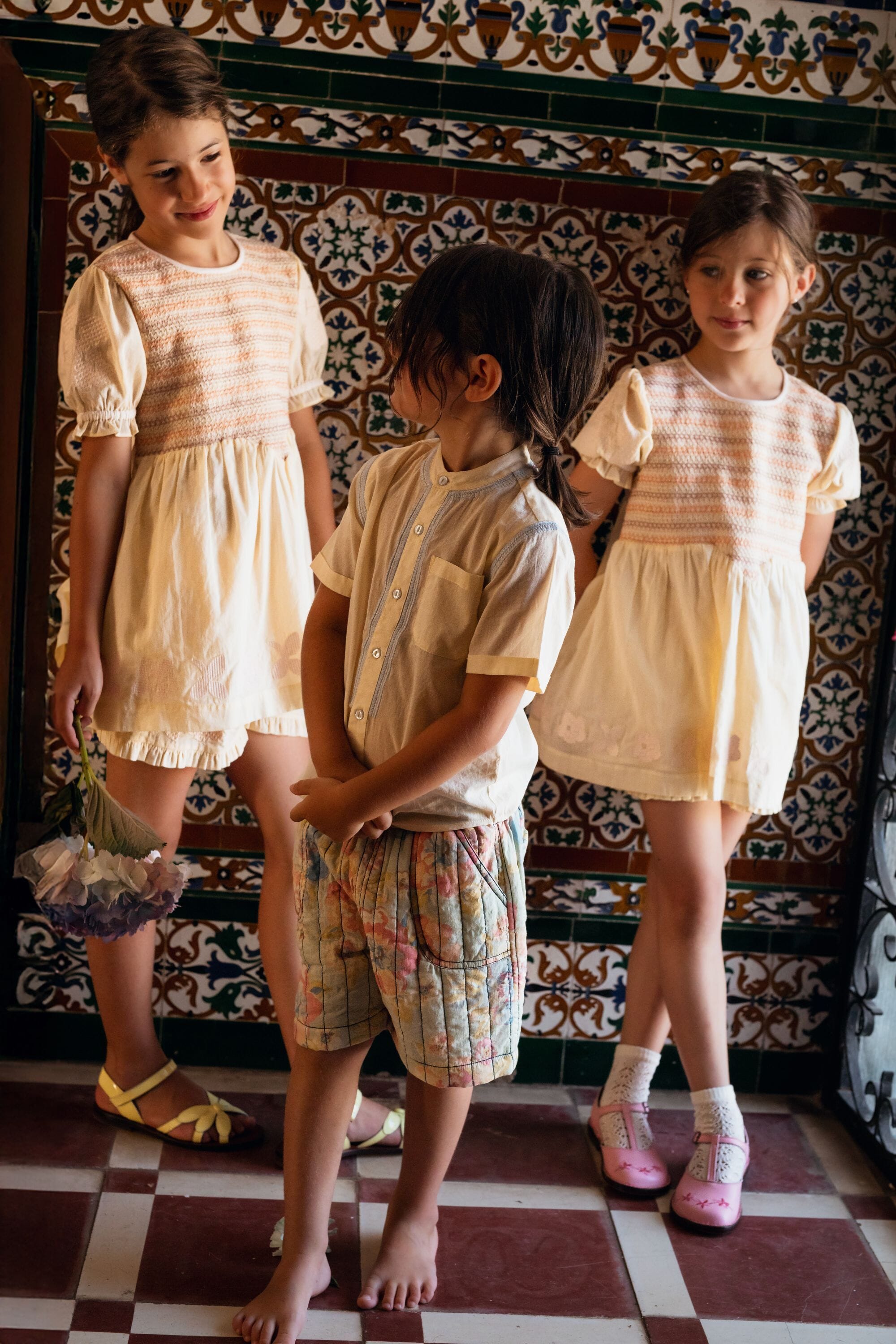 - Shirt, 100% organic cotton, Pastel Yellow color, Officer collar, Embroidery along the collar, button placket and armholes, Chest pocket, Short sleeves, Contrasting buttons.