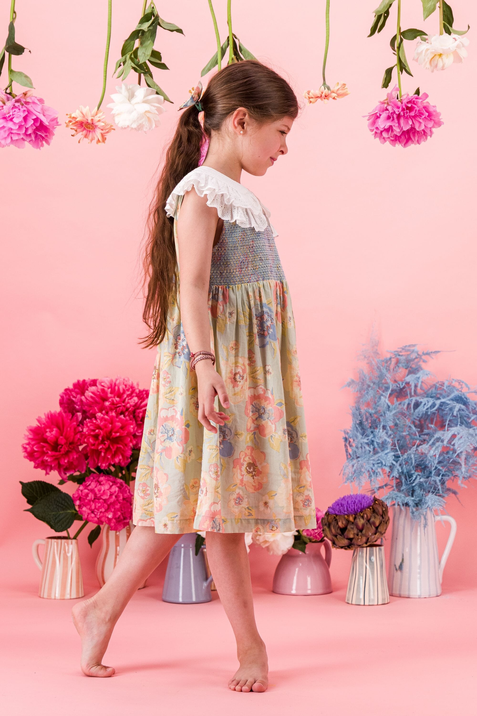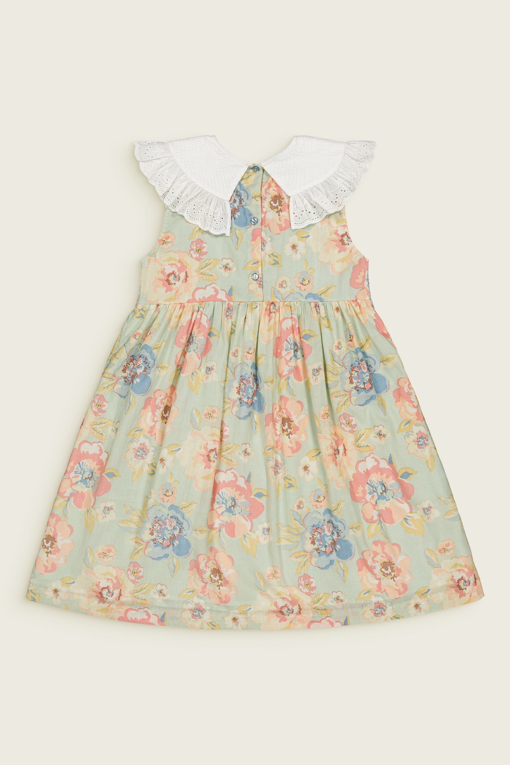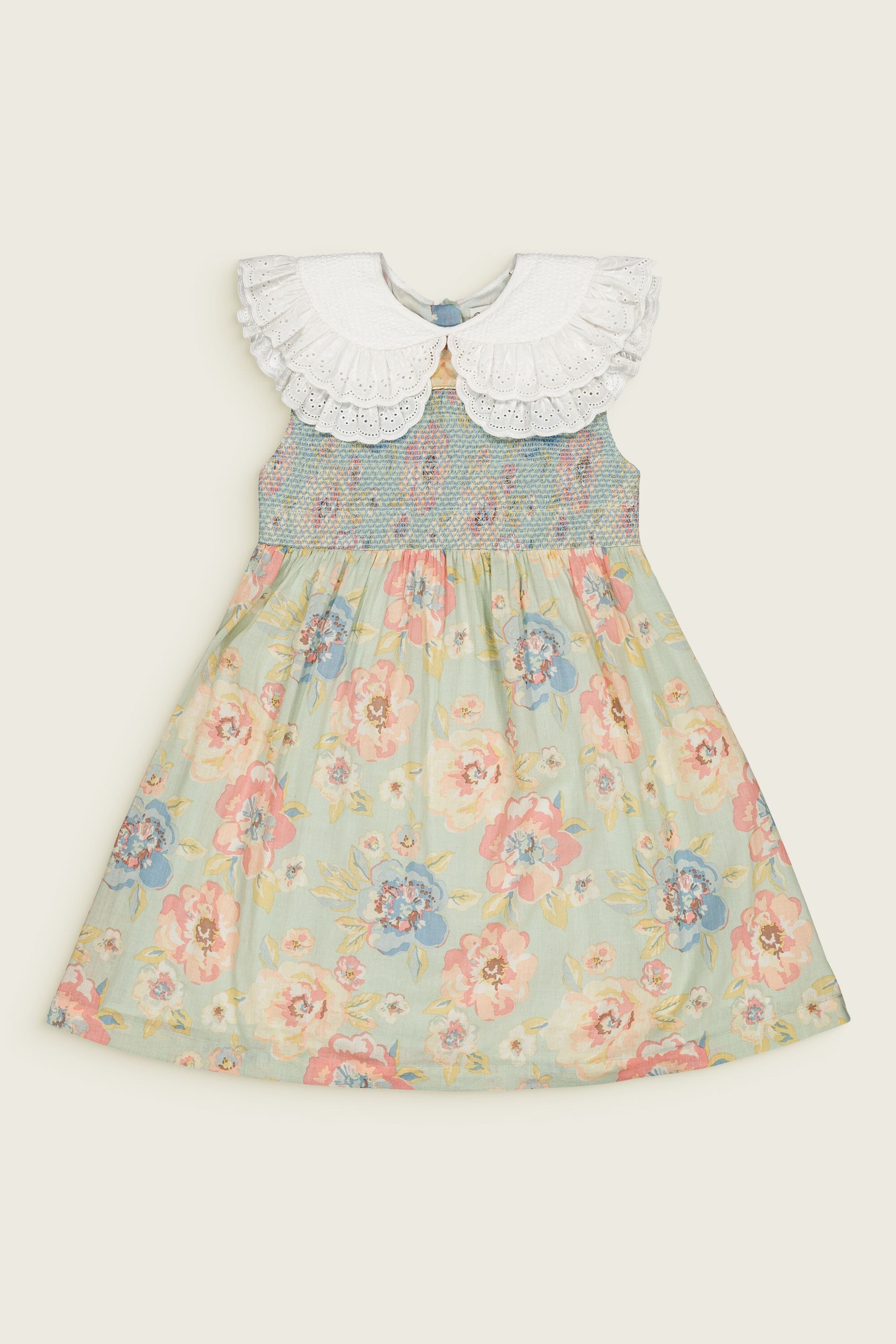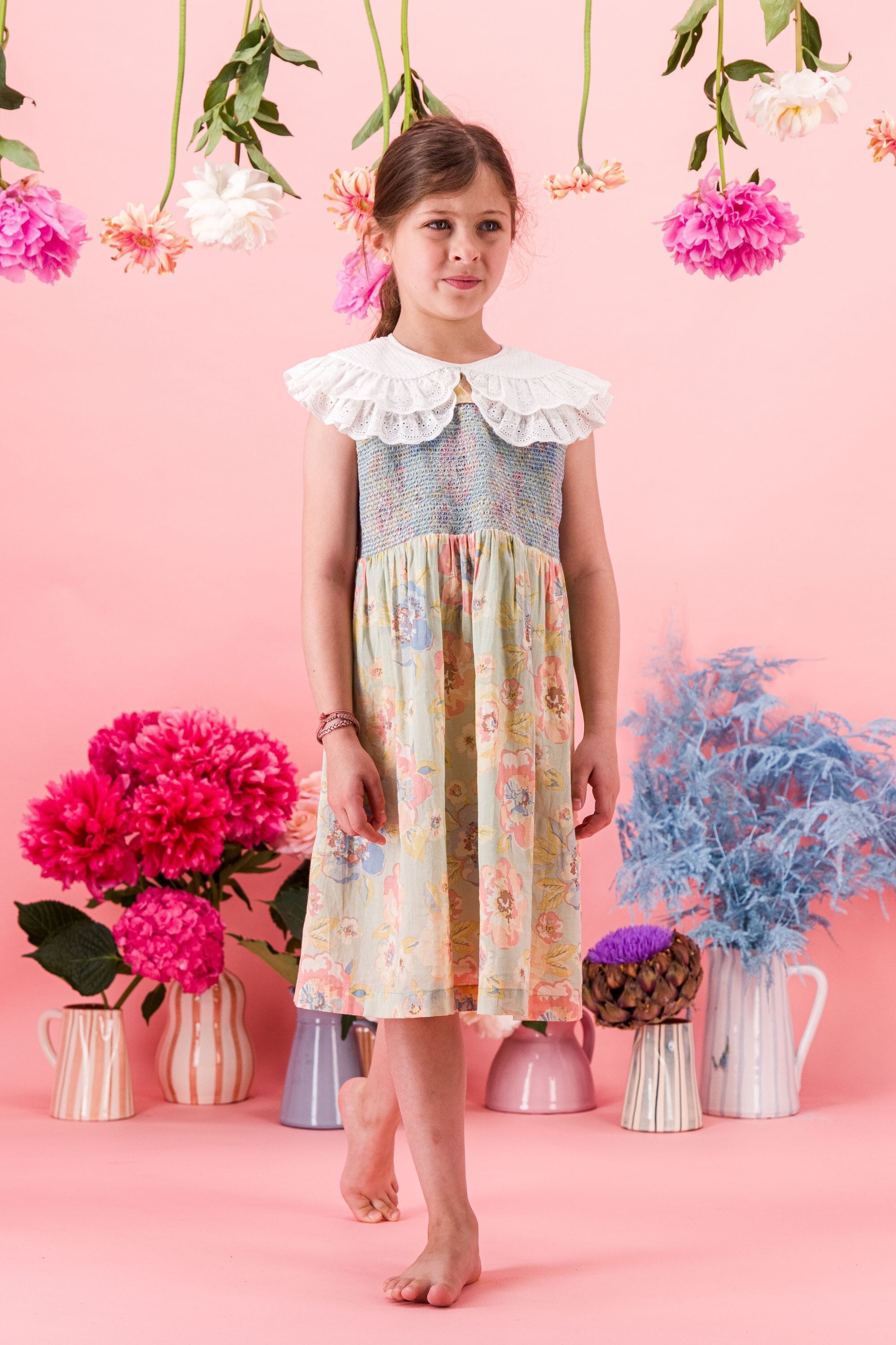 A sleeveless dress in 100% organic cotton with a double Peter Pan collar decorated with Broderie anglaise and a beautifully smocked front yoke finished with golden piping.
