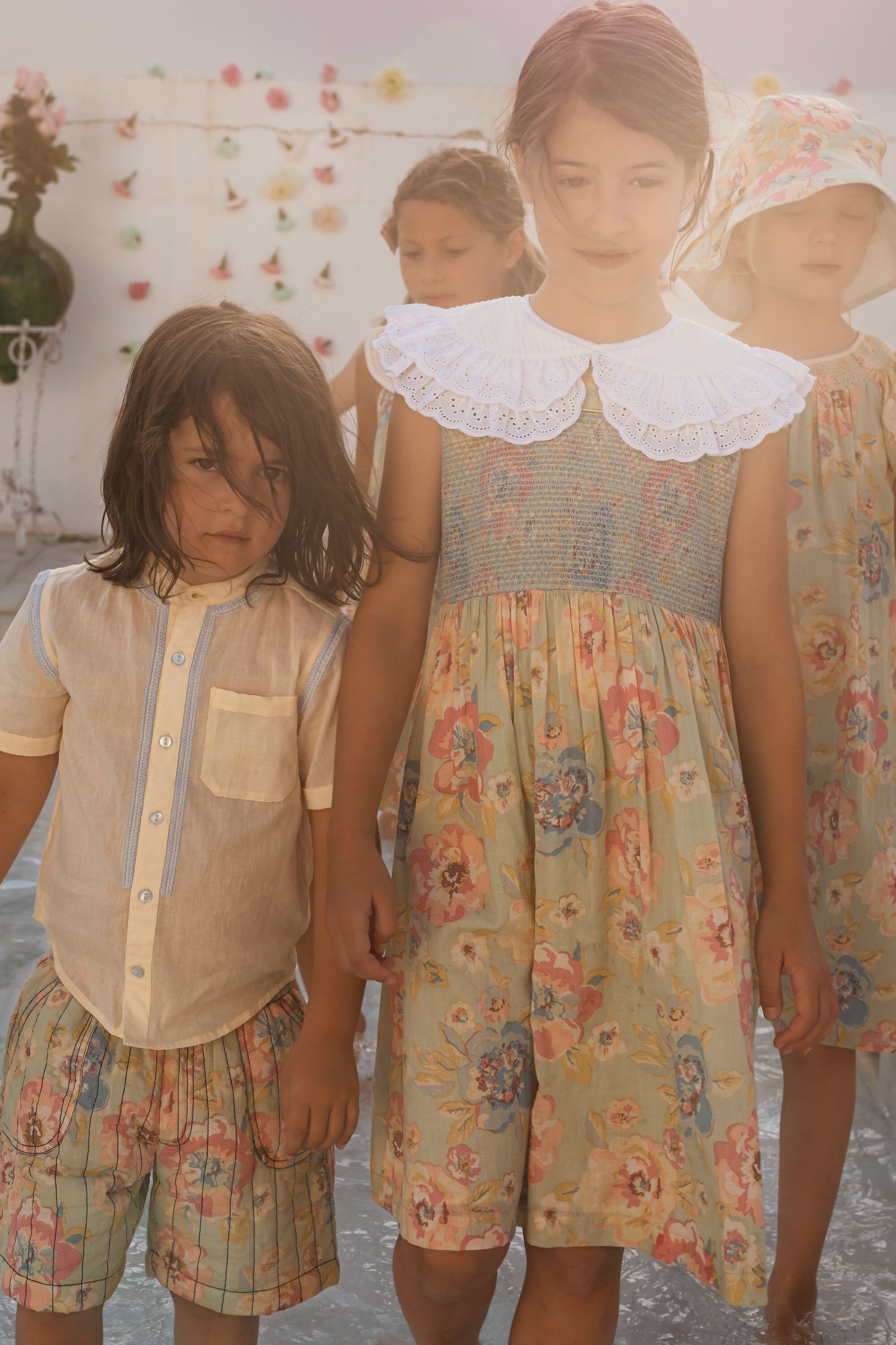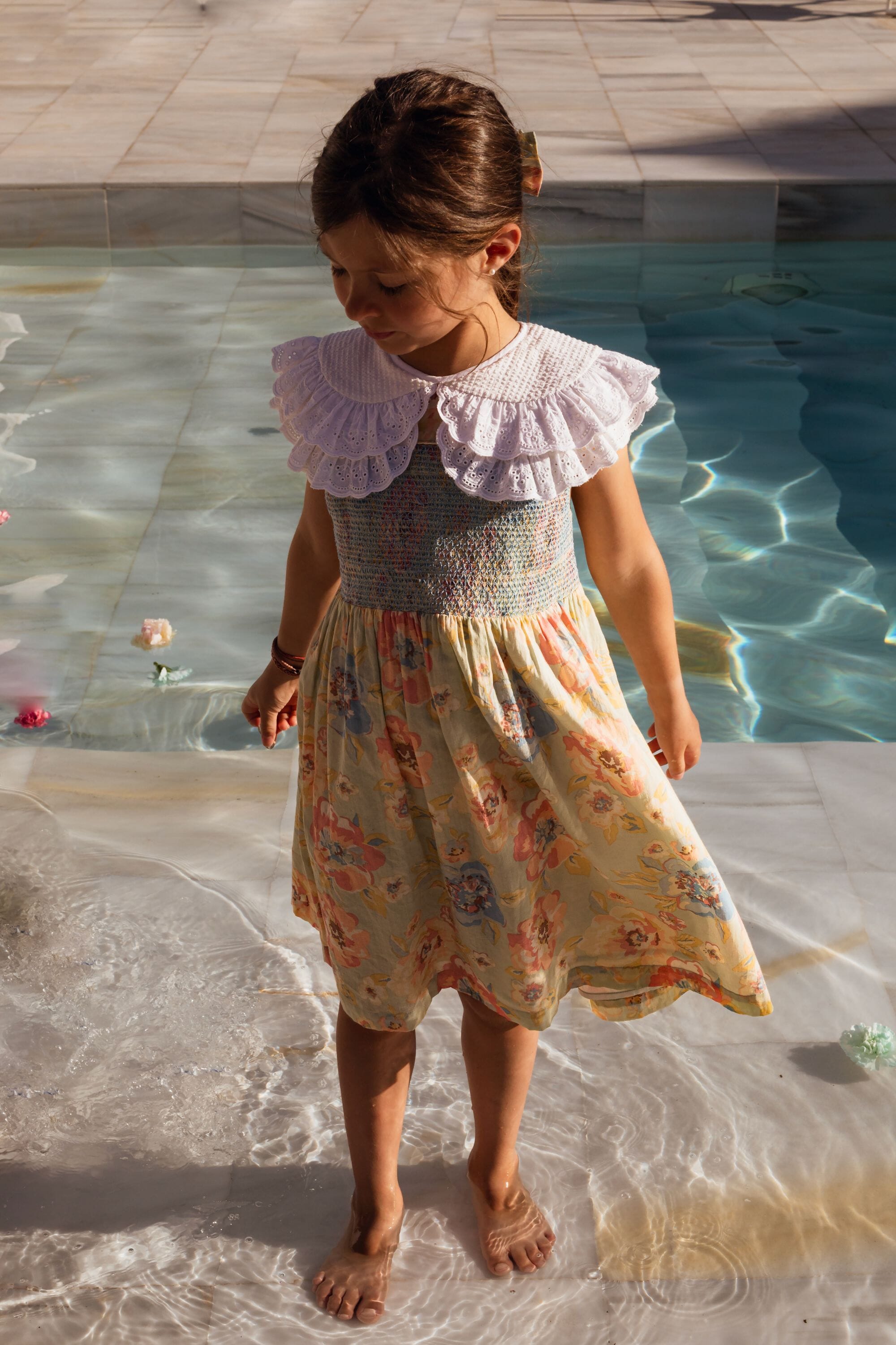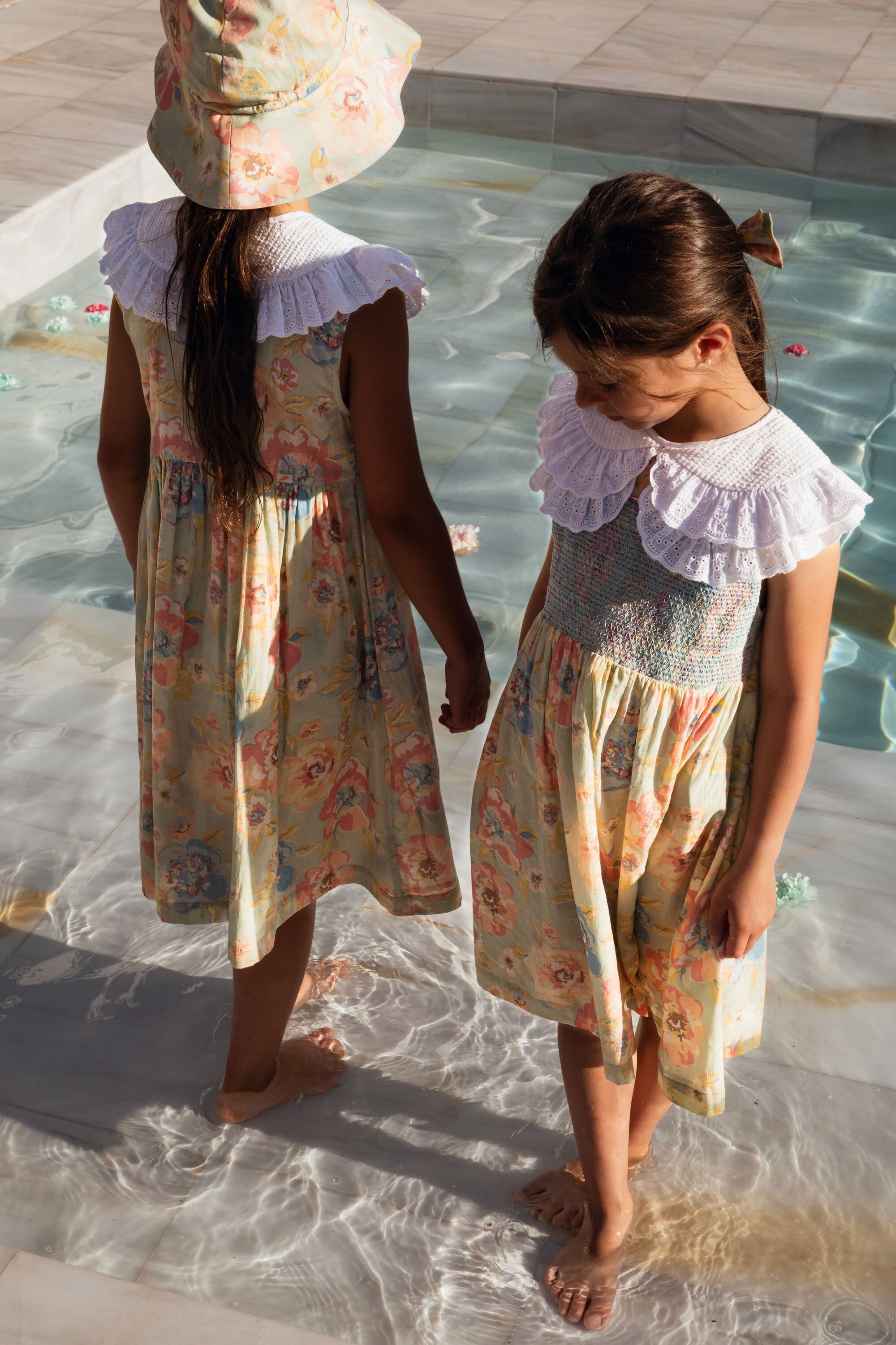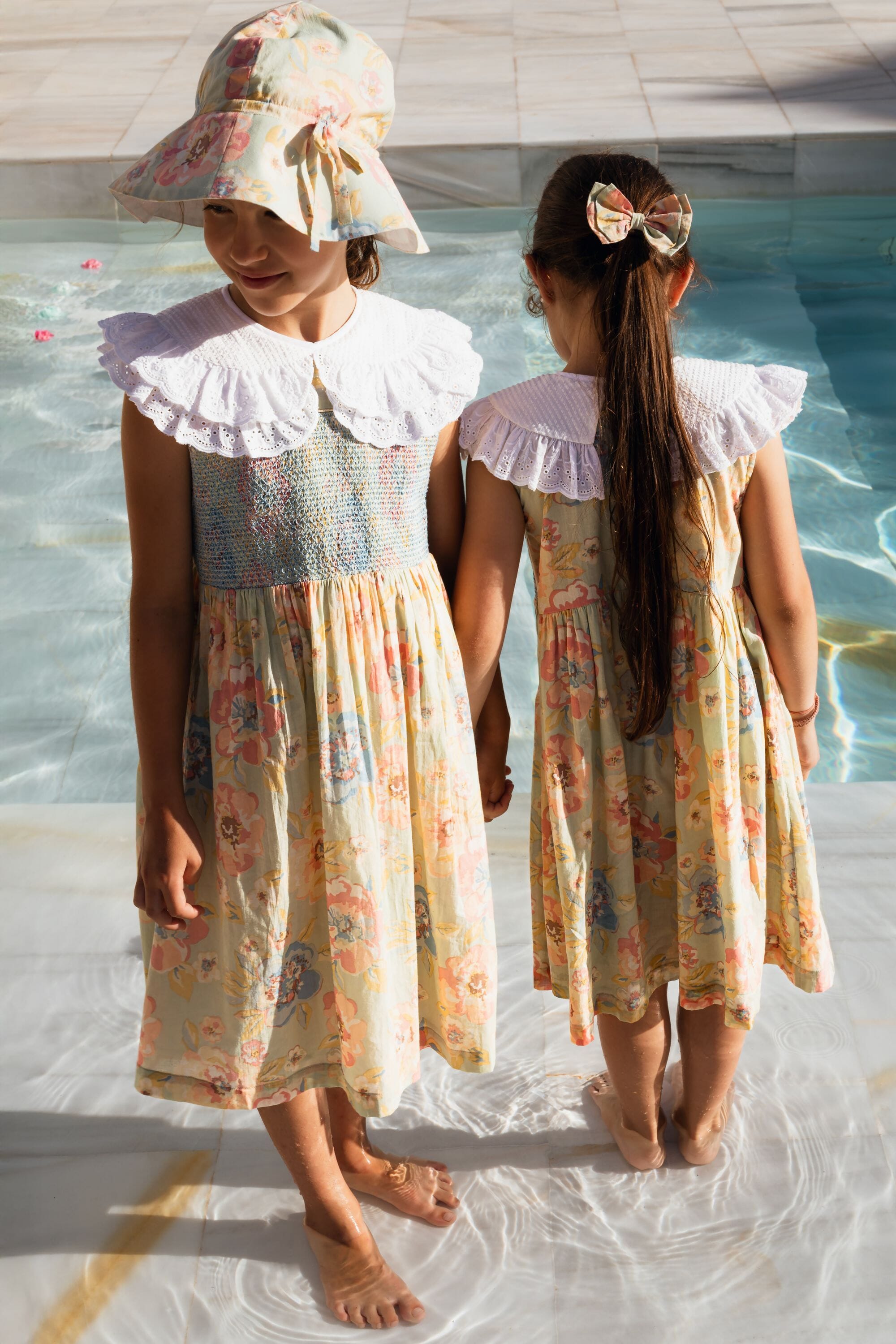 A sleeveless dress in 100% organic cotton with a double Peter Pan collar decorated with Broderie anglaise and a beautifully smocked front yoke finished with golden piping.