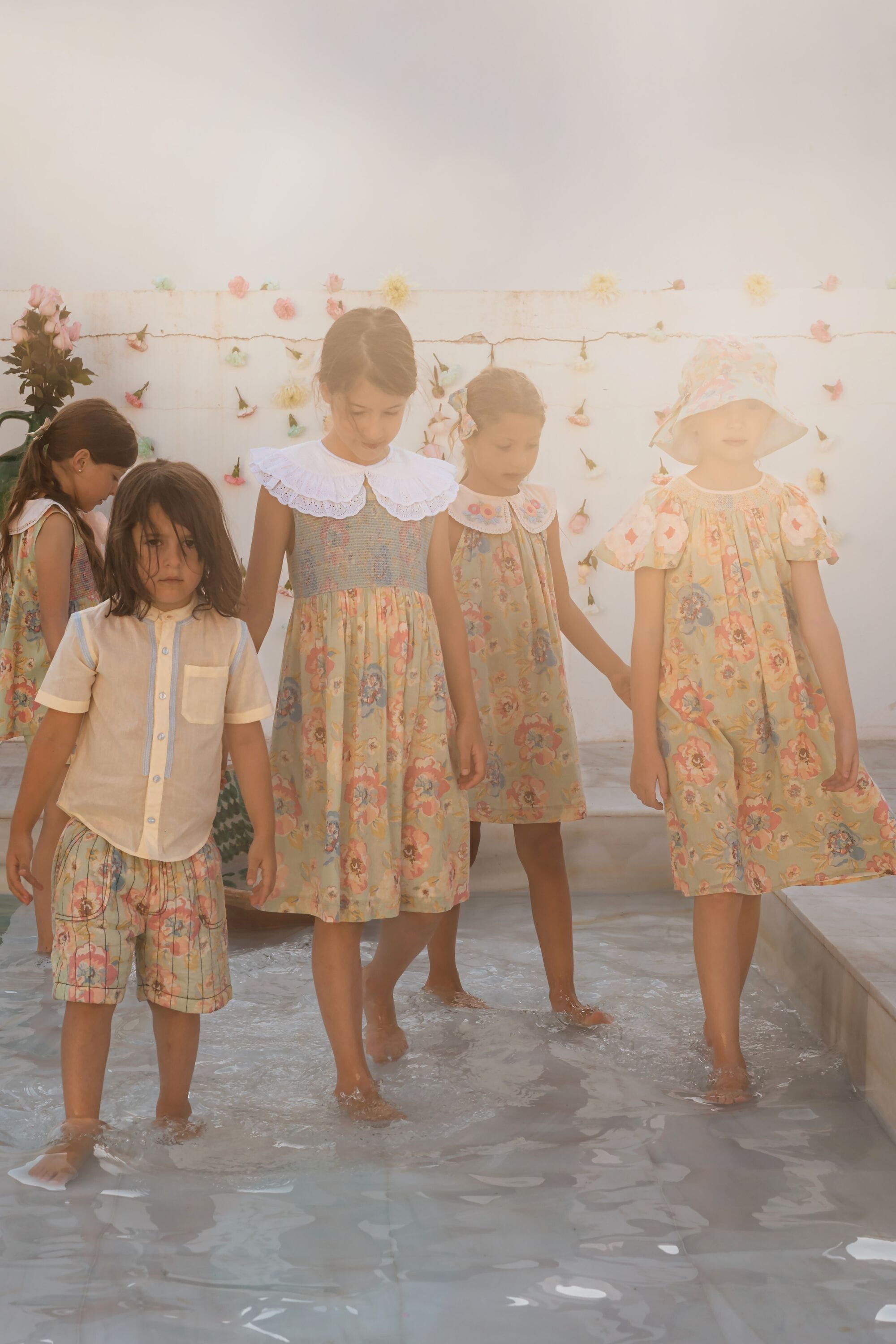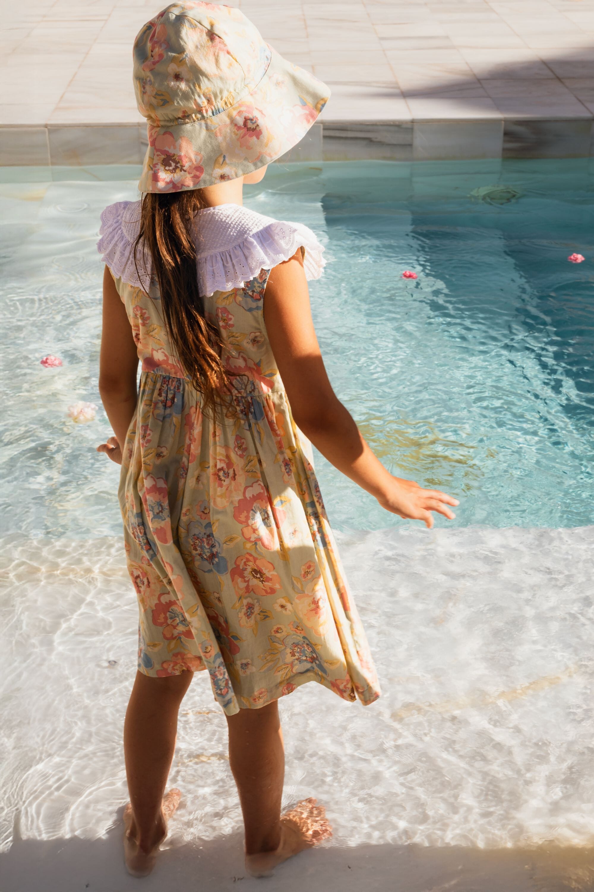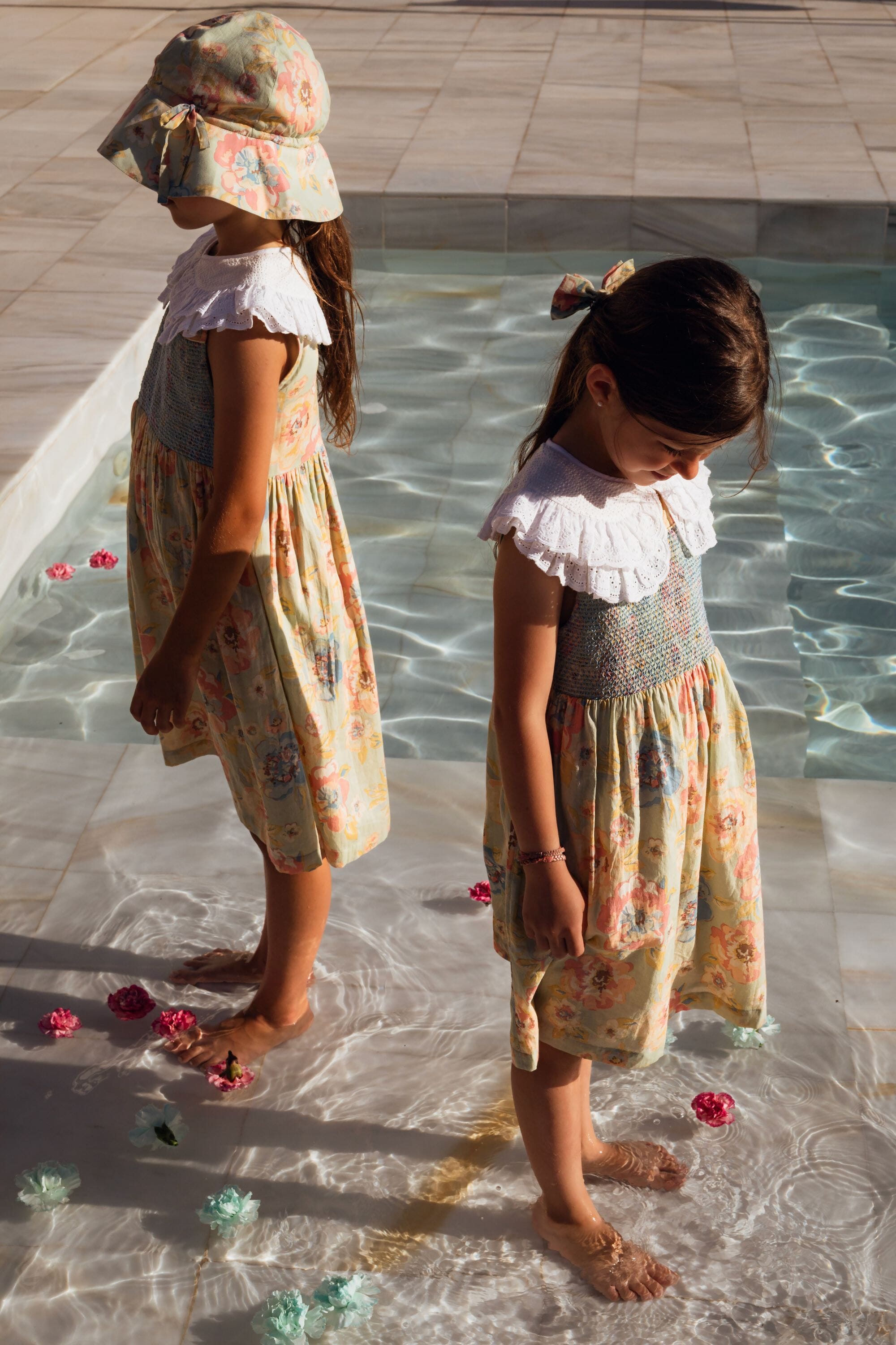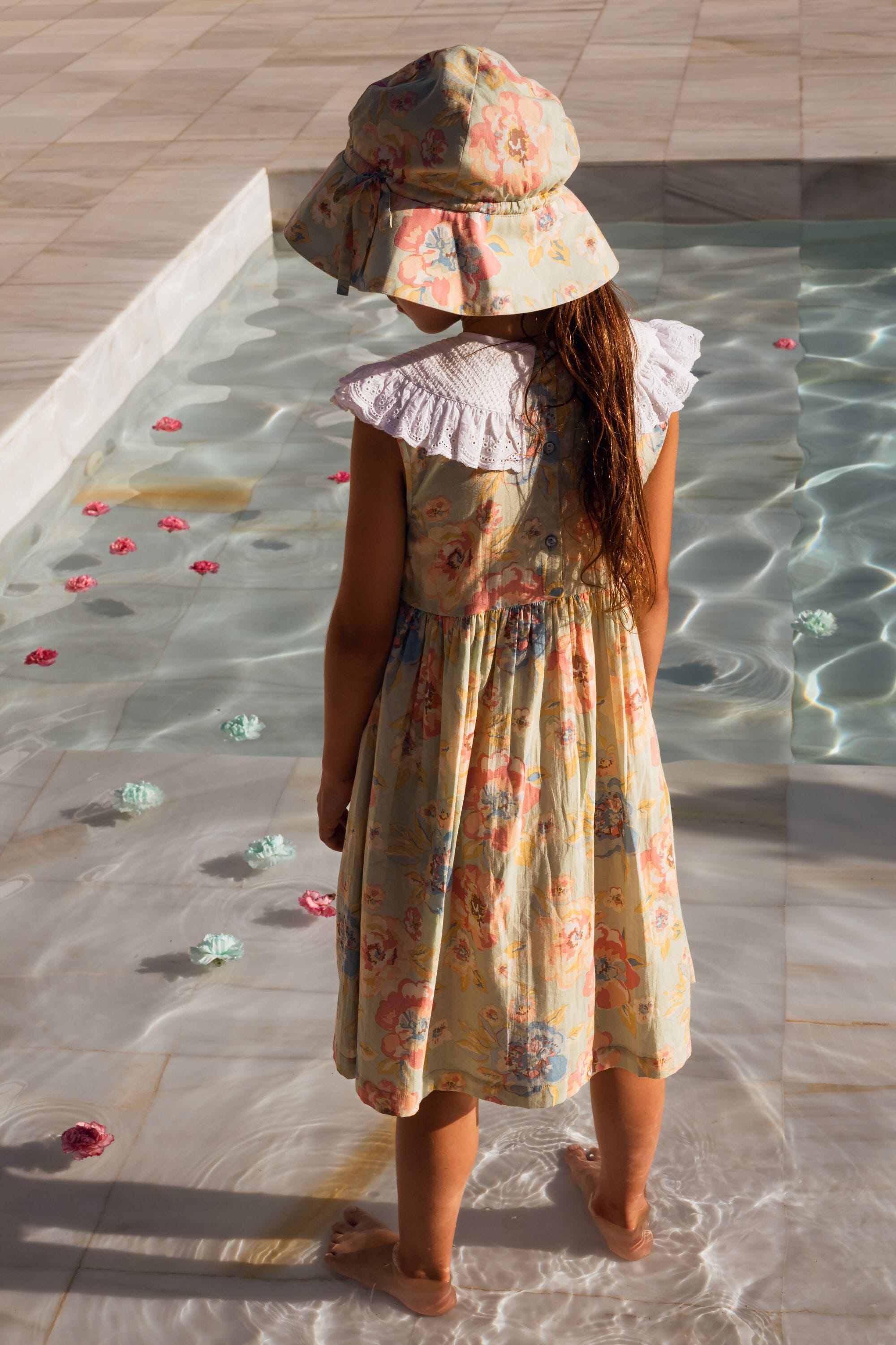 A sleeveless dress in 100% organic cotton with a double Peter Pan collar decorated with Broderie anglaise and a beautifully smocked front yoke finished with golden piping.