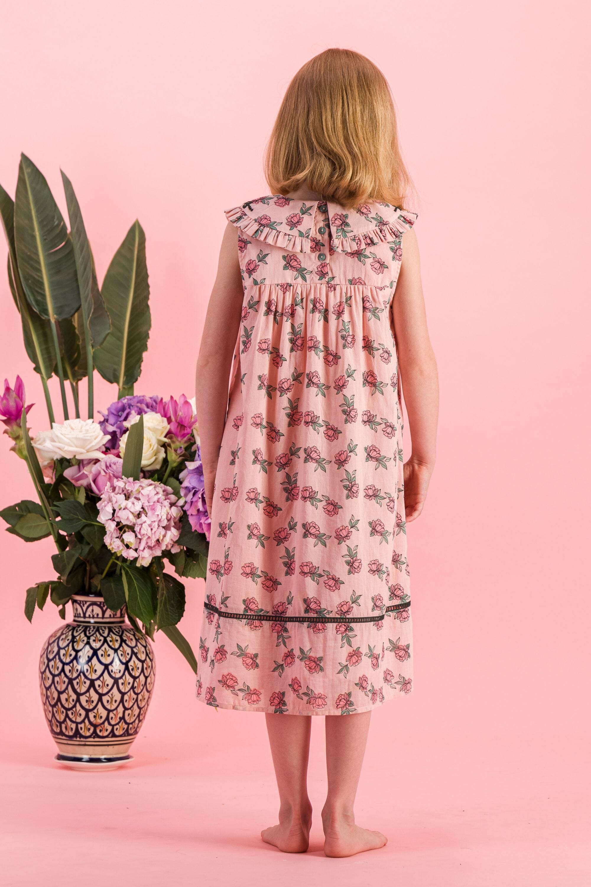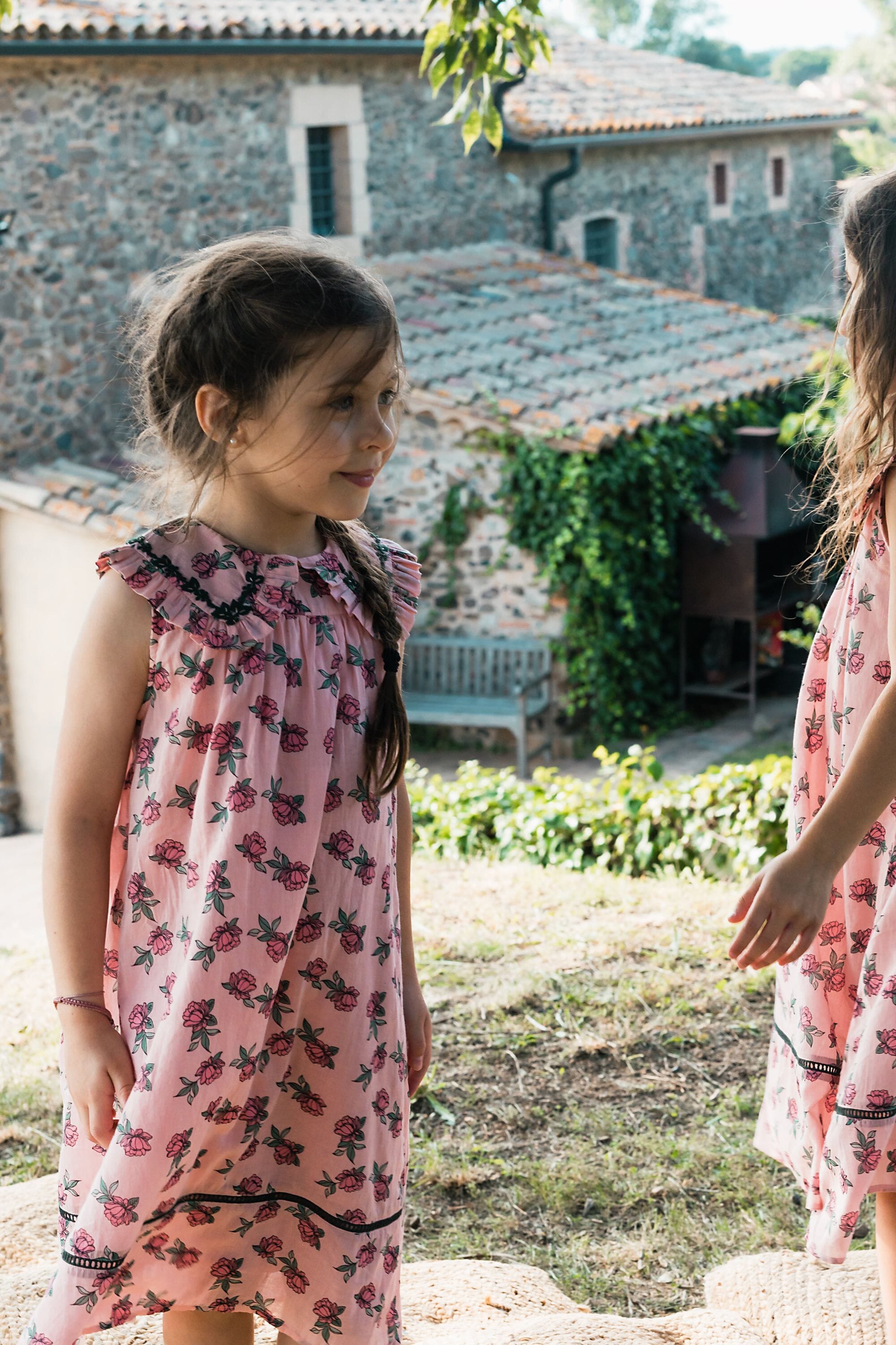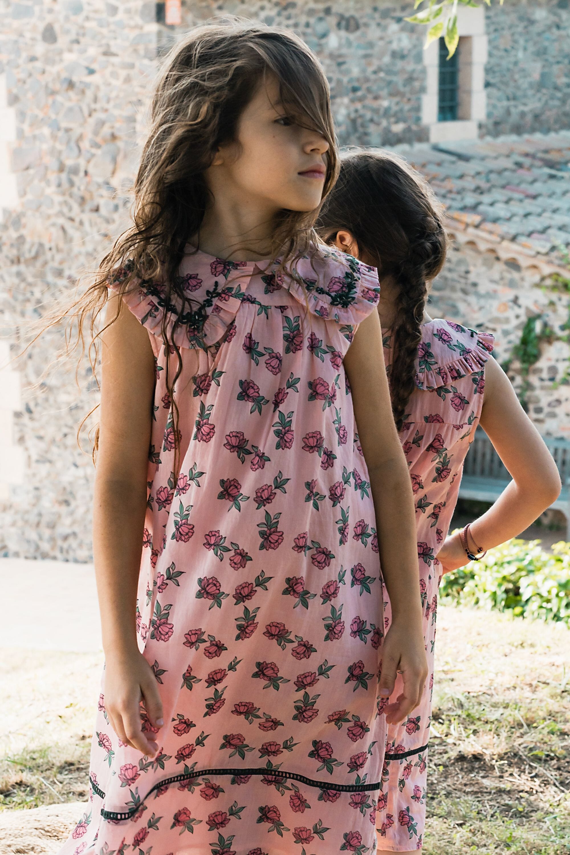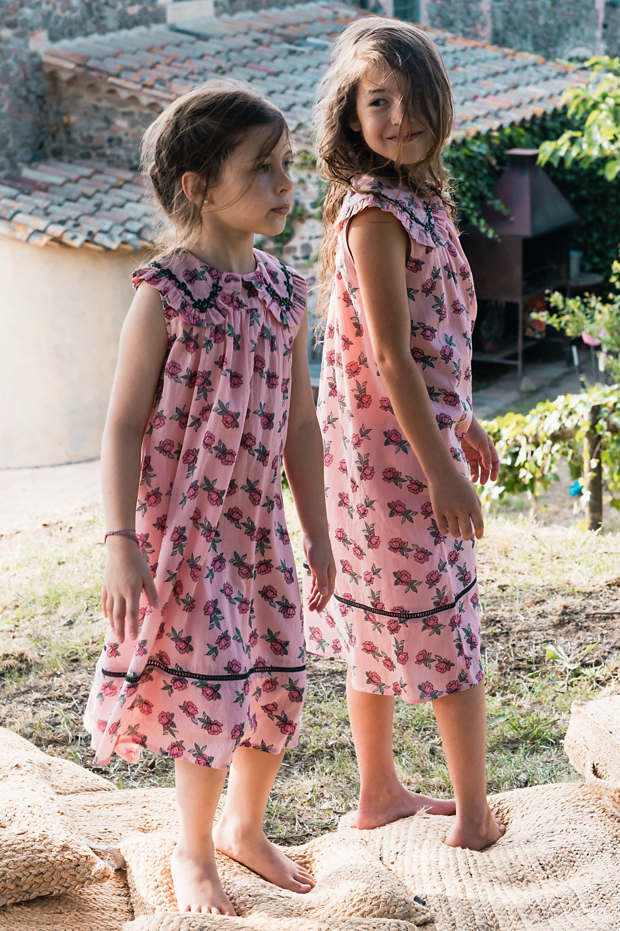 - Sleeveless nightdress, 100% organic cotton, Plain lining in organic cotton voile, Block print, Hand embroidery on the collar, Ladder lace at the bottom of the sleeves and on the front, Gathers on the front and back, Contrasted buttons.