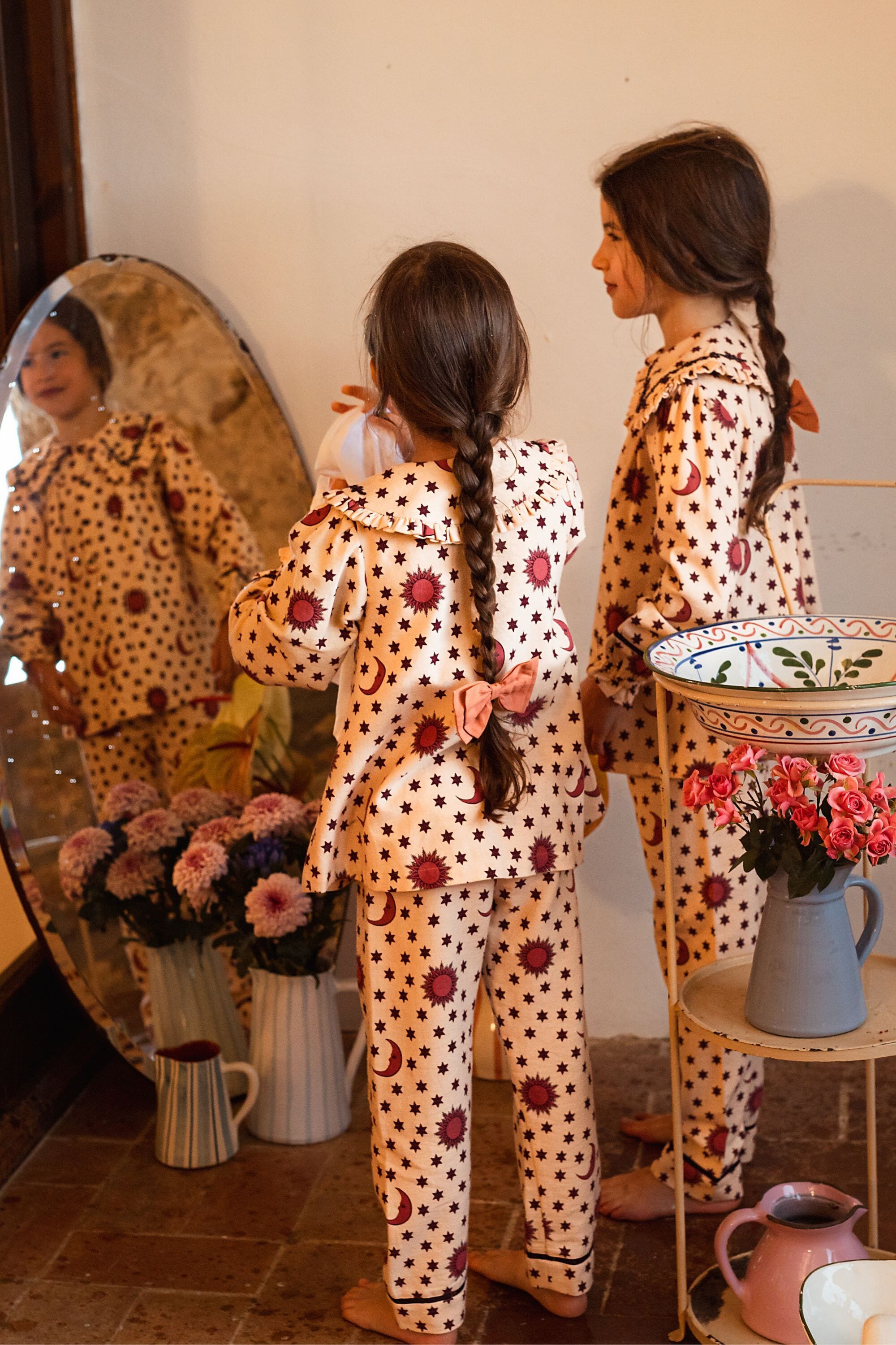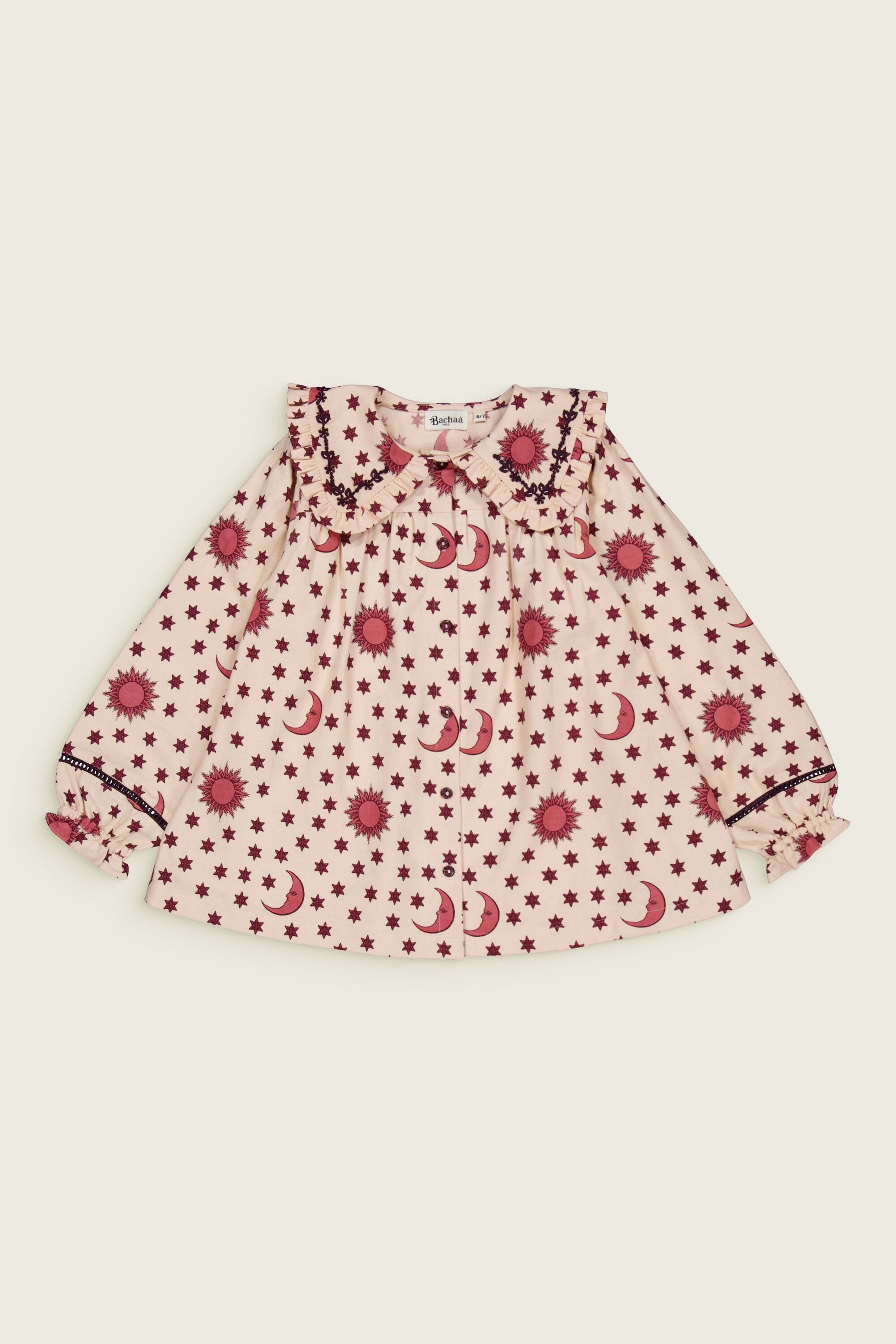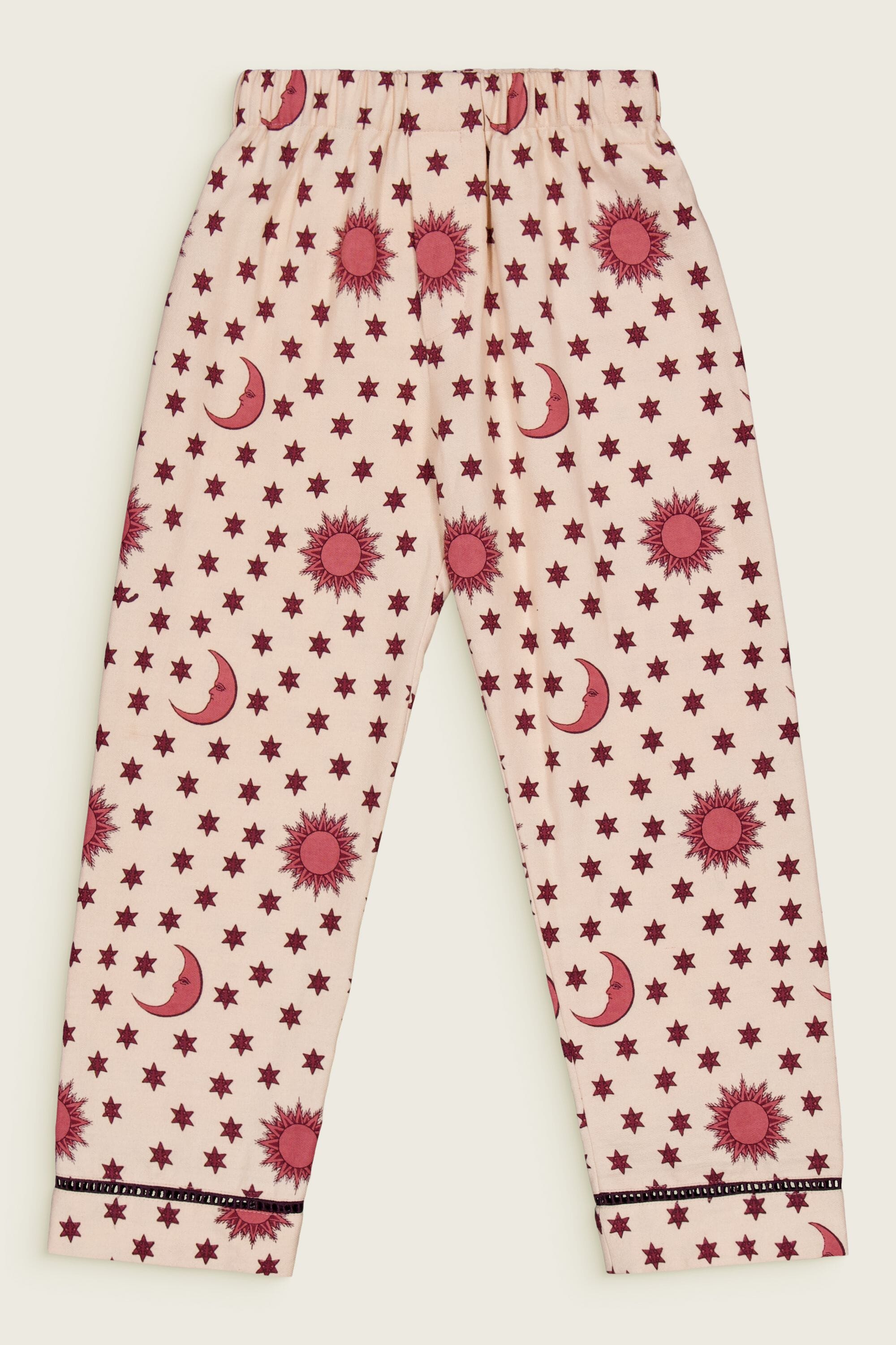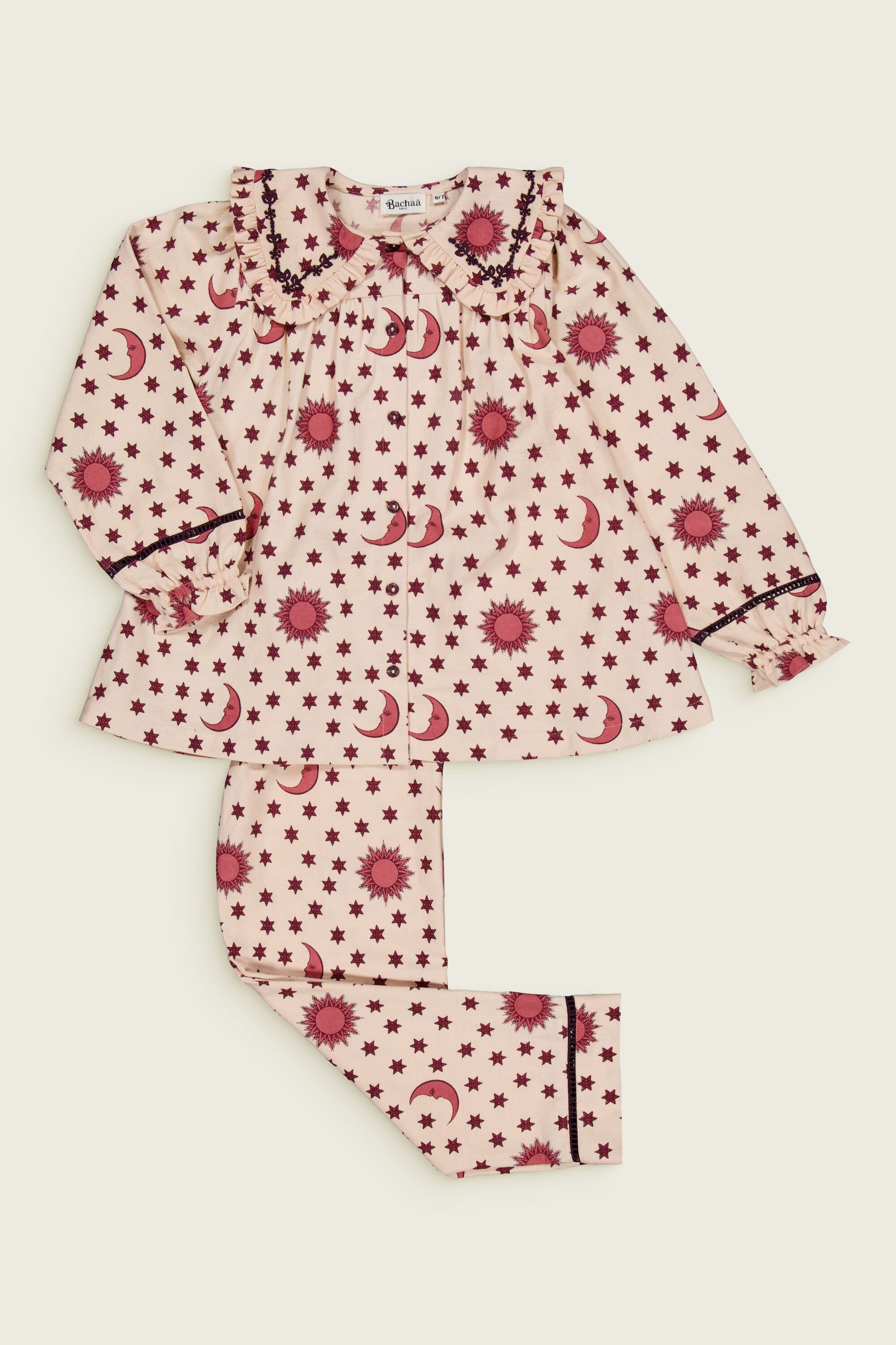 - Pajamas (Pant & blouse), Organic cotton twill (174 g/m²), Block print, Hand embroidery on the collar, Ladder lace at the bottom of the sleeves and legs, Gathered front, Contrasting buttons.