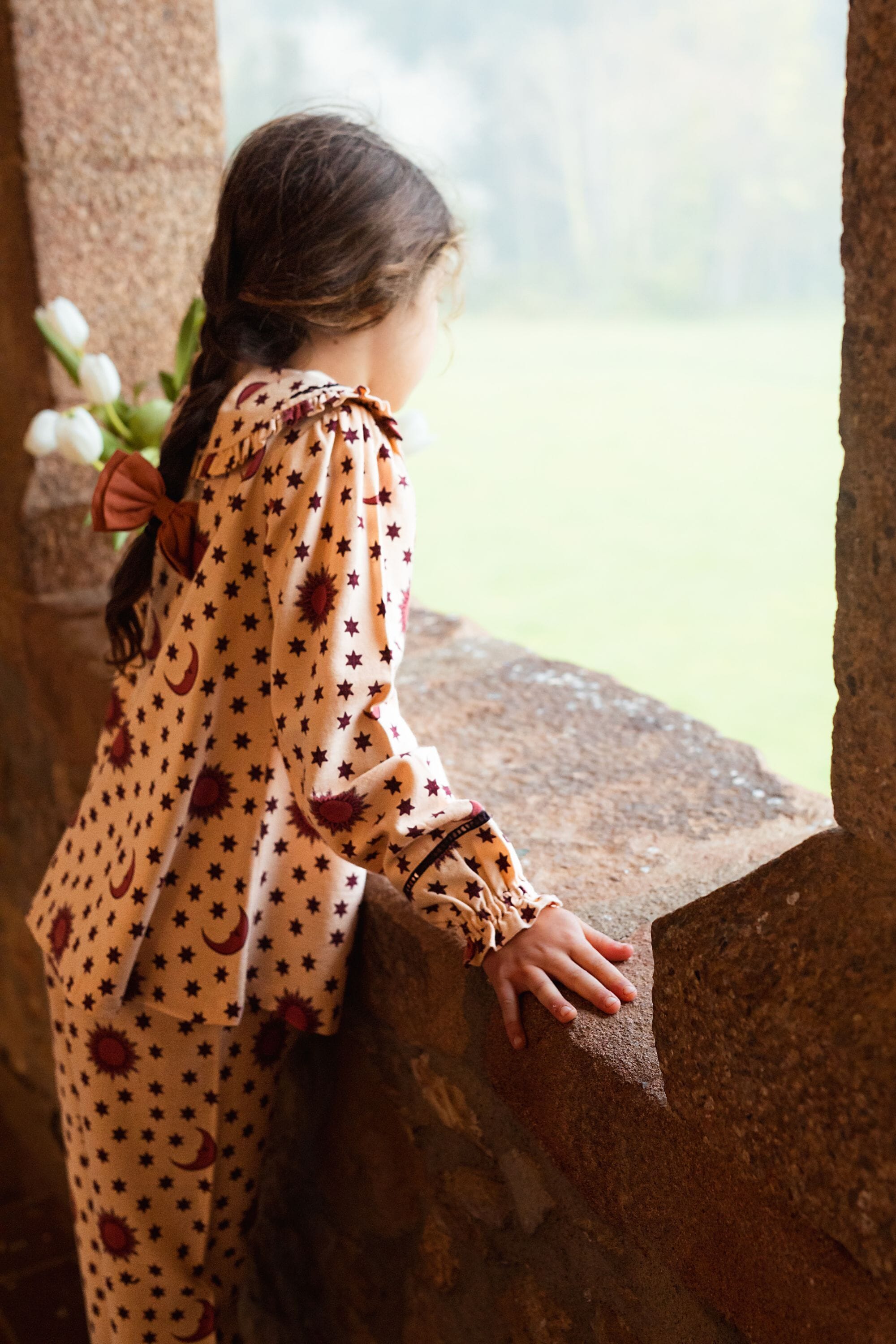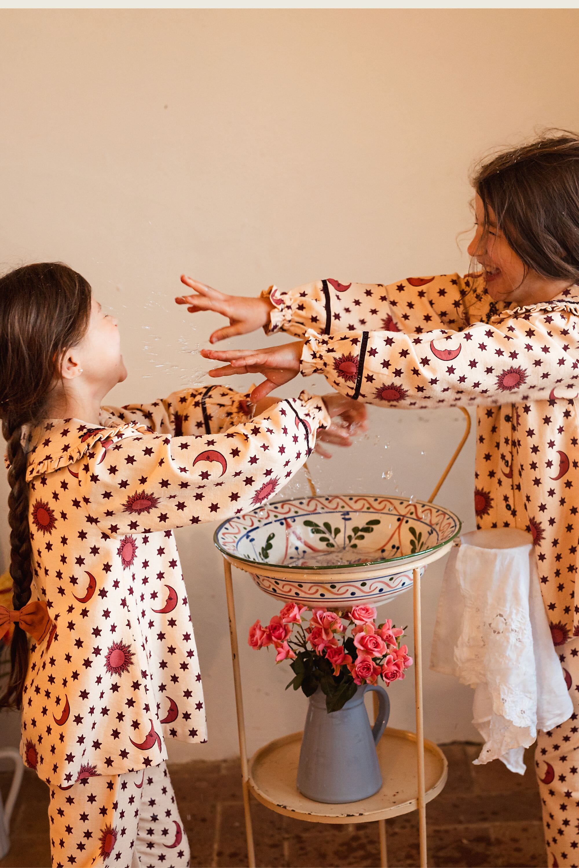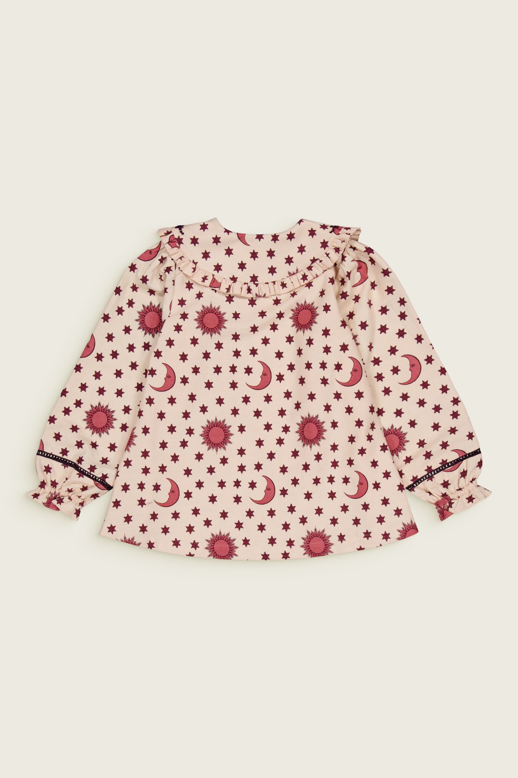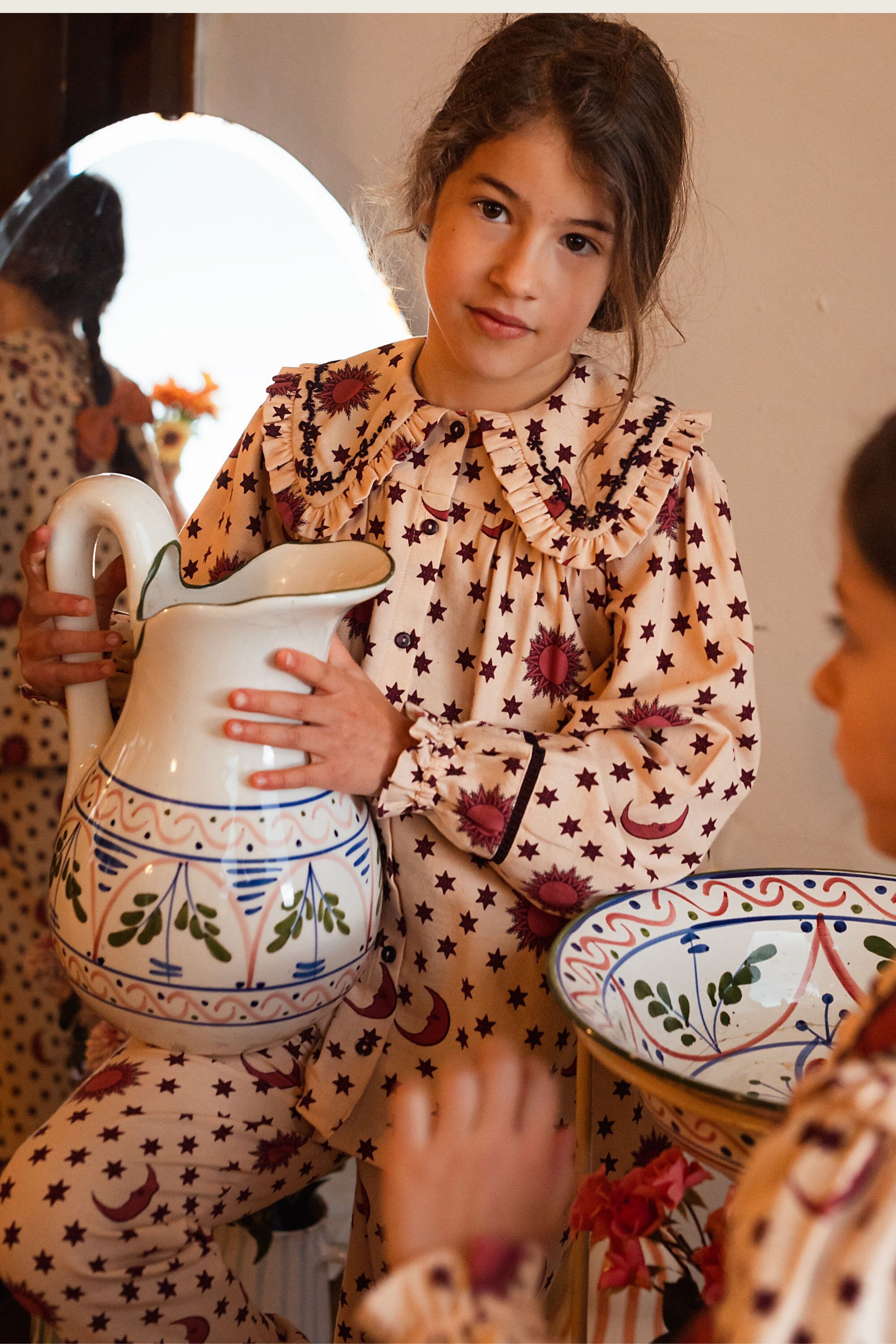 - Pajamas (Pant & blouse), Organic cotton twill (174 g/m²), Block print, Hand embroidery on the collar, Ladder lace at the bottom of the sleeves and legs, Gathered front, Contrasting buttons.