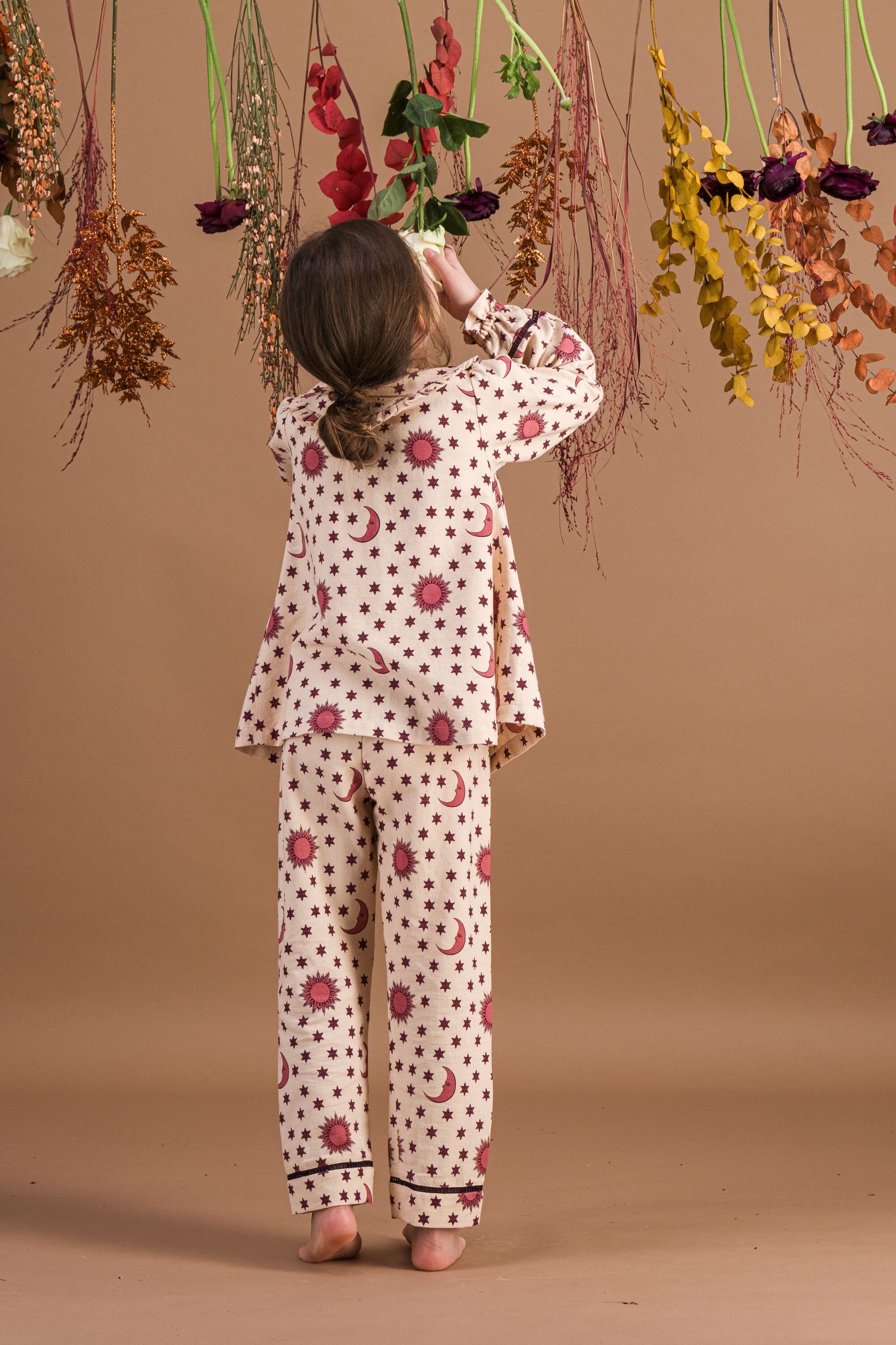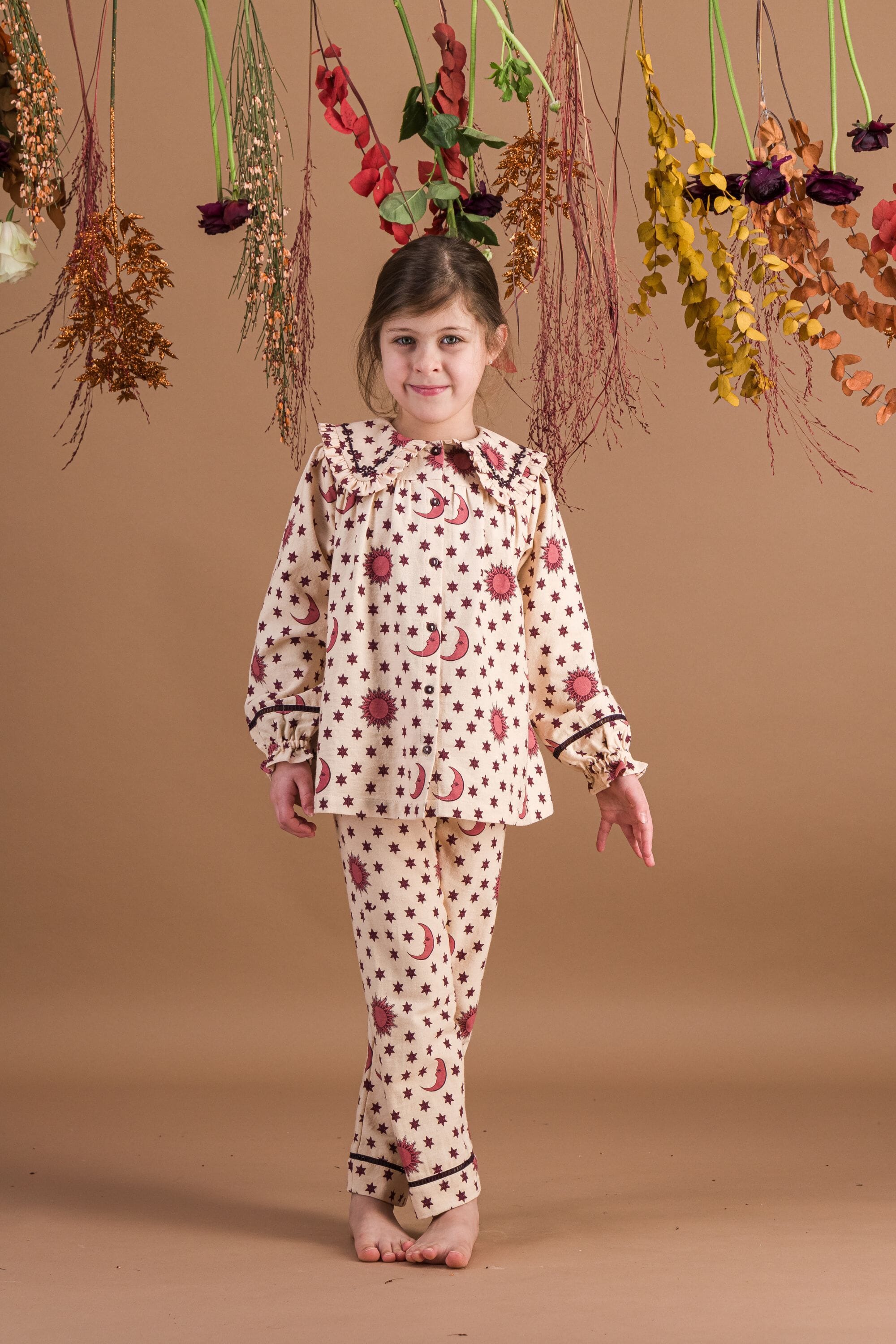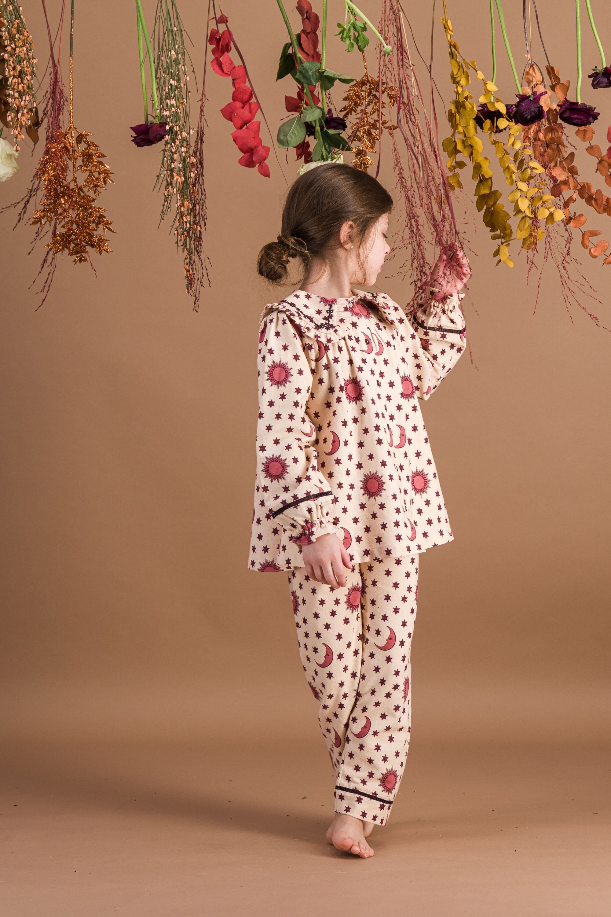 A Pajamas made from heavyweight organic cotton twill (174 g/m²) combining a pant and a blouse with hand embroidery on the collar.