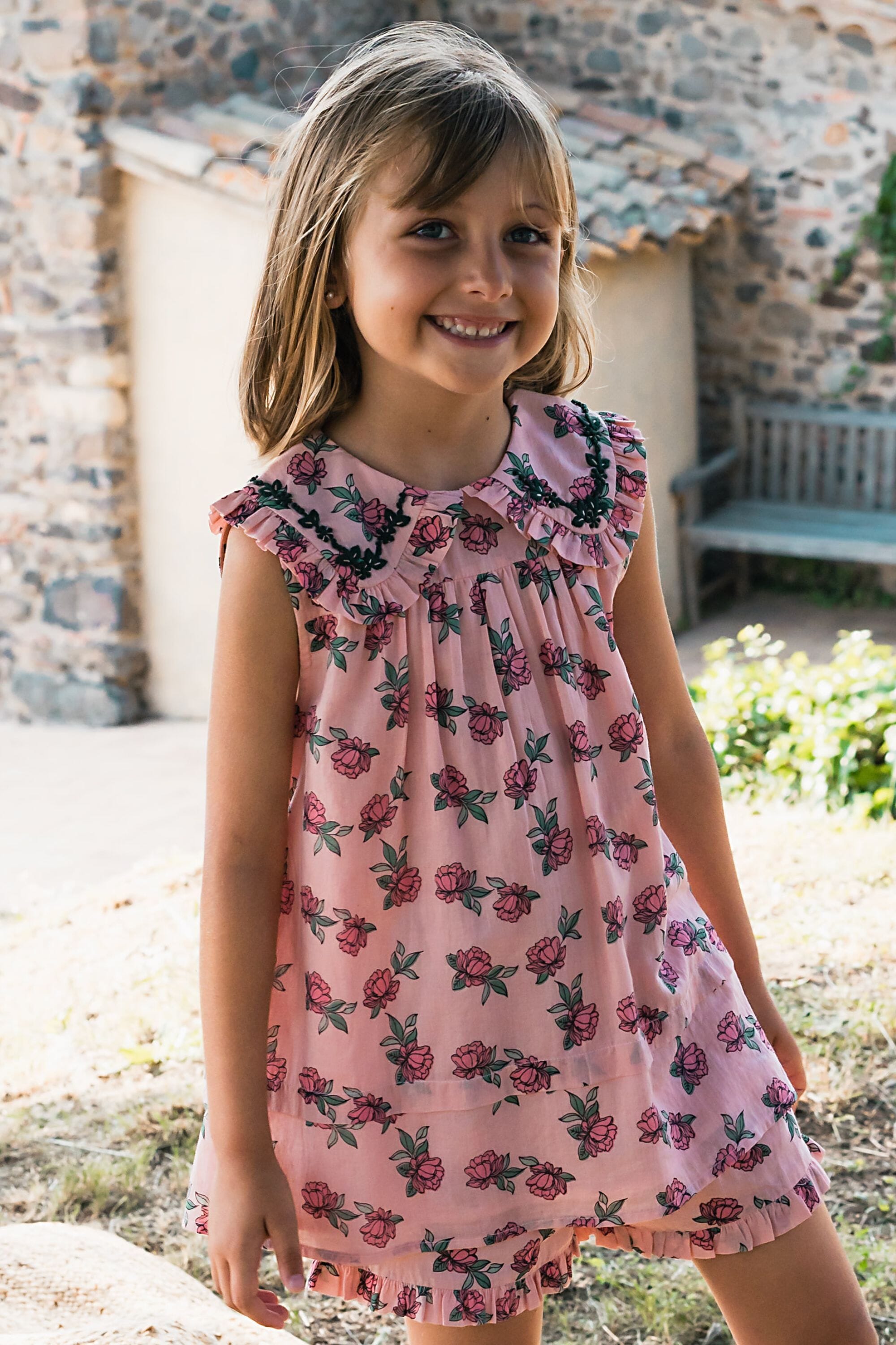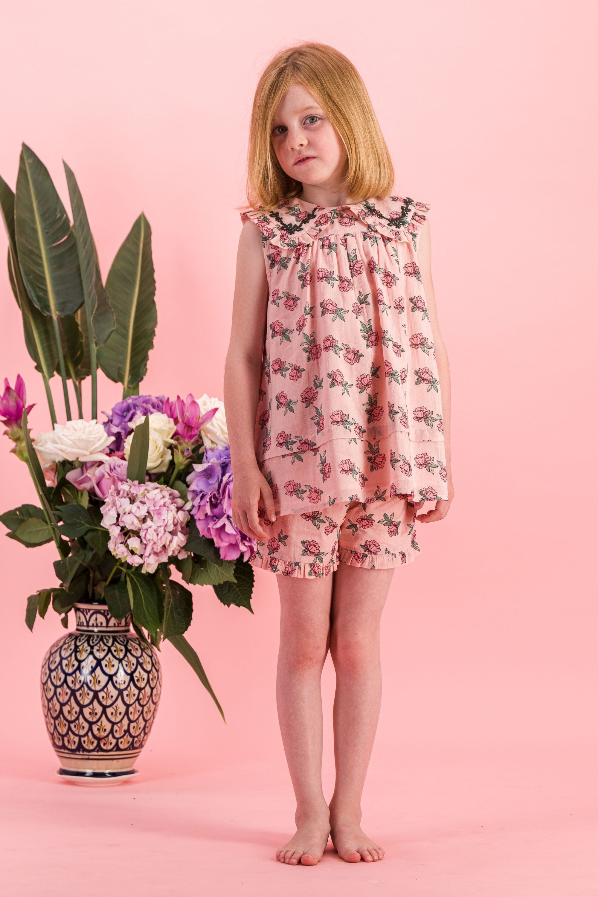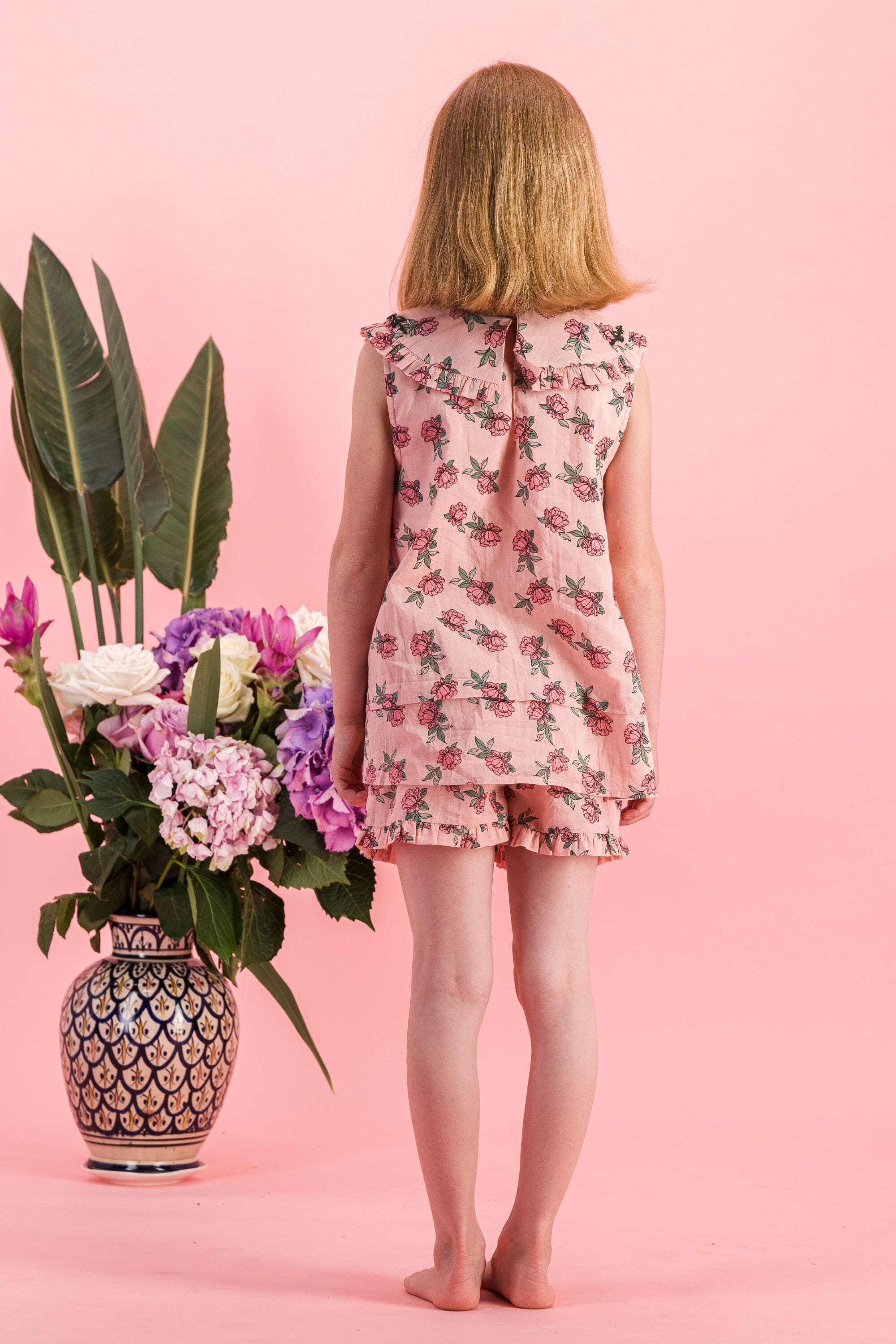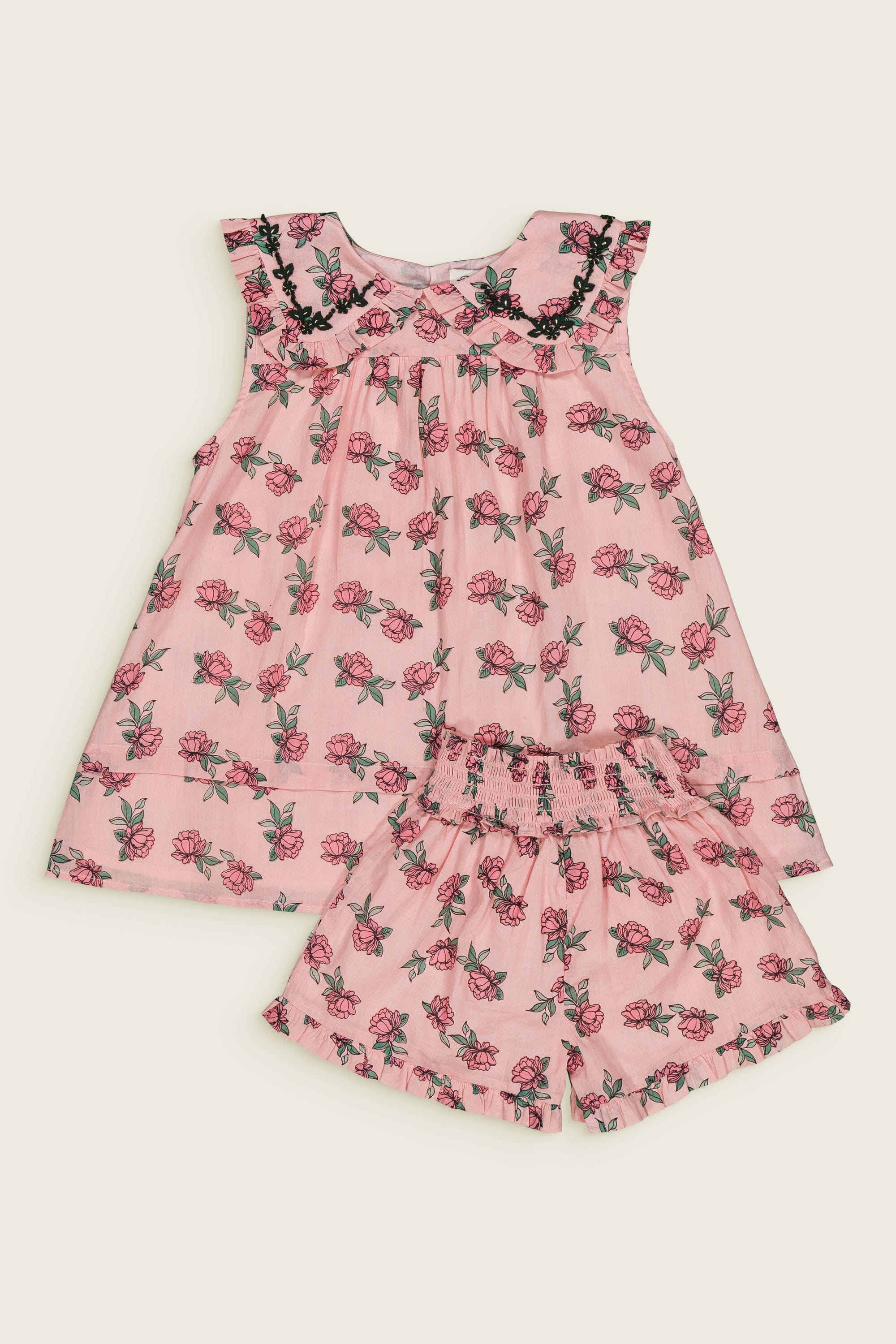- Pajamas (Shorts & top), 100% organic cotton, Plain lining in organic cotton voile, Block print, Hand embroidery on the collar, Blind tuck at the bottom, Ruffles on the leg opening and on the collar, One buttoned drop on the back.