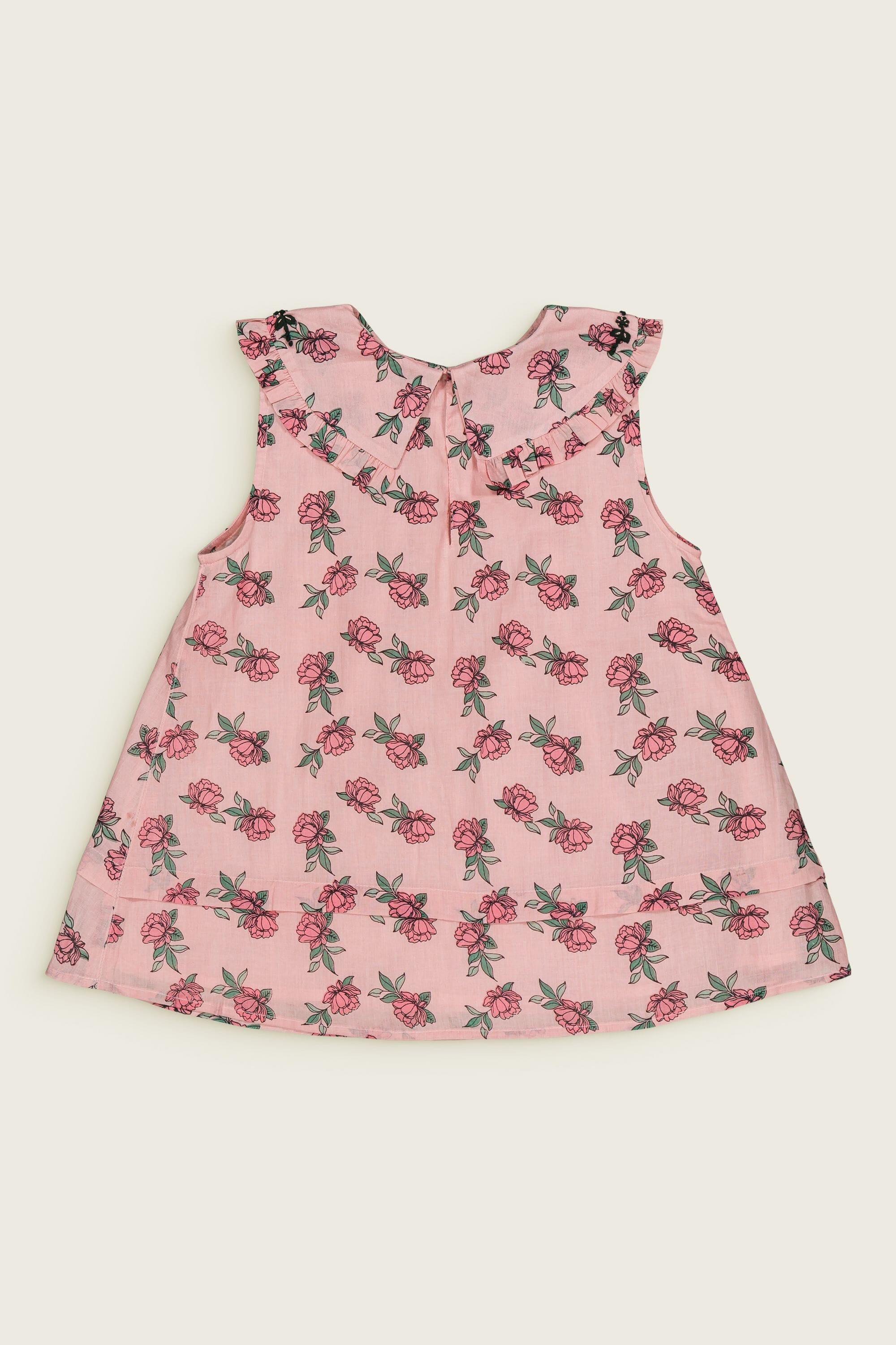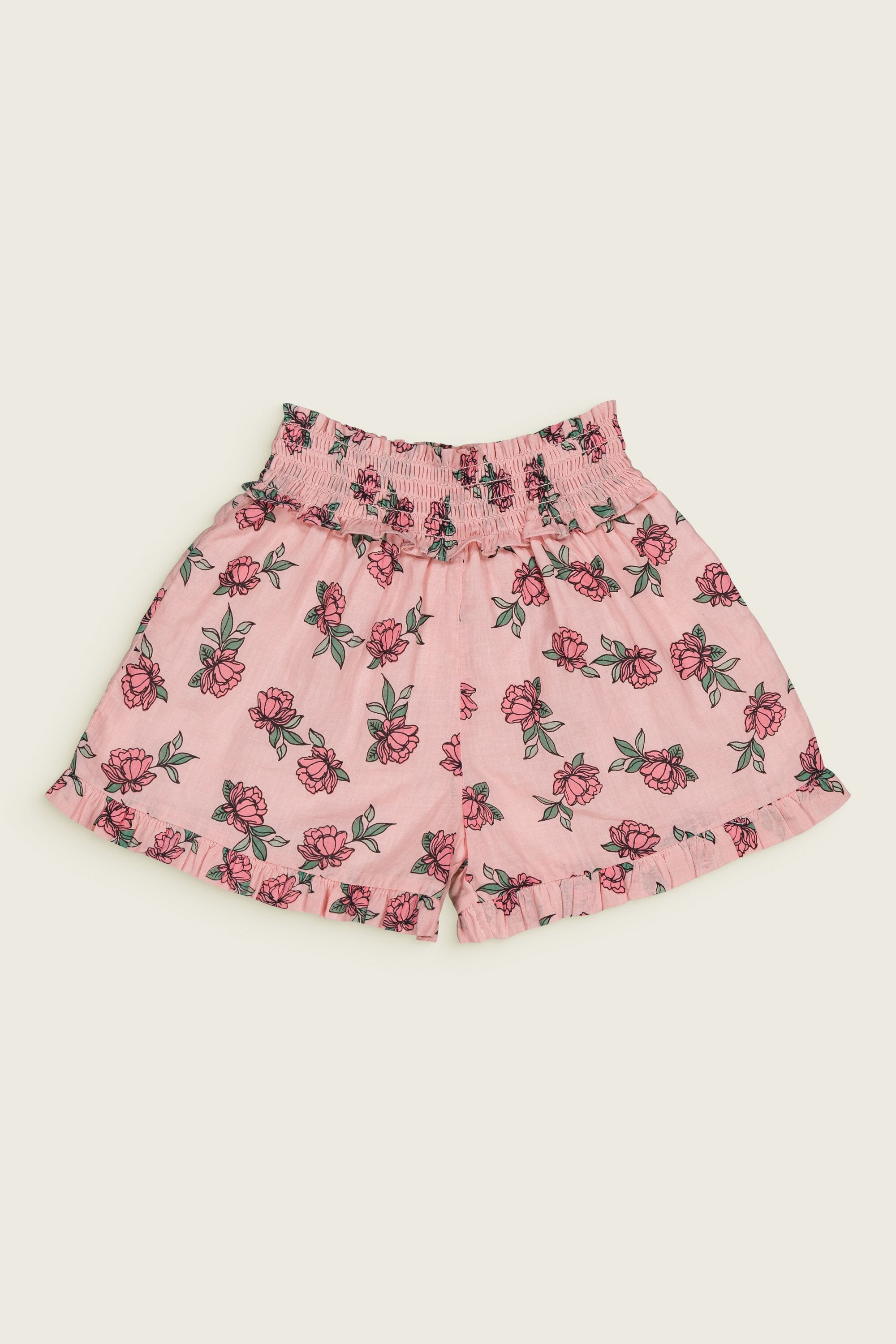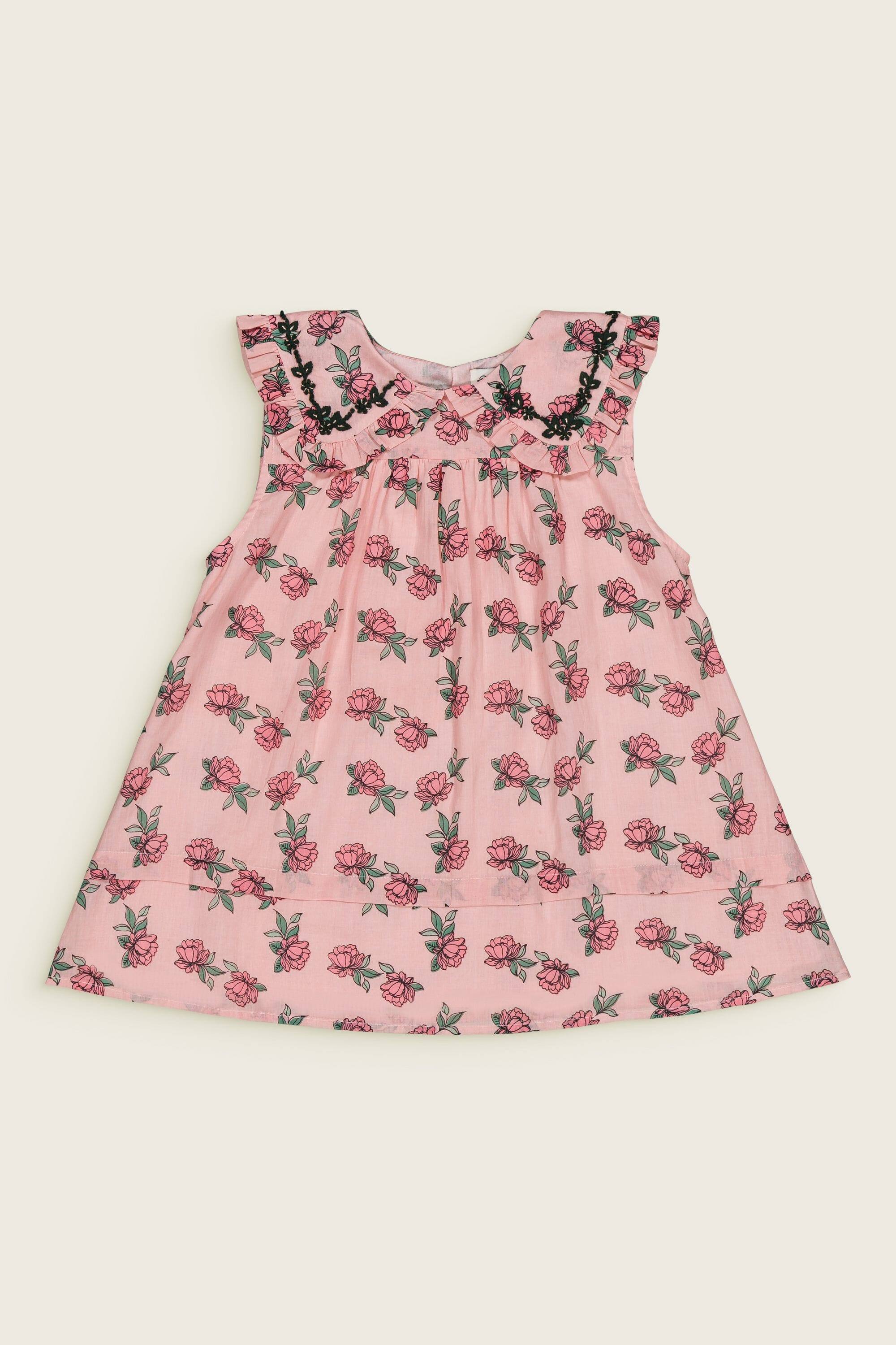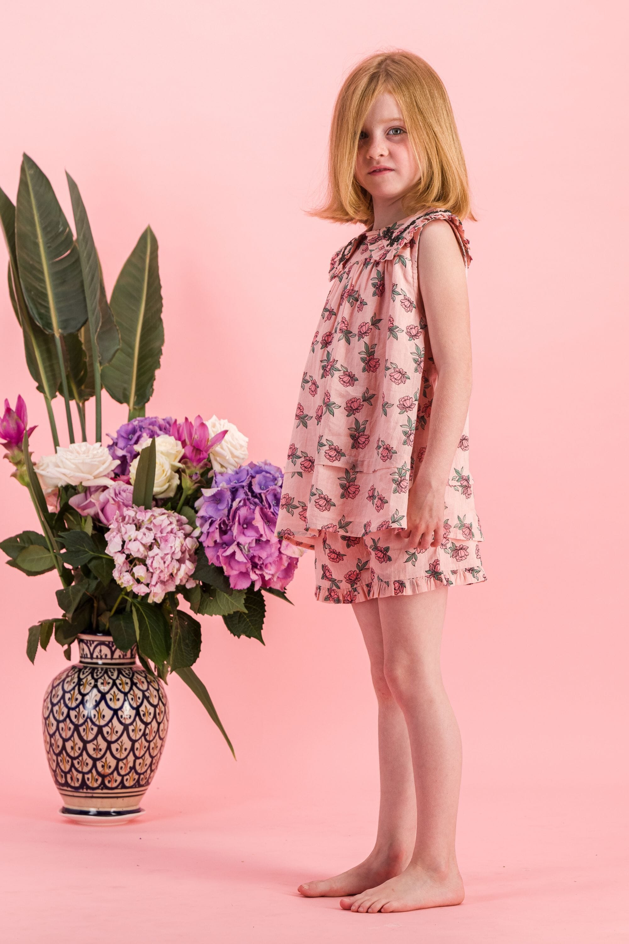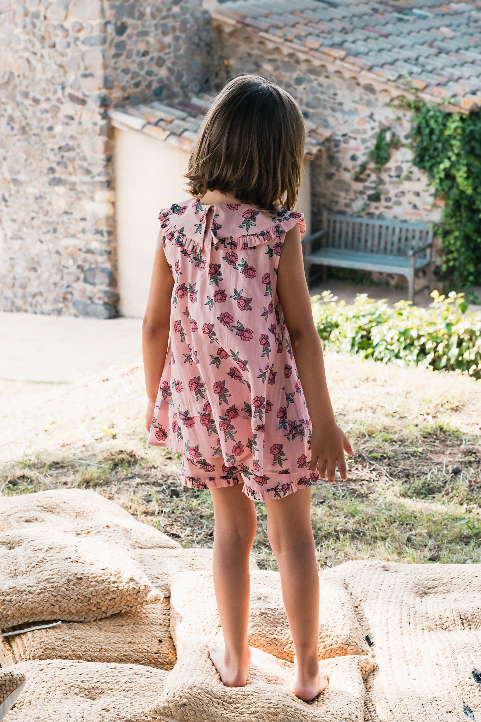- Pajamas (Shorts & top), 100% organic cotton, Plain lining in organic cotton voile, Block print, Hand embroidery on the collar, Blind tuck at the bottom, Ruffles on the leg opening and on the collar, One buttoned drop on the back.