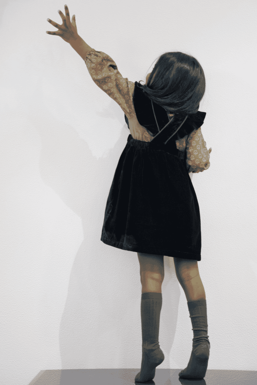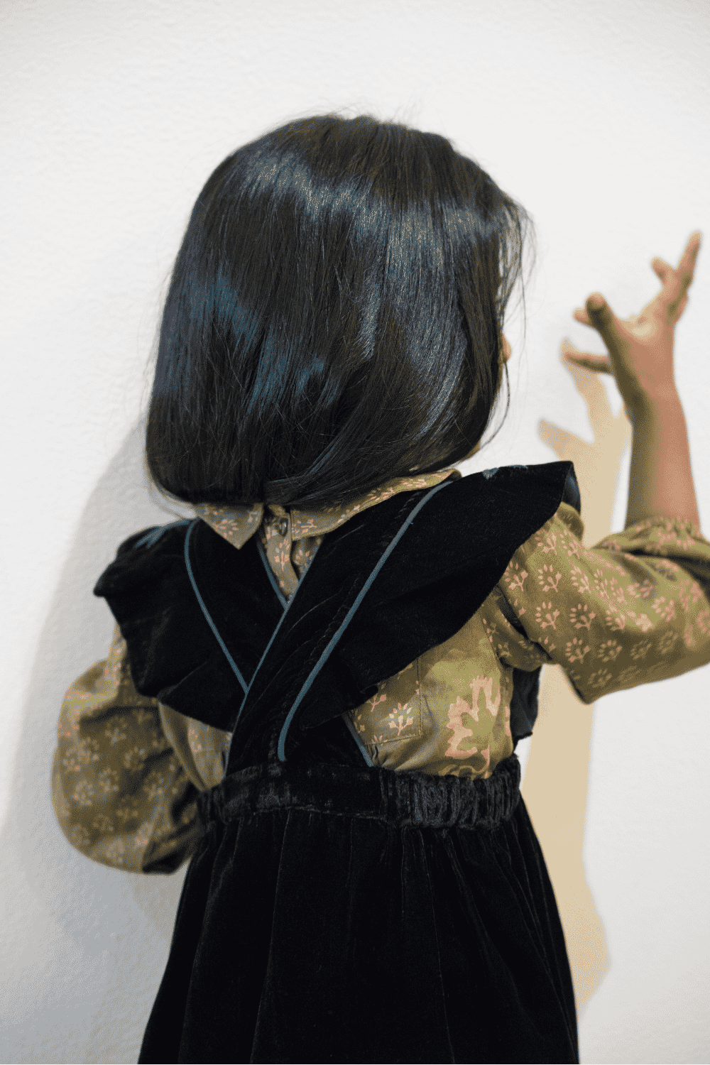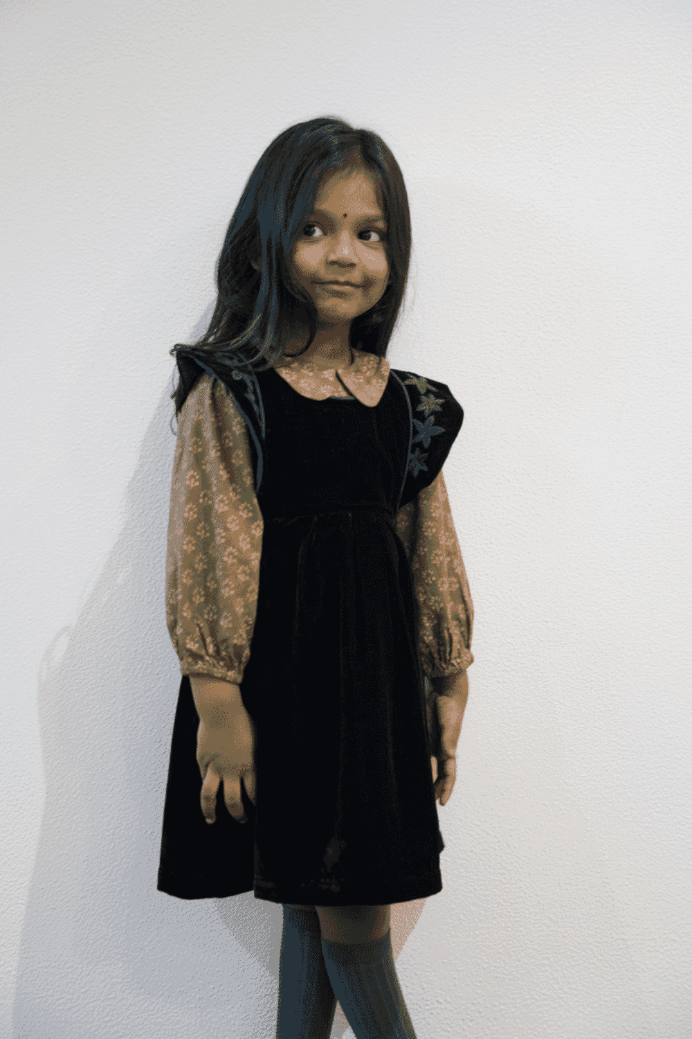 - Midi dress, Velvet, Embroidered ruffled sleeves, Crossed straps at the back, Gathers on the front, Emerald green lining on front and back yoke in organic cotton voile.