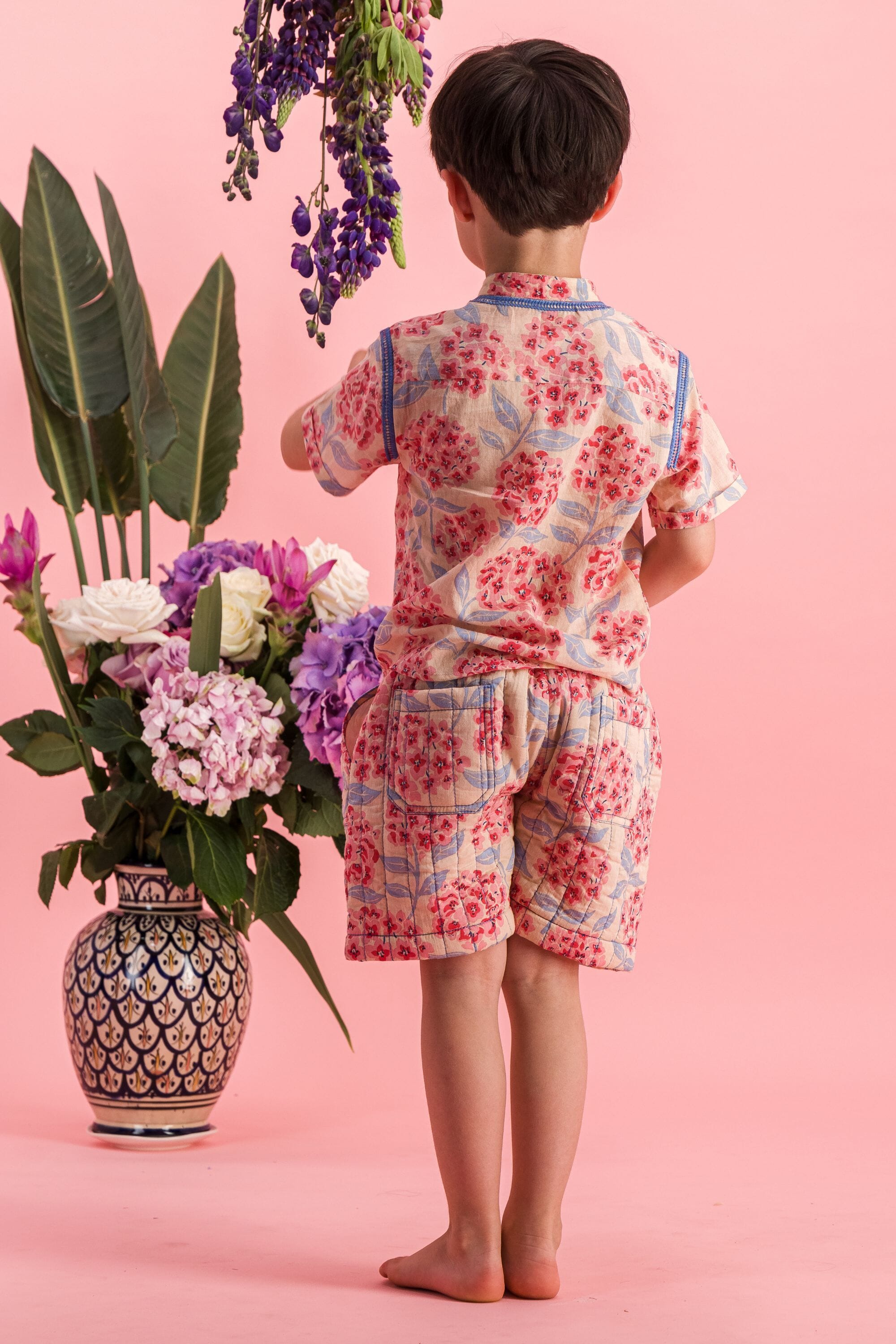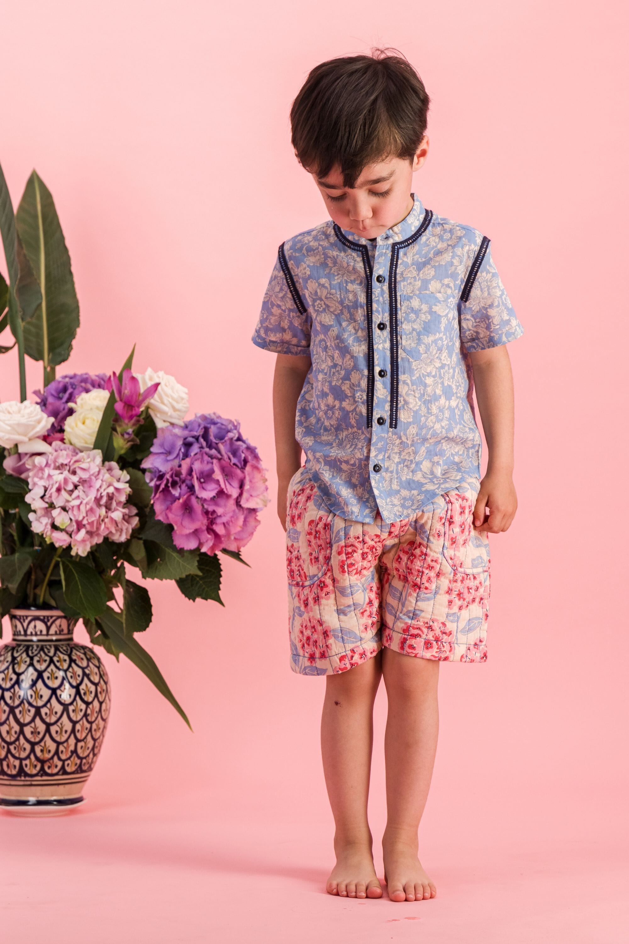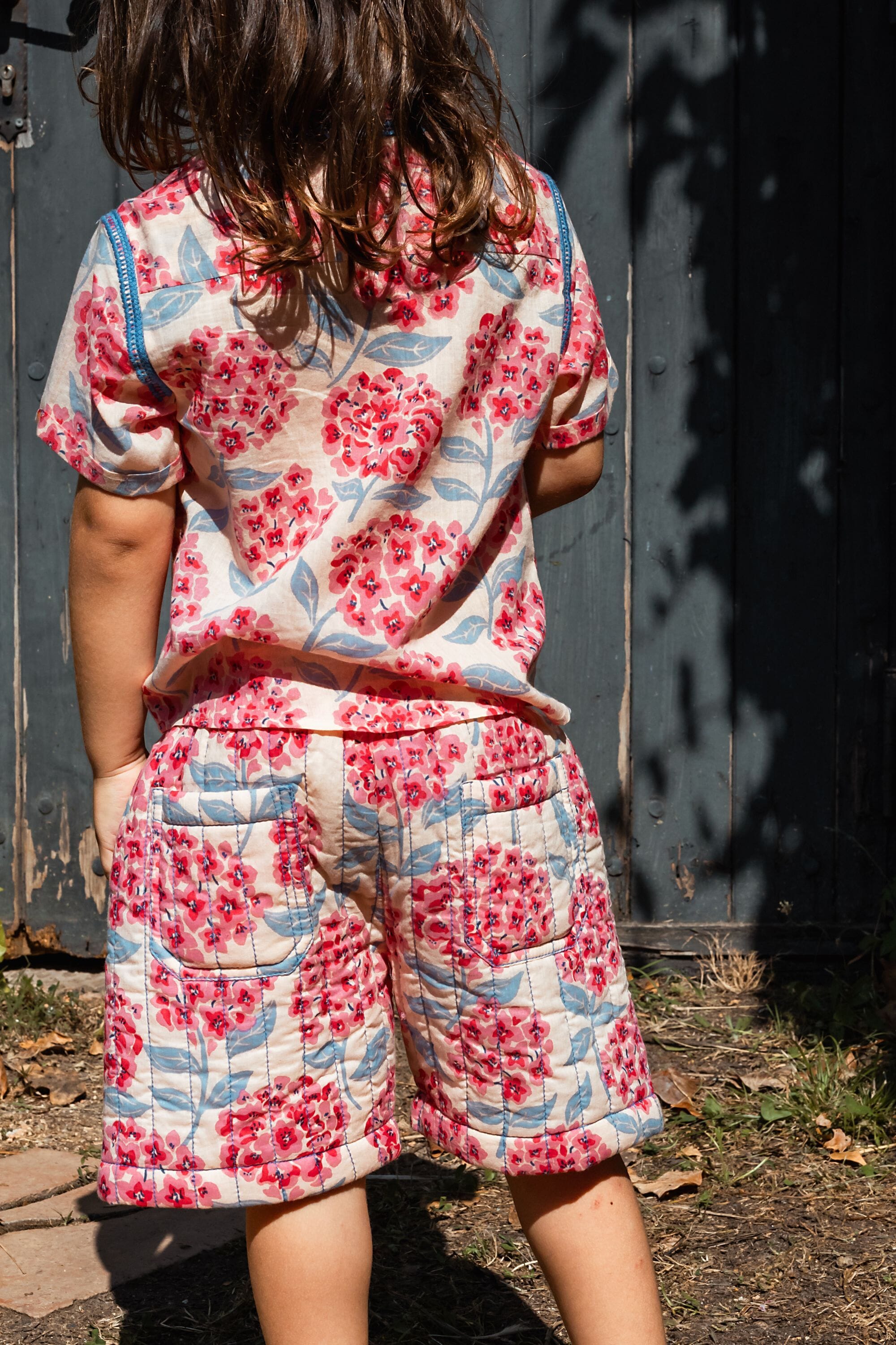 - Bermuda shorts, 100% organic cotton, Plain lining in organic cotton voile, Block print, Contrasting stitching, Front and back pockets.