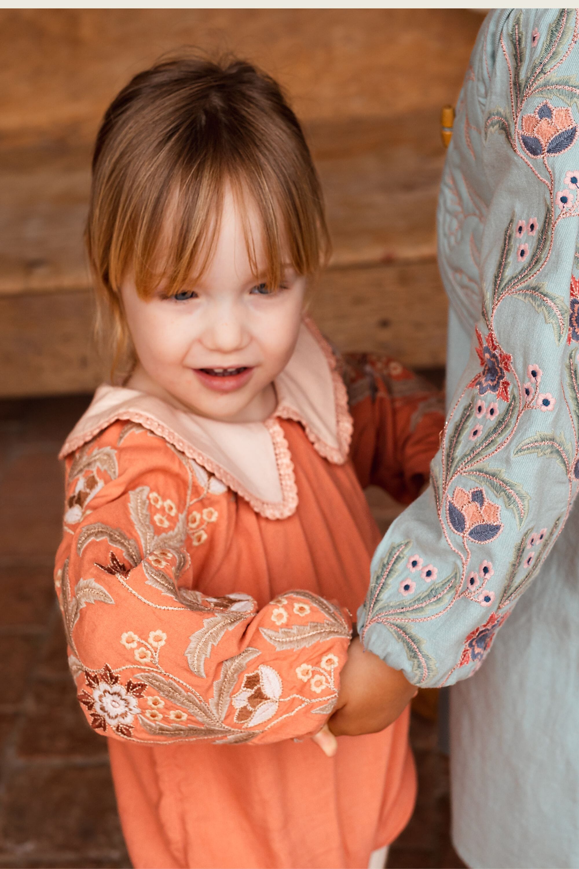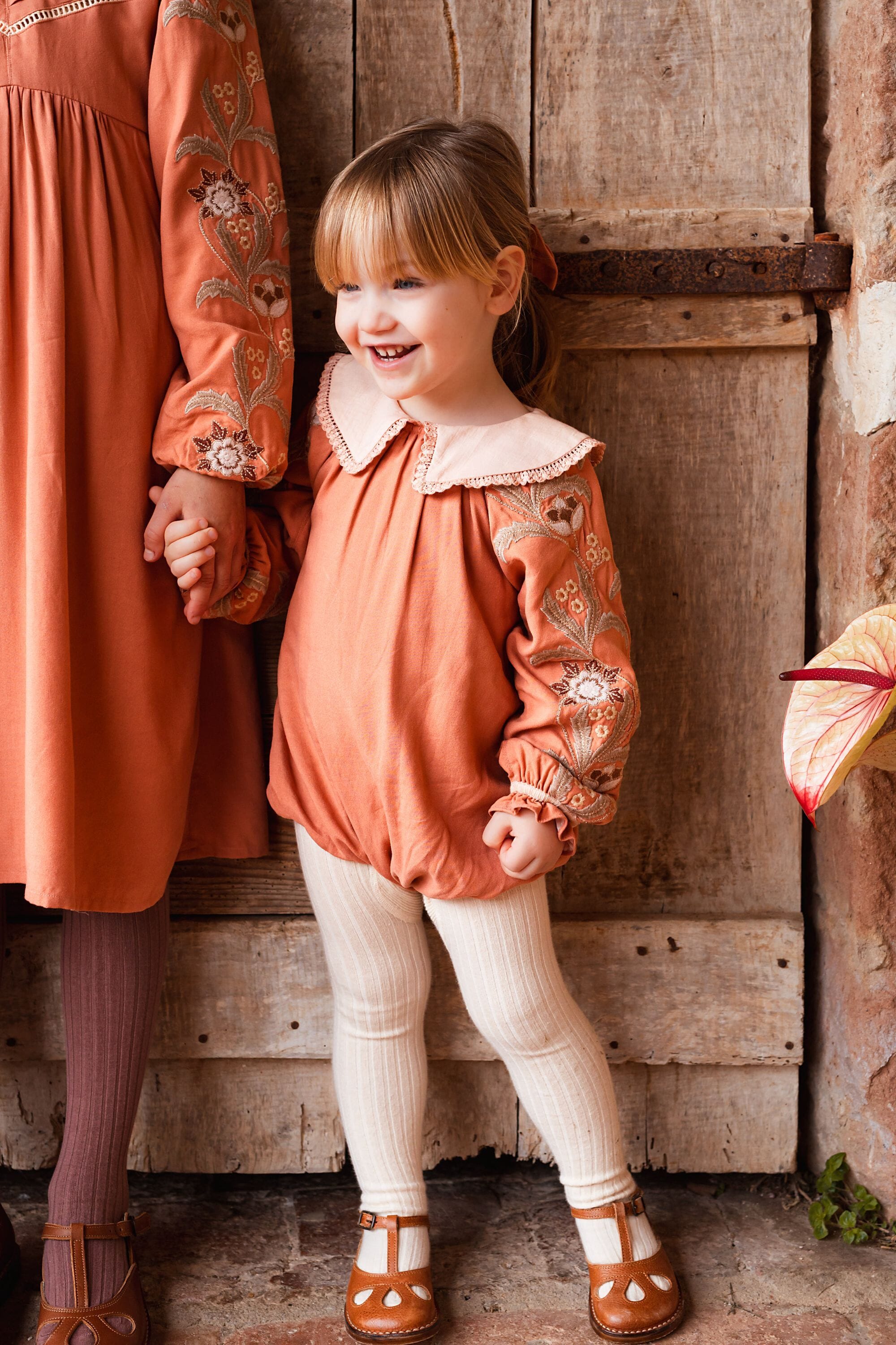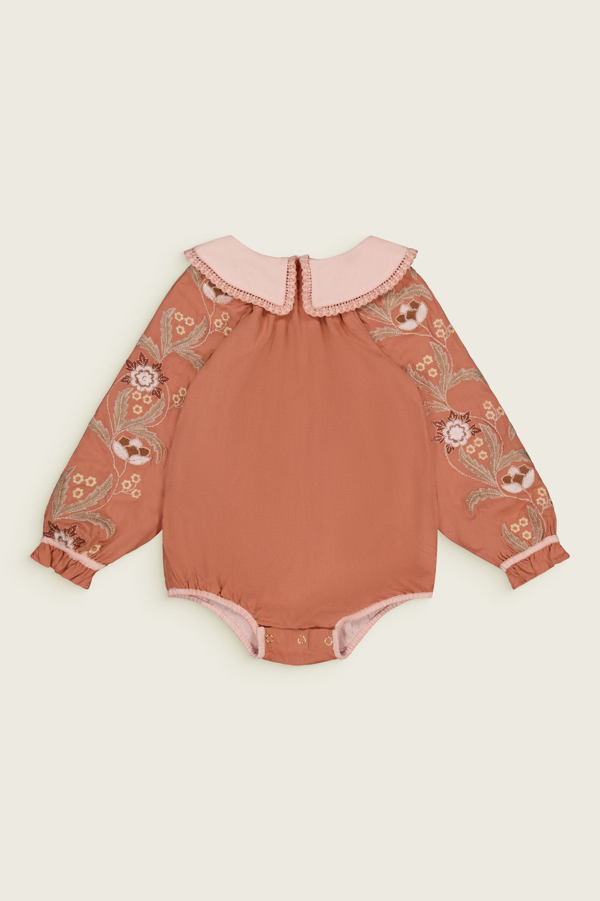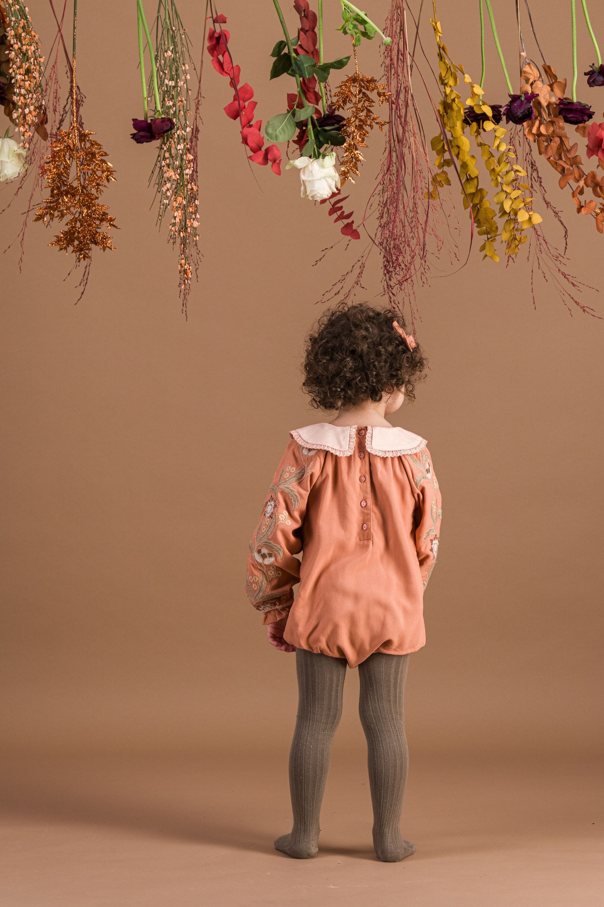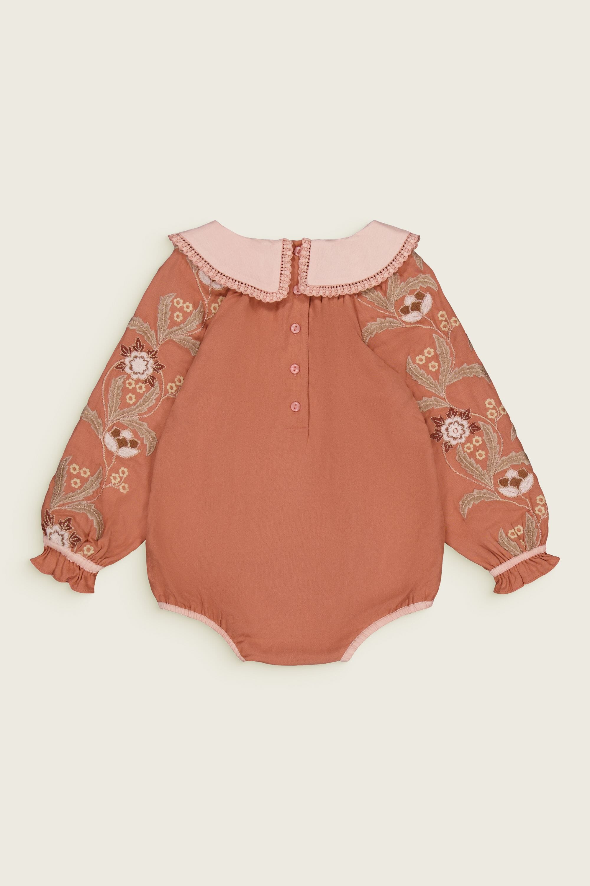 - Romper, 100% ECOVERO® Viscose, Blush color, Plain lining in organic cotton voile, Long embroidered and elasticated sleeves, Contrasting and lace trimmed collar, Tone-and-tone buttons at the back.