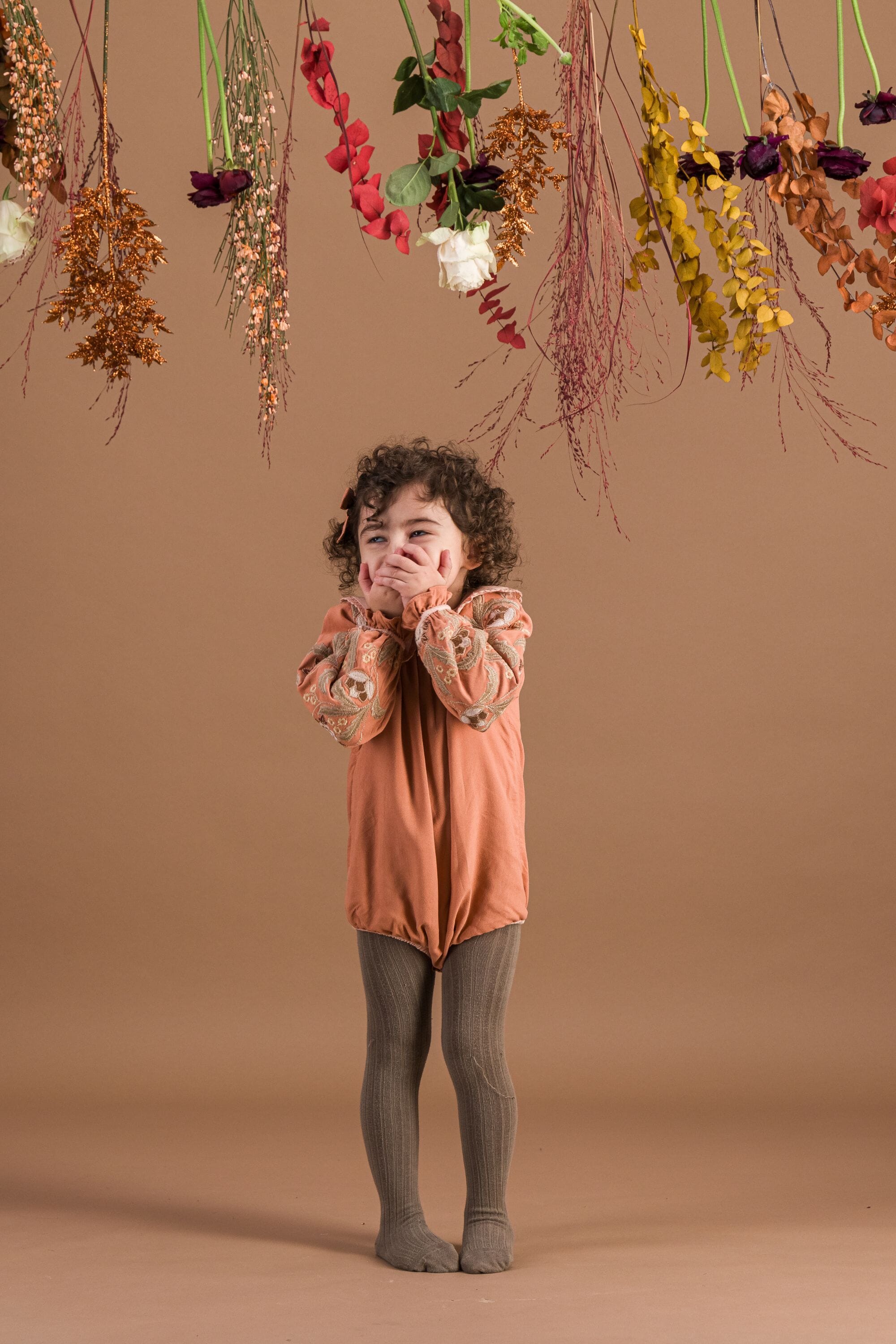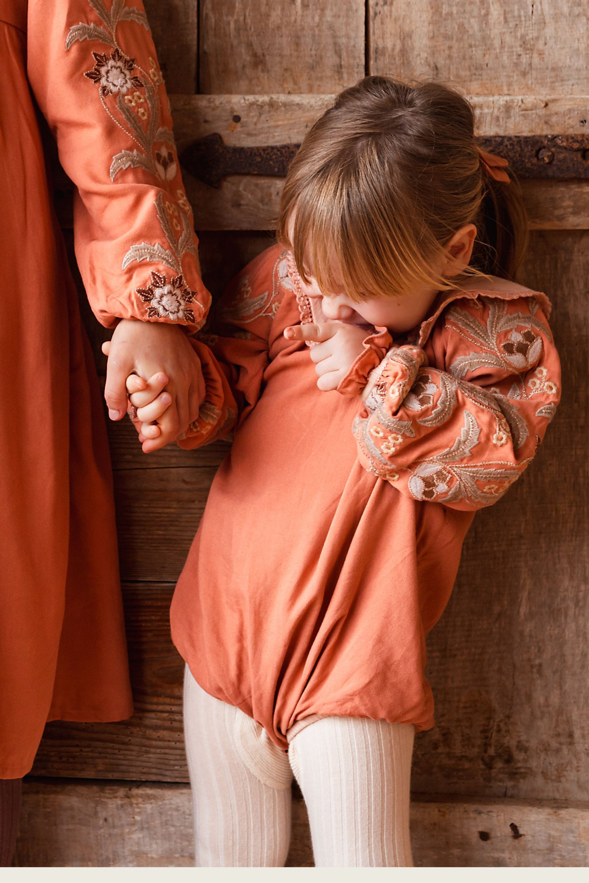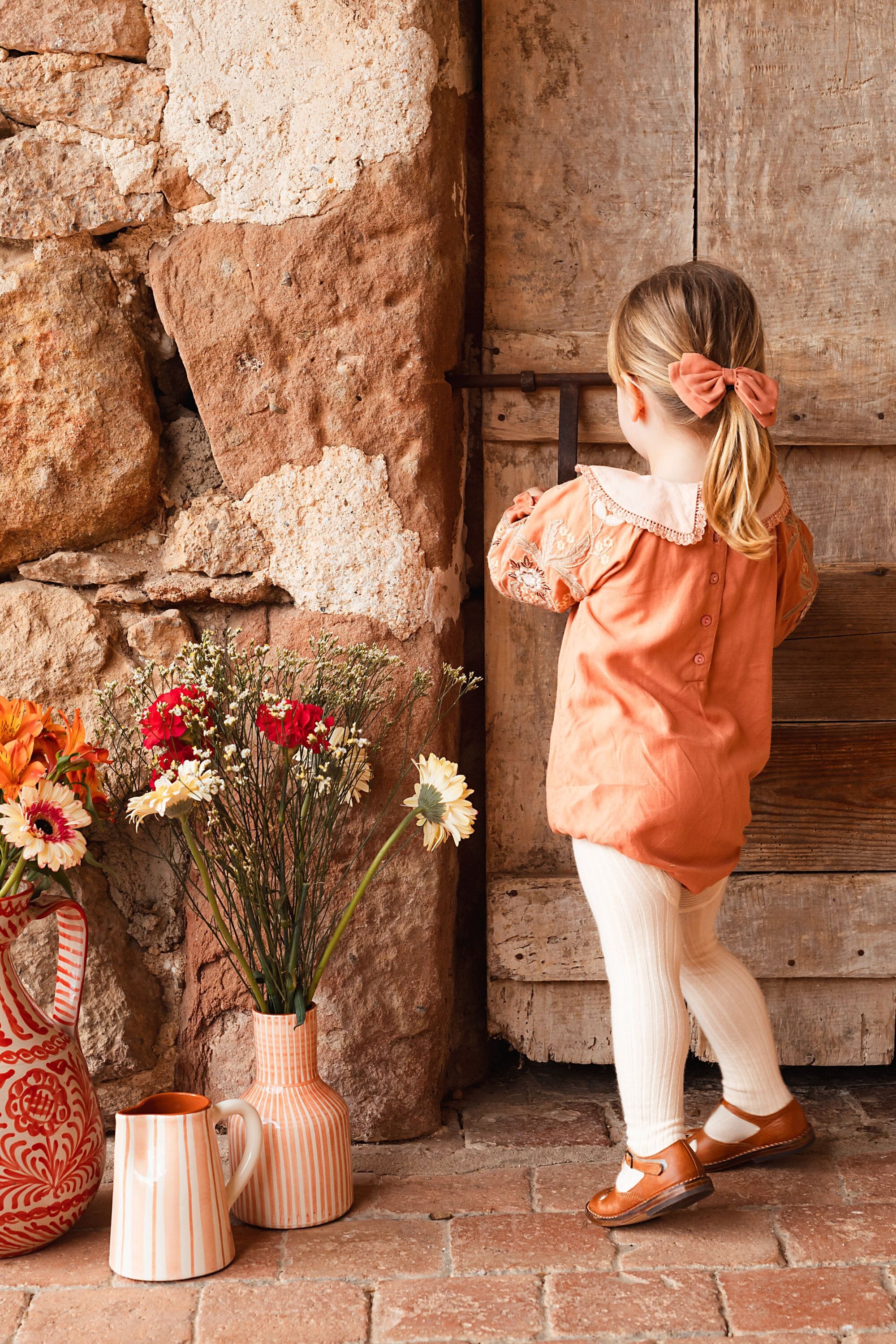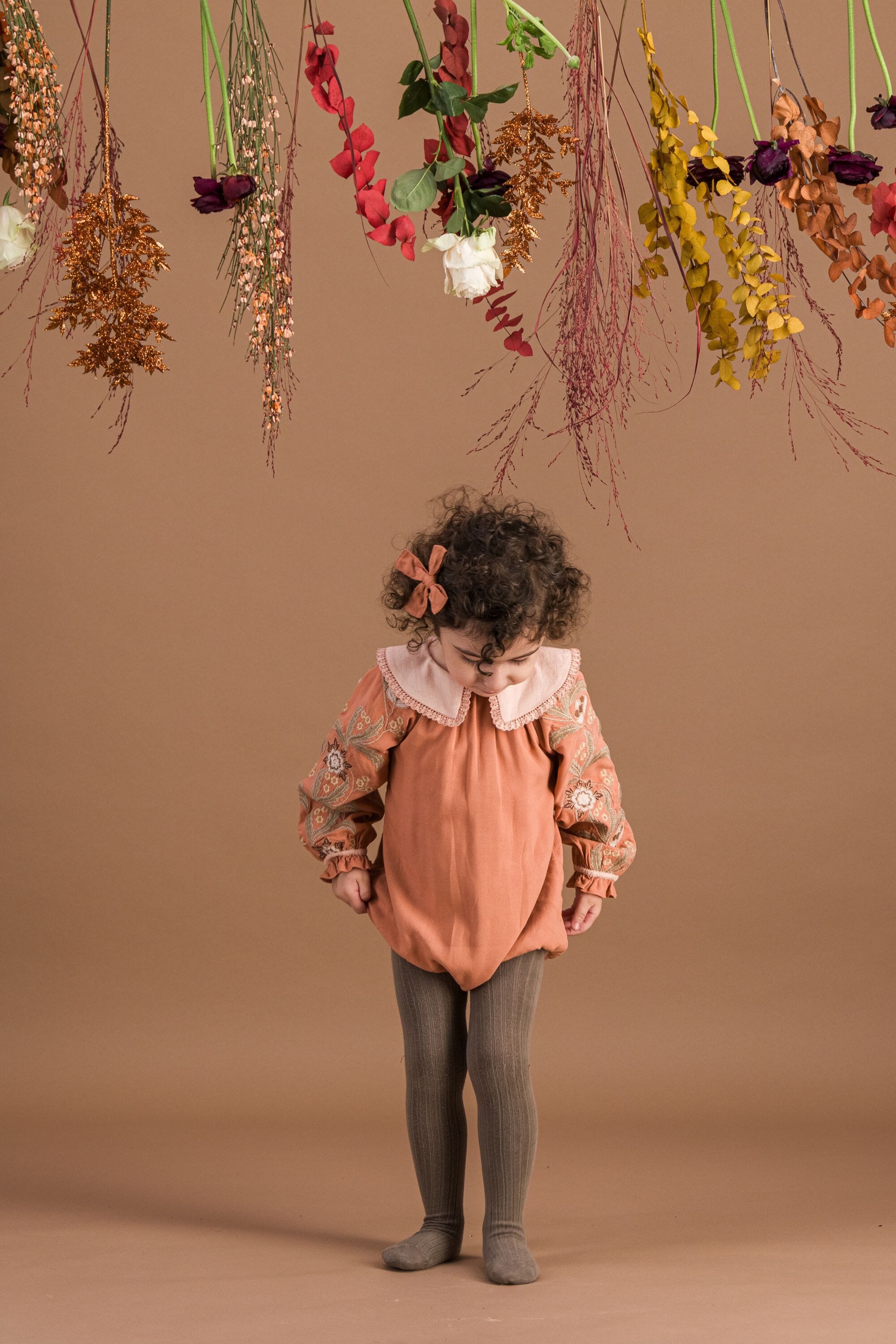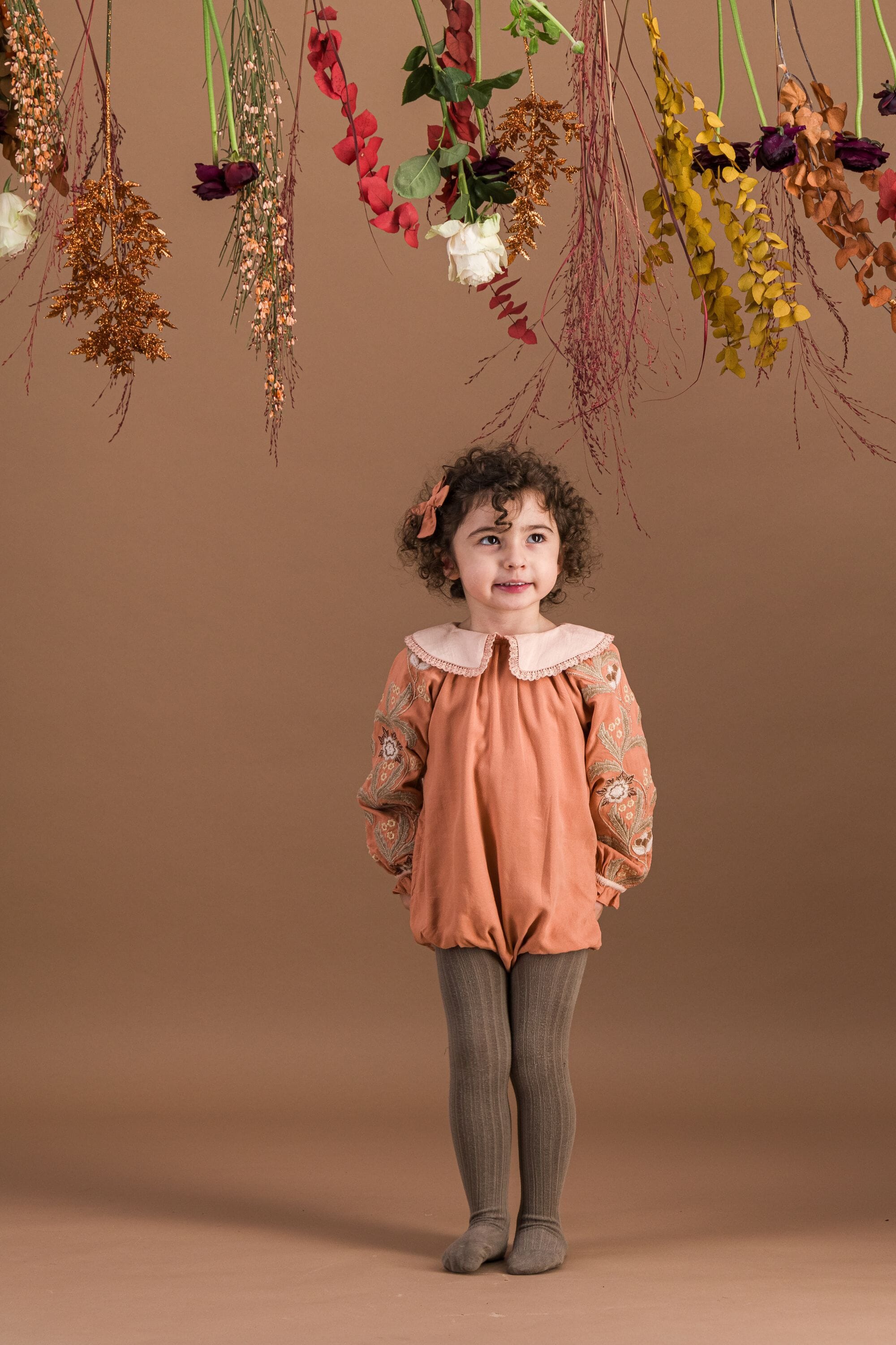- Romper, 100% ECOVERO® Viscose, Blush color, Plain lining in organic cotton voile, Long embroidered and elasticated sleeves, Contrasting and lace trimmed collar, Tone-and-tone buttons at the back.