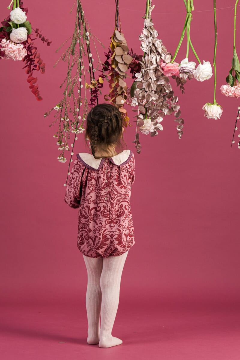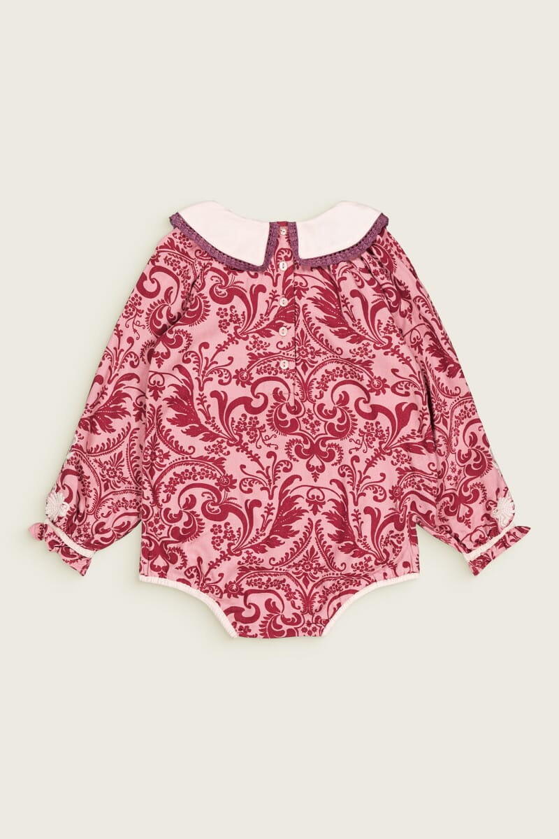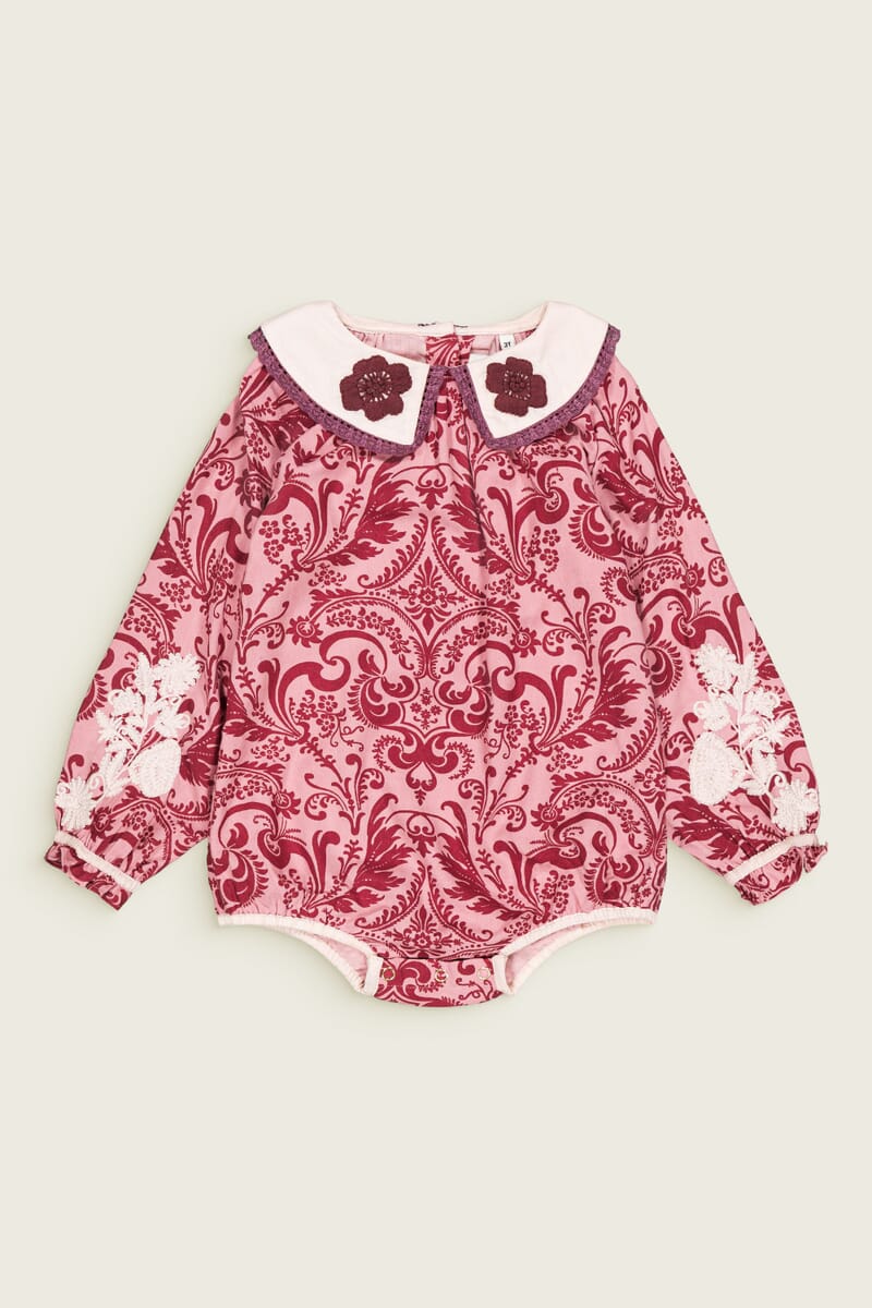 - Romper, 100% ECOVERO® Viscose, Block Print, Plain lining in organic cotton voile, Hand embroidery on the collar and sleeves, Lace, Long elasticated sleeves, Golden snap buttons at the crotch, Golden buttons at the back.