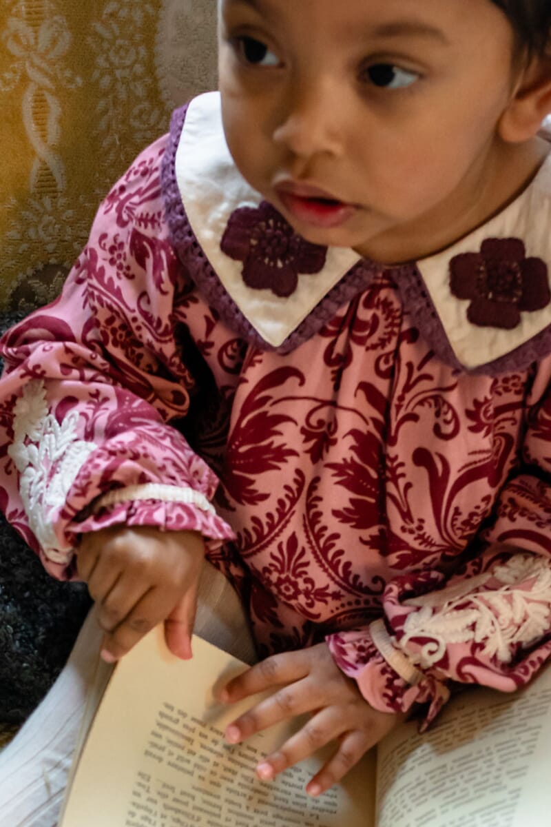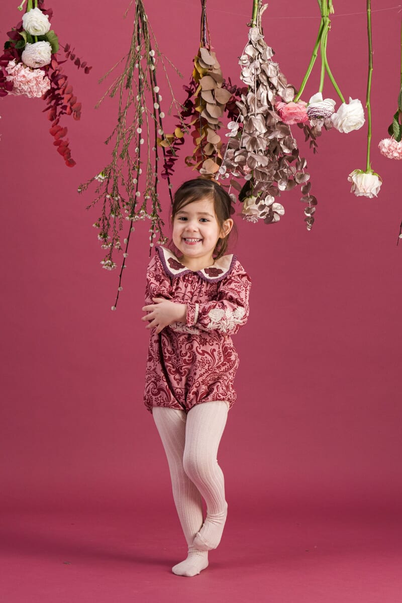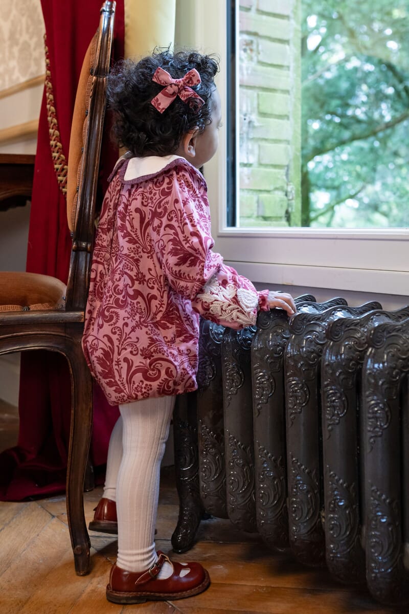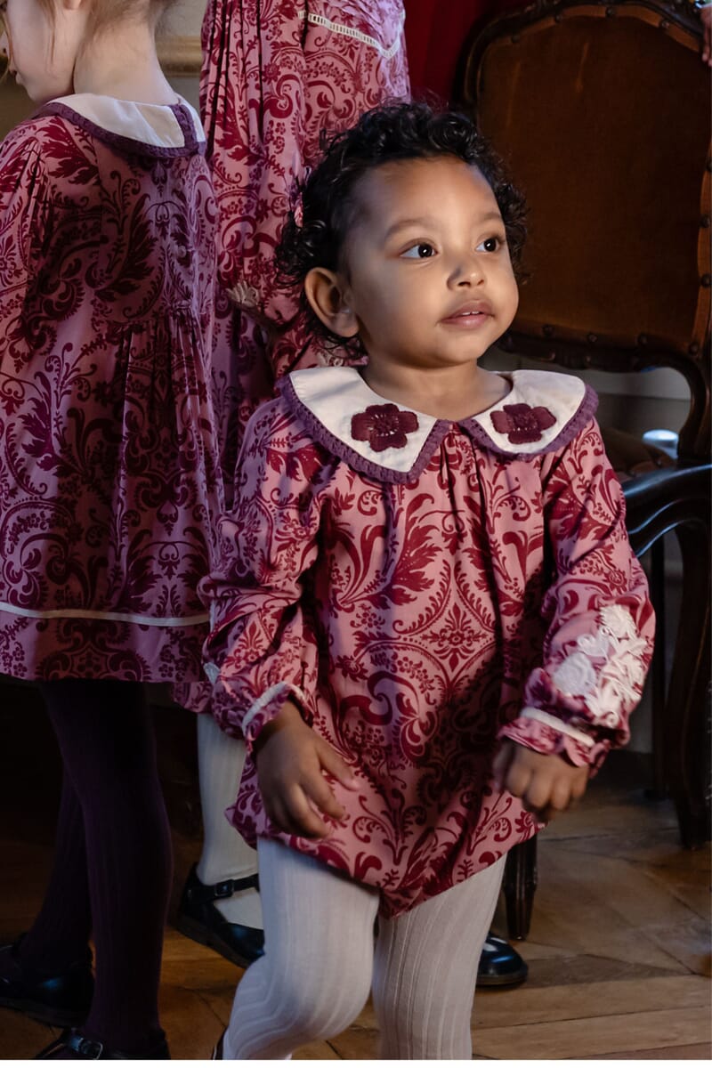 - Romper, 100% ECOVERO® Viscose, Block Print, Plain lining in organic cotton voile, Hand embroidery on the collar and sleeves, Lace, Long elasticated sleeves, Golden snap buttons at the crotch, Golden buttons at the back.