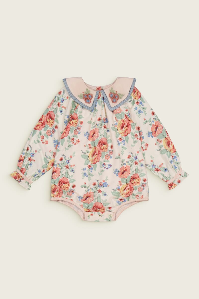 A romper in ECOVERO® Viscose with a hand embroidered and lace trimmed collar.