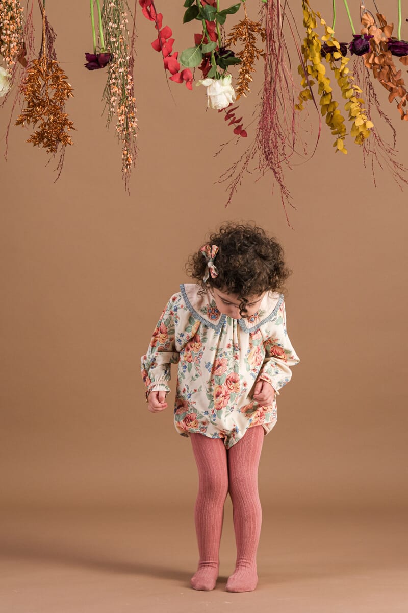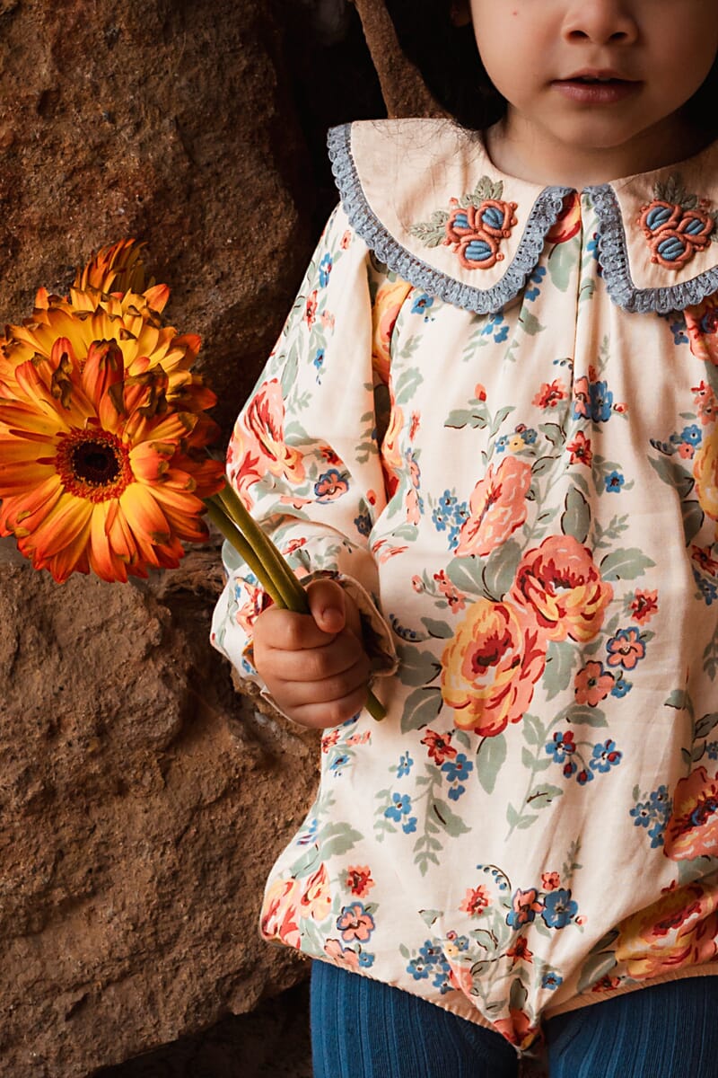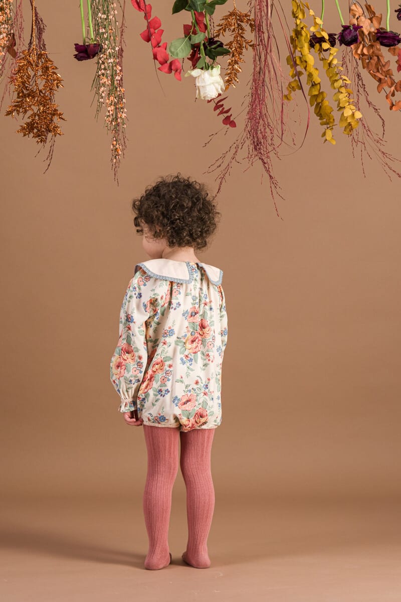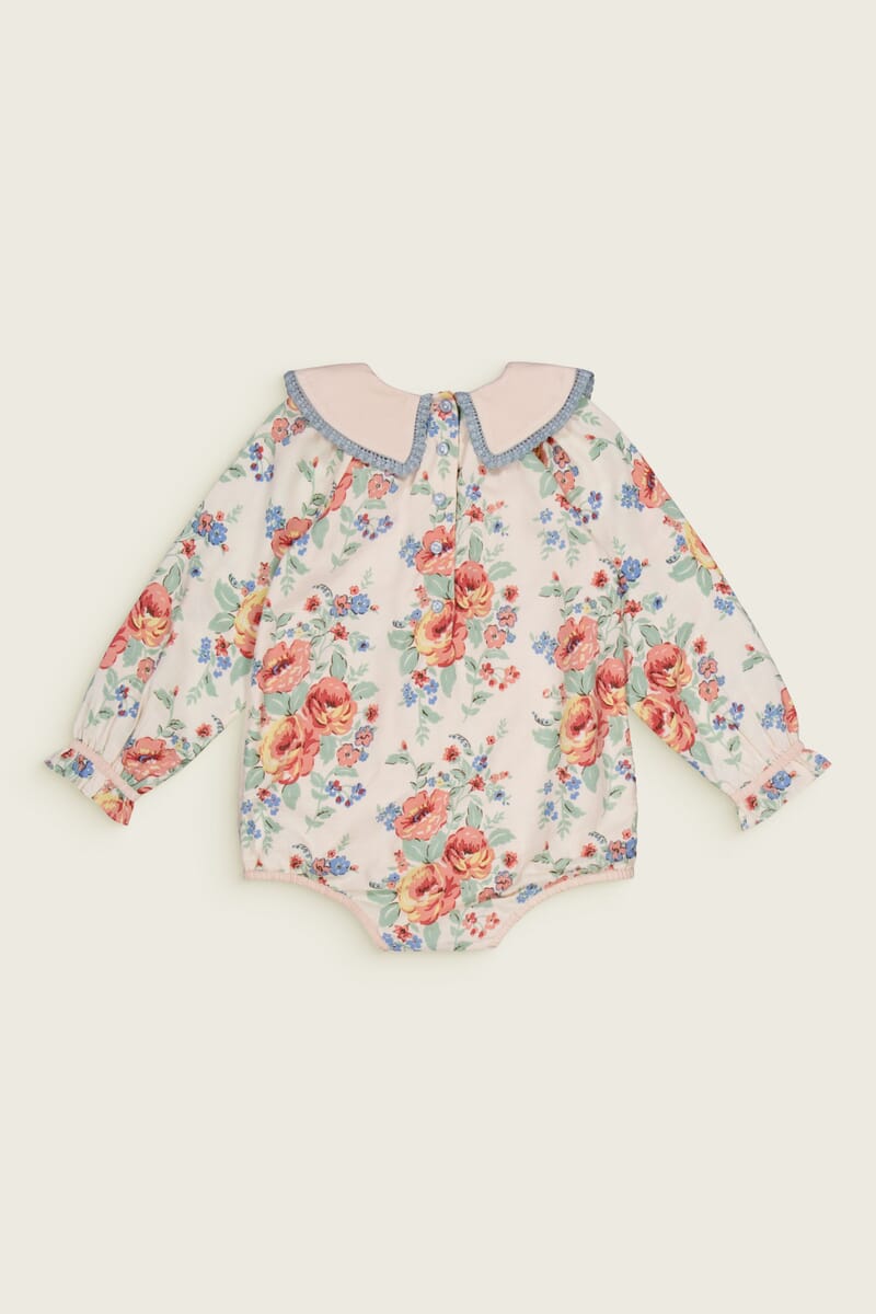 - Romper, 100% ECOVERO® Viscose, Block print, Plain lining in organic cotton voile, hand embroidered and lace trimmed collar, Long elasticated sleeves, Golden snap buttons at the crotch, Golden buttons at the back.