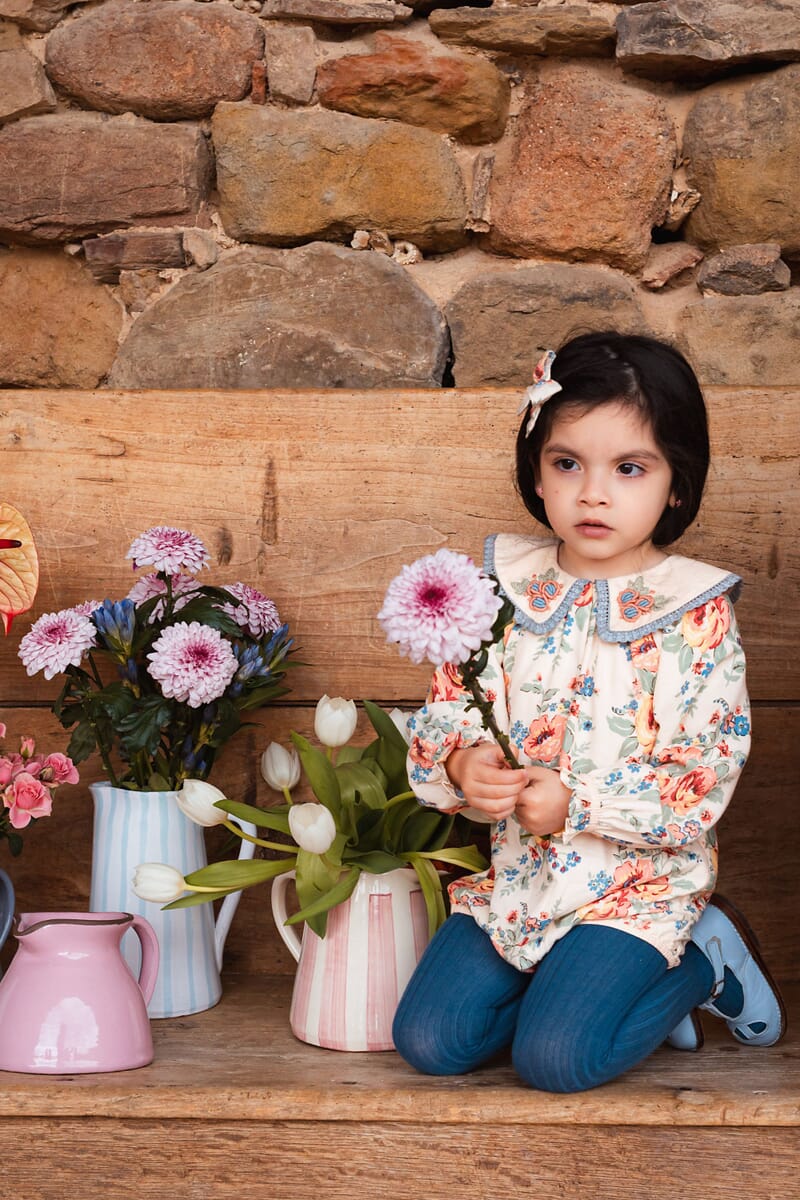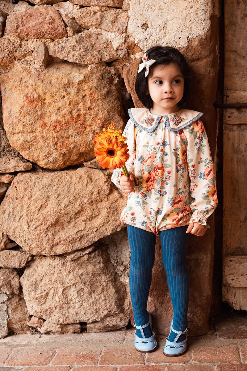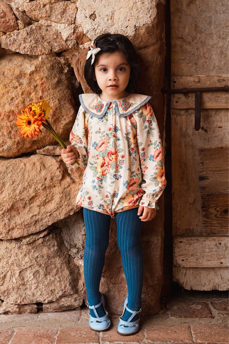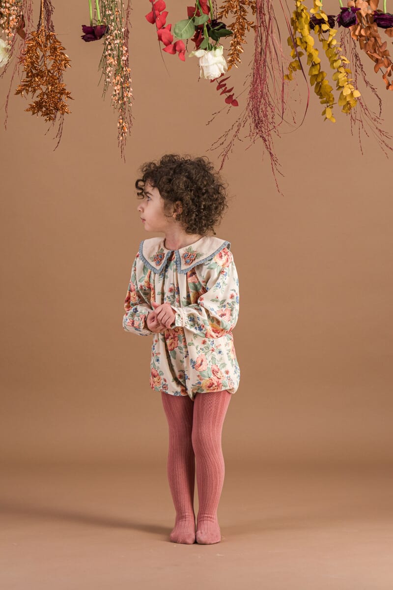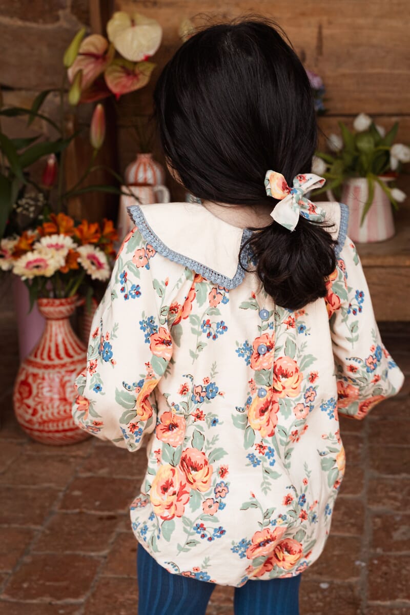 - Romper, 100% ECOVERO® Viscose, Block print, Plain lining in organic cotton voile, hand embroidered and lace trimmed collar, Long elasticated sleeves, Golden snap buttons at the crotch, Golden buttons at the back.