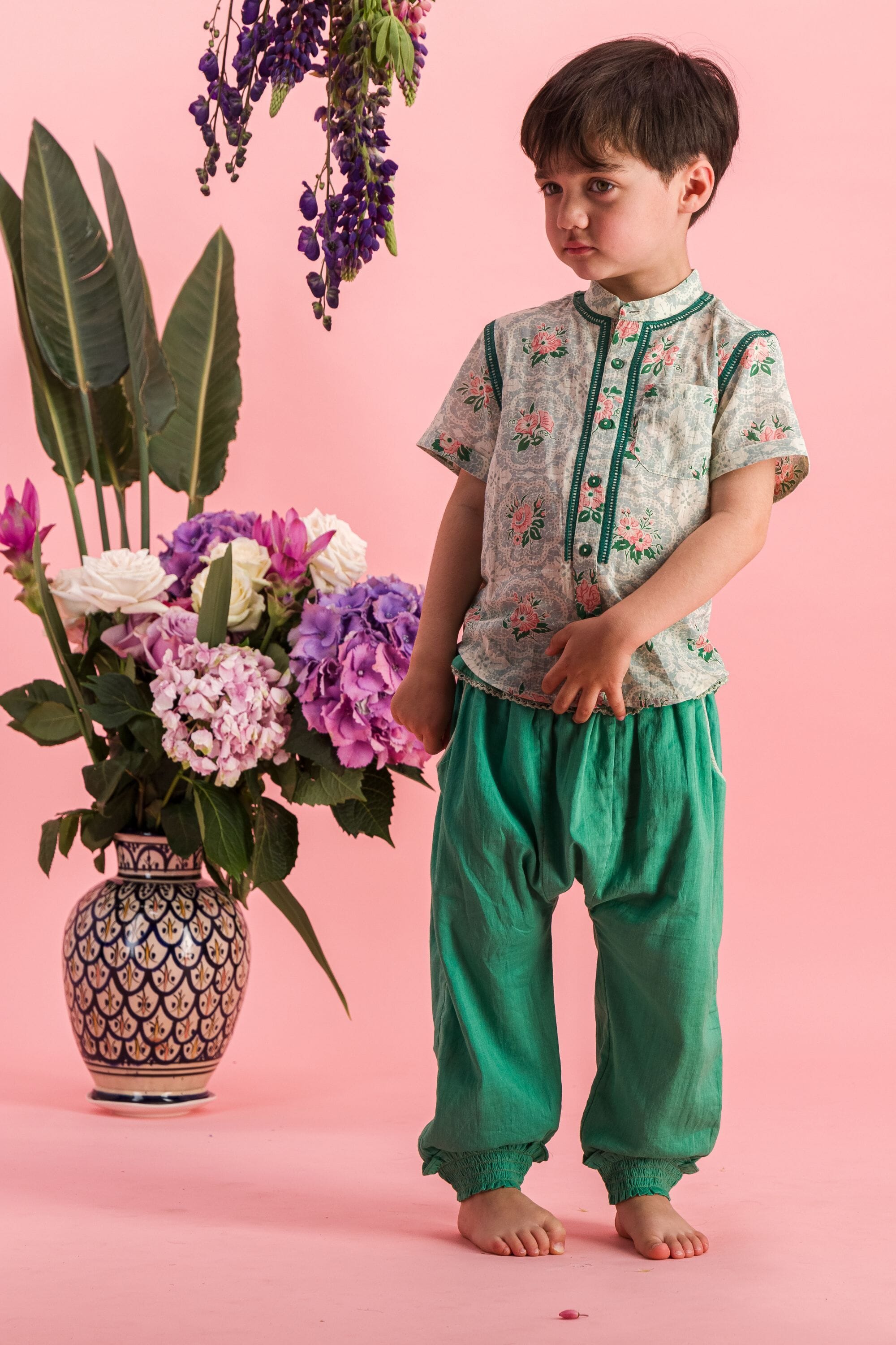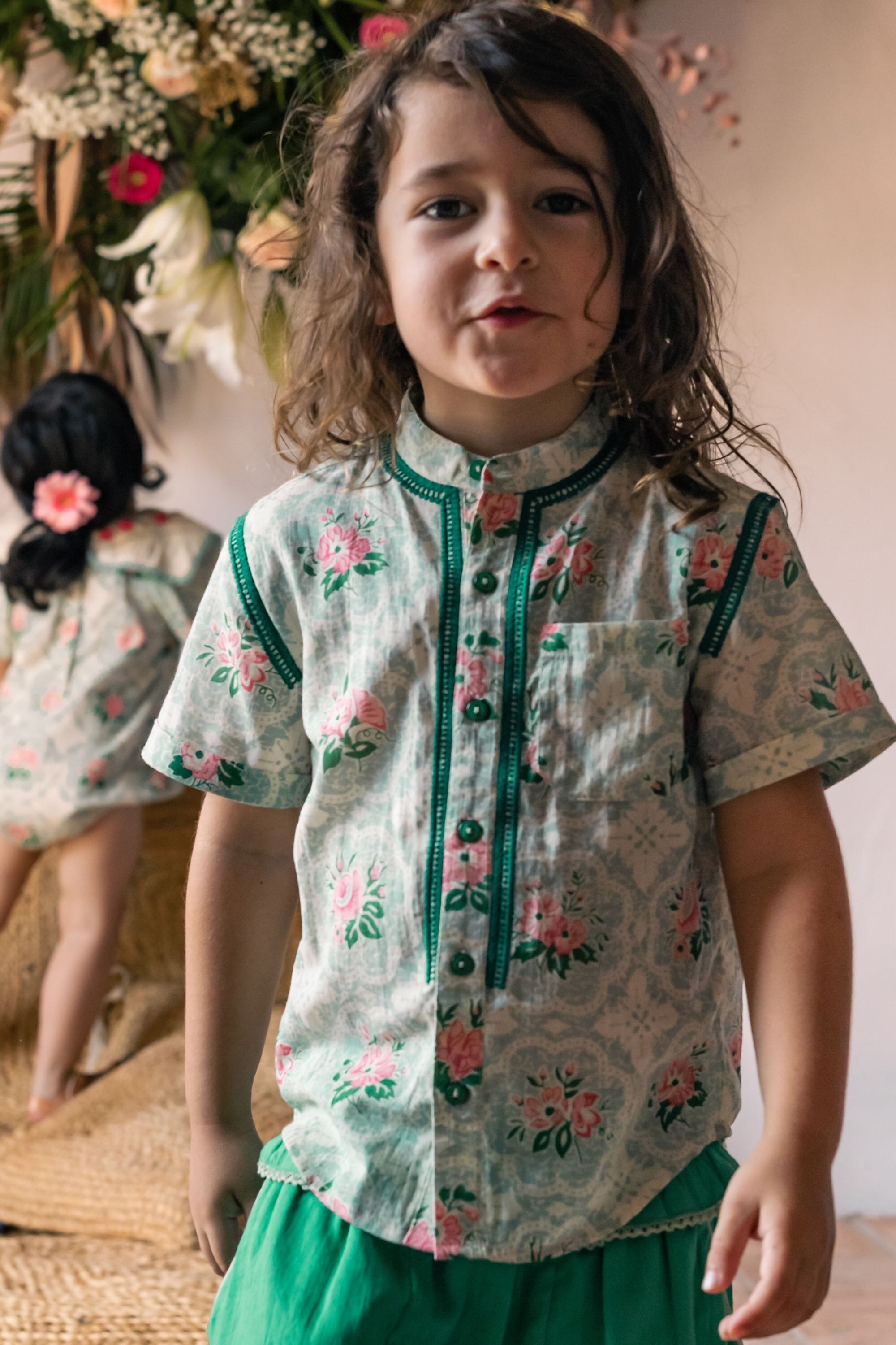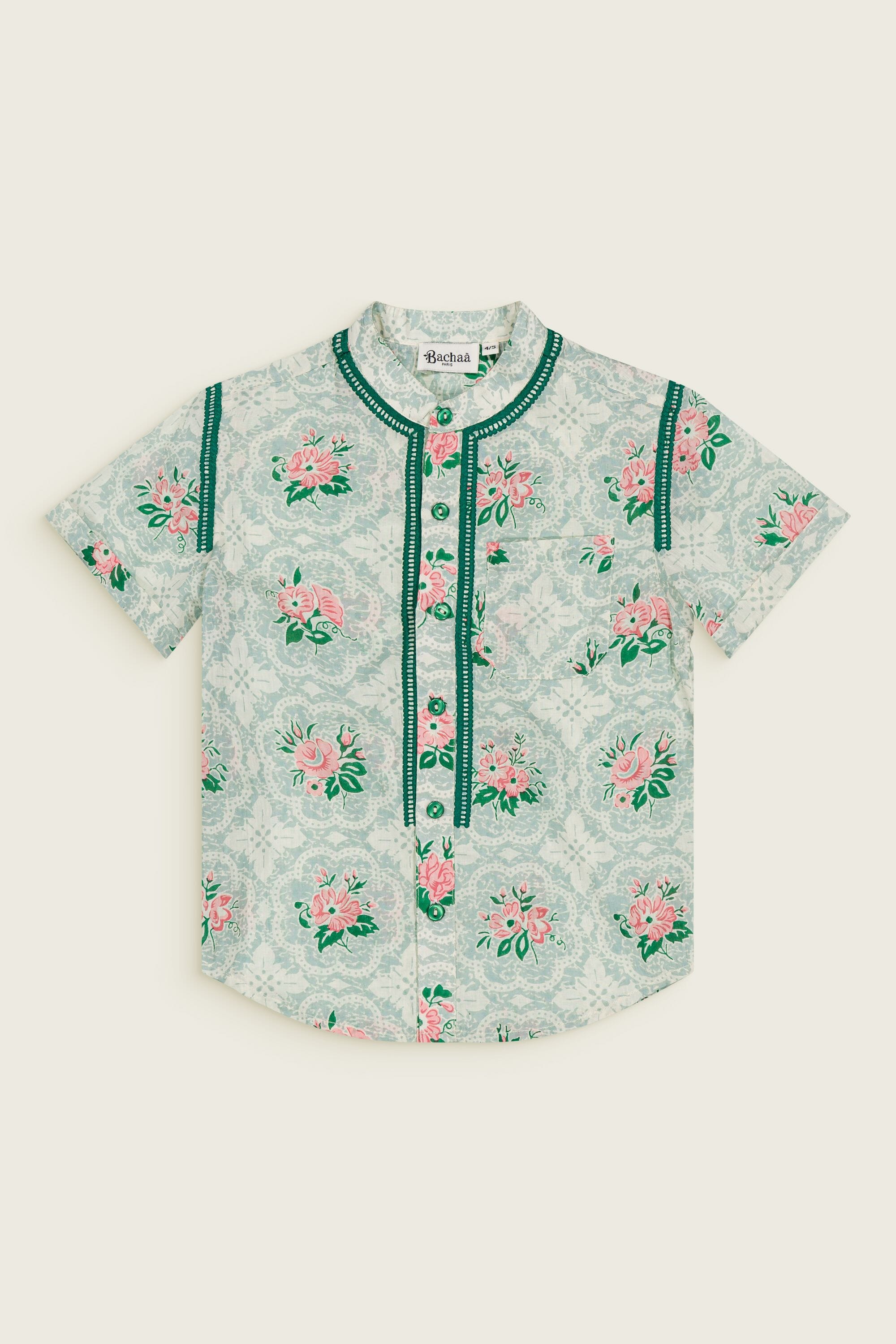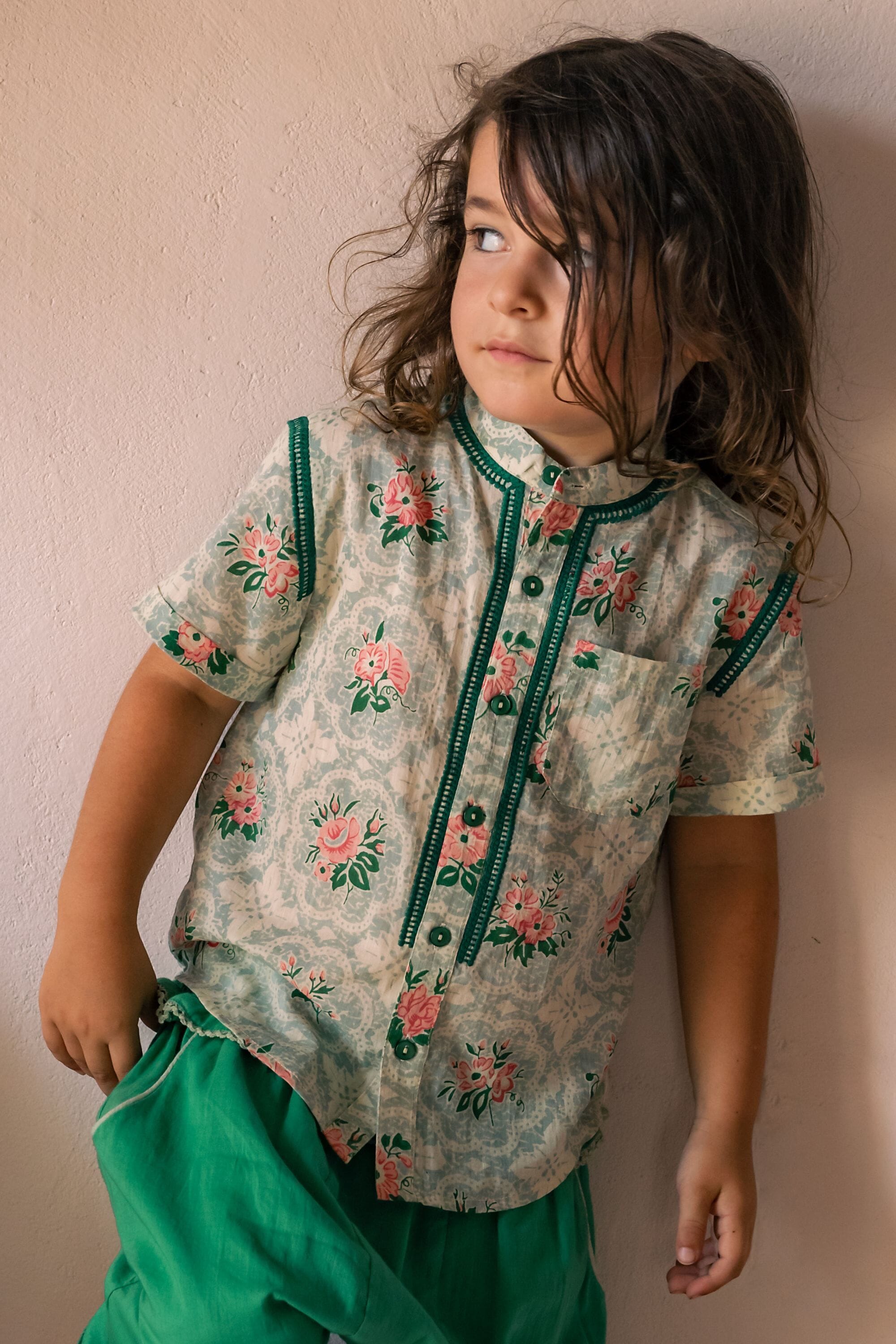 - Shirt, 100% organic cotton, Block print, Officer collar, Embroidery along the collar, button placket and armhole, Chest pocket, Short sleeves, Contrasted buttons.