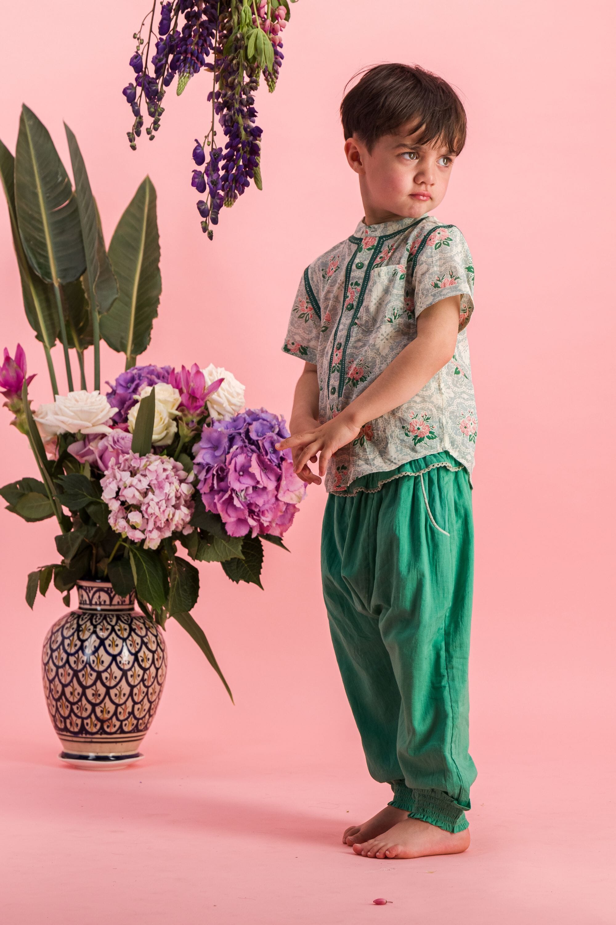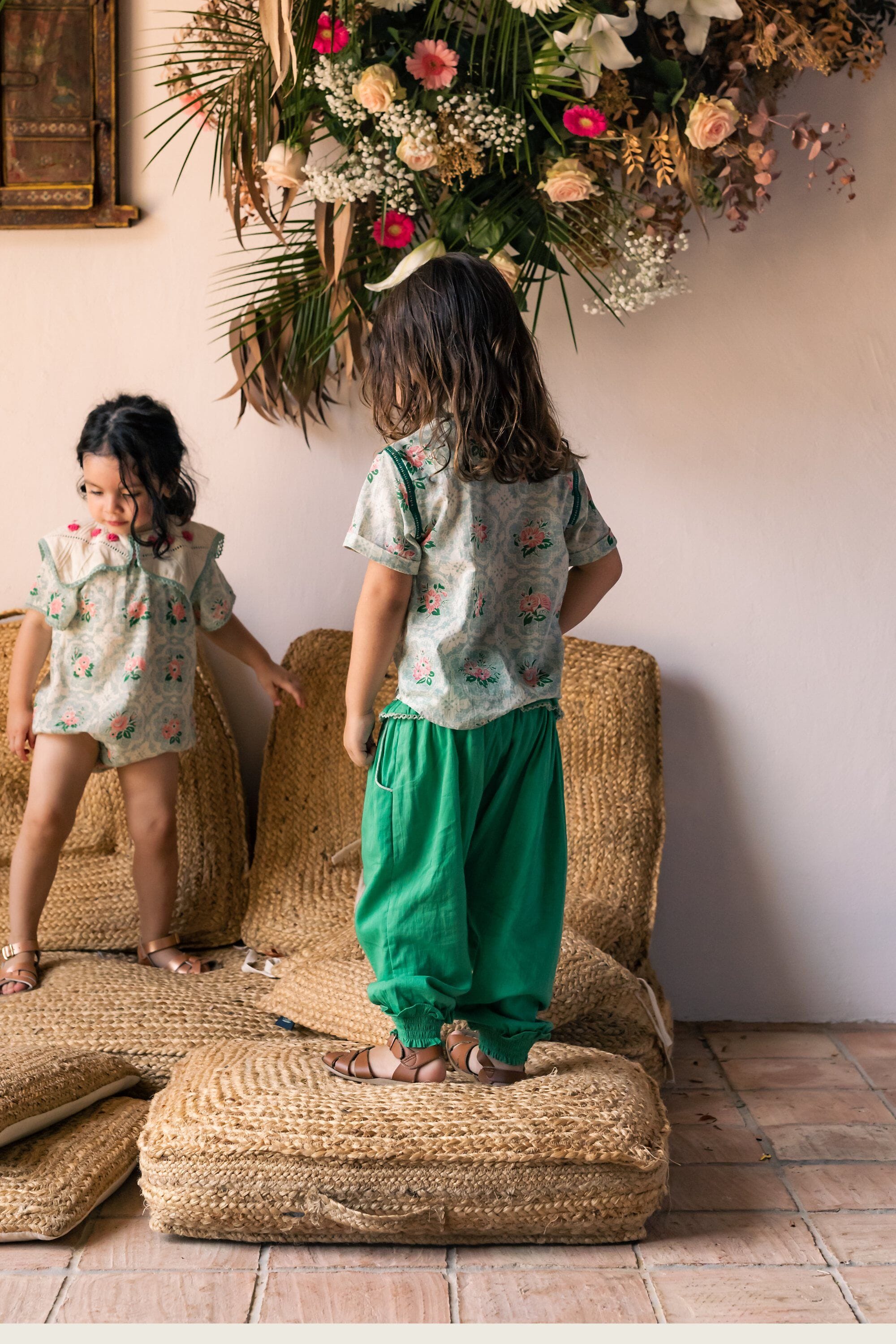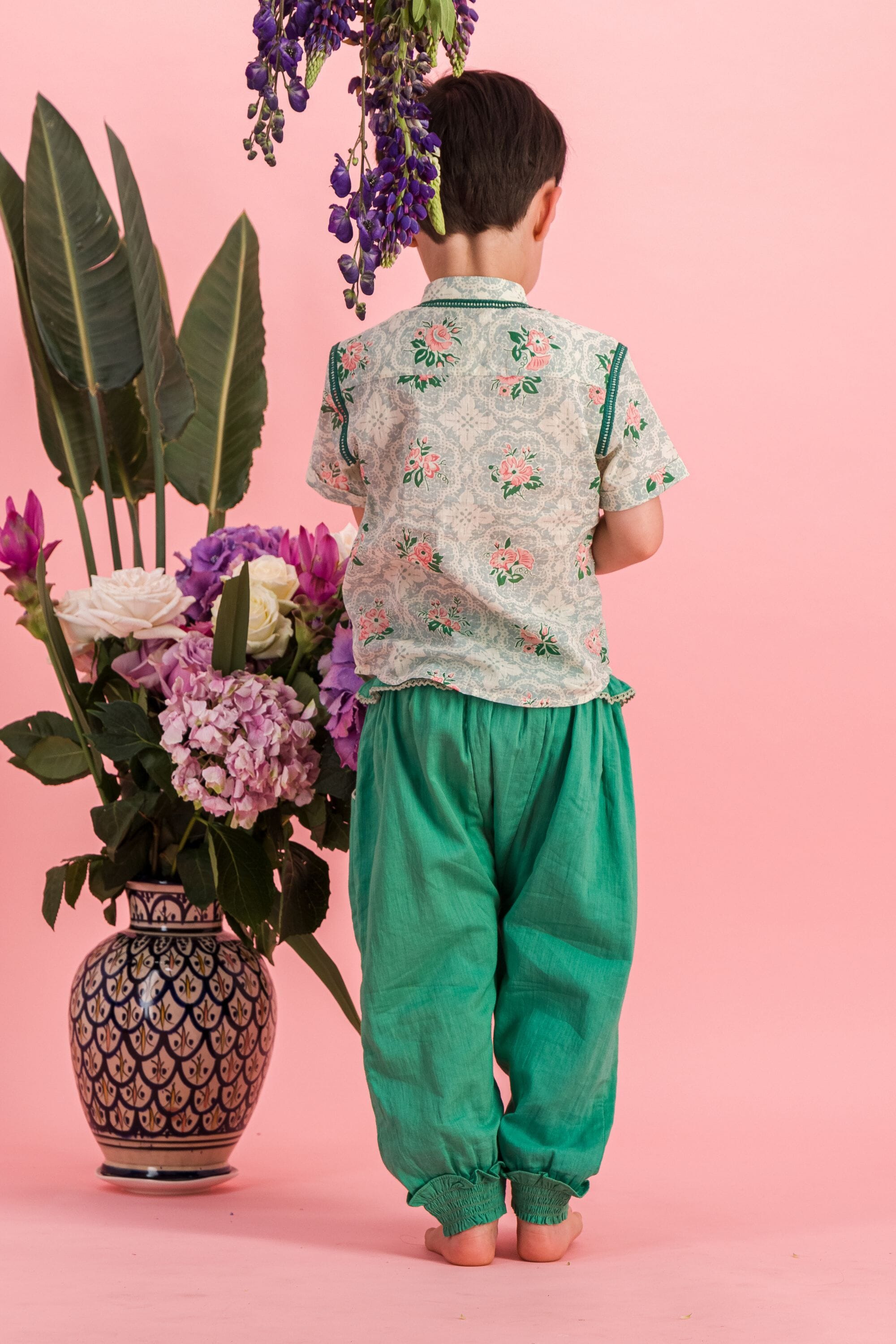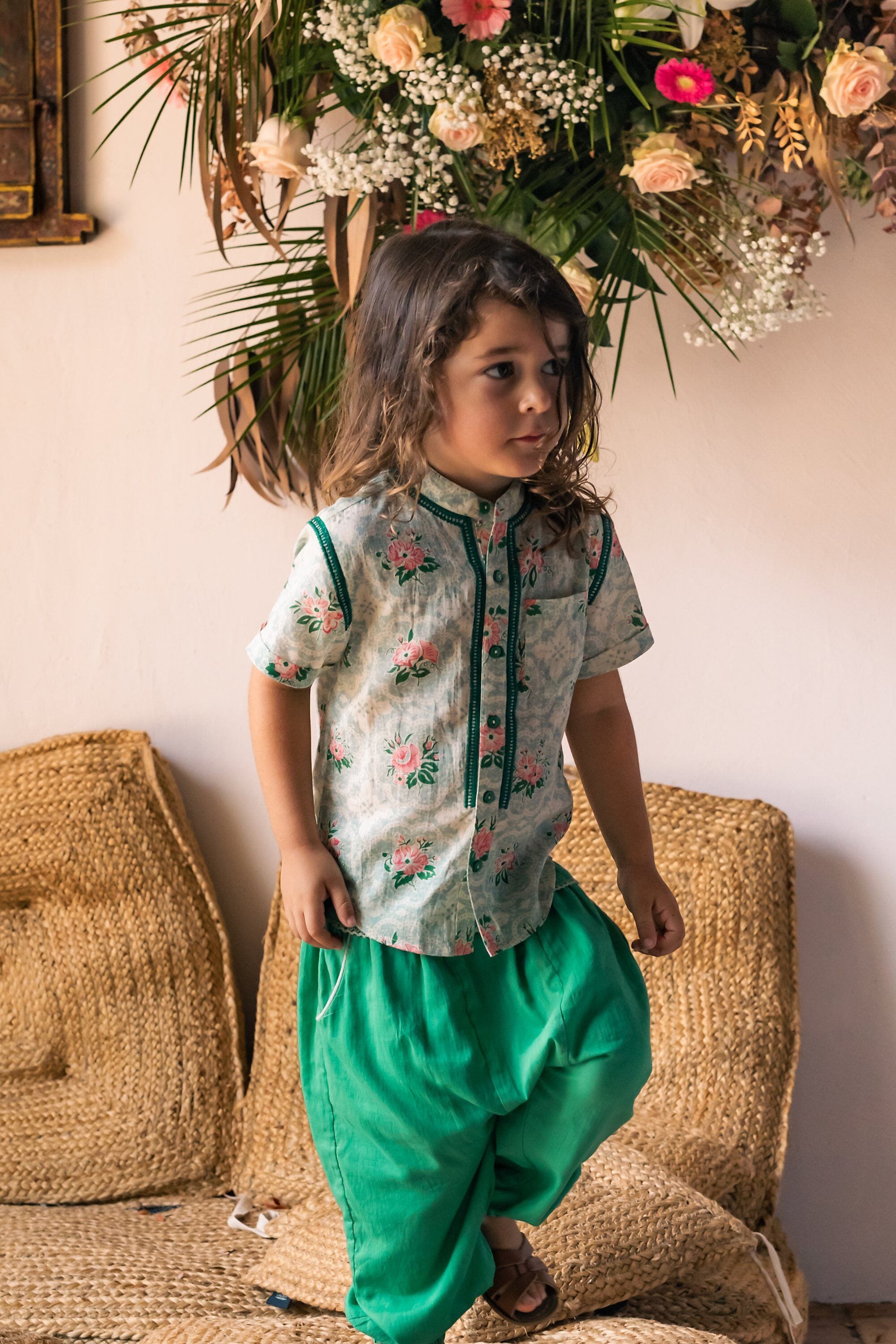 - Shirt, 100% organic cotton, Block print, Officer collar, Embroidery along the collar, button placket and armhole, Chest pocket, Short sleeves, Contrasted buttons.