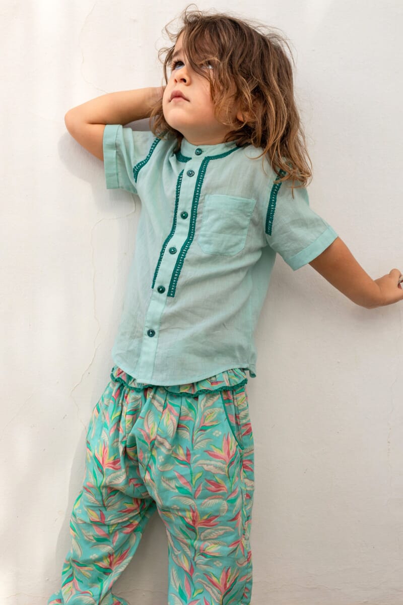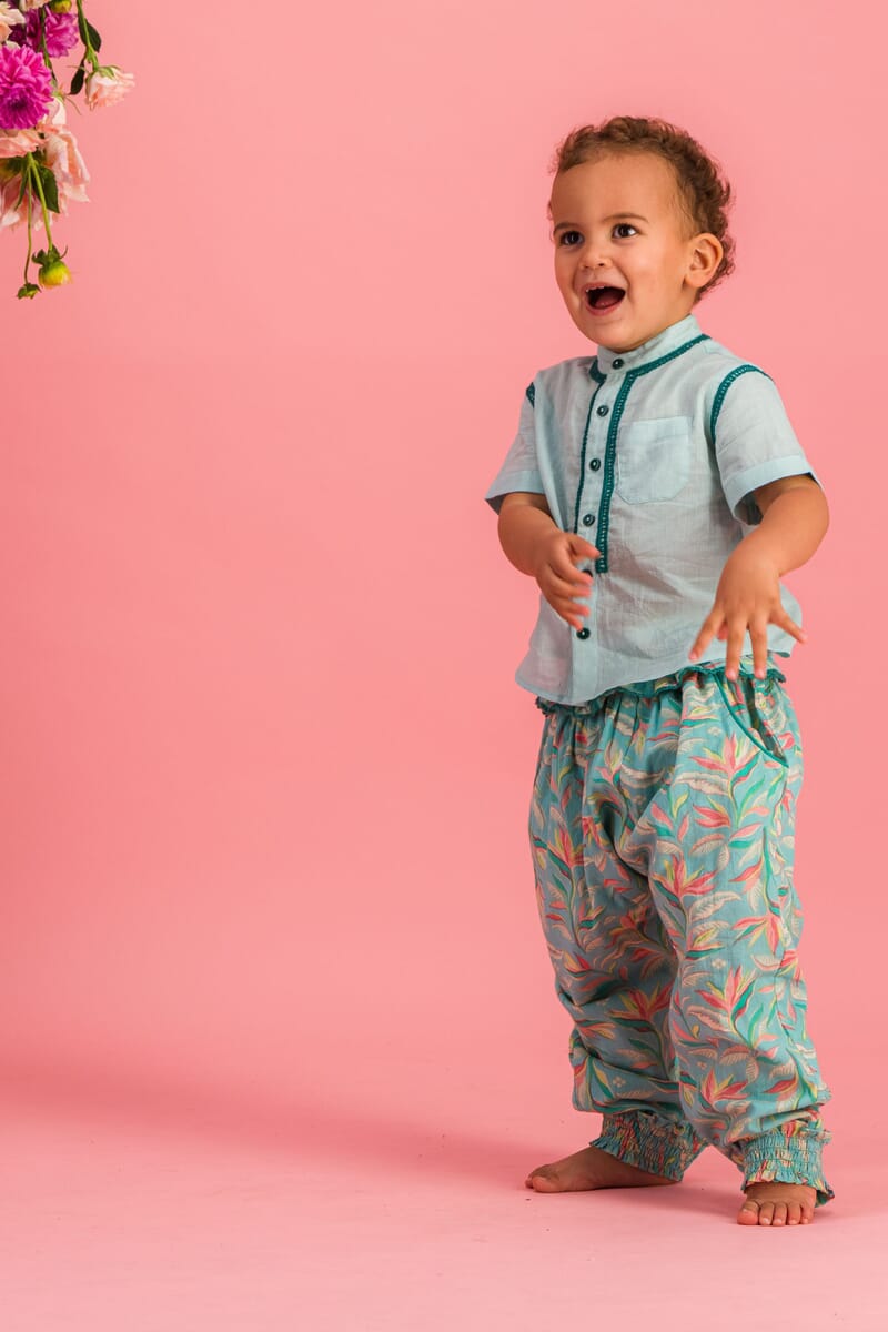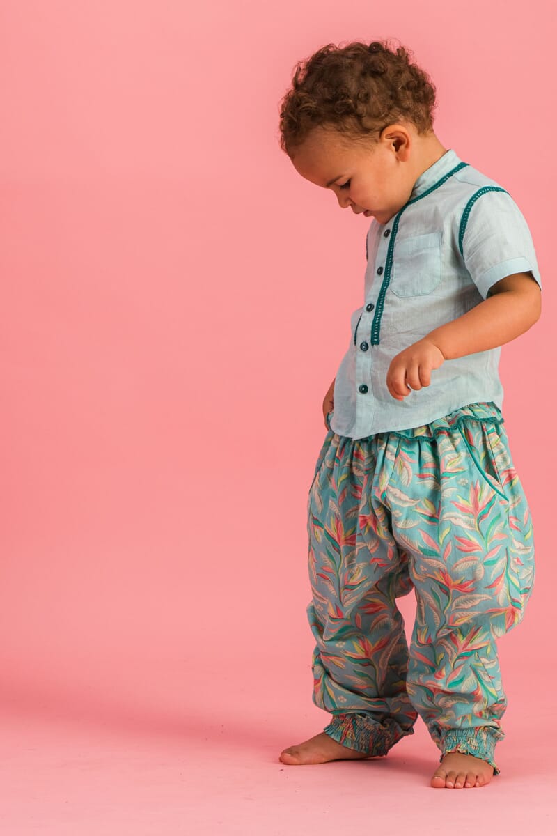 It smocked at the waist and ankles and offers great ease of movement to your child, while giving him a bohemian look.