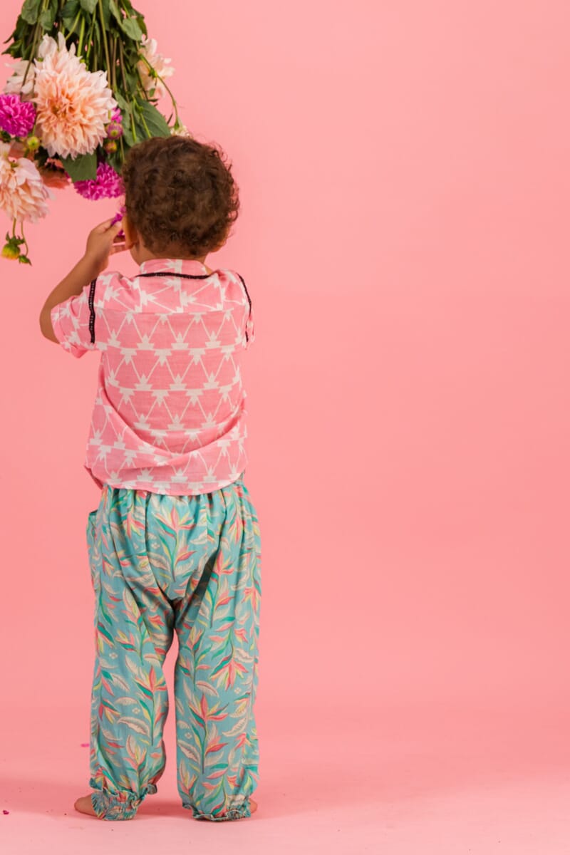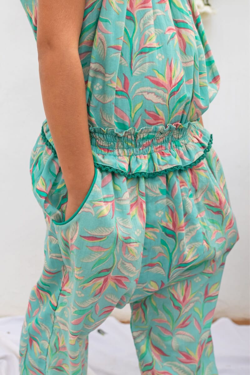 - Harem pant, 100% organic cotton, Block print, Smocks at the waist with lace finishing, Smocks at the ankle, Side pockets with a golden piping.