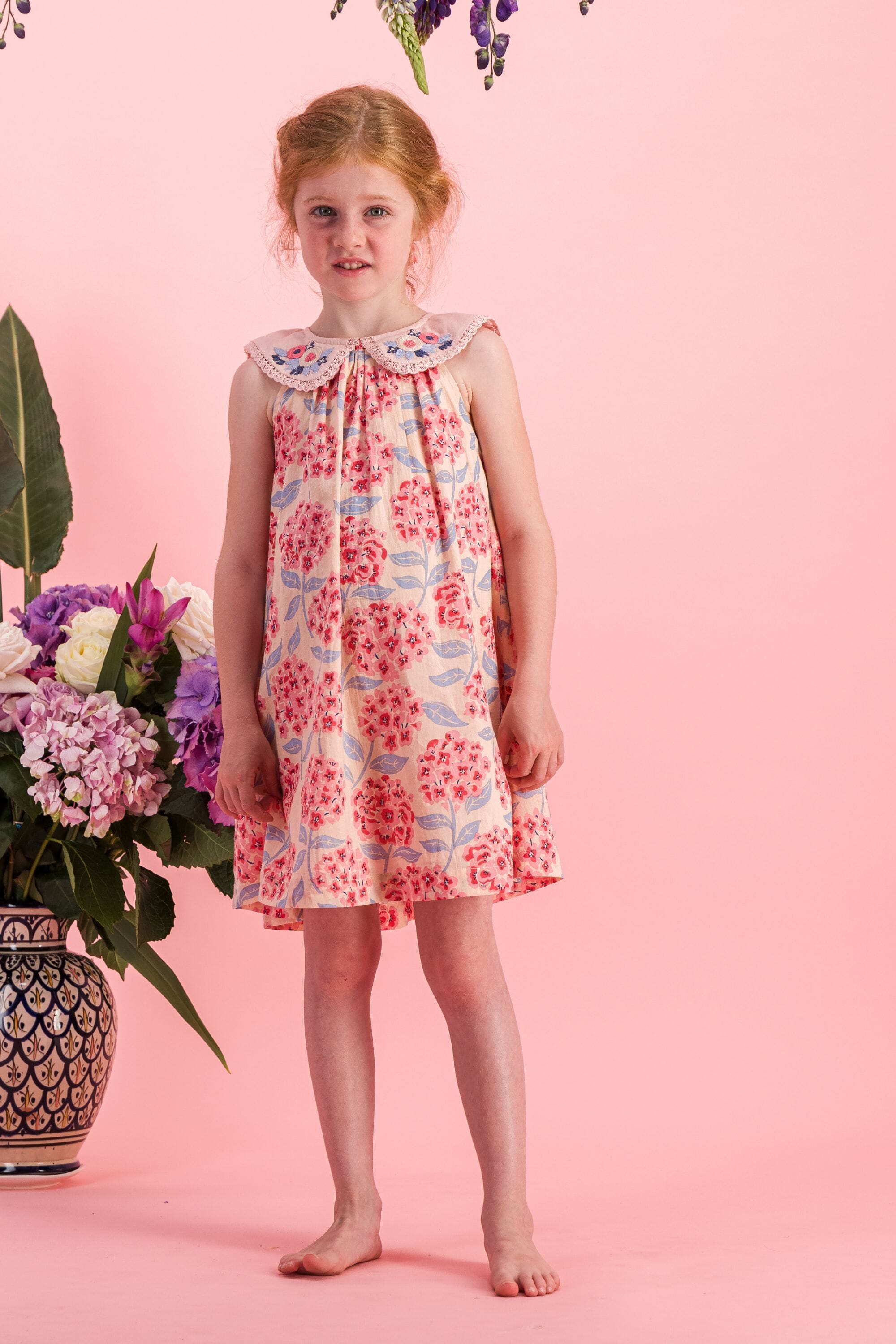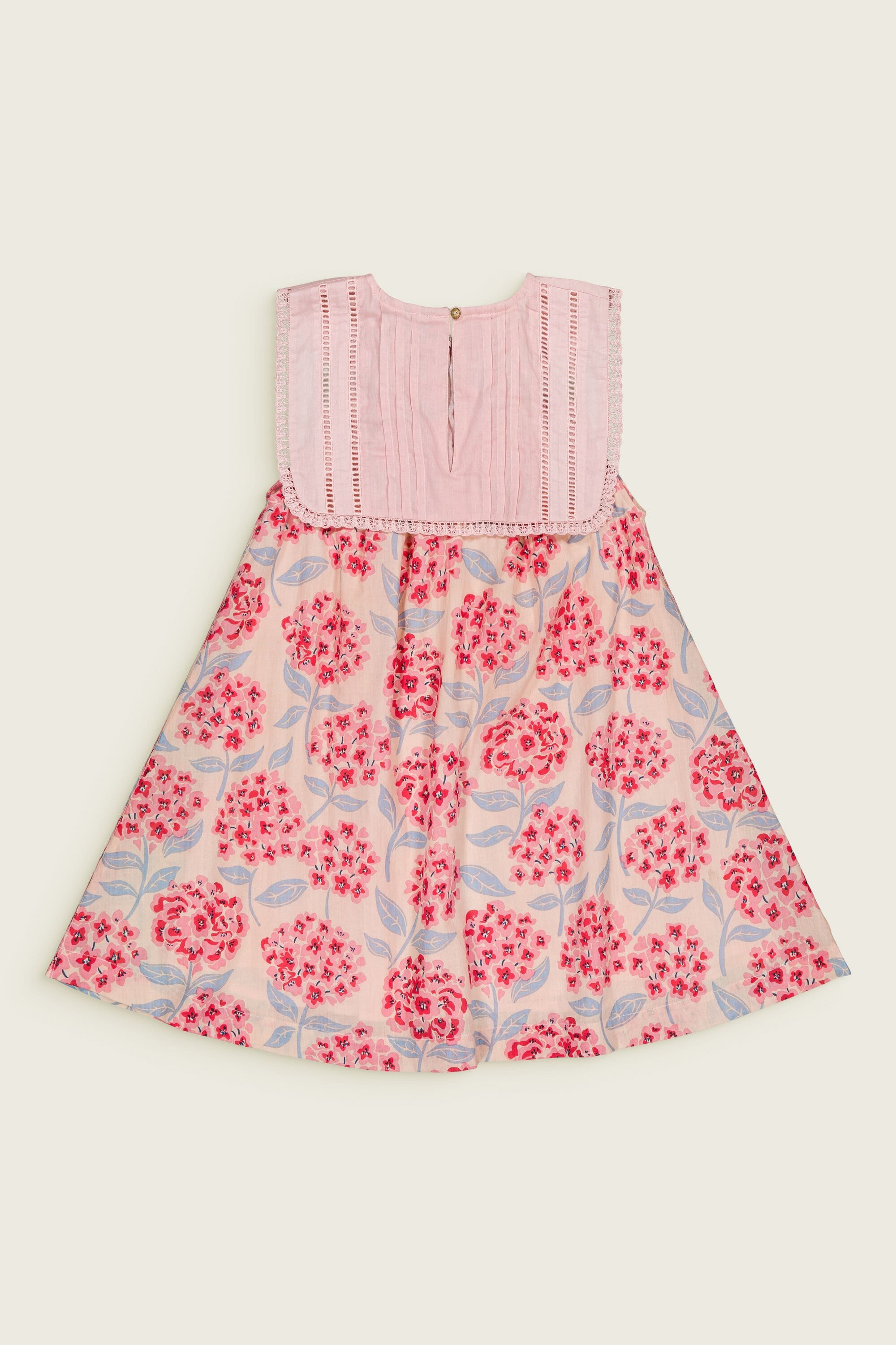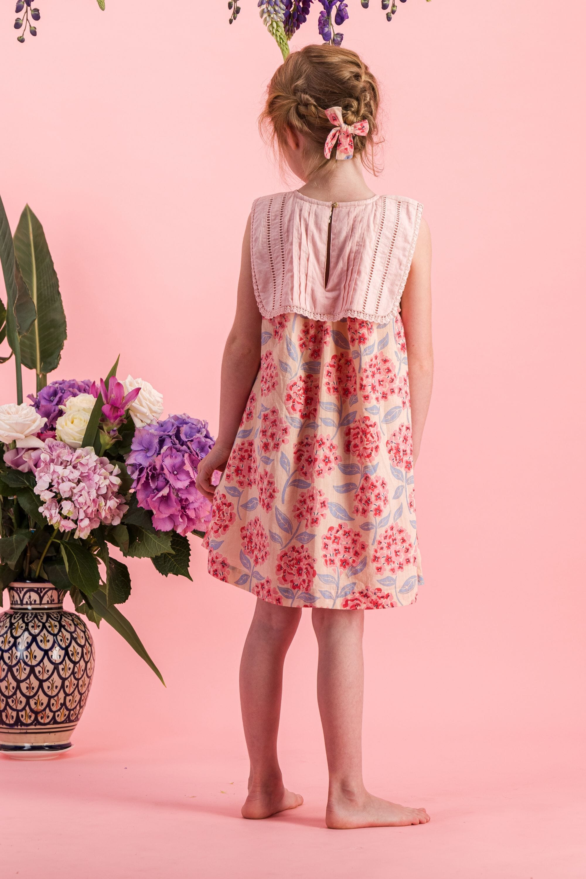 - Robe sans manche, 100% coton bio, Imprimé Block Print, Doublure unie en coton bio, Broderies main, plis nervures et dentelles Jour Echelle sur le col, Fronces sur le devant et dans le dos, Goute boutonnée dans le dos, Bouton contrasté.