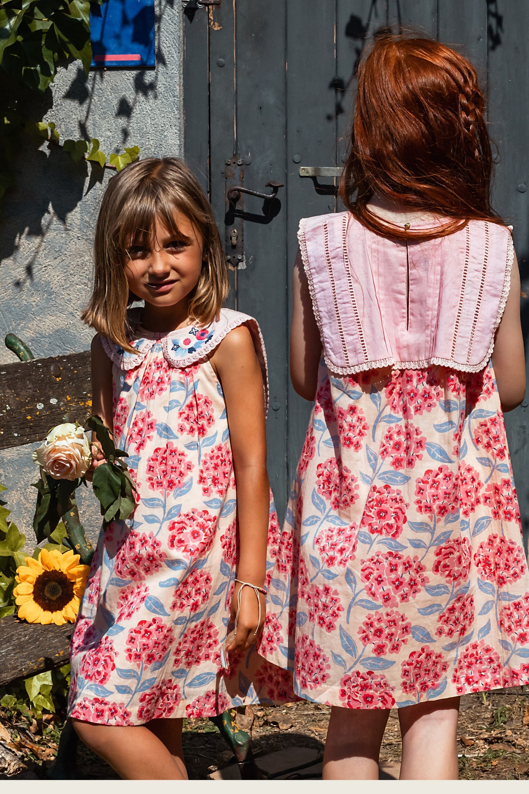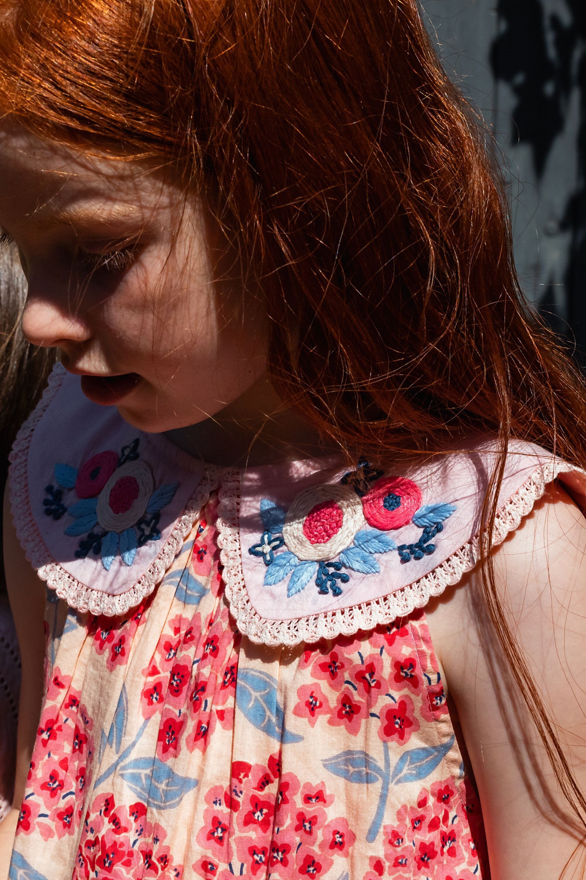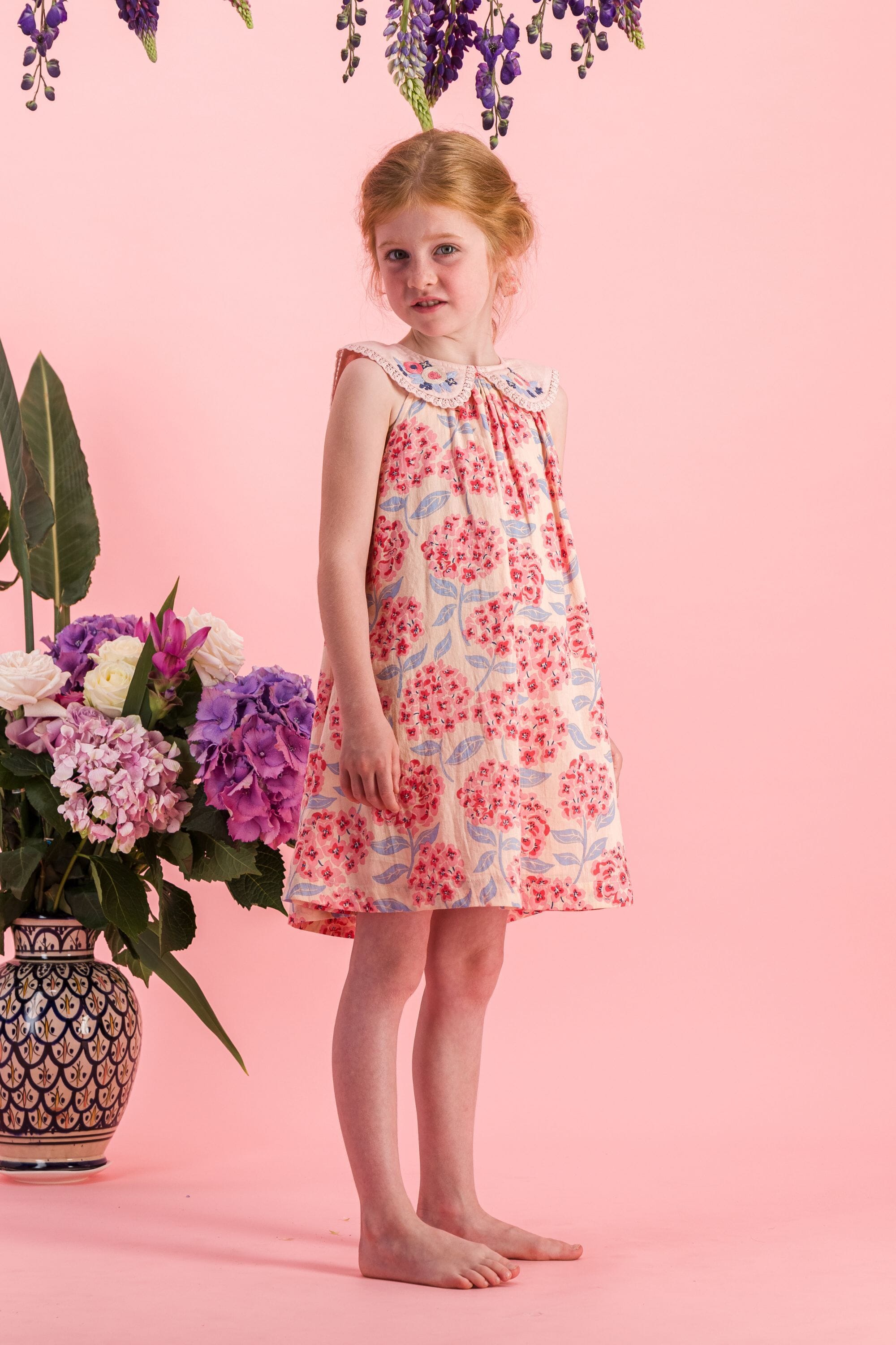 - Robe sans manche, 100% coton bio, Imprimé Block Print, Doublure unie en coton bio, Broderies main, plis nervures et dentelles Jour Echelle sur le col, Fronces sur le devant et dans le dos, Goute boutonnée dans le dos, Bouton contrasté.