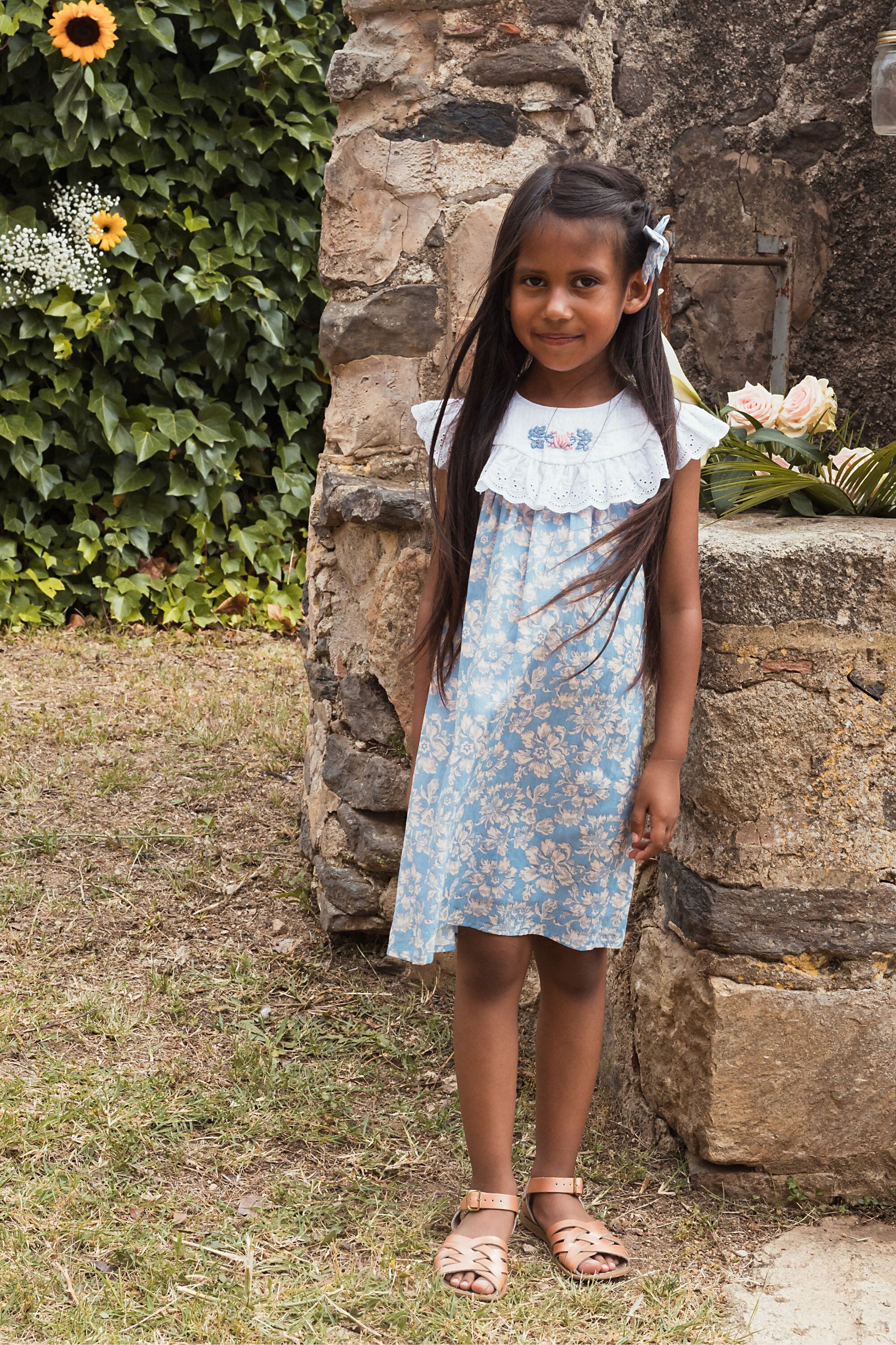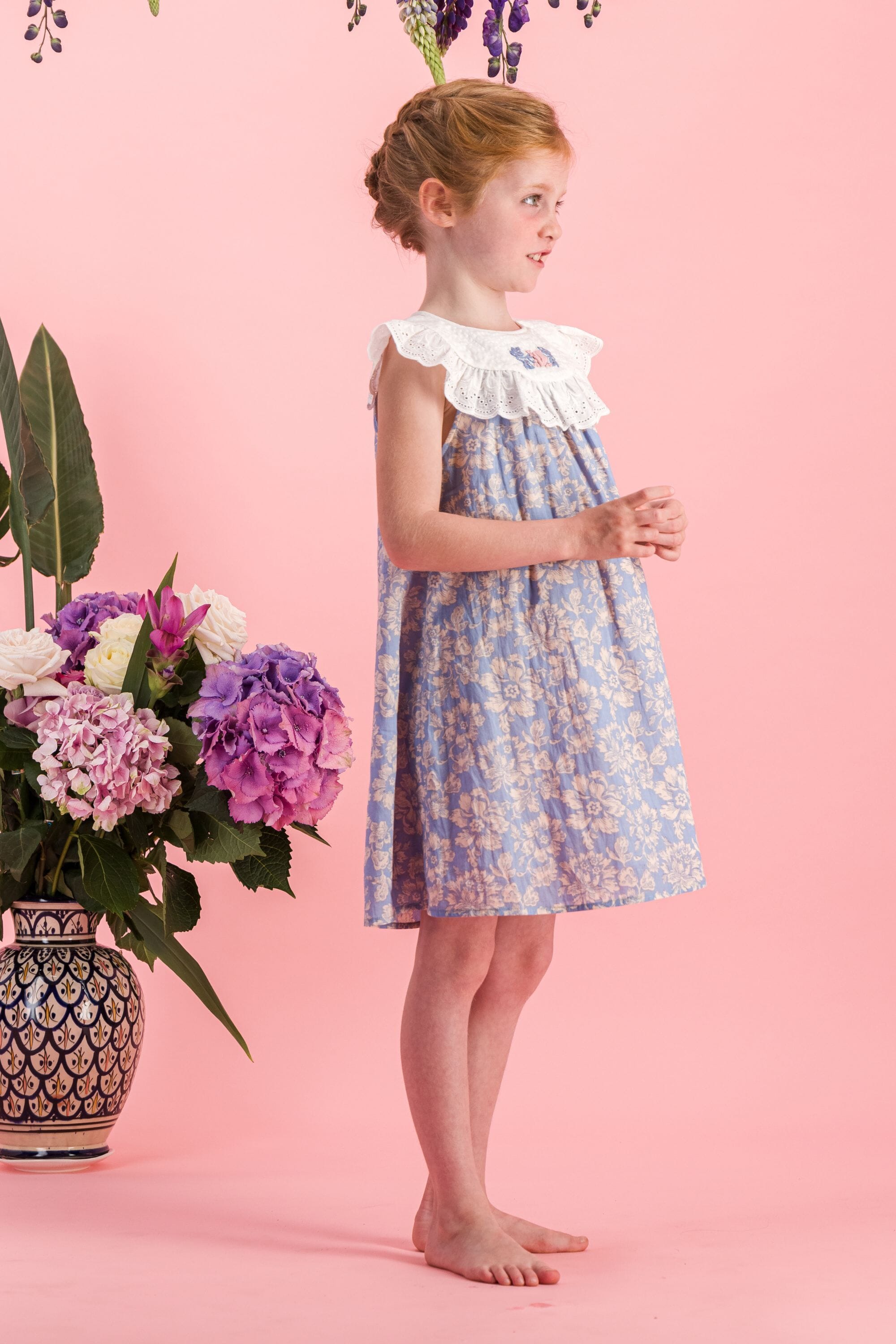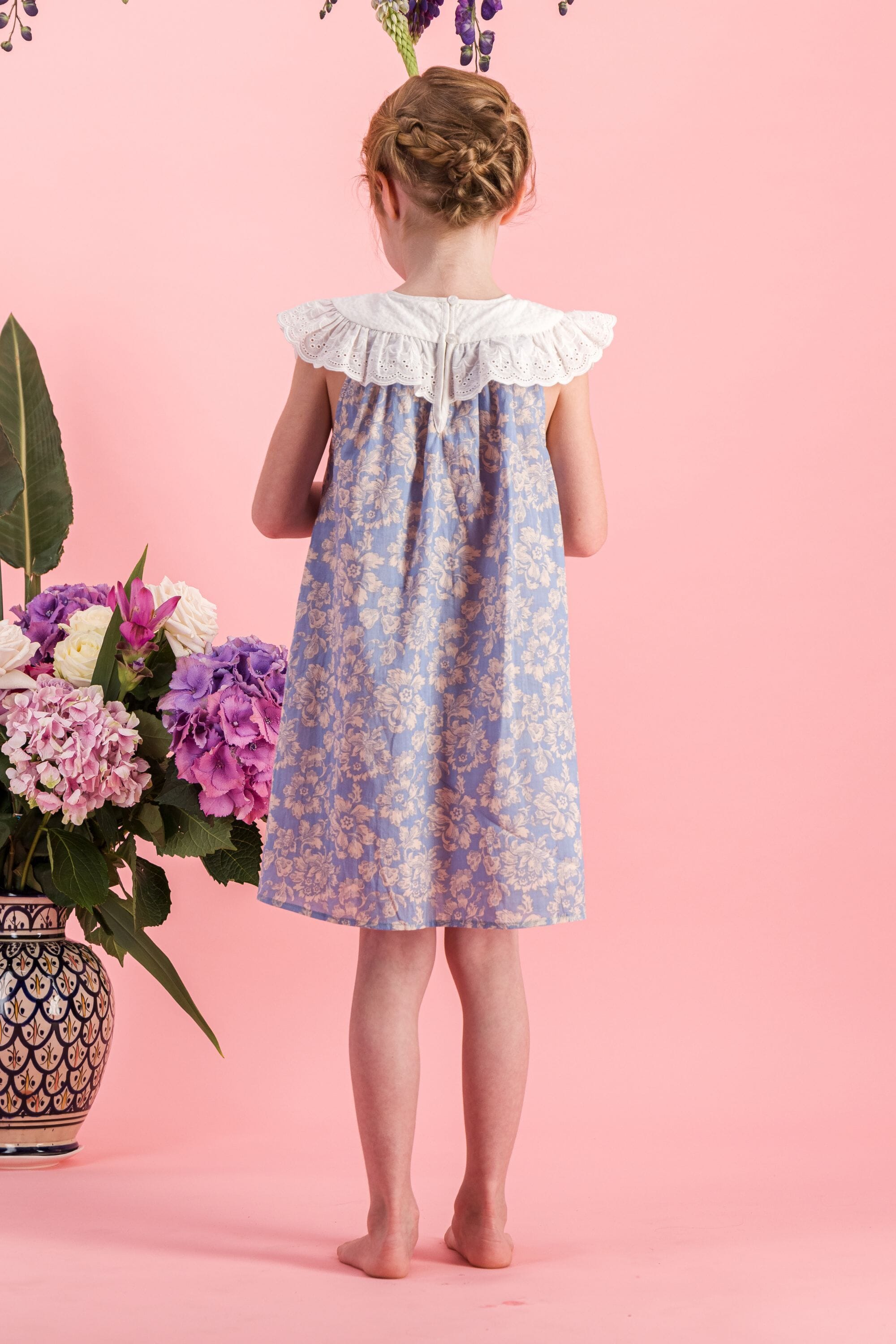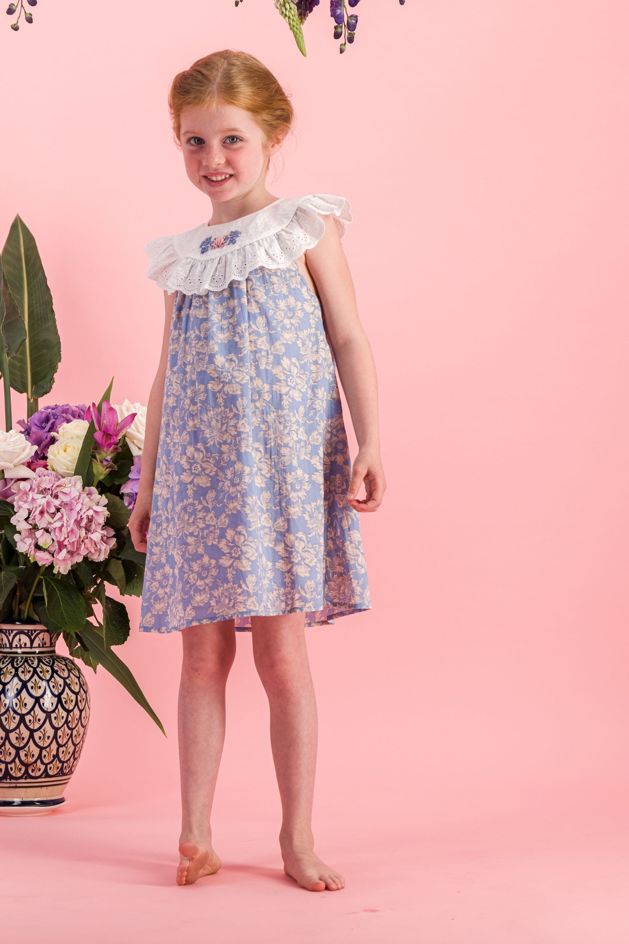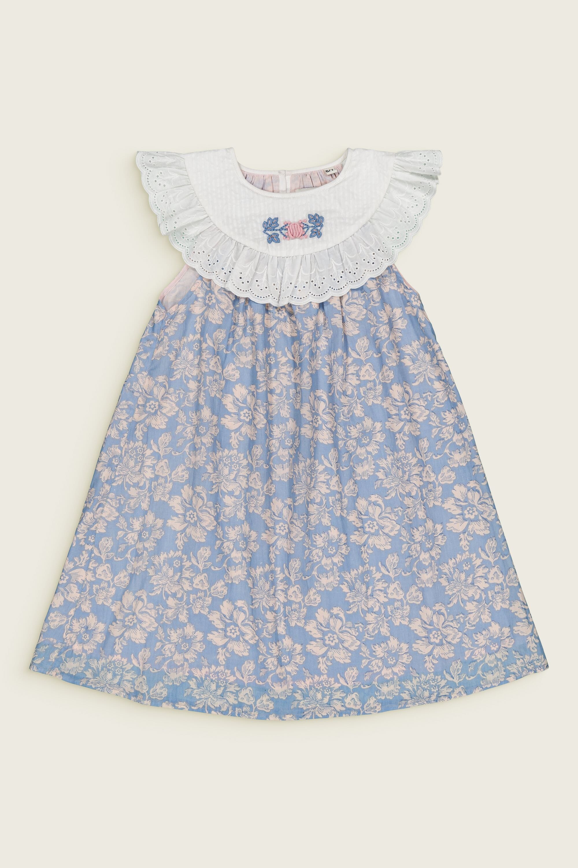 Une Robe sans manche en coton biologique avec des broderies main et des broderies anglaises sur le col.