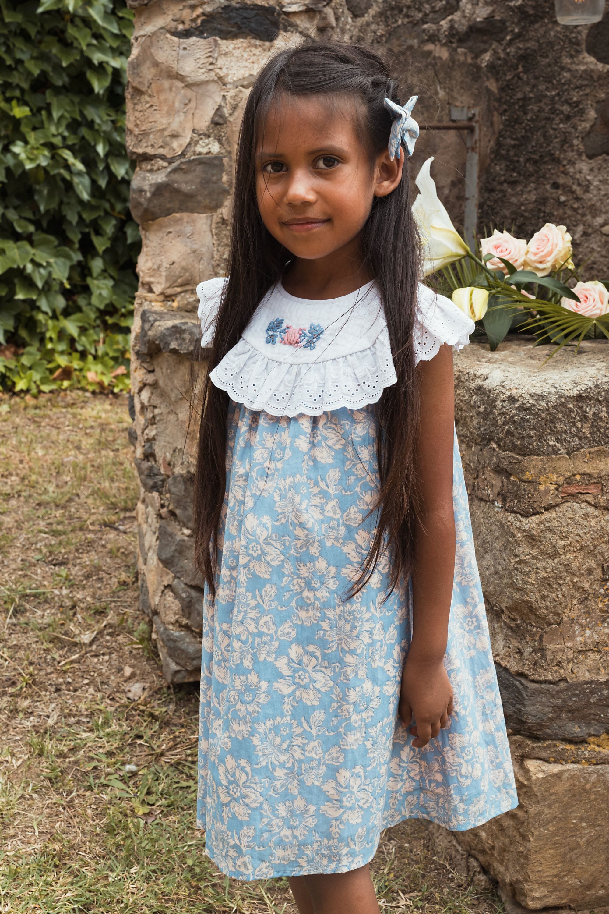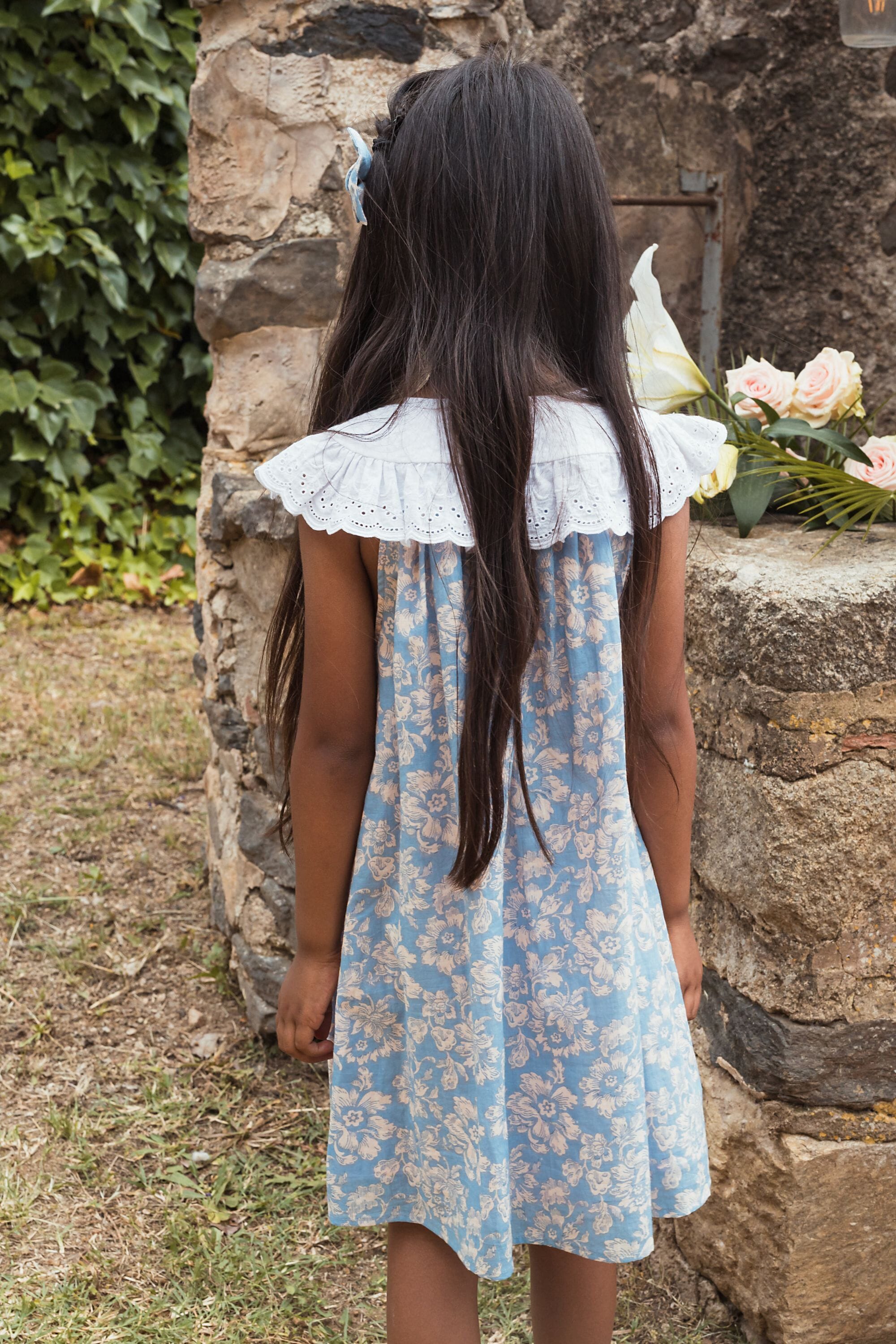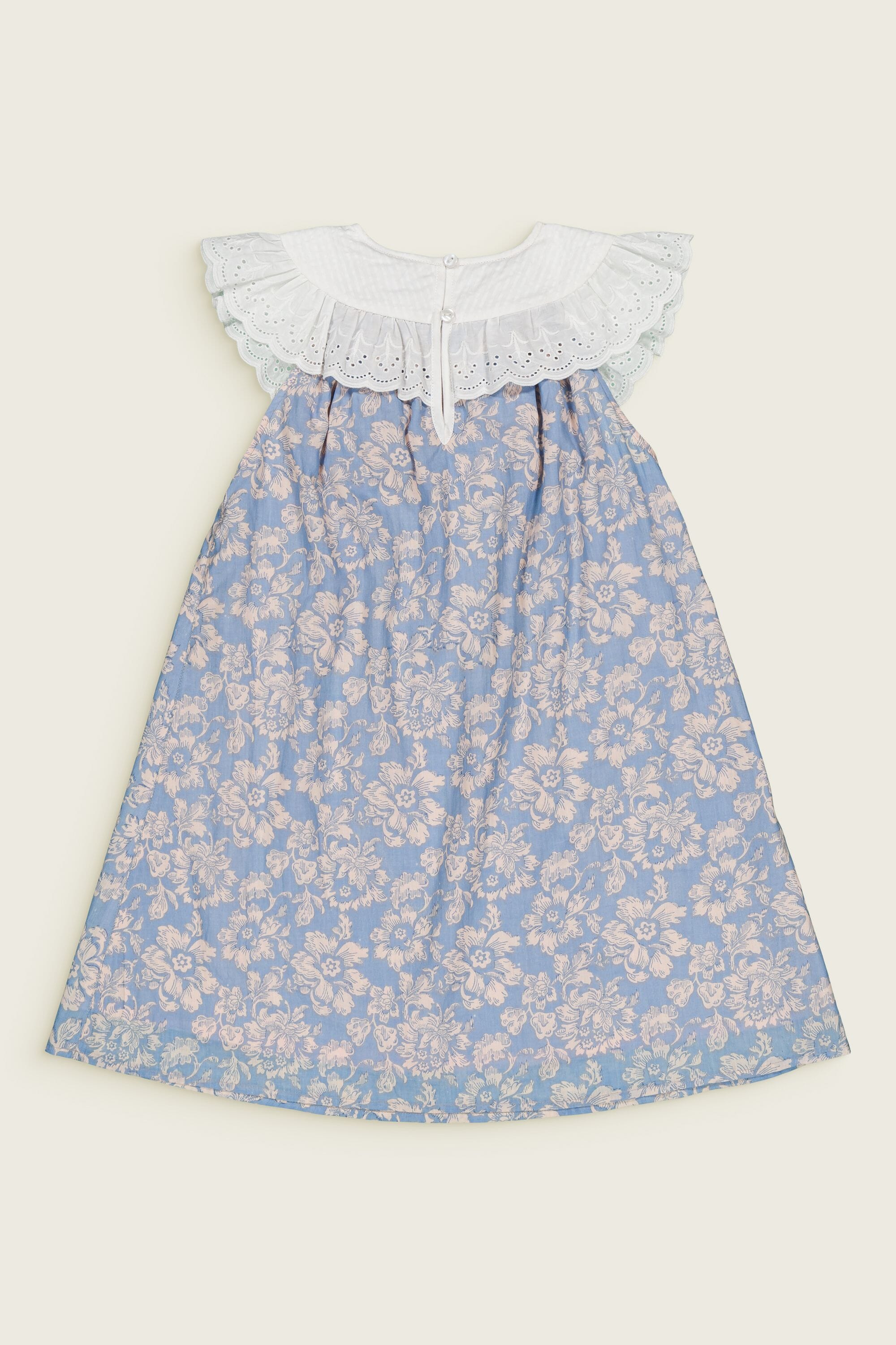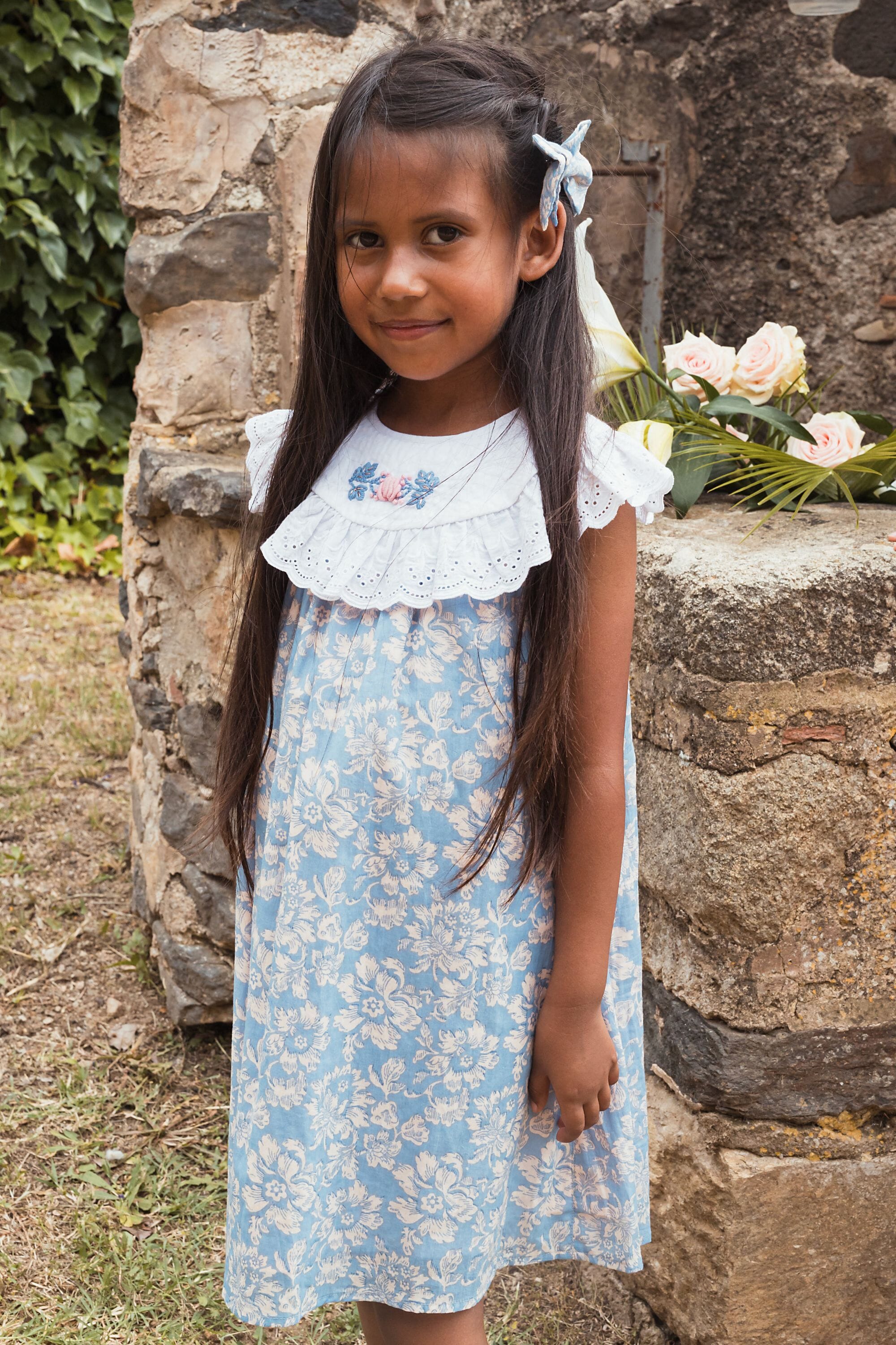 - Robe sans manche, 100% coton biologique, Doublure unie en voile de coton biologique, Block print, Broderies main et broderies anglaises sur le col, Fronces sur le devant et dans le dos, Goute boutonnée dans le dos, Bouton contrasté.