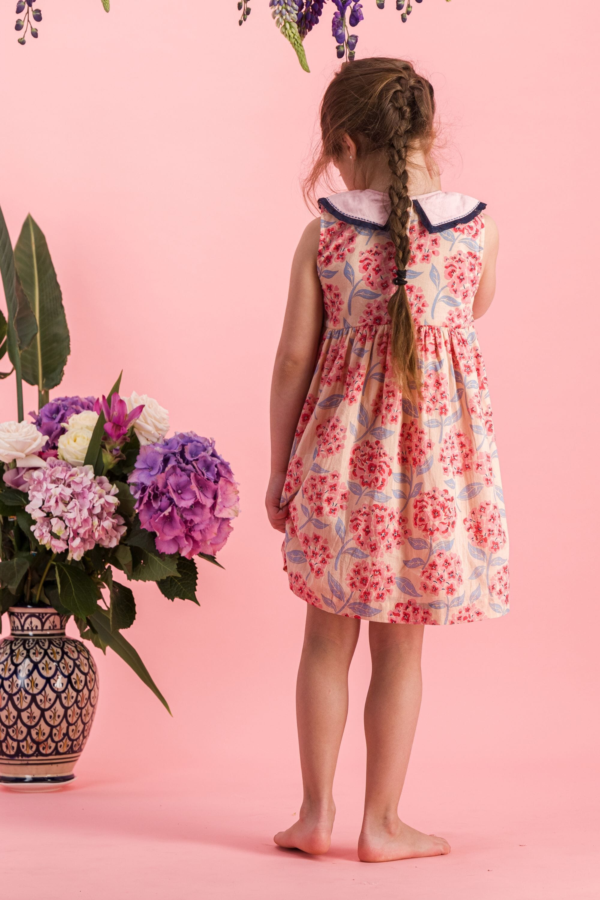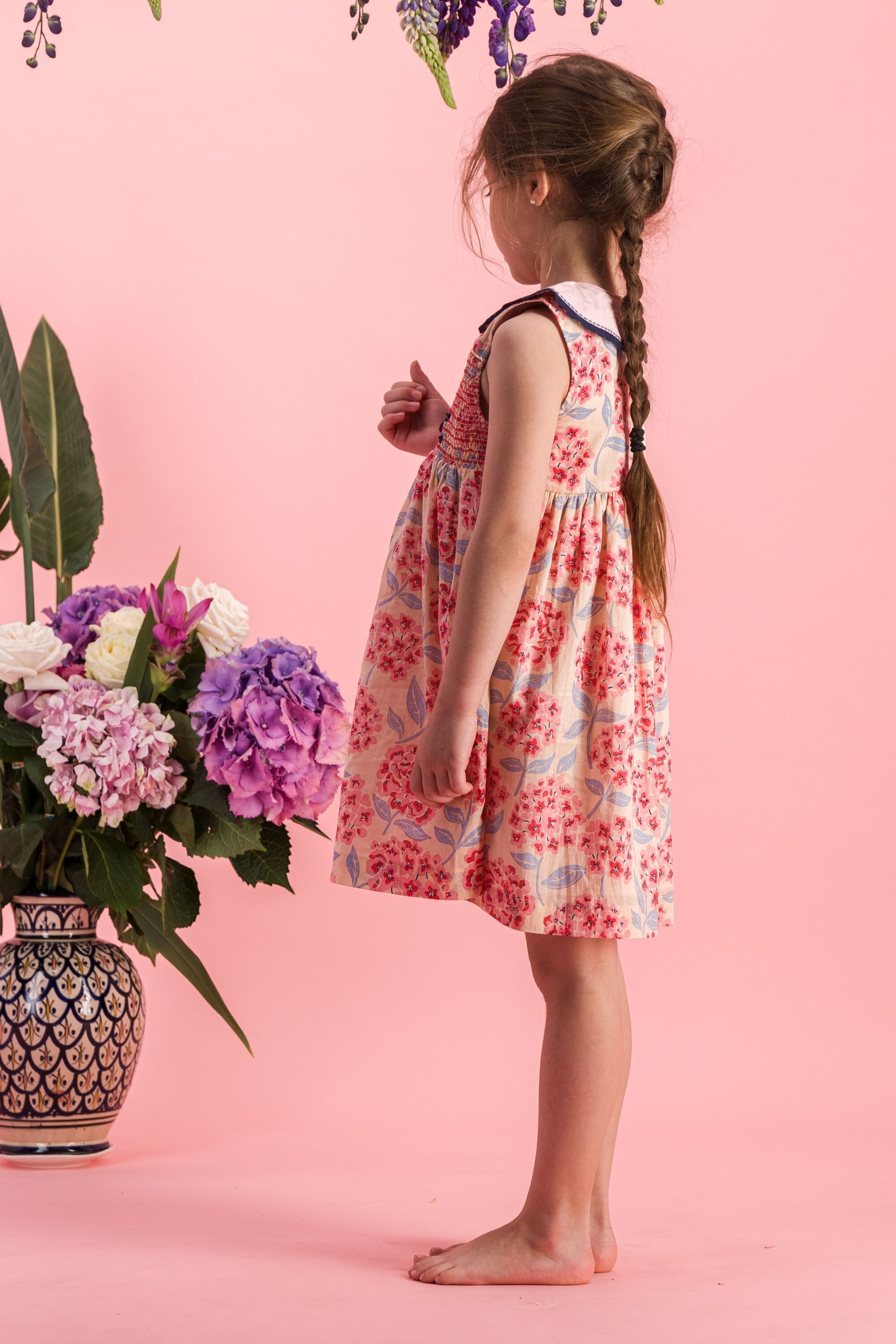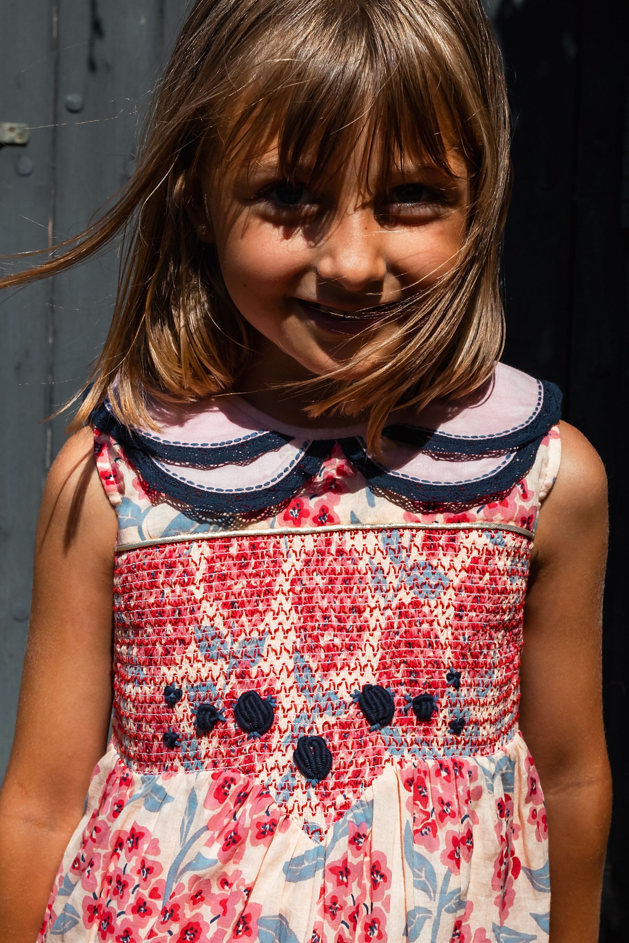 - Robe sans manche, 100% coton bio, Doublure unie en voile de coton bio, Block print, Double col Claudine surpiqué main finition dentelle, Smocks, Passepoil doré et fleurs brodées main sur le devant, Boutons contrastés dans le dos.