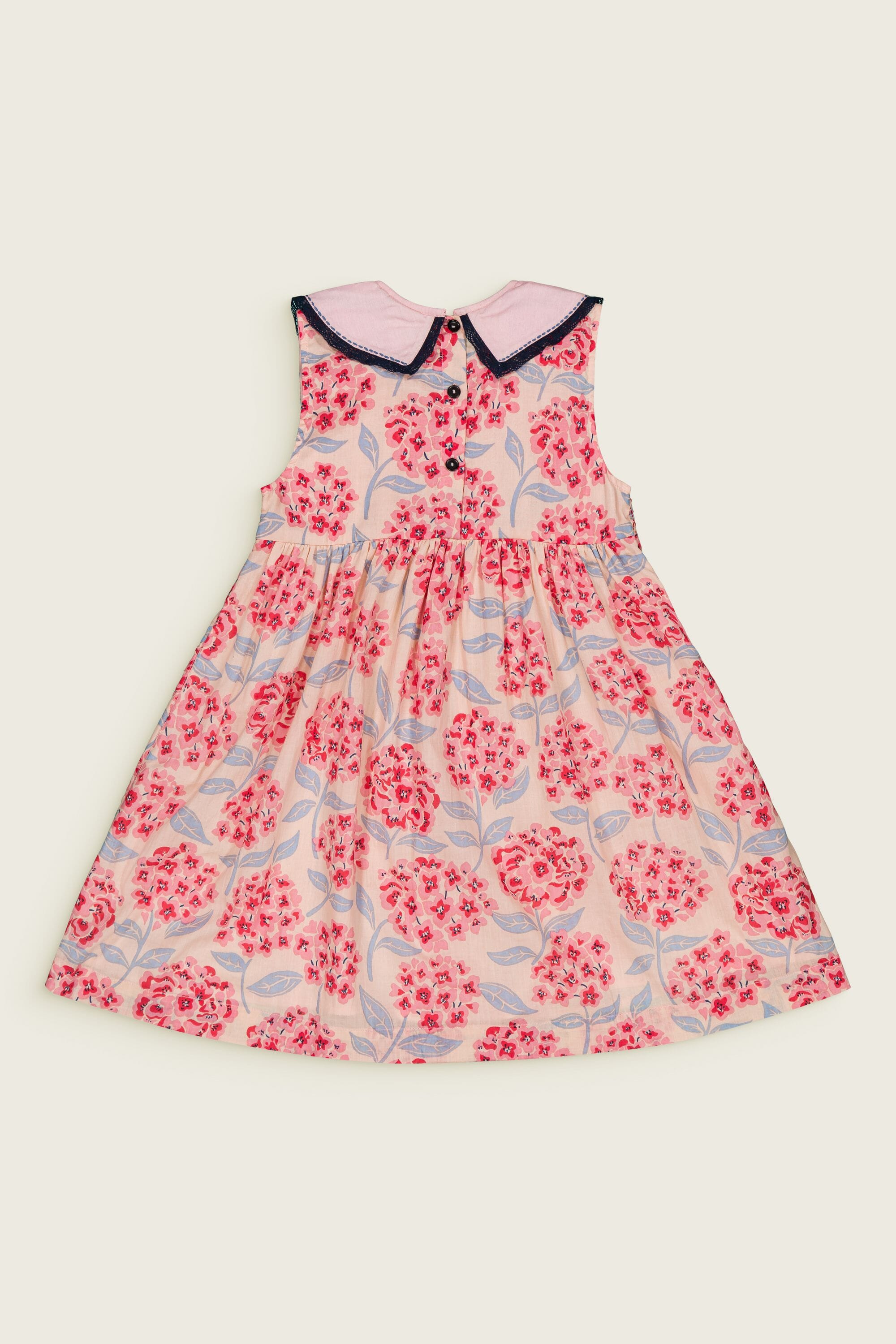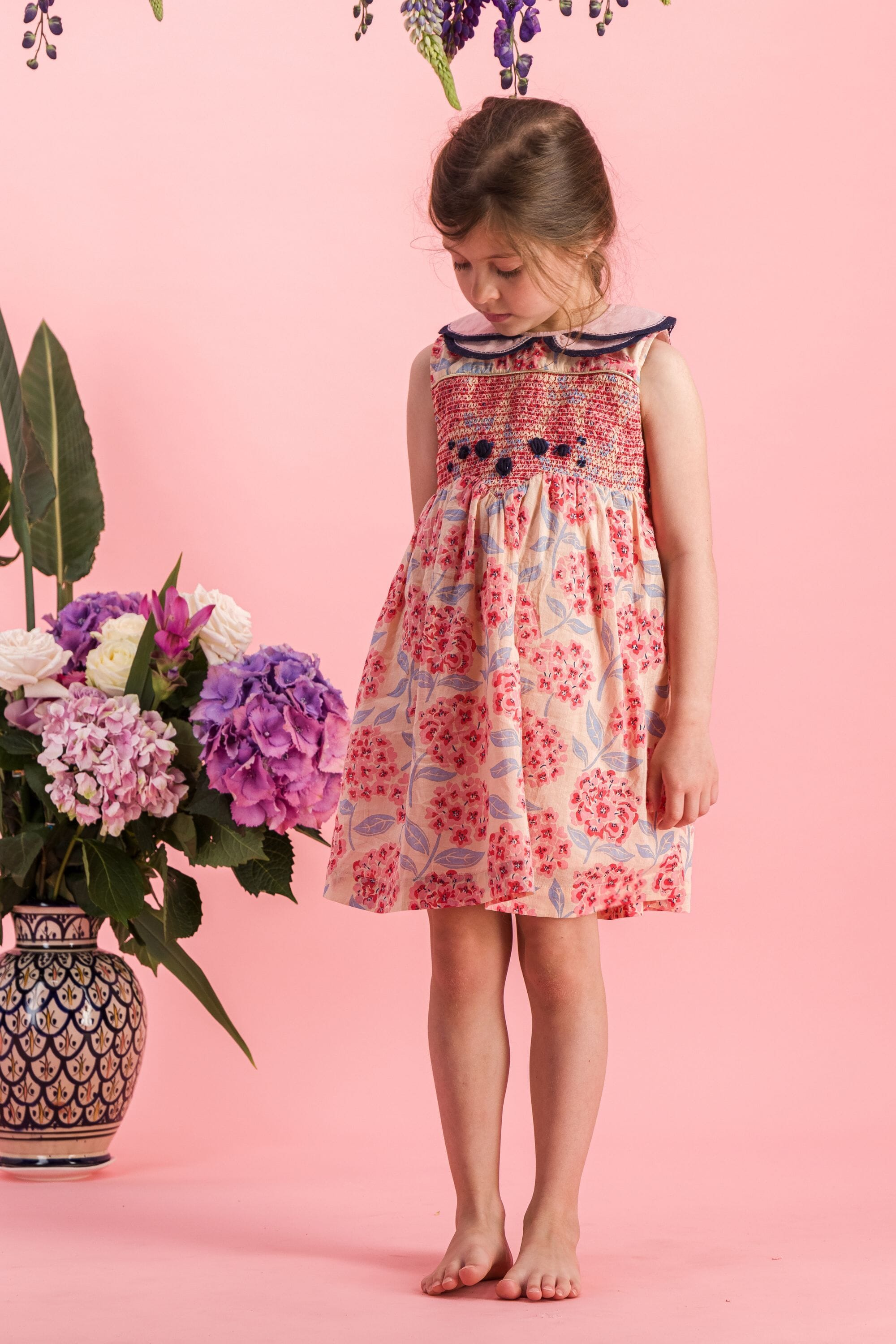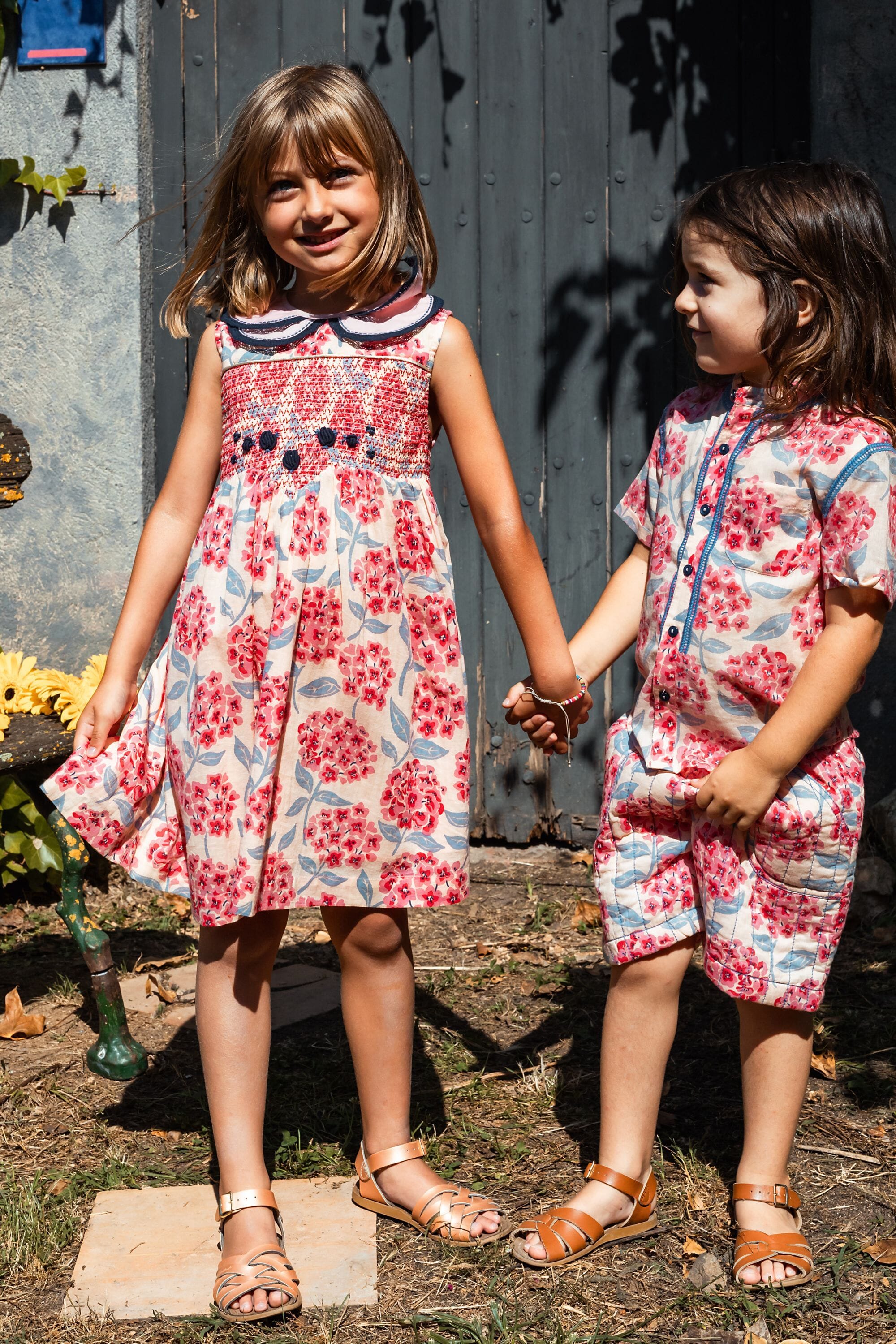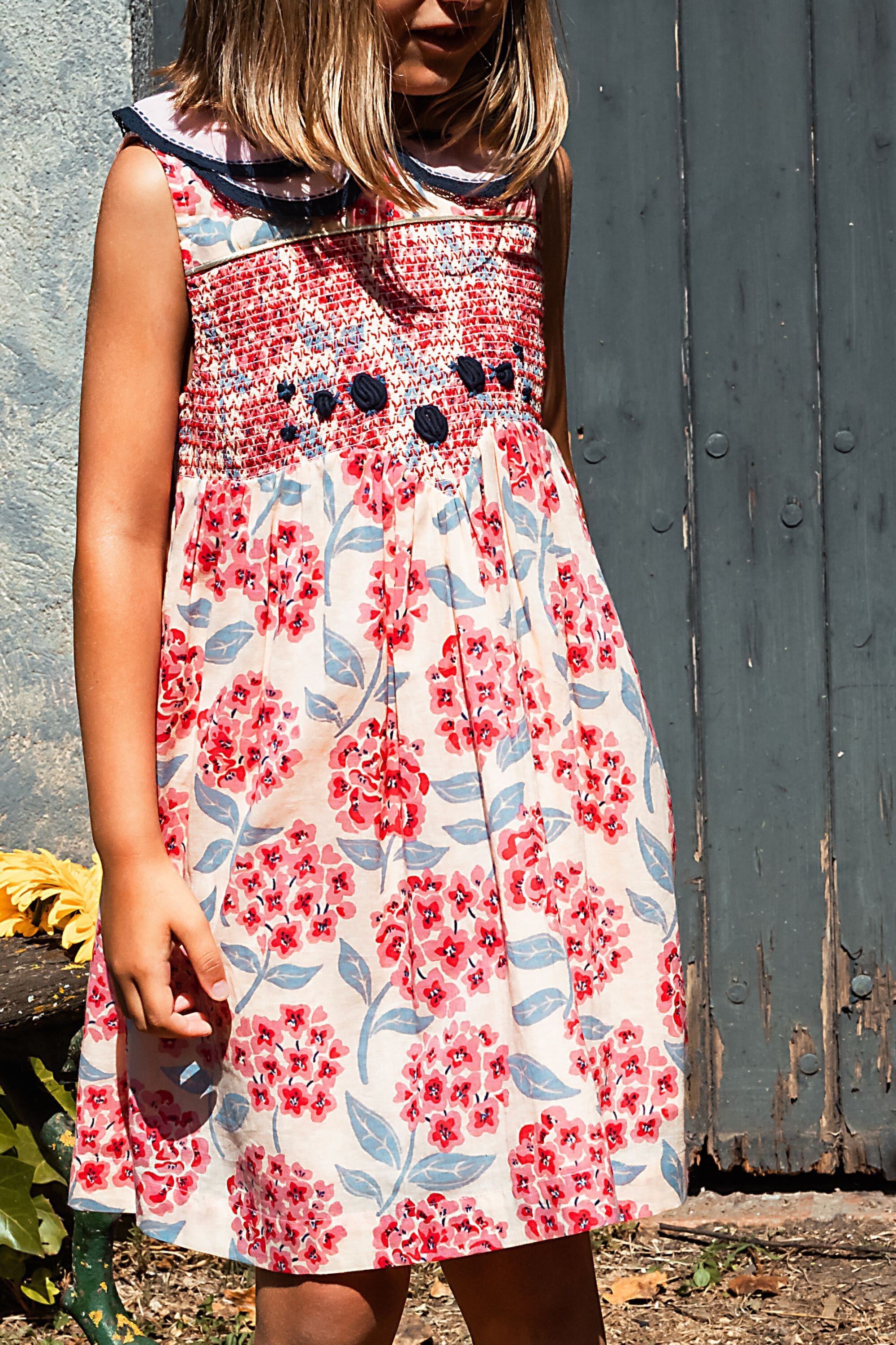 - Robe sans manche, 100% coton bio, Doublure unie en voile de coton bio, Block print, Double col Claudine surpiqué main finition dentelle, Smocks, Passepoil doré et fleurs brodées main sur le devant, Boutons contrastés dans le dos.